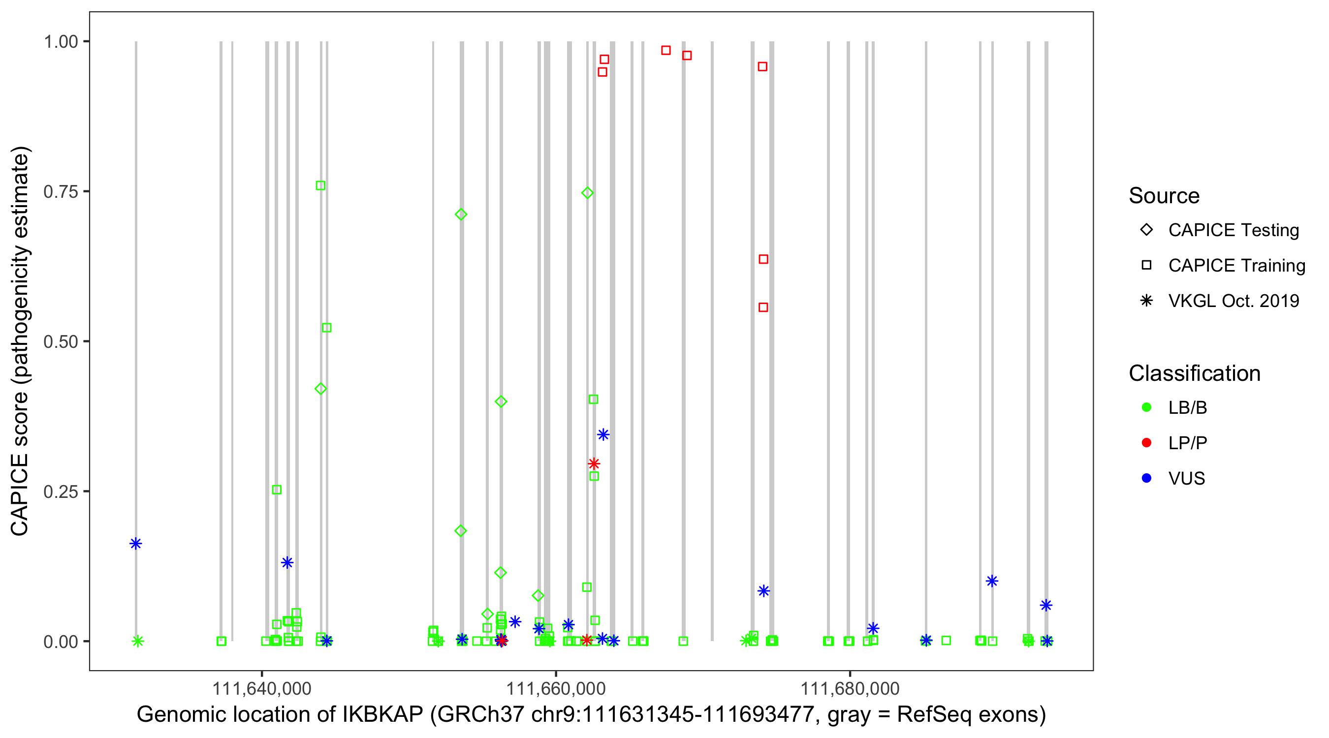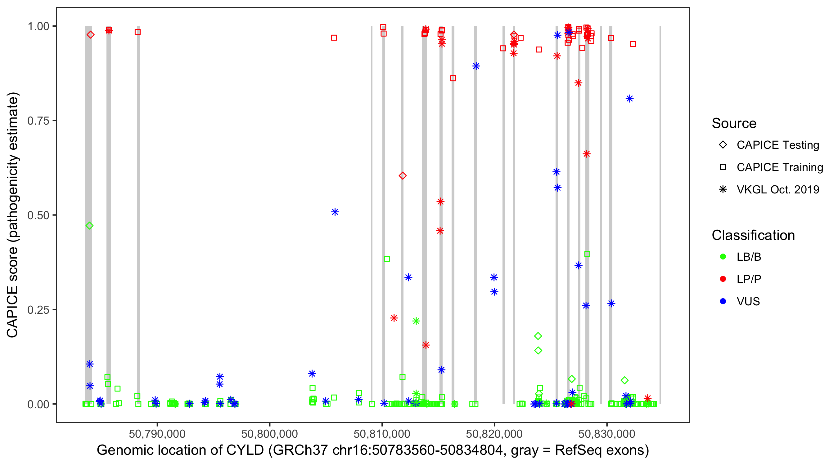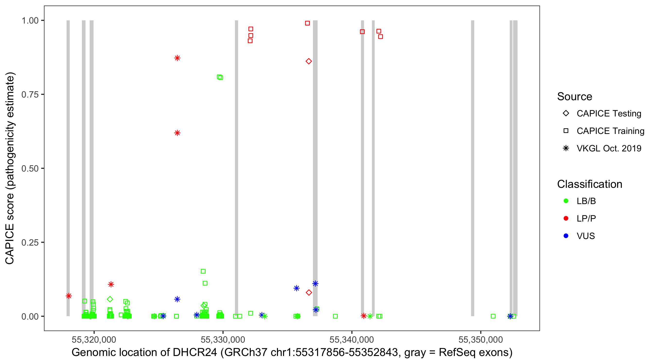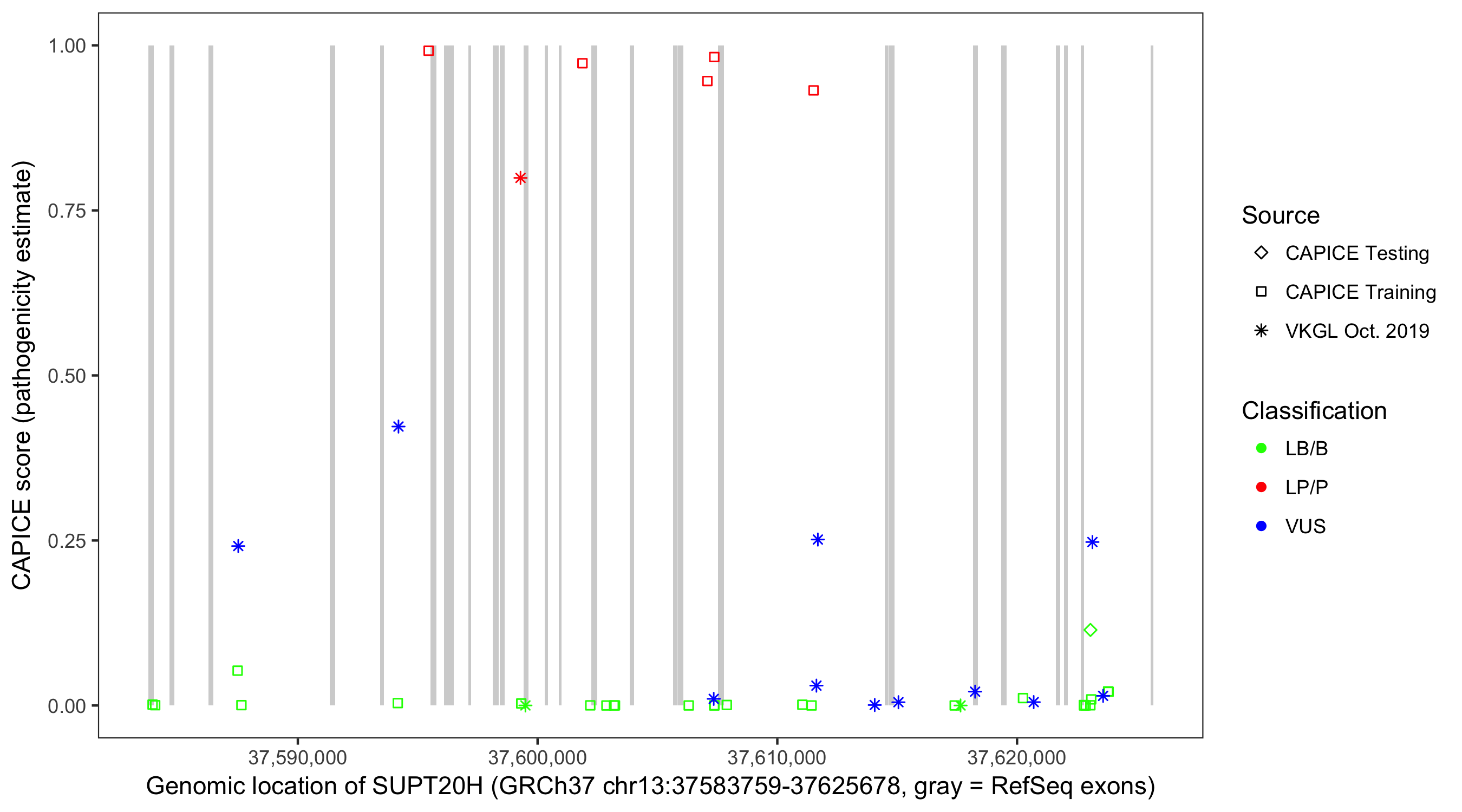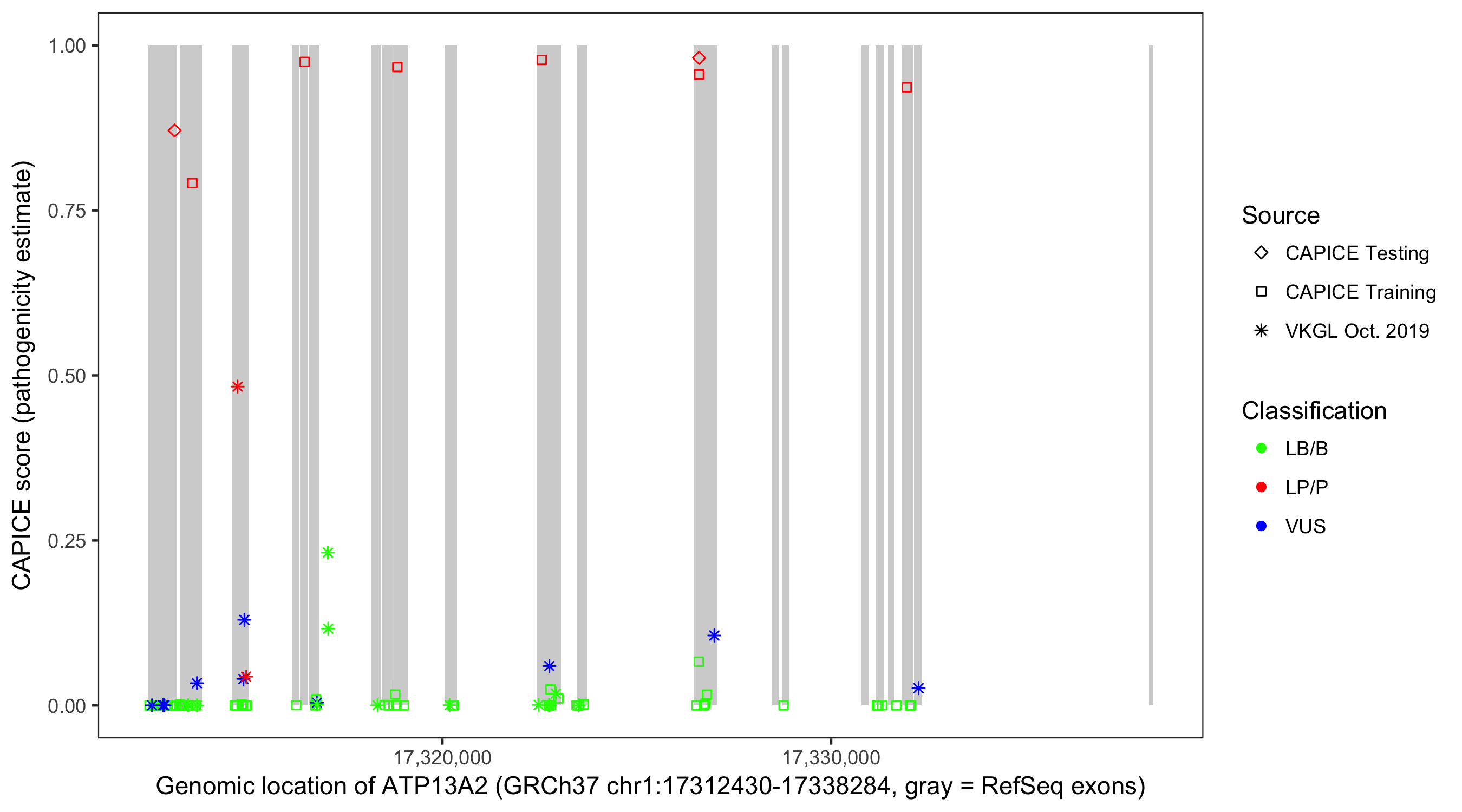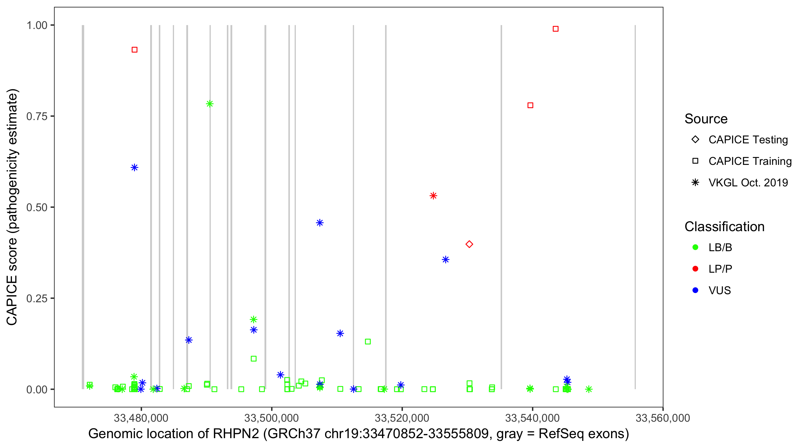 Shown are CAPICE train/test variants plus VKGL Oct 2019.