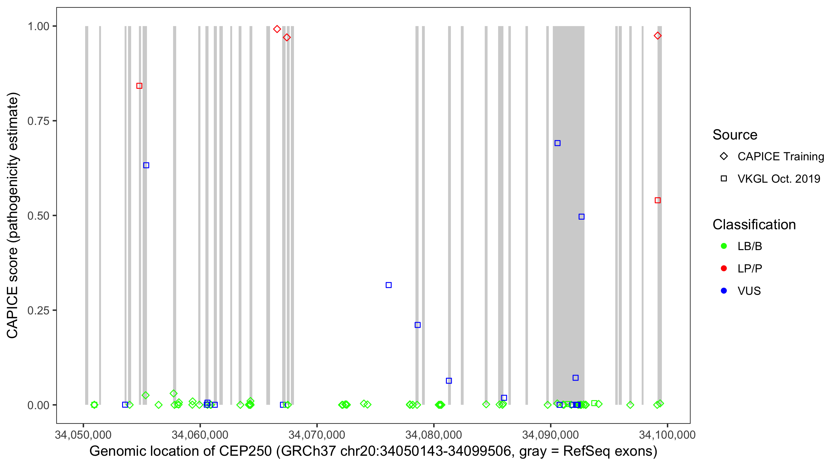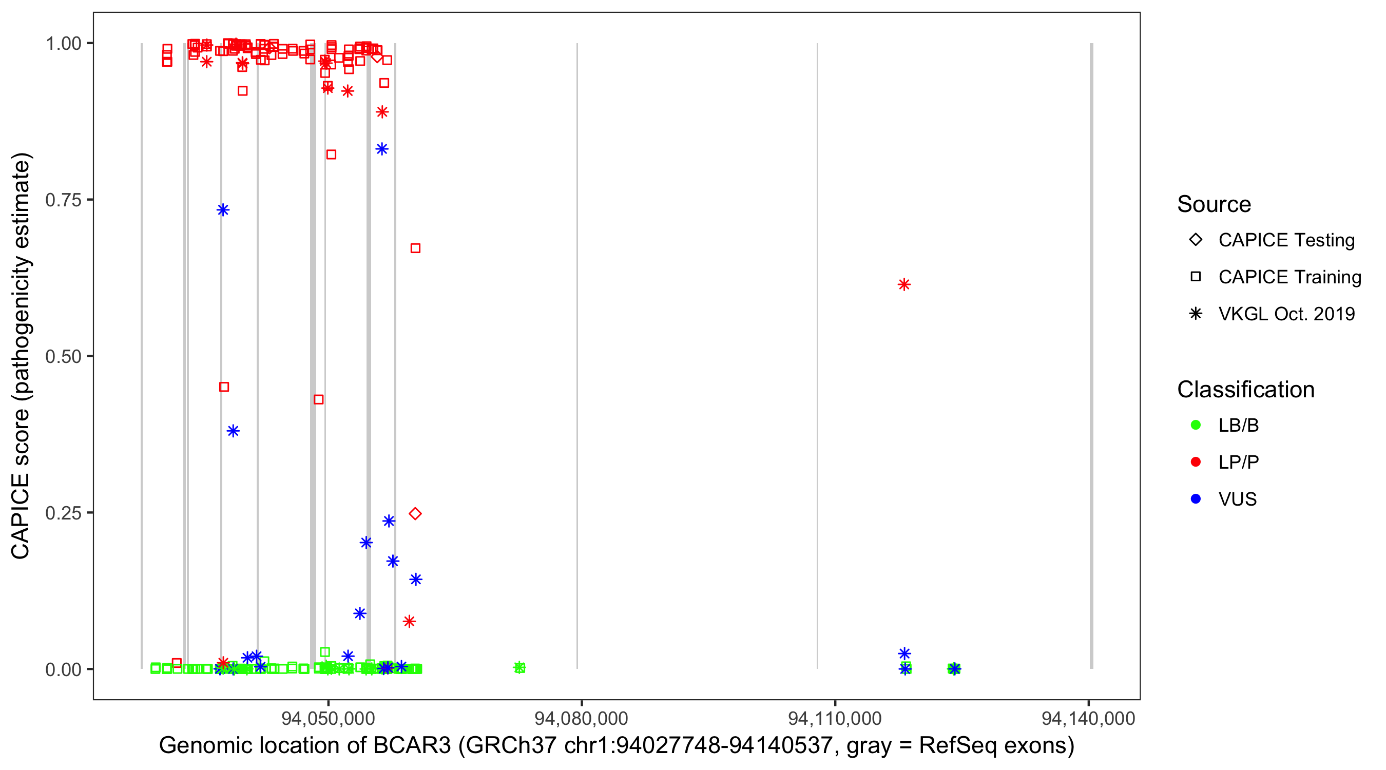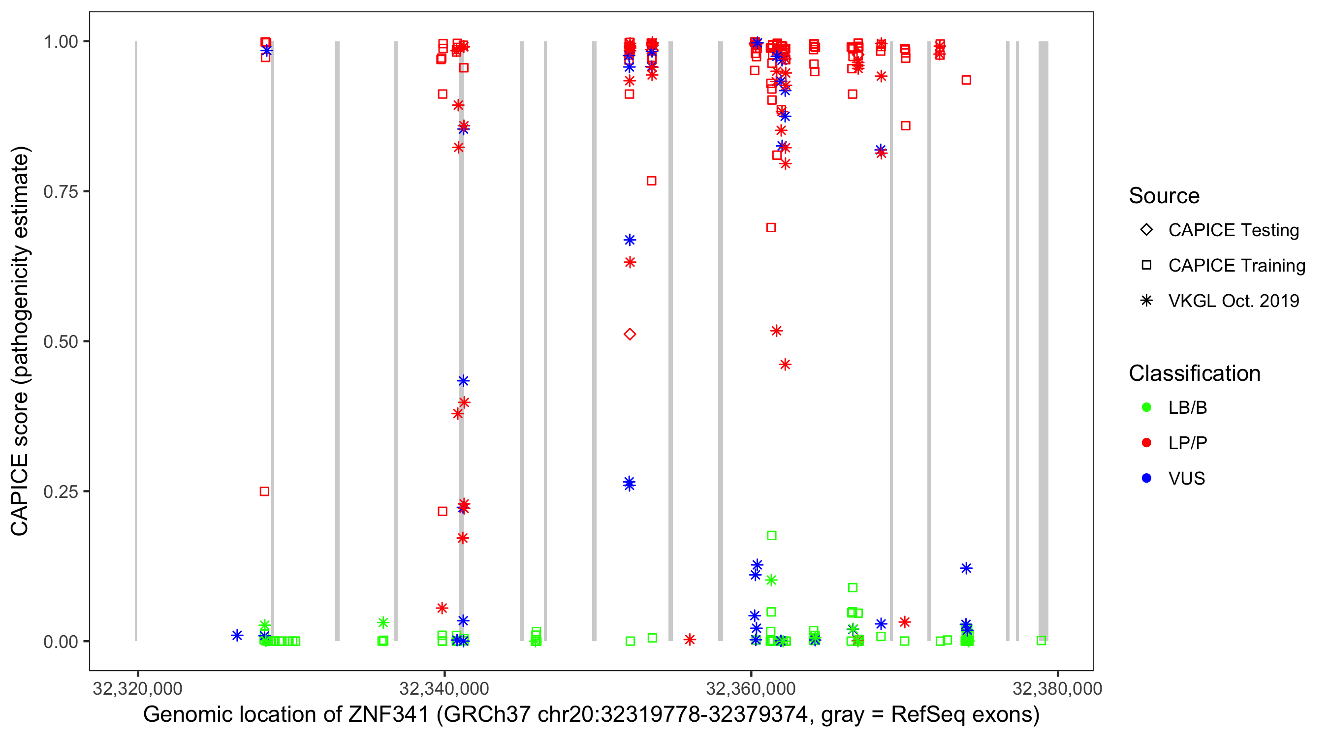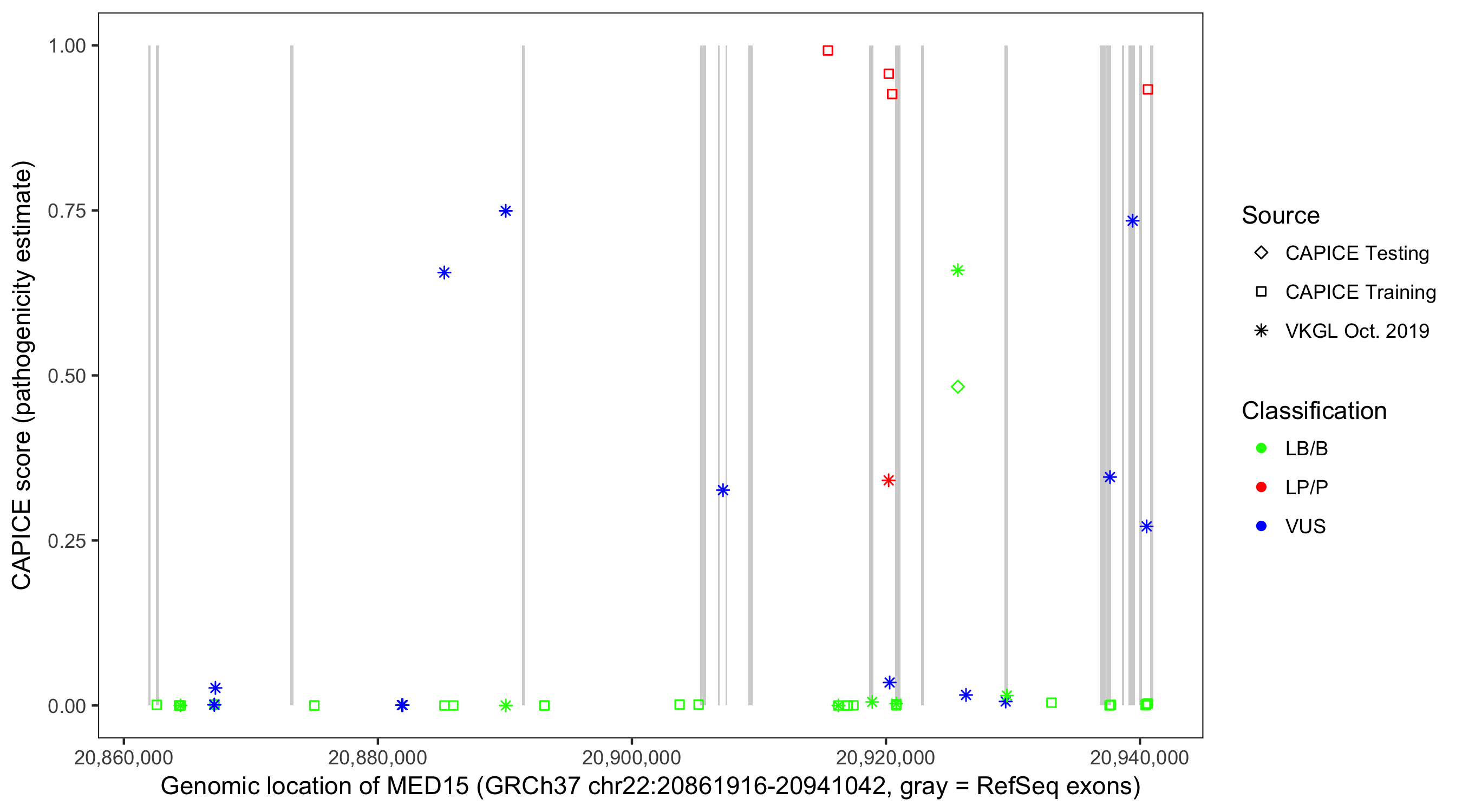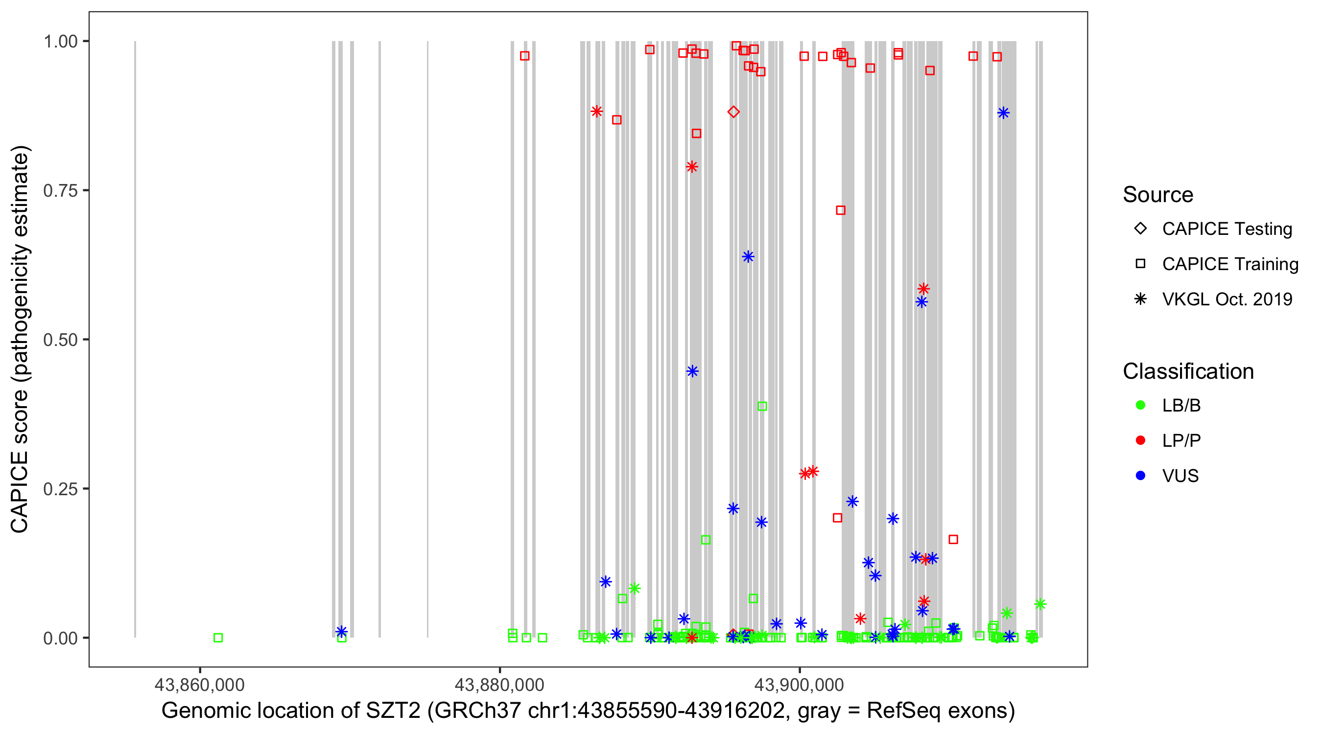 Shown are CAPICE train/test variants plus VKGL Oct 2019.