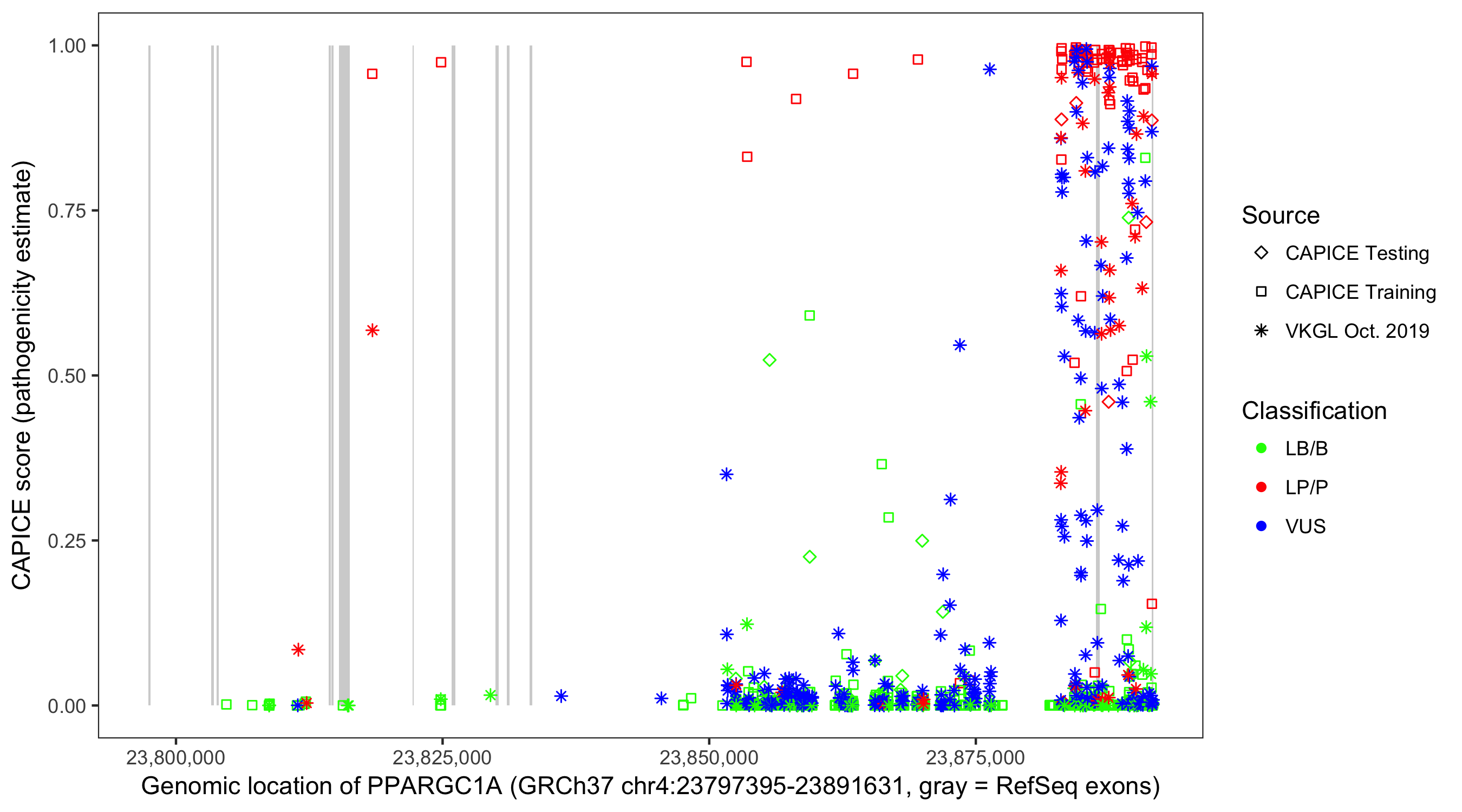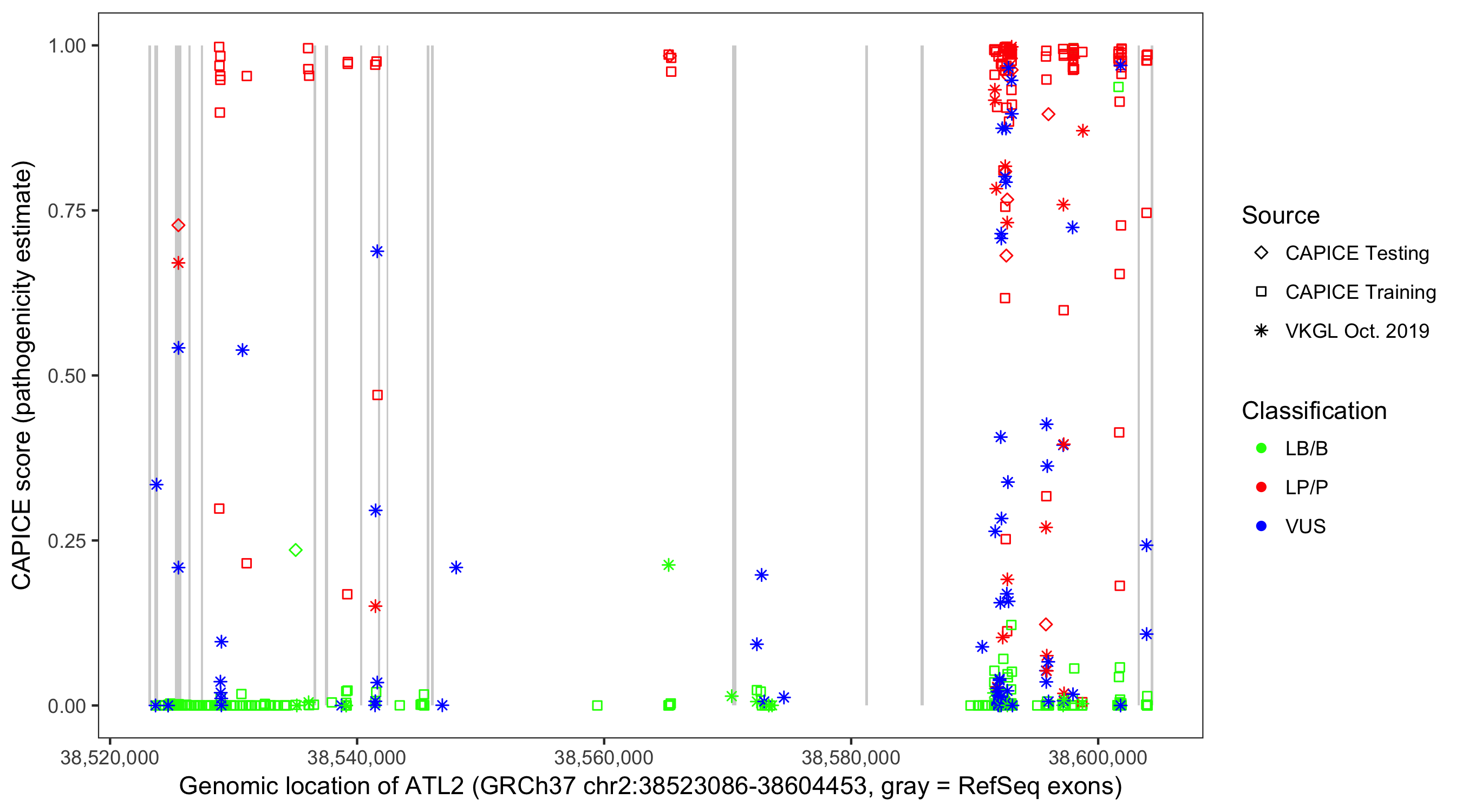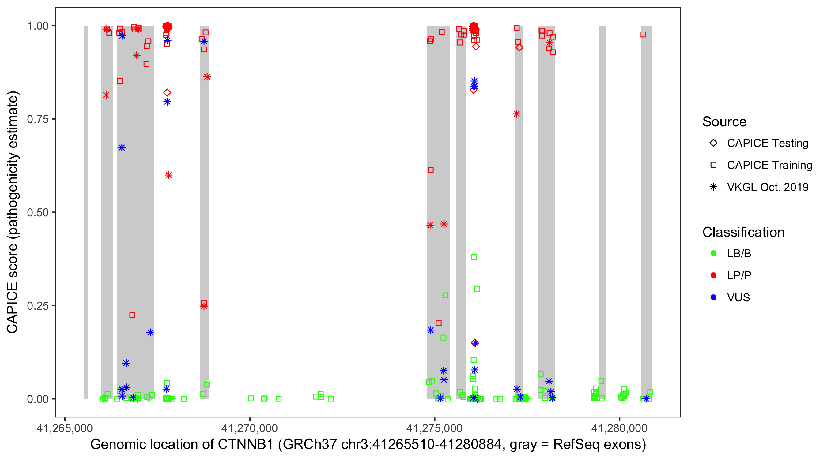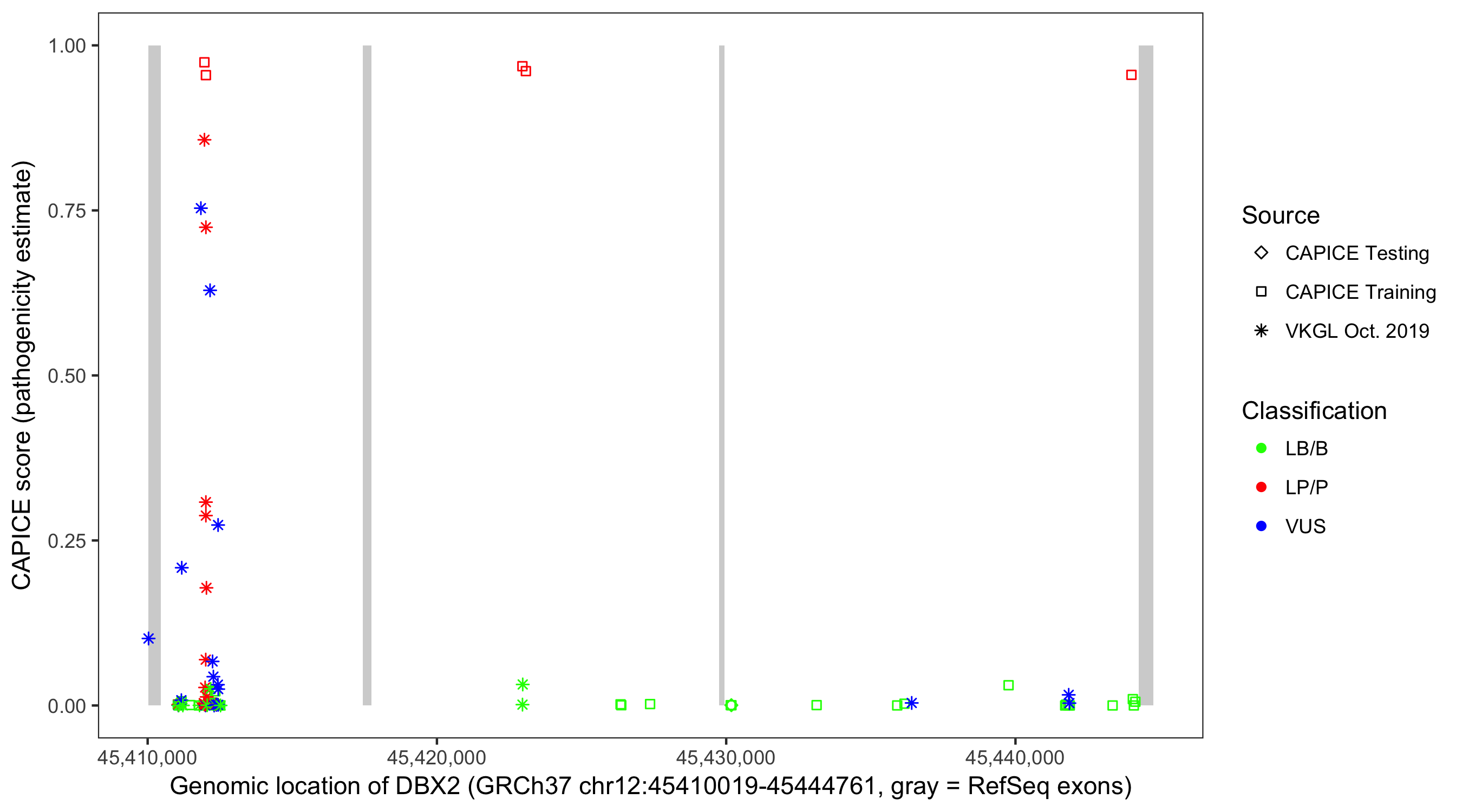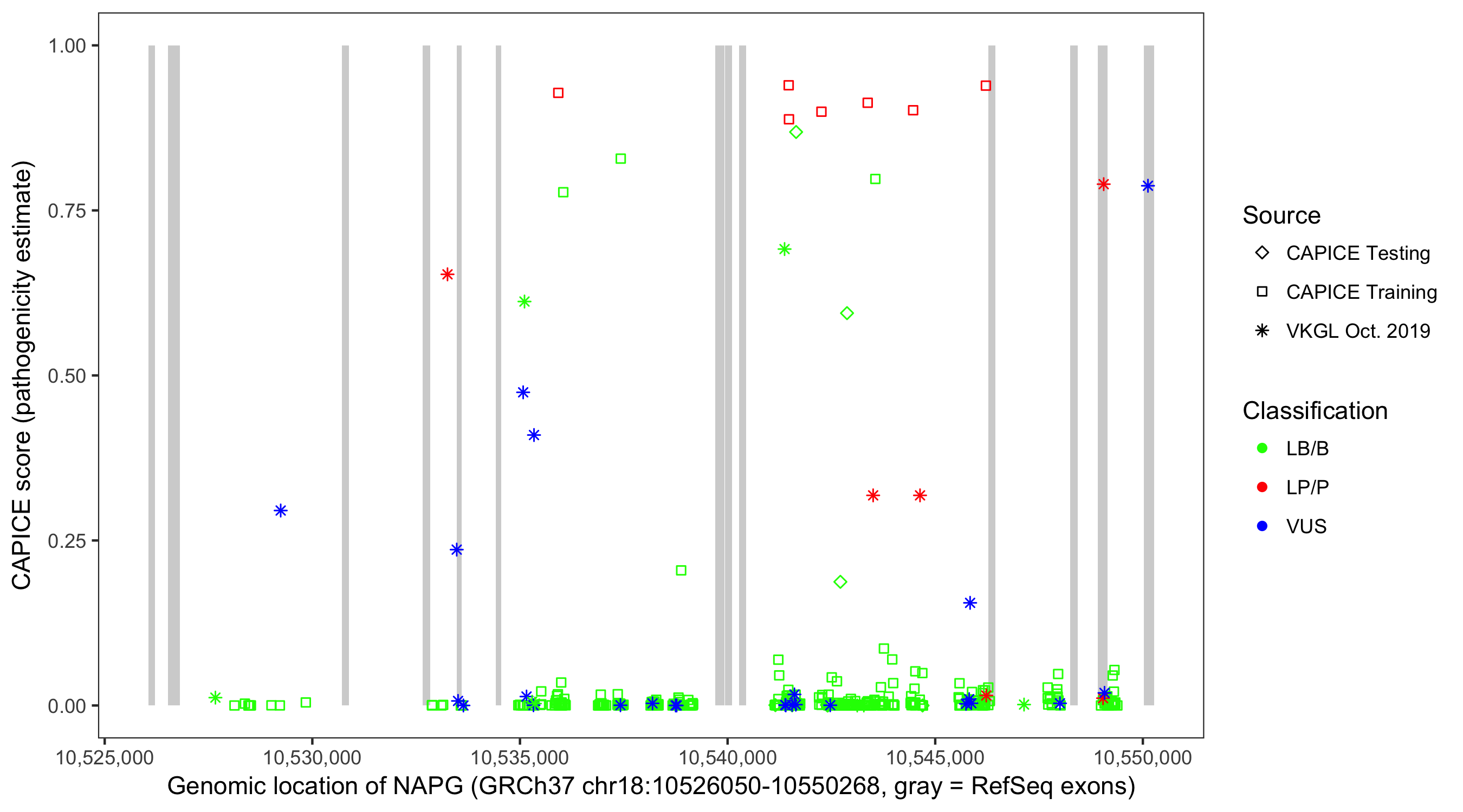 Shown are CAPICE train/test variants plus VKGL Oct 2019.