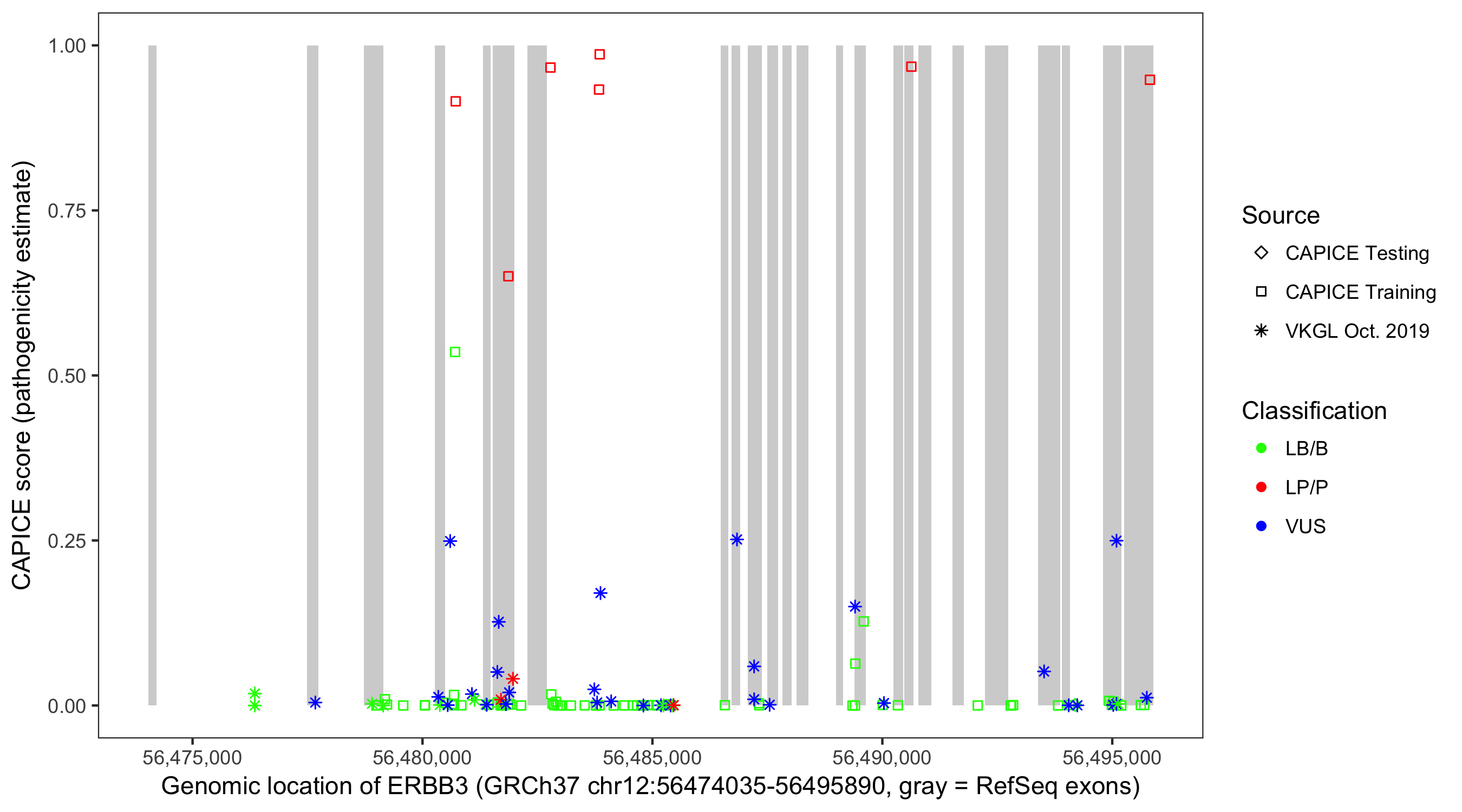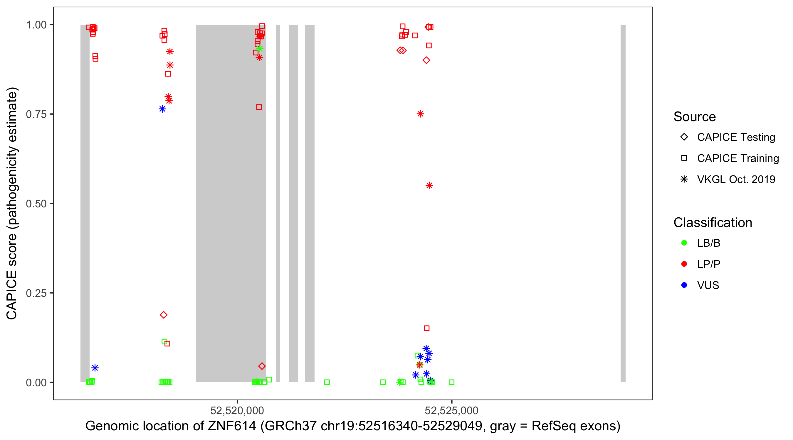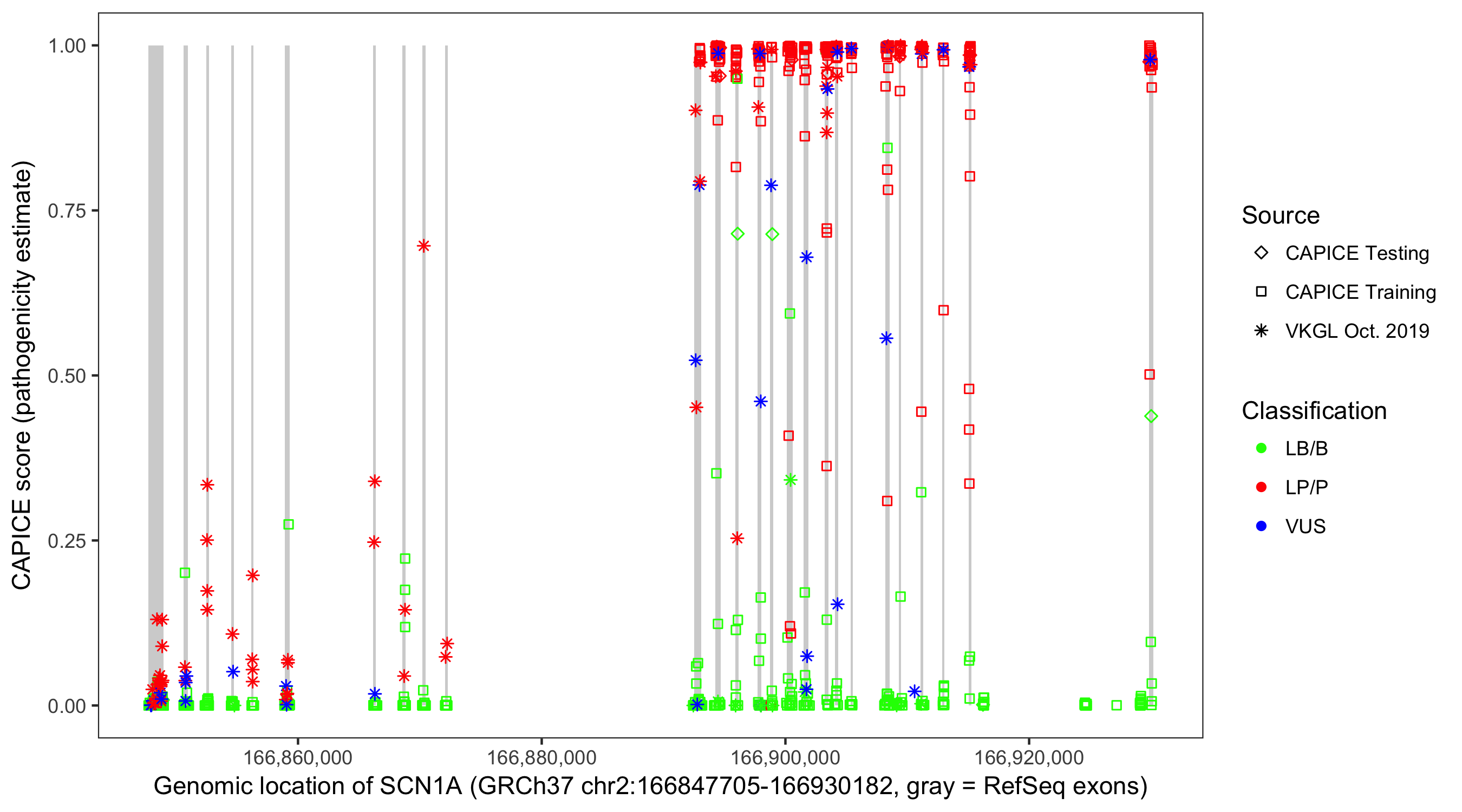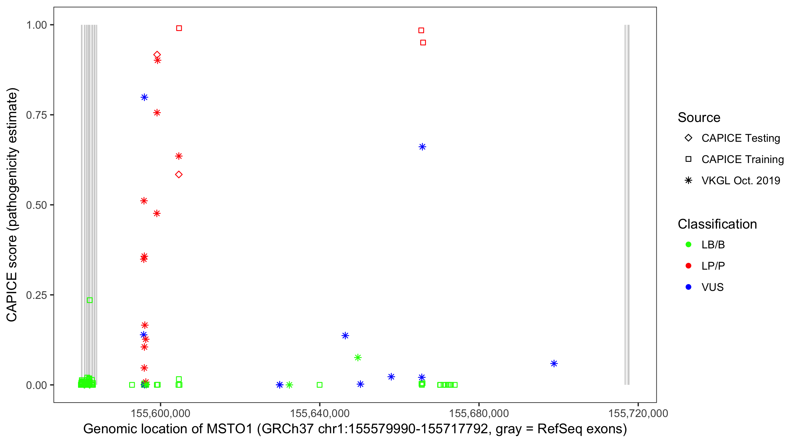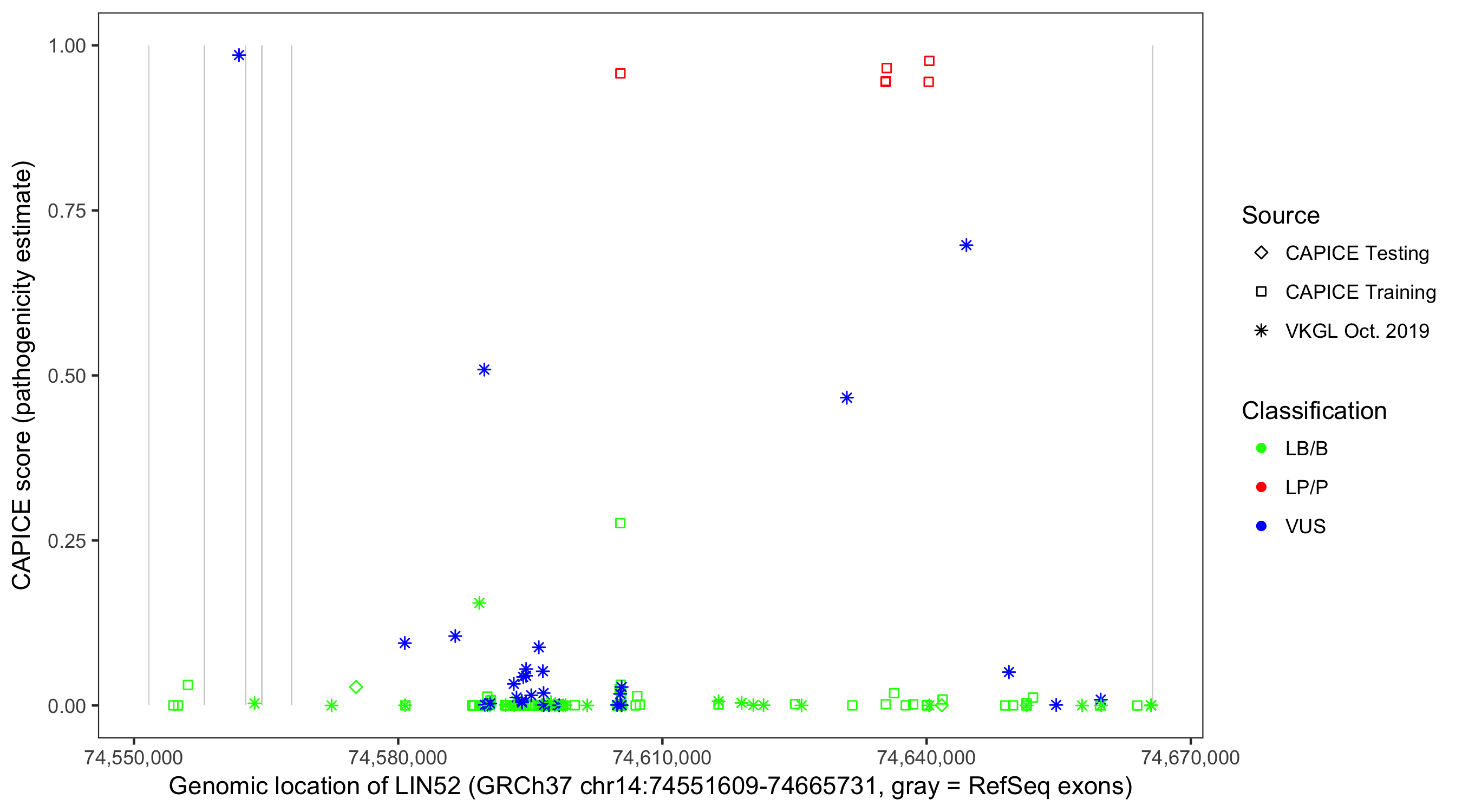 Shown are CAPICE train/test variants plus VKGL Oct 2019.