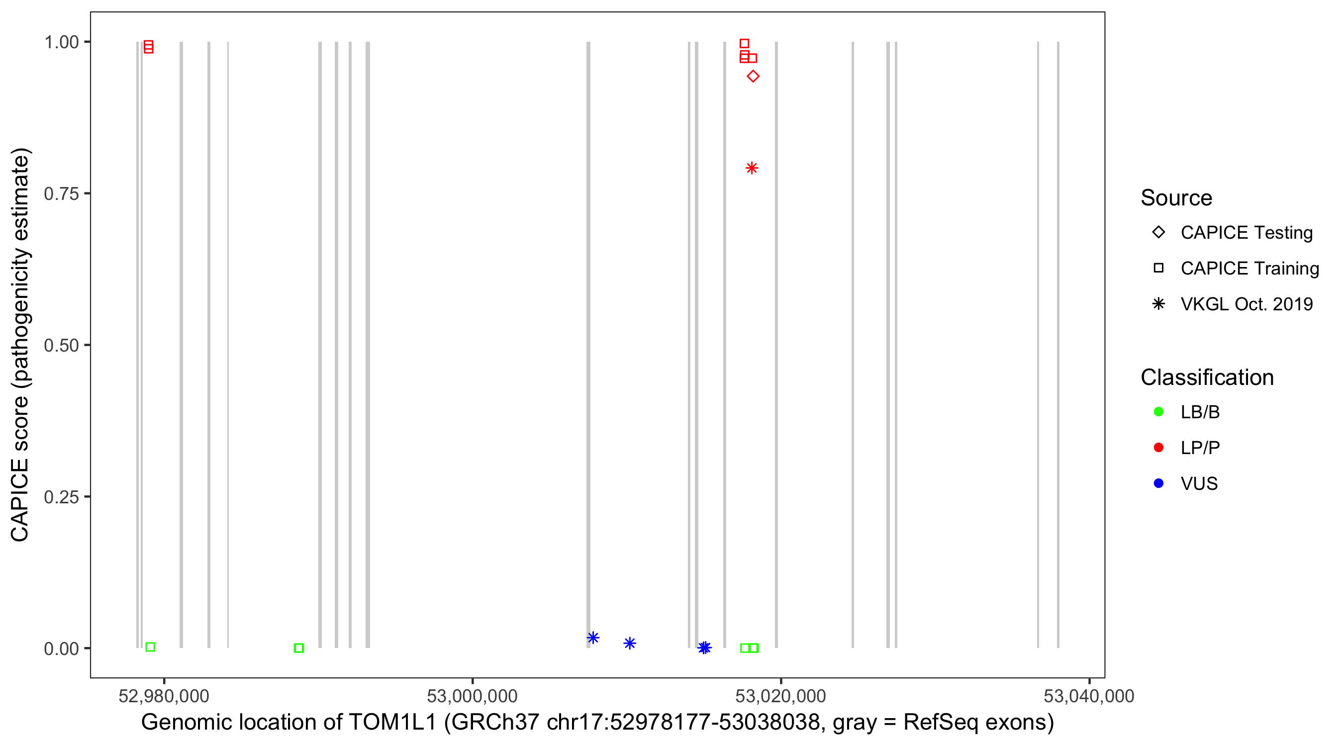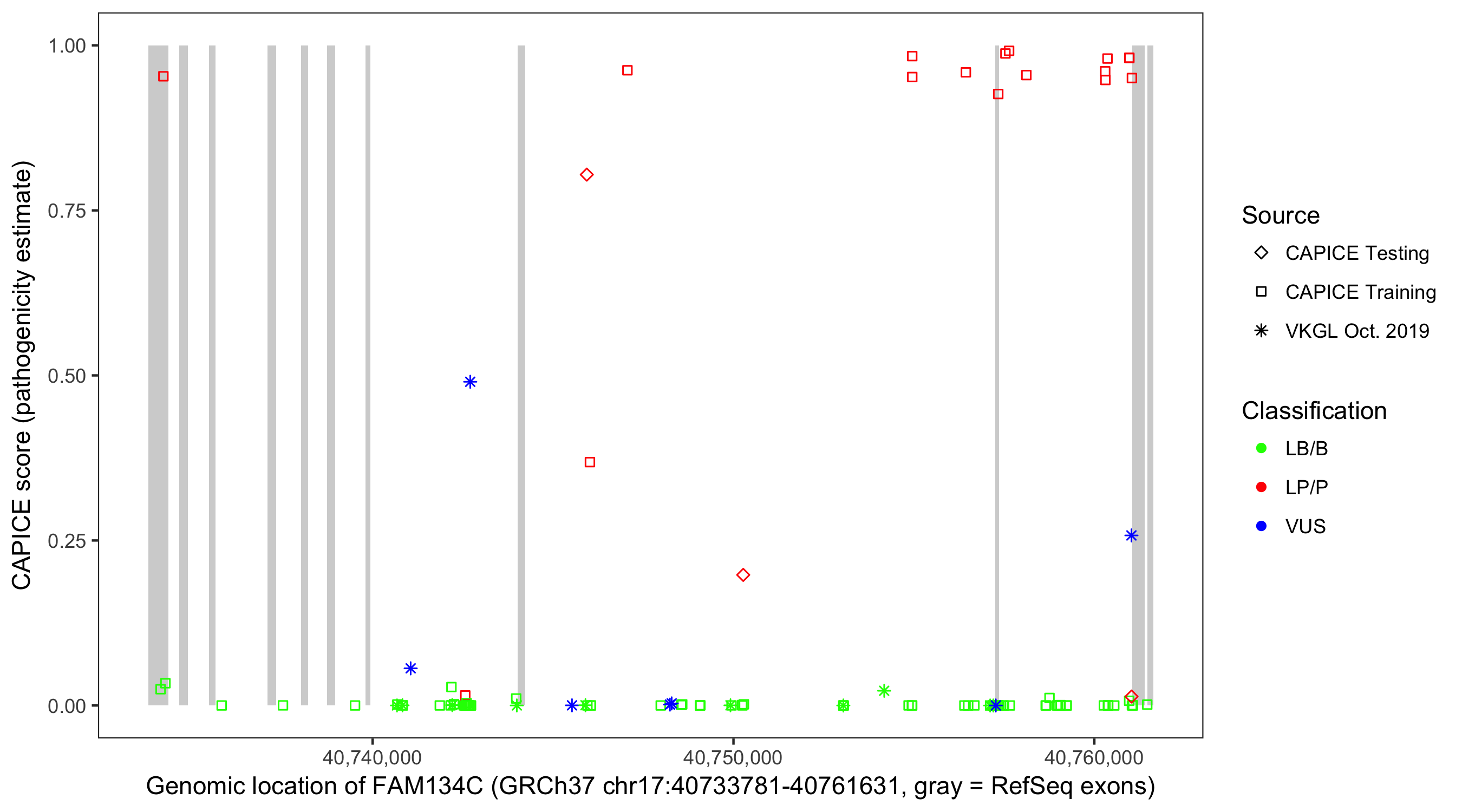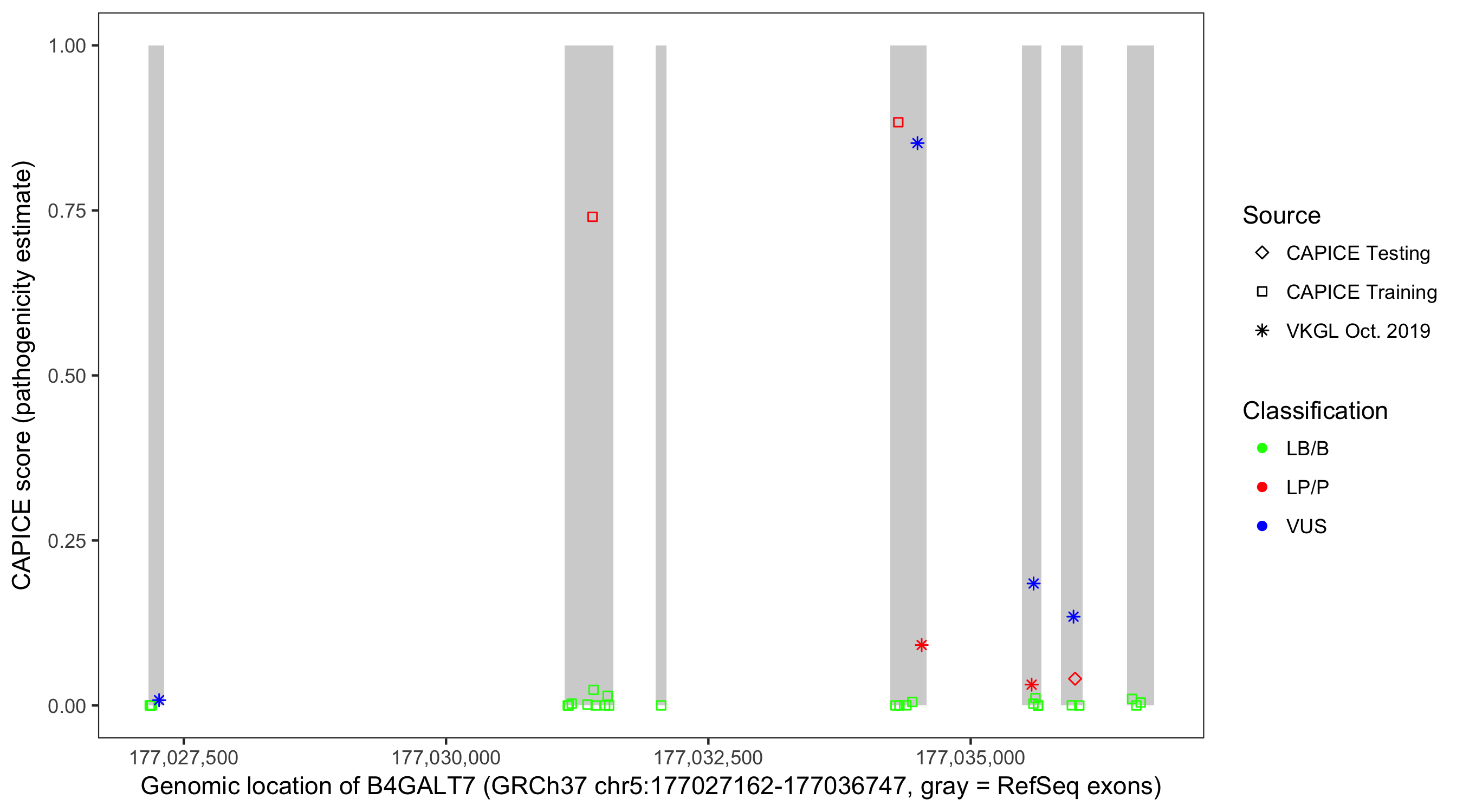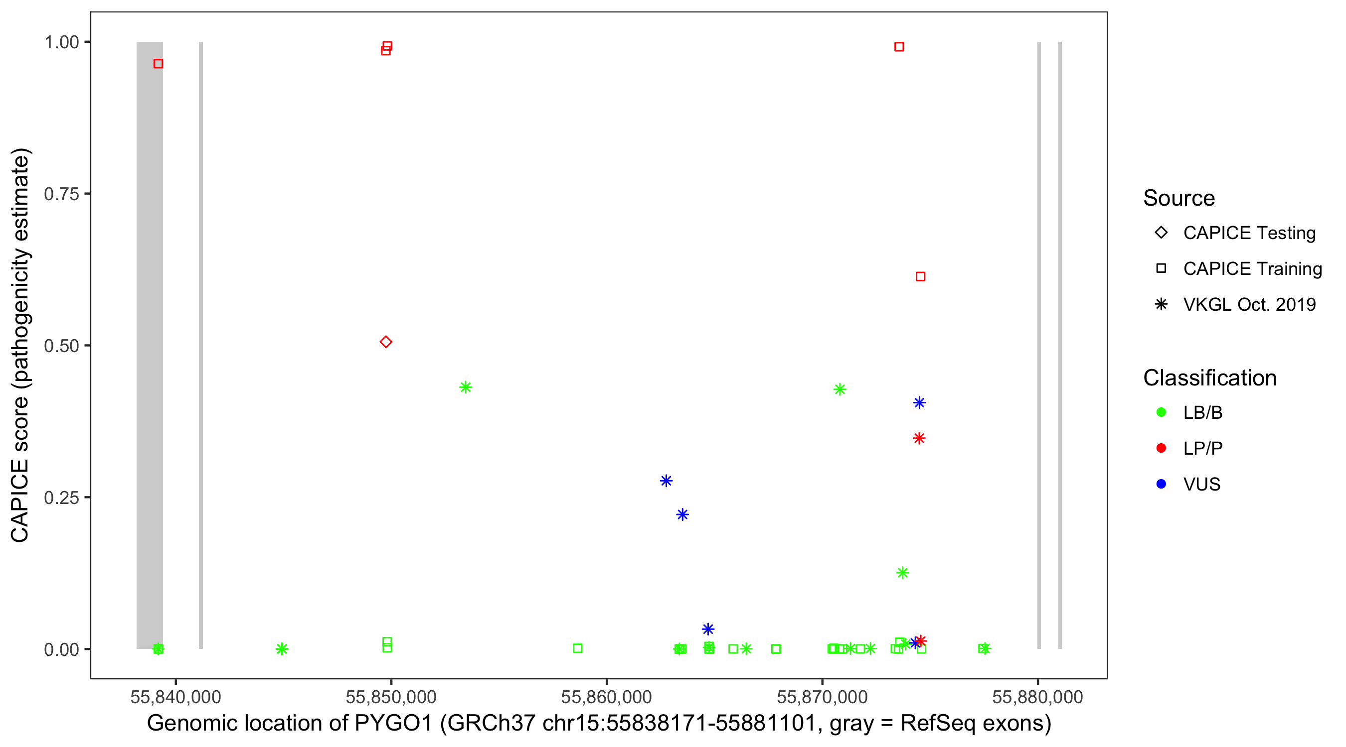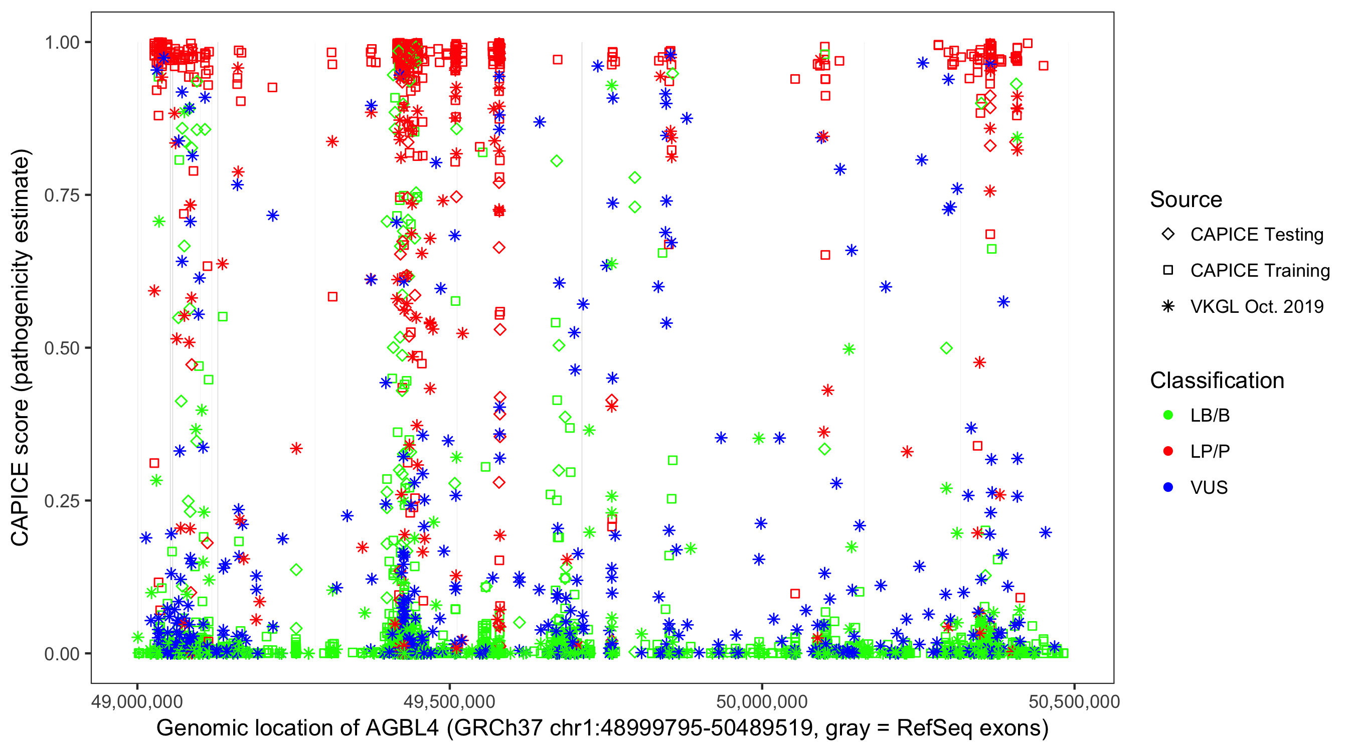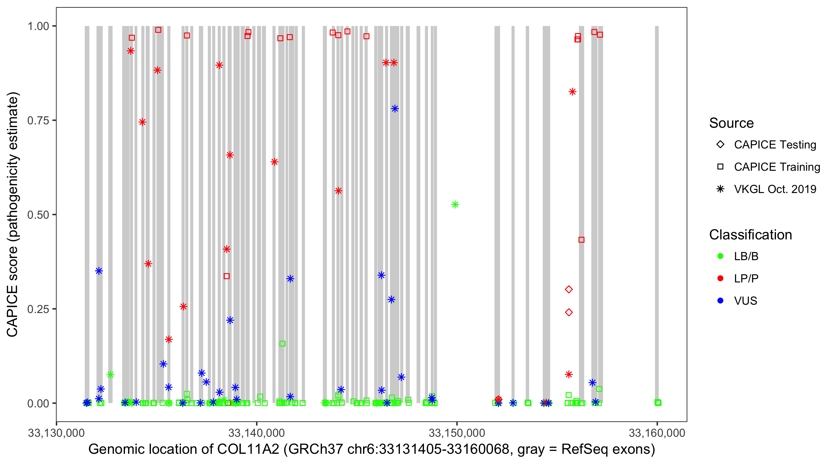 Shown are CAPICE train/test variants plus VKGL Oct 2019.
