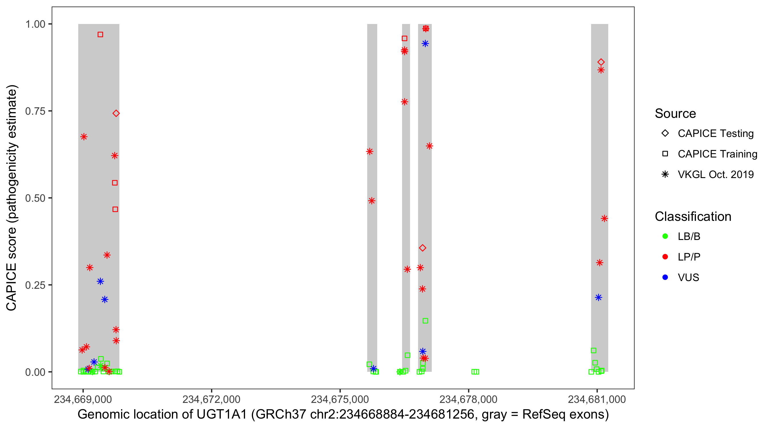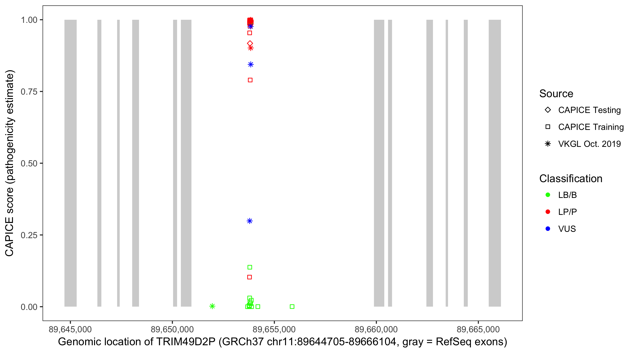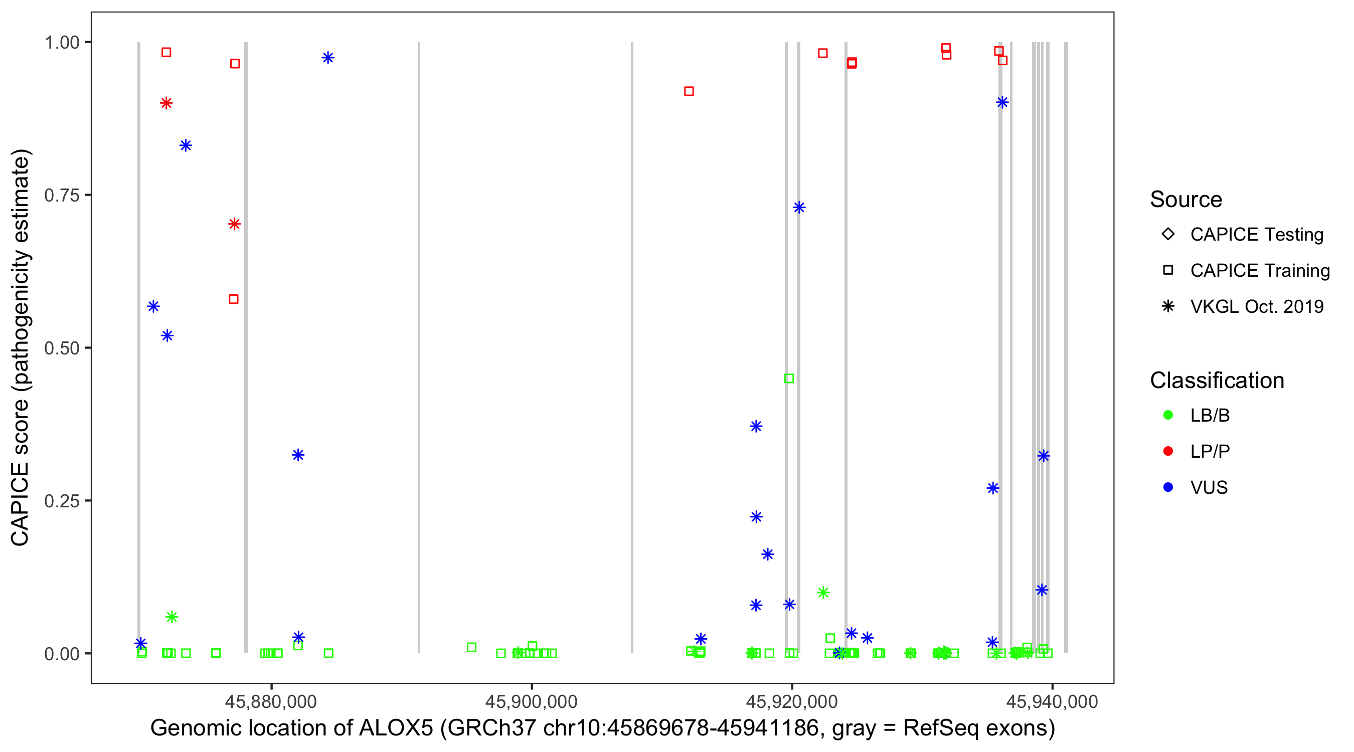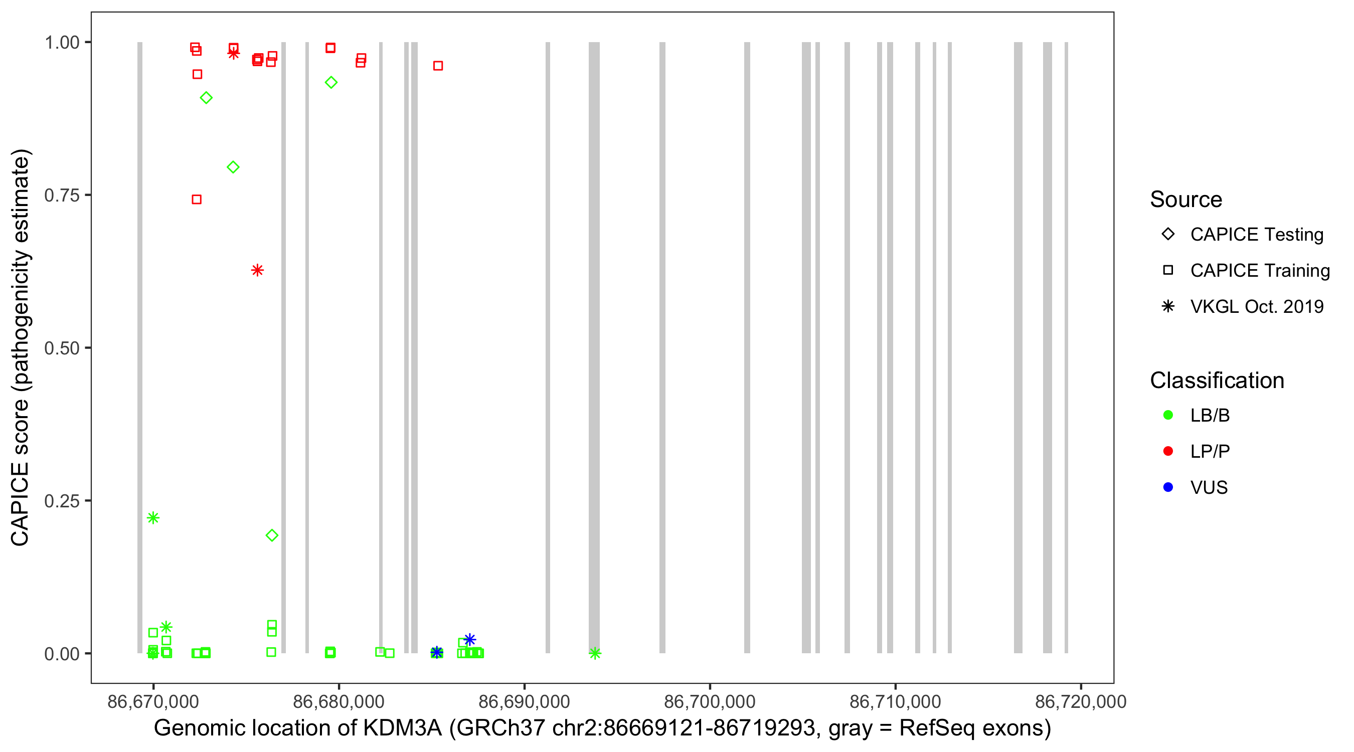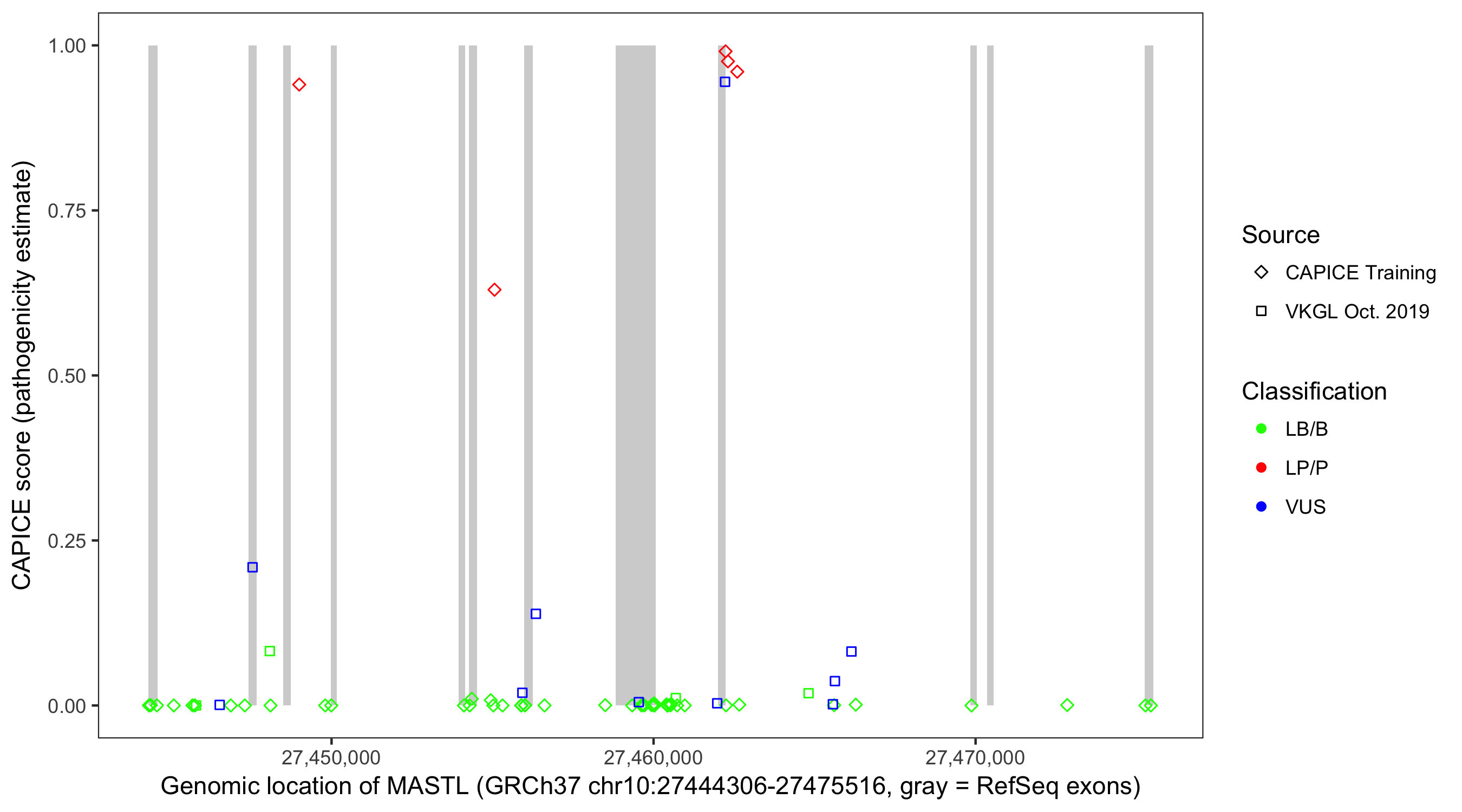 Shown are CAPICE train/test variants plus VKGL Oct 2019.