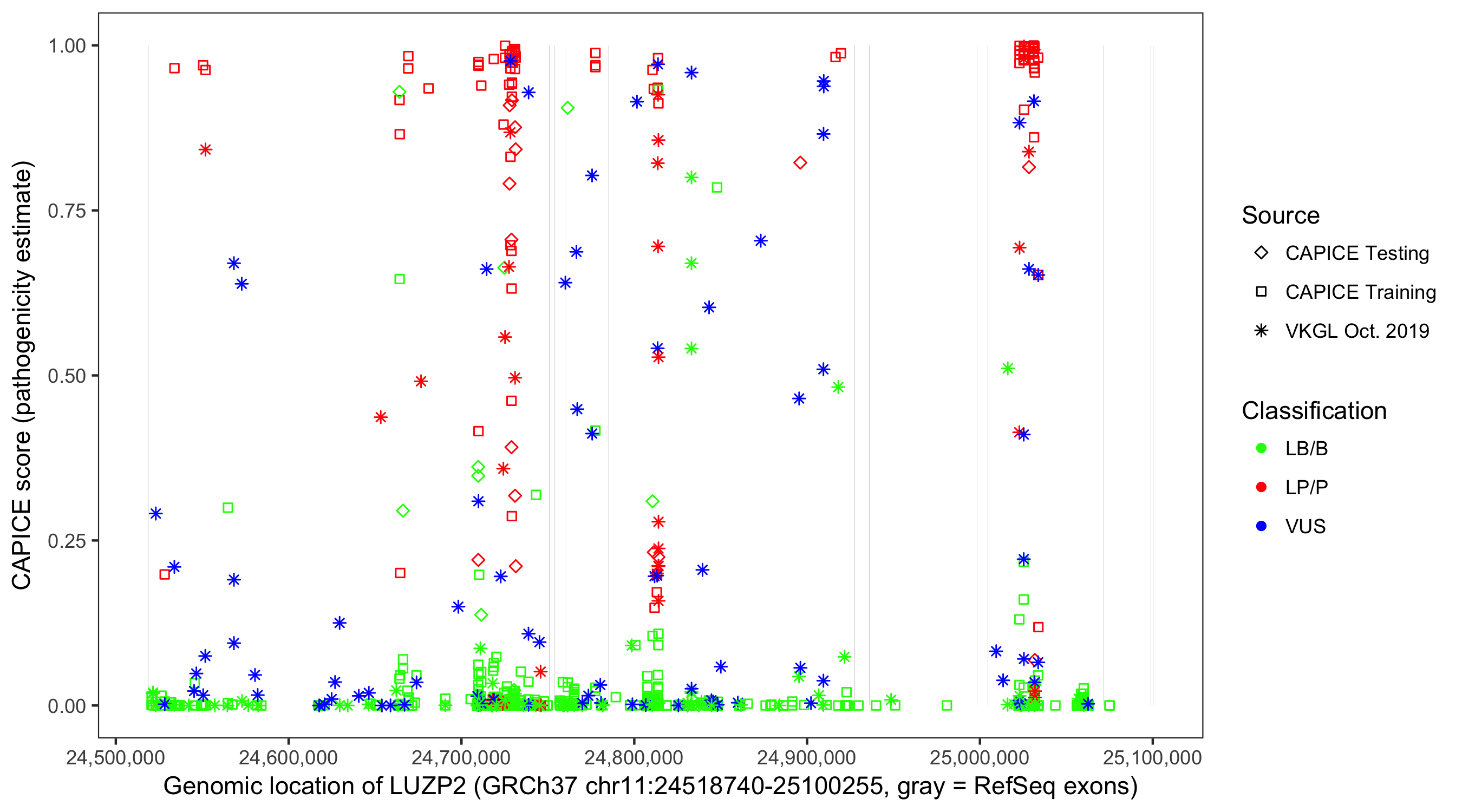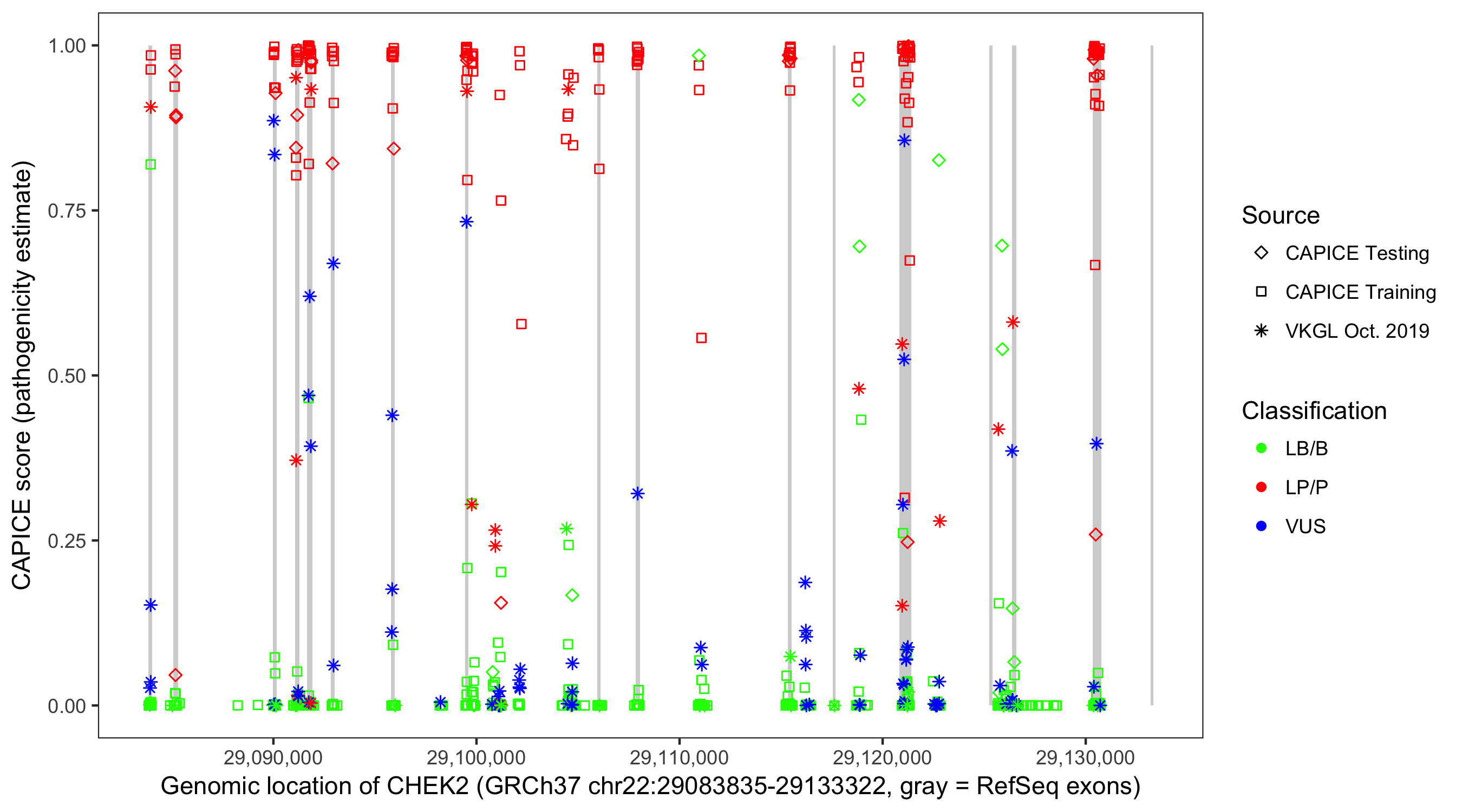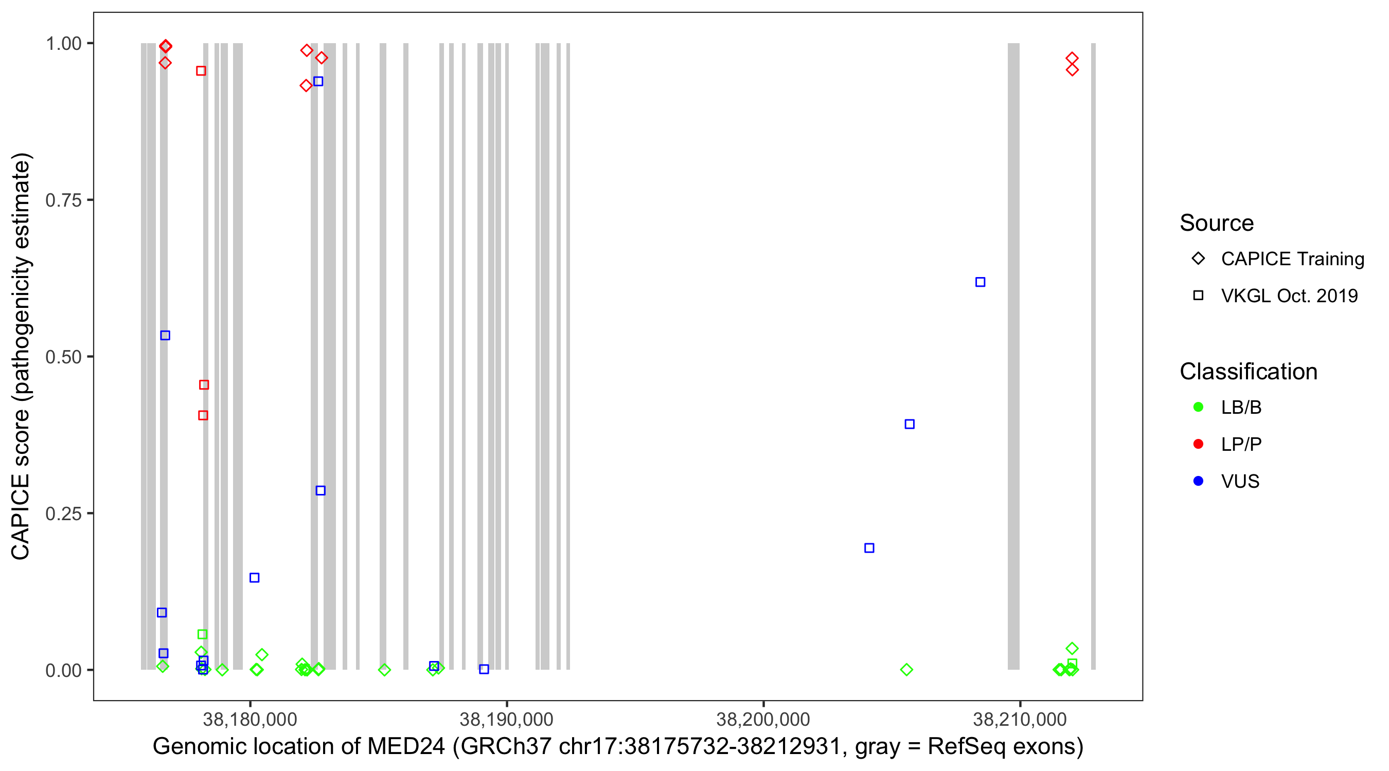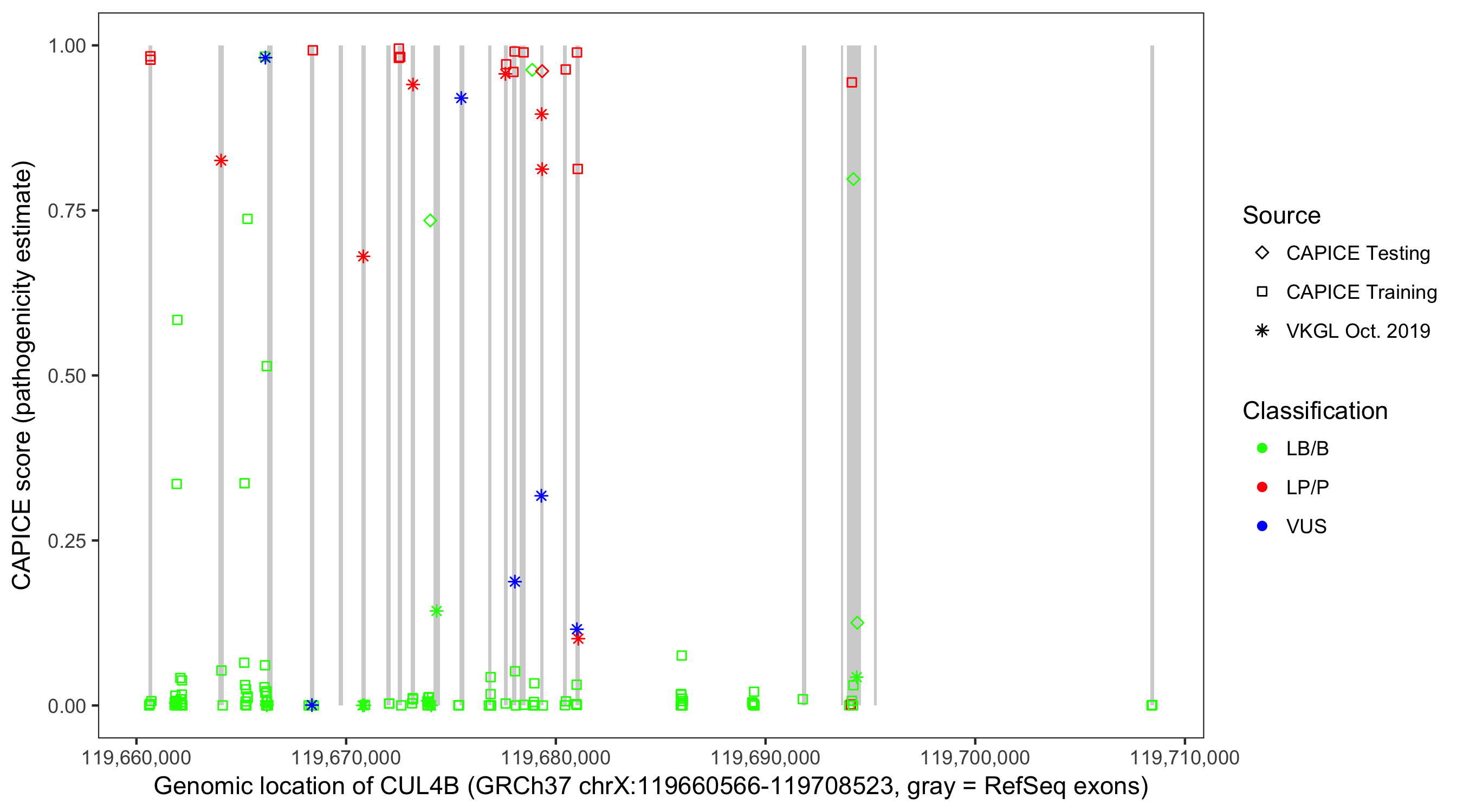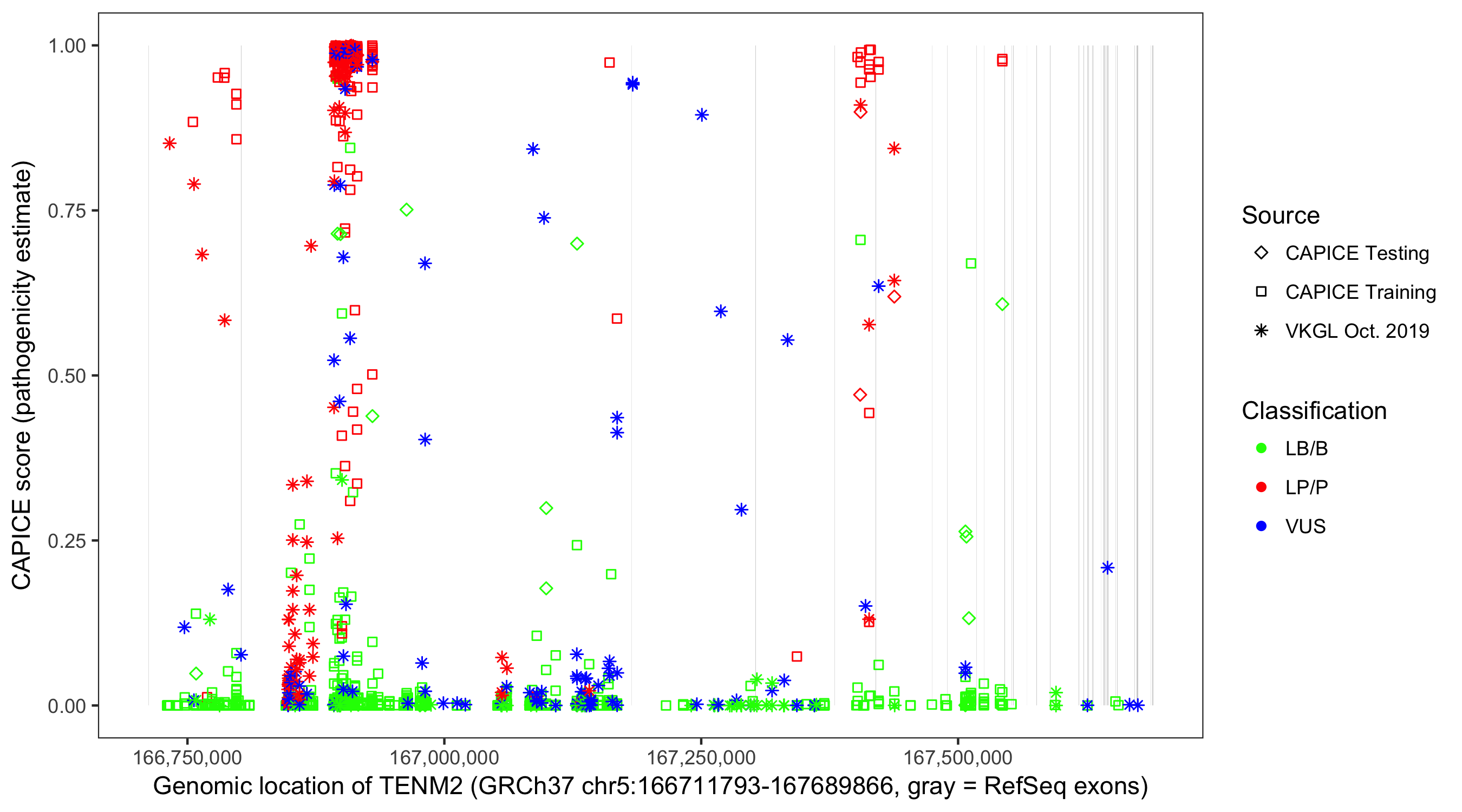 Shown are CAPICE train/test variants plus VKGL Oct 2019.