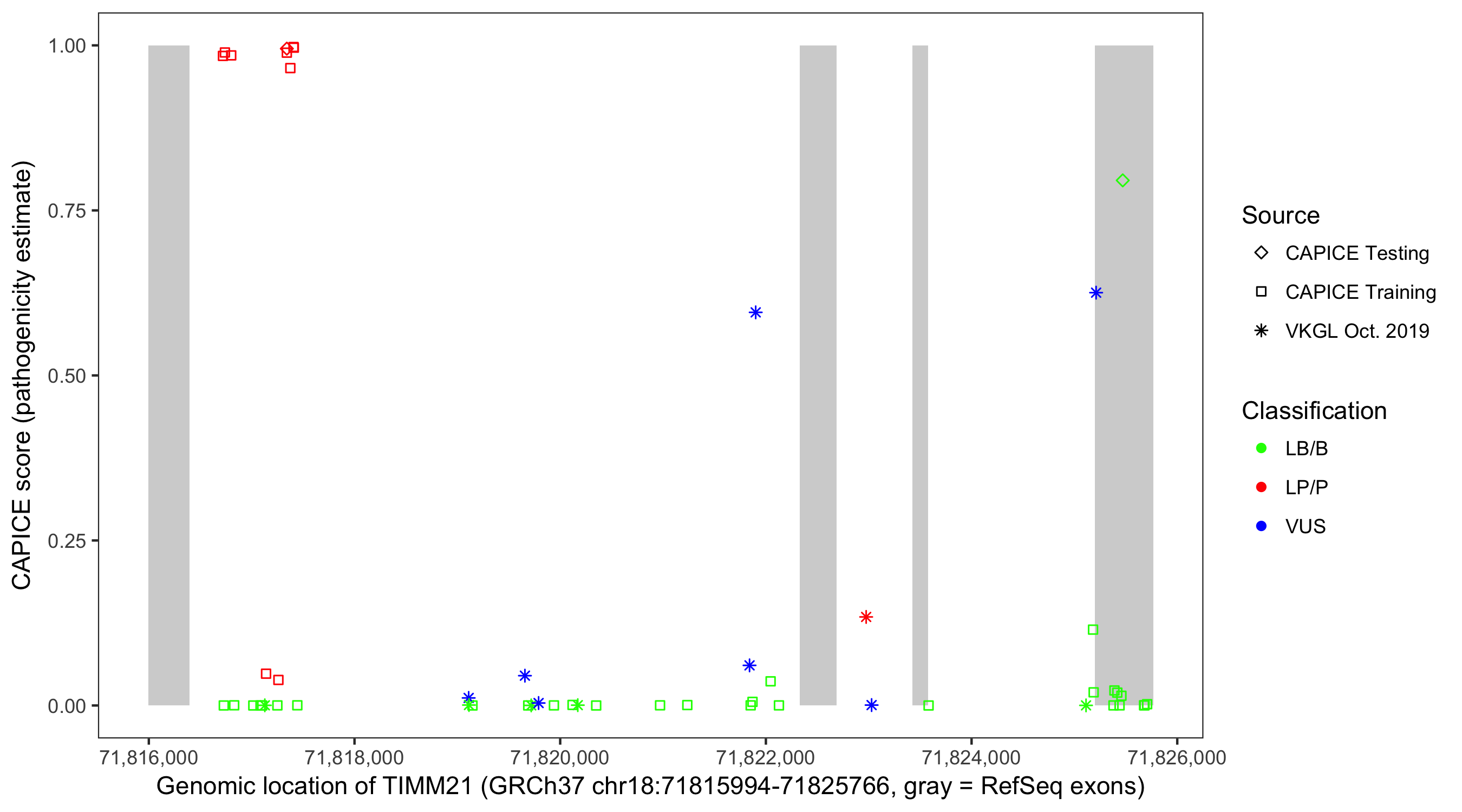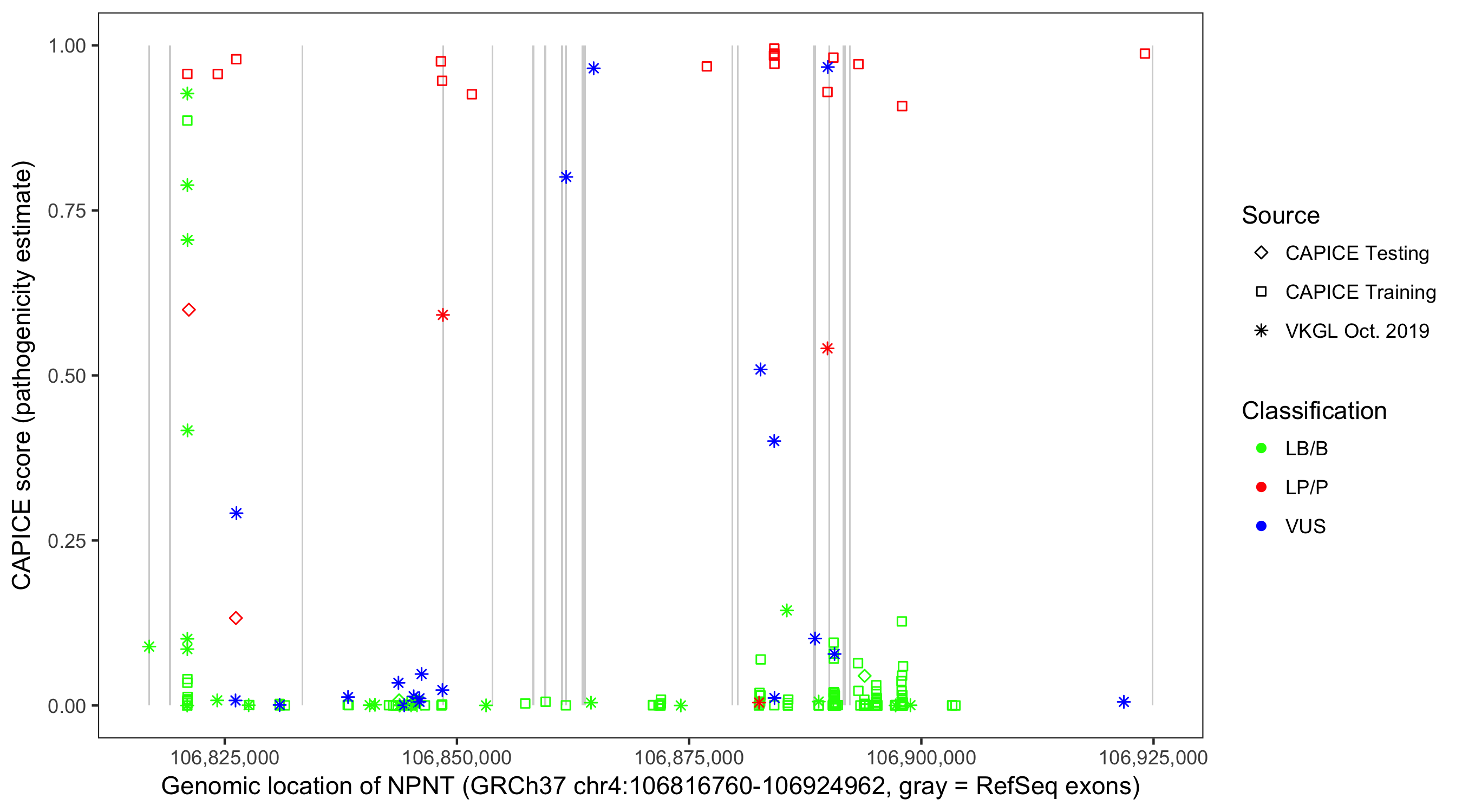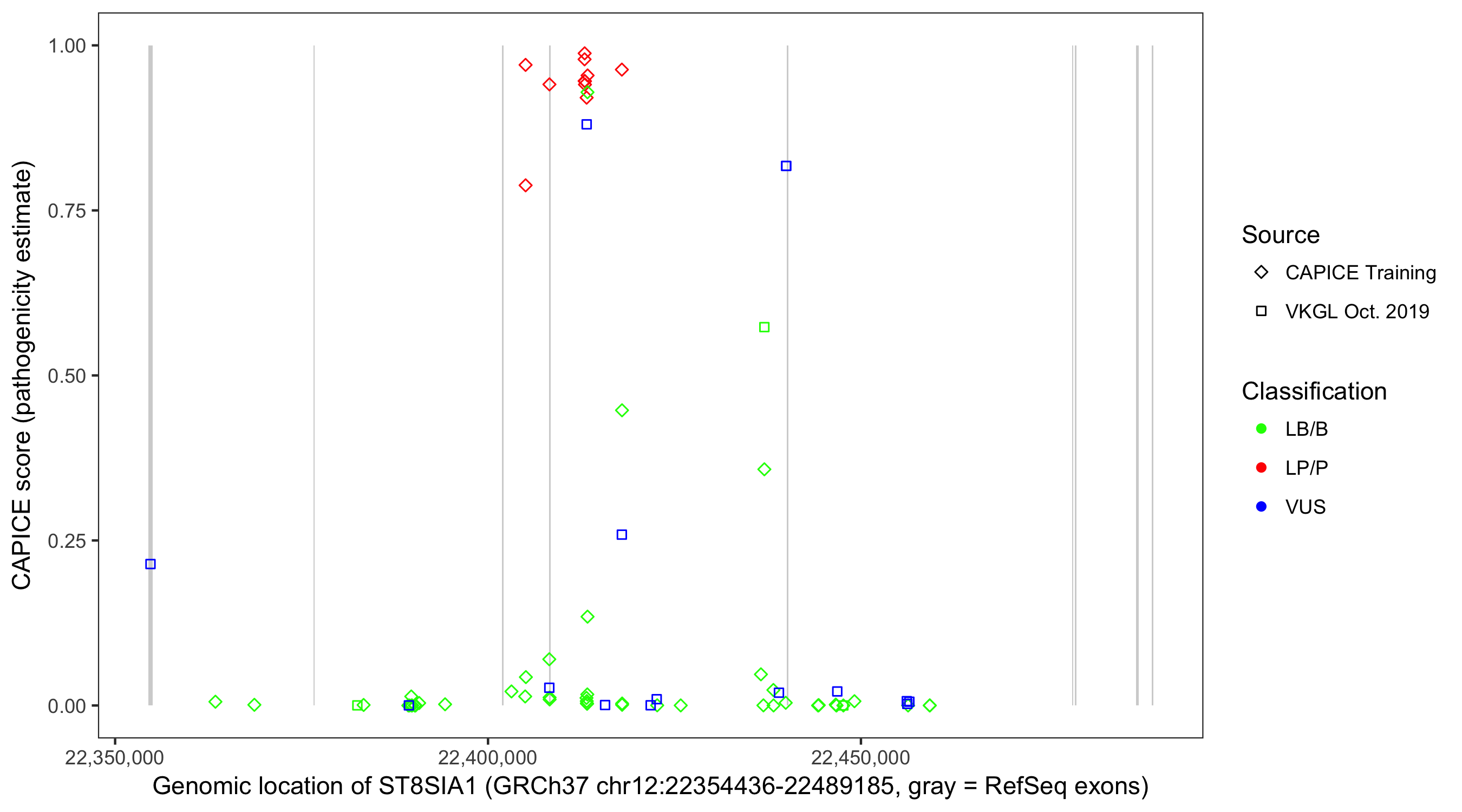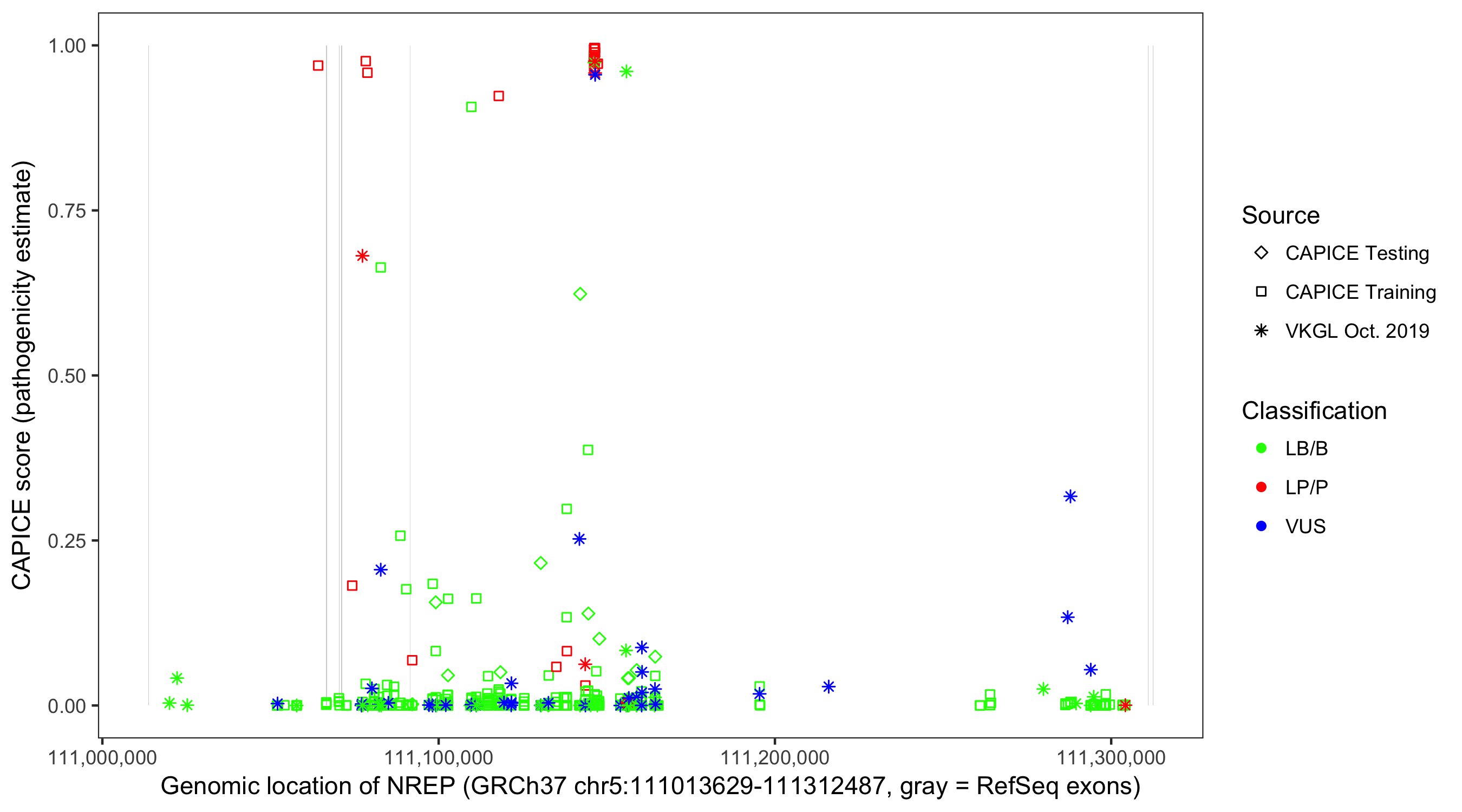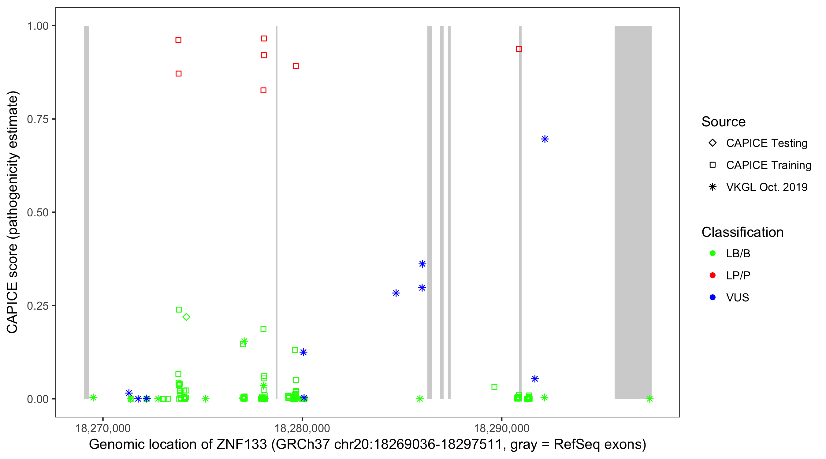 Shown are CAPICE train/test variants plus VKGL Oct 2019.