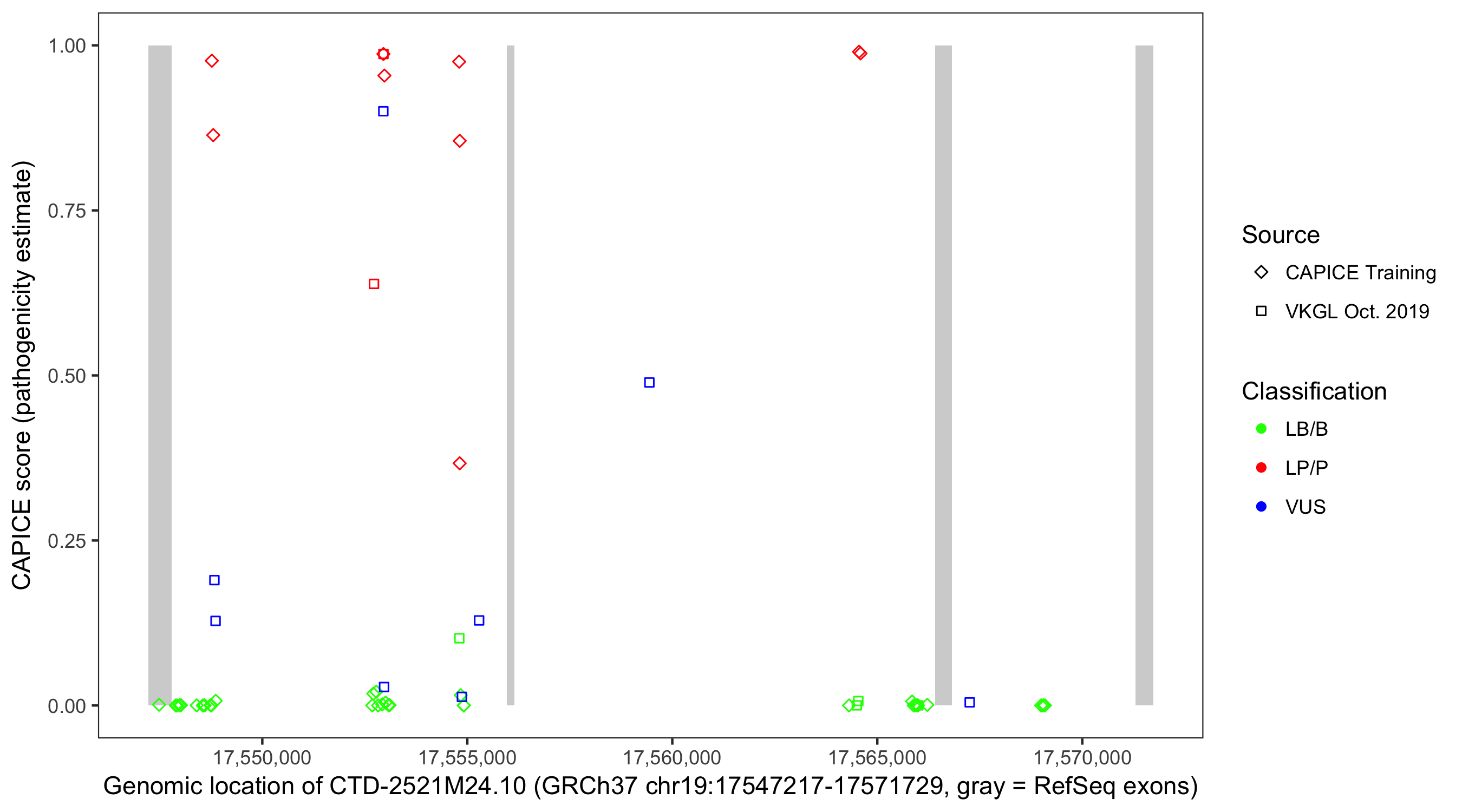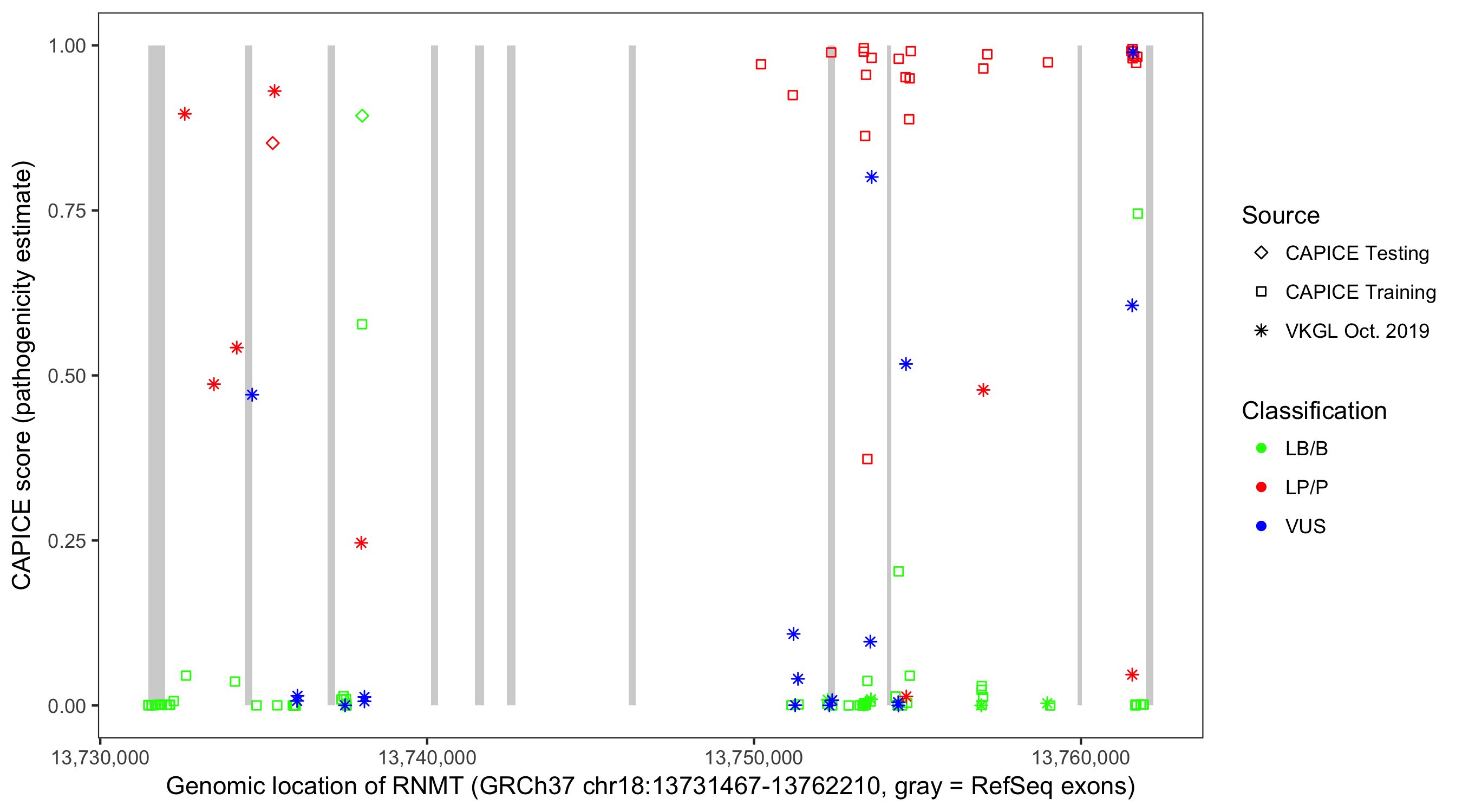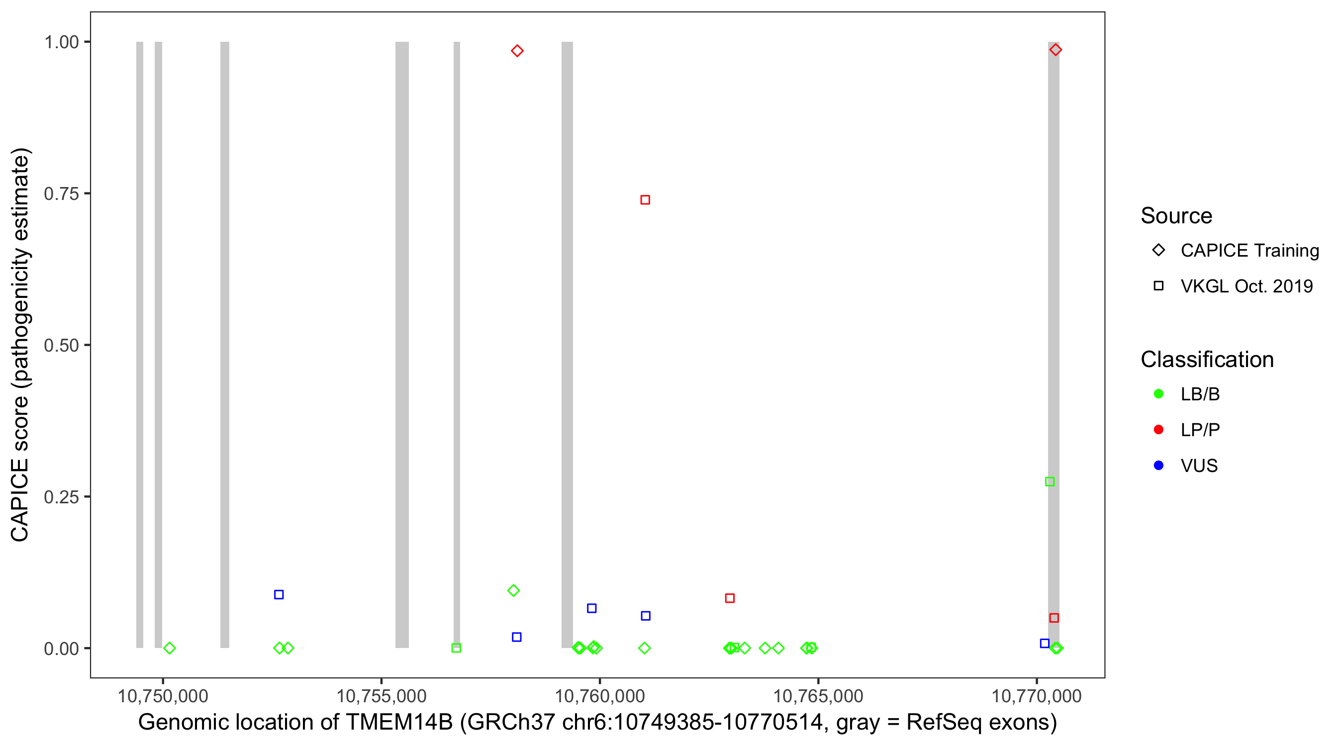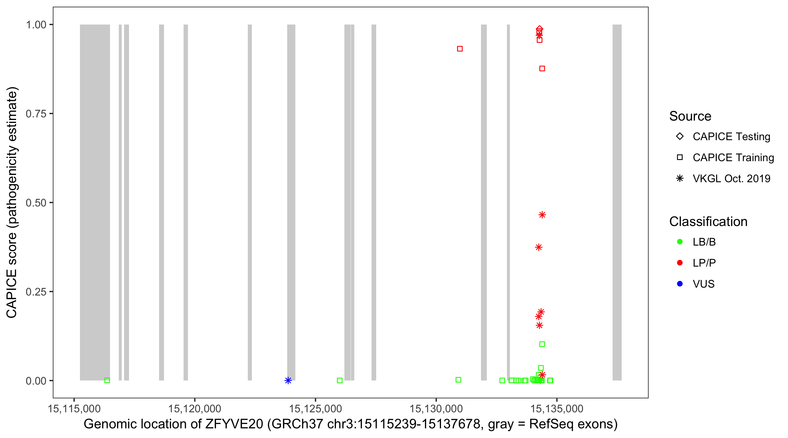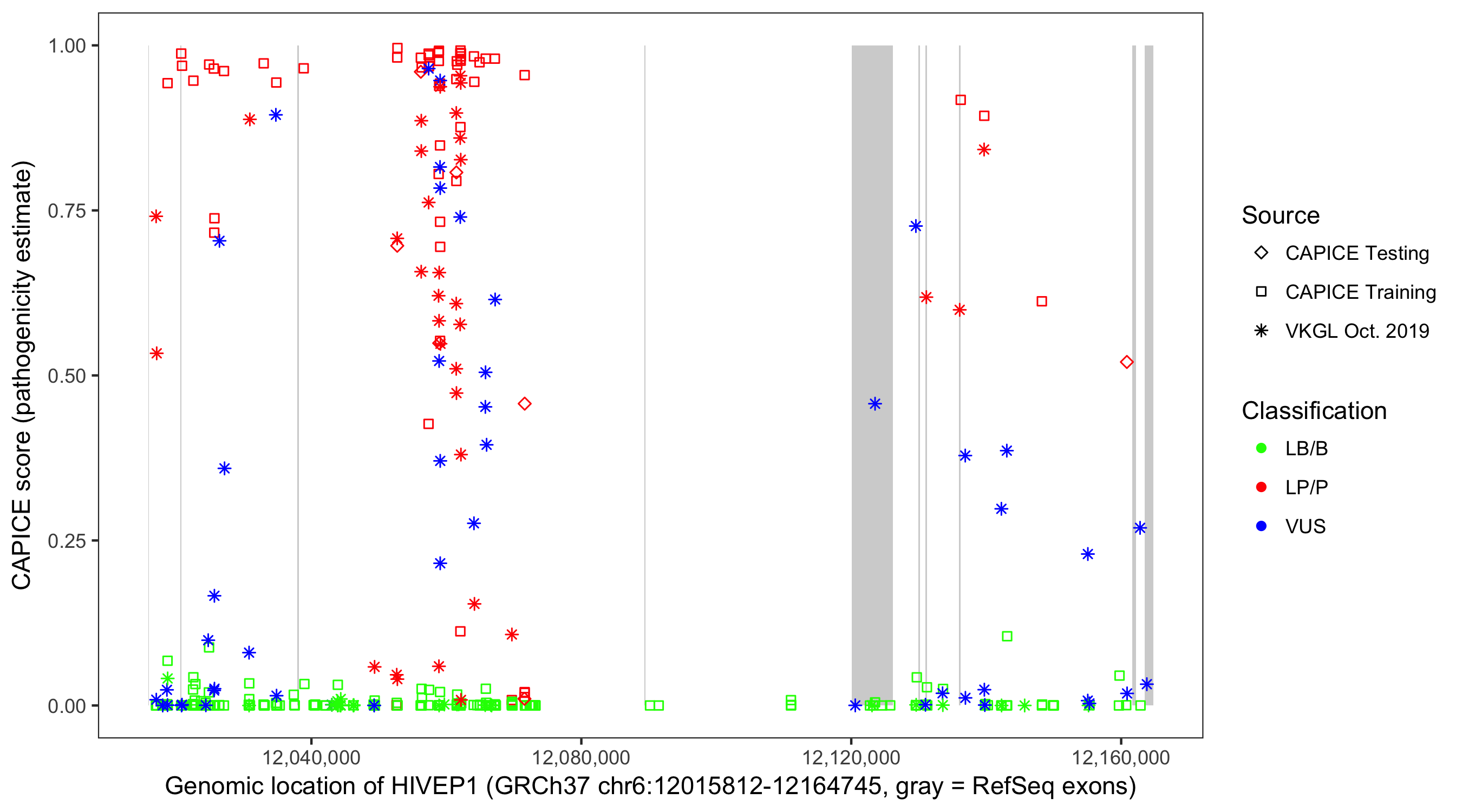 Shown are CAPICE train/test variants plus VKGL Oct 2019.