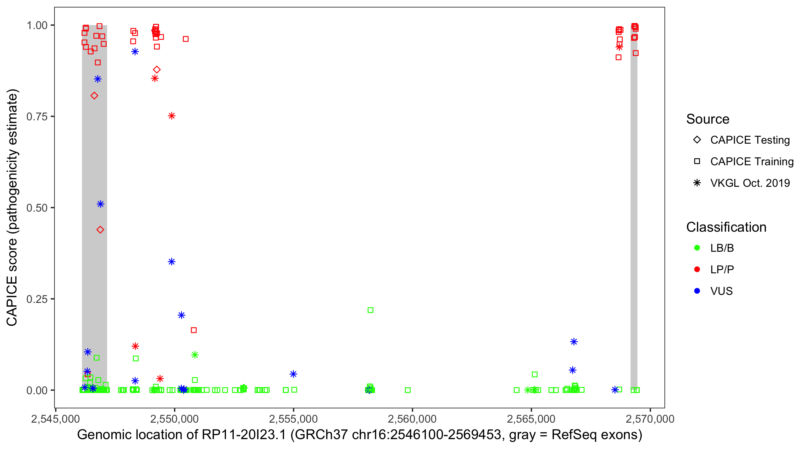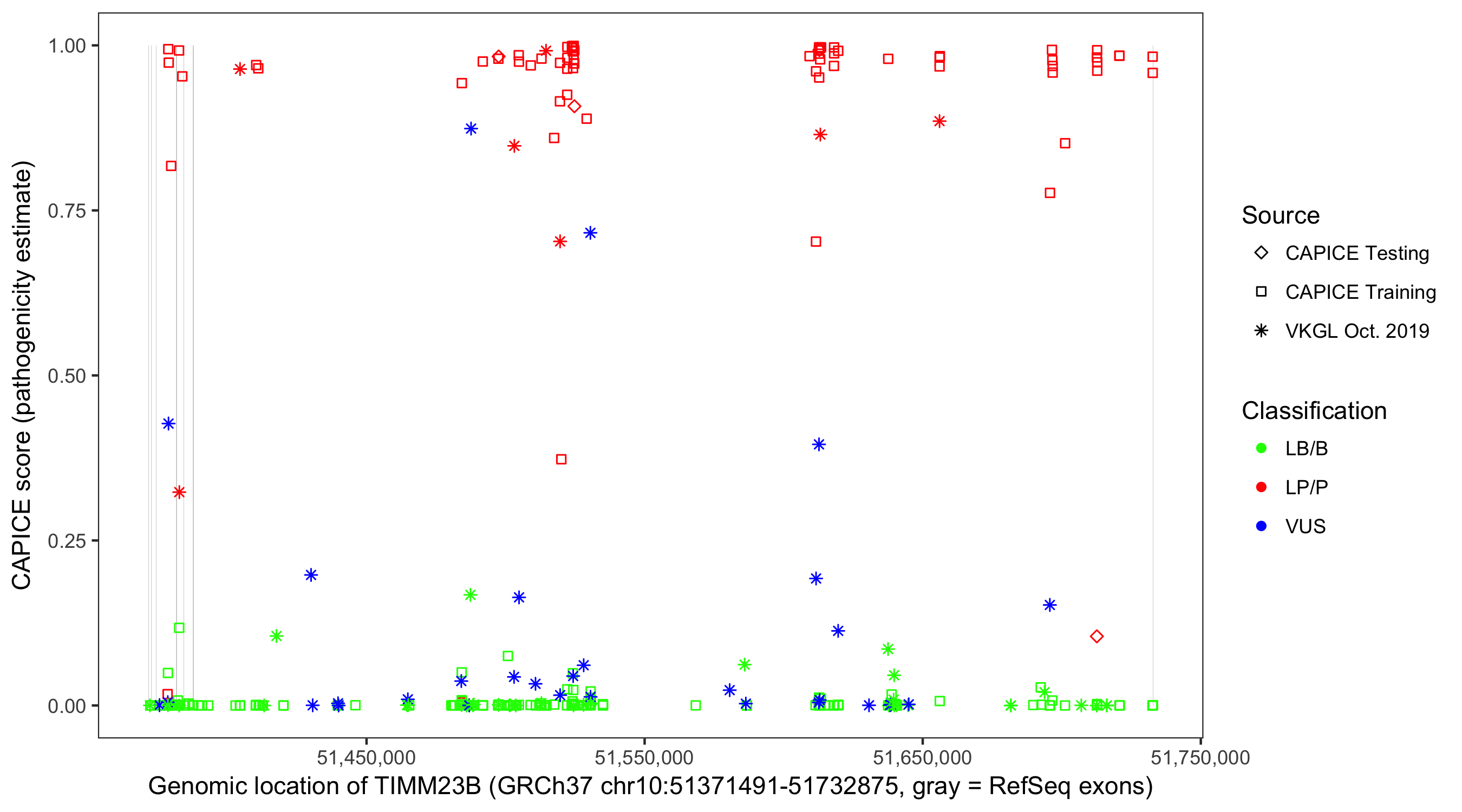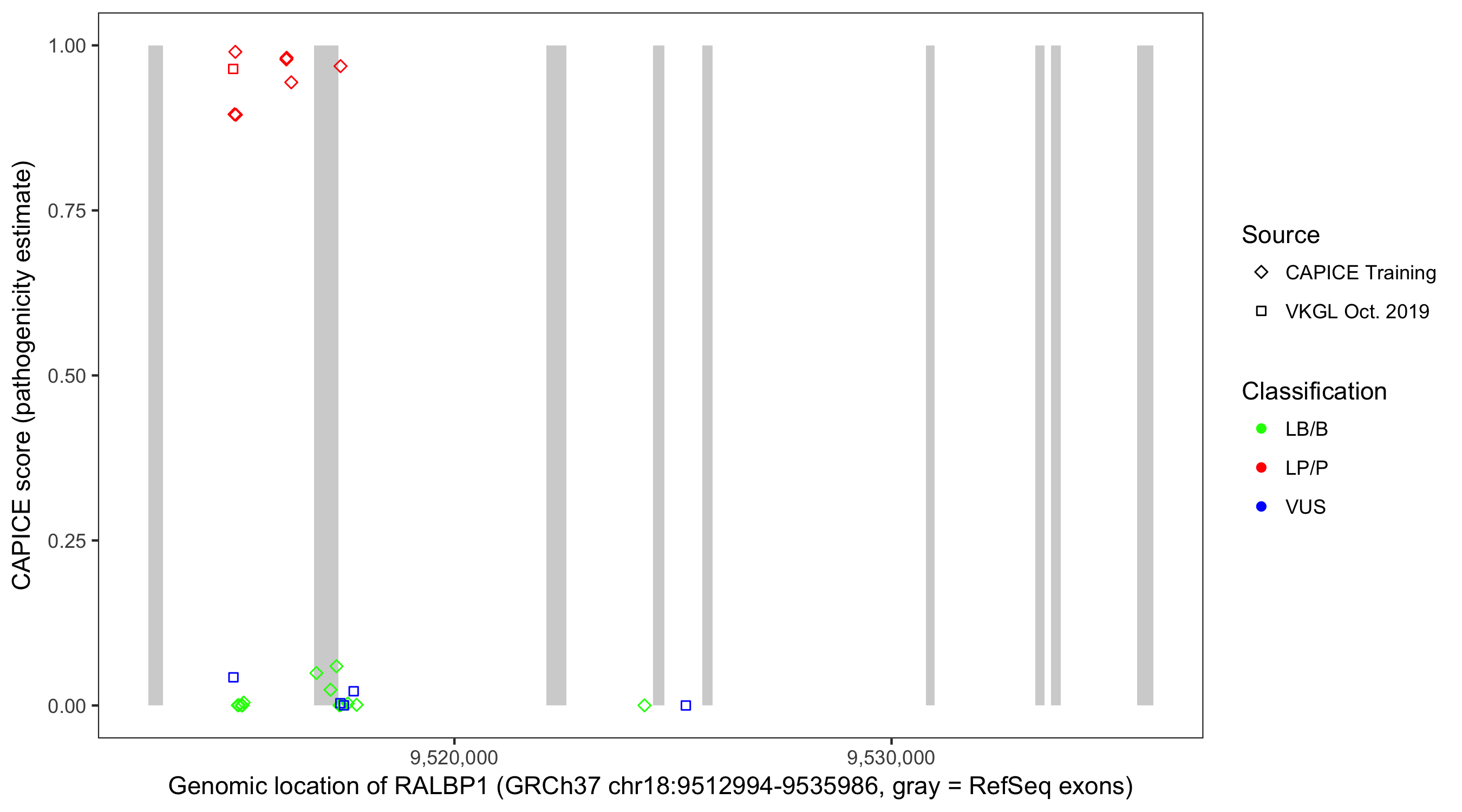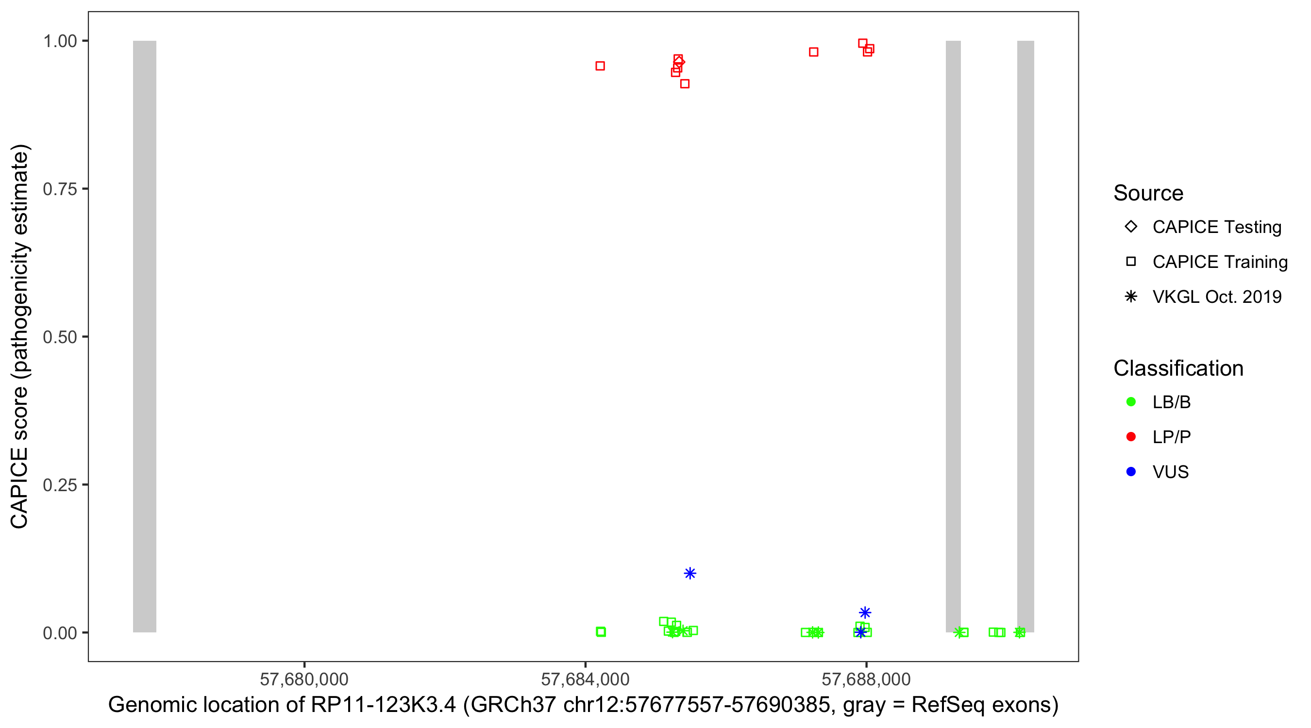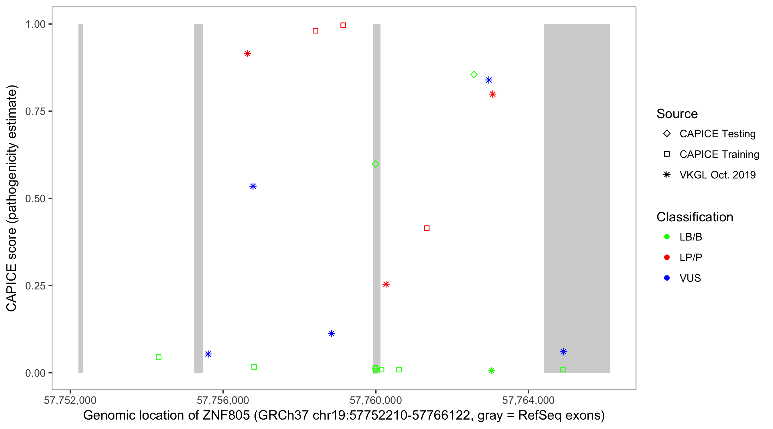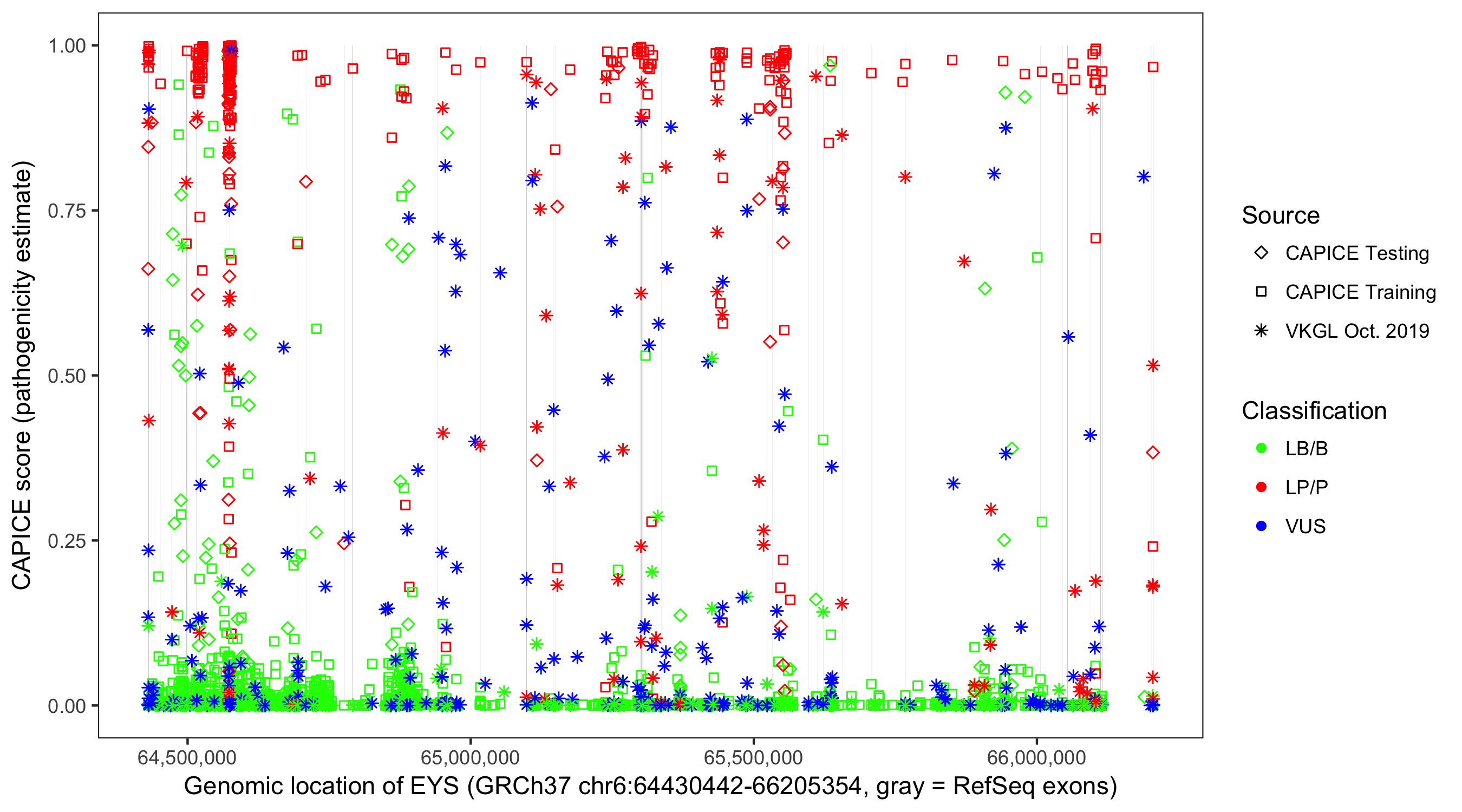 Shown are CAPICE train/test variants plus VKGL Oct 2019.