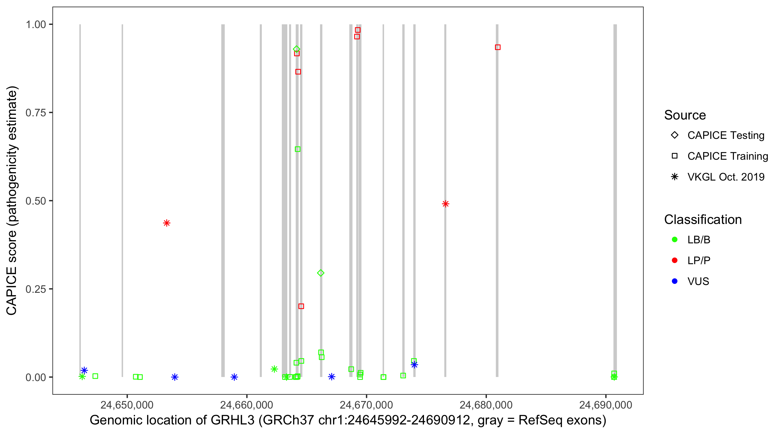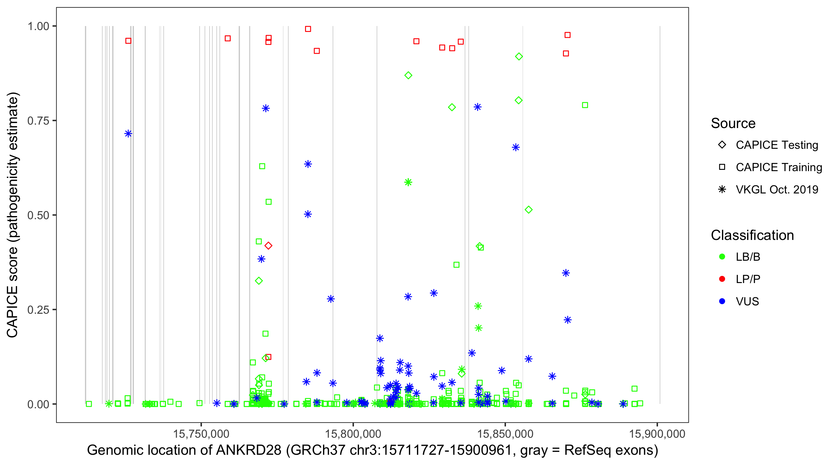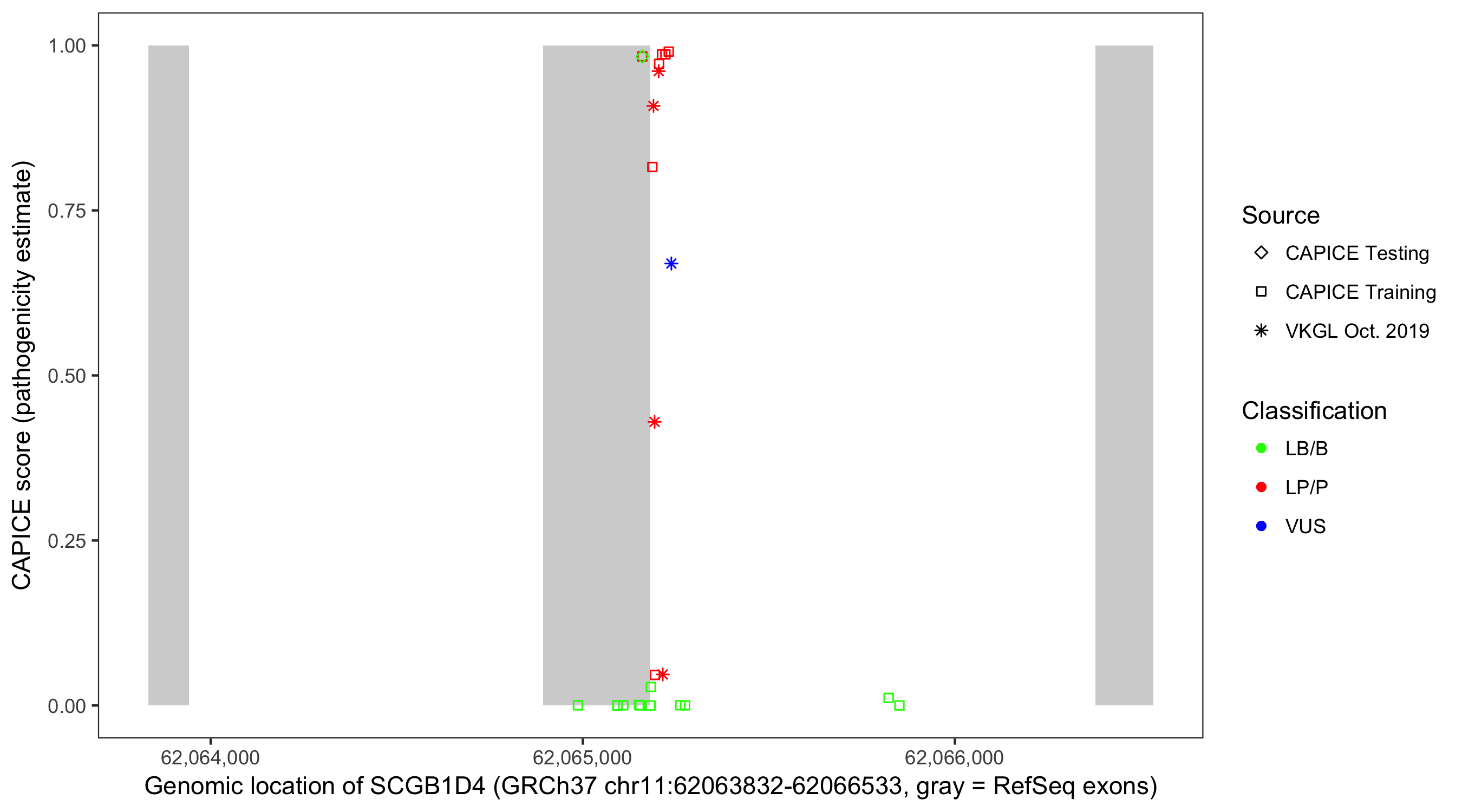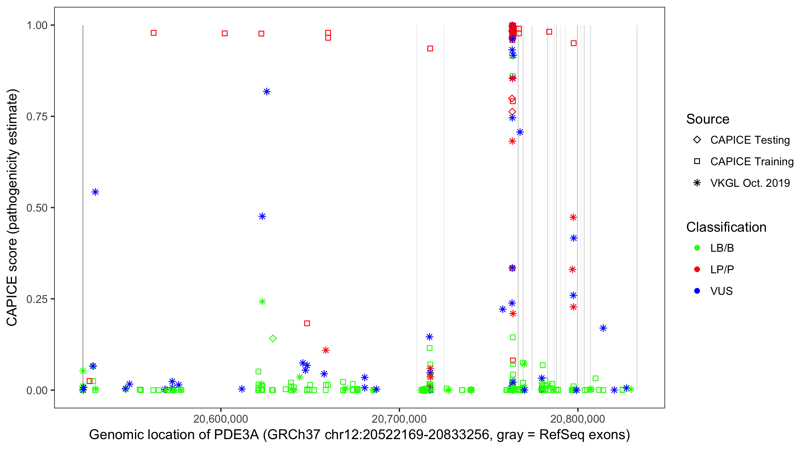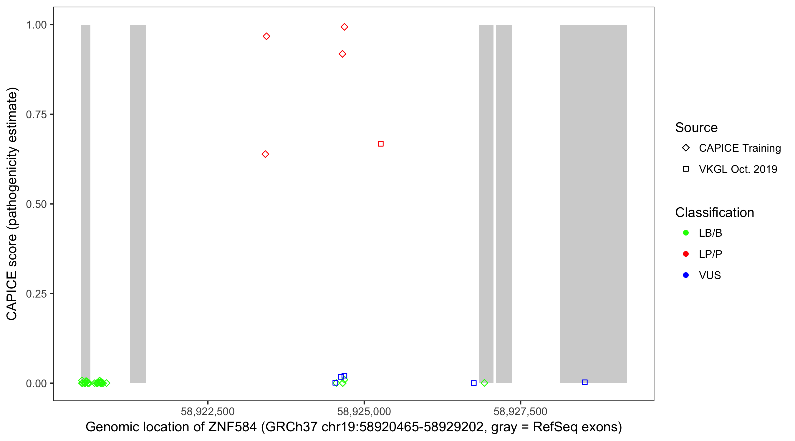 Shown are CAPICE train/test variants plus VKGL Oct 2019.