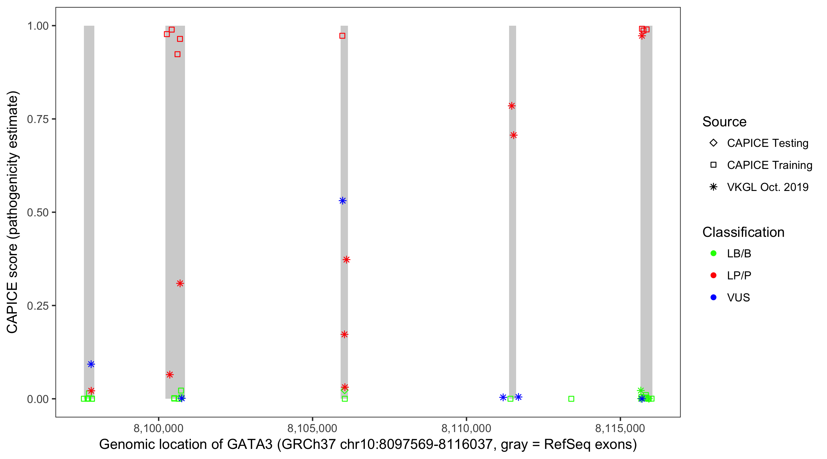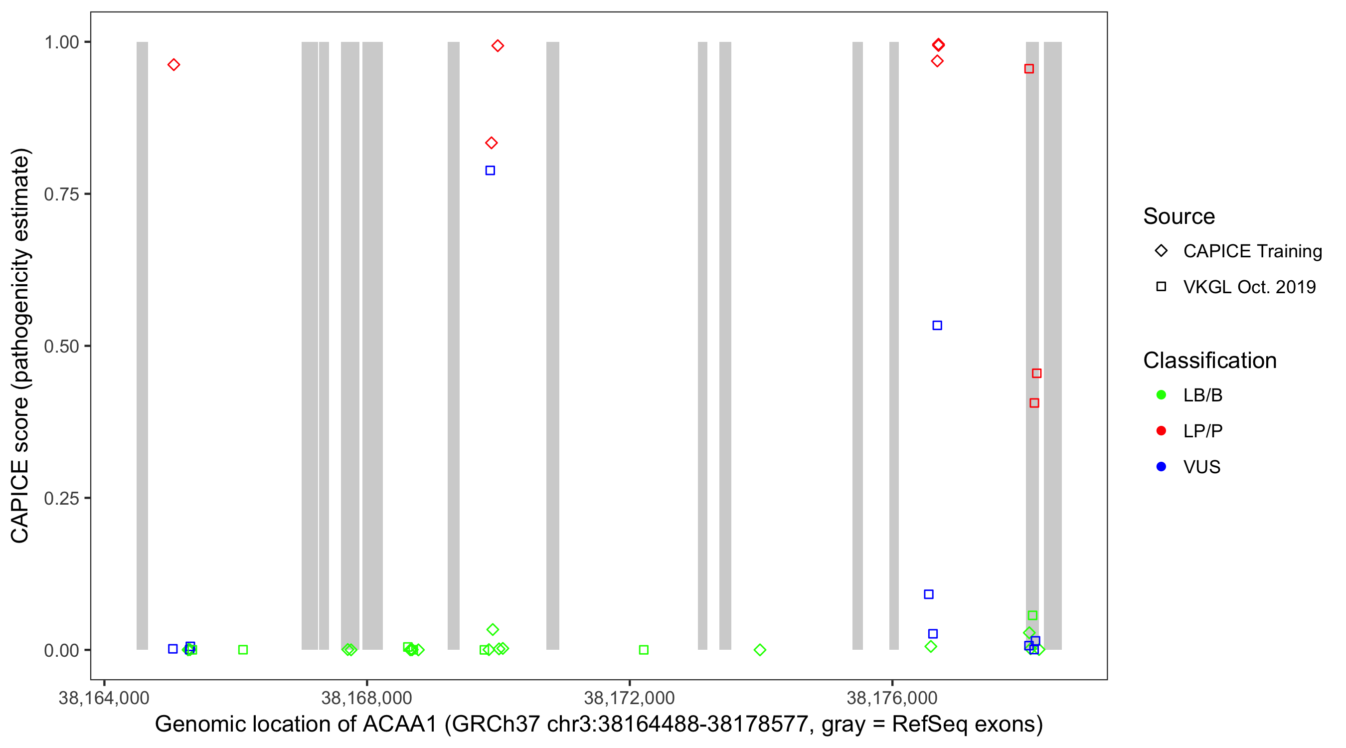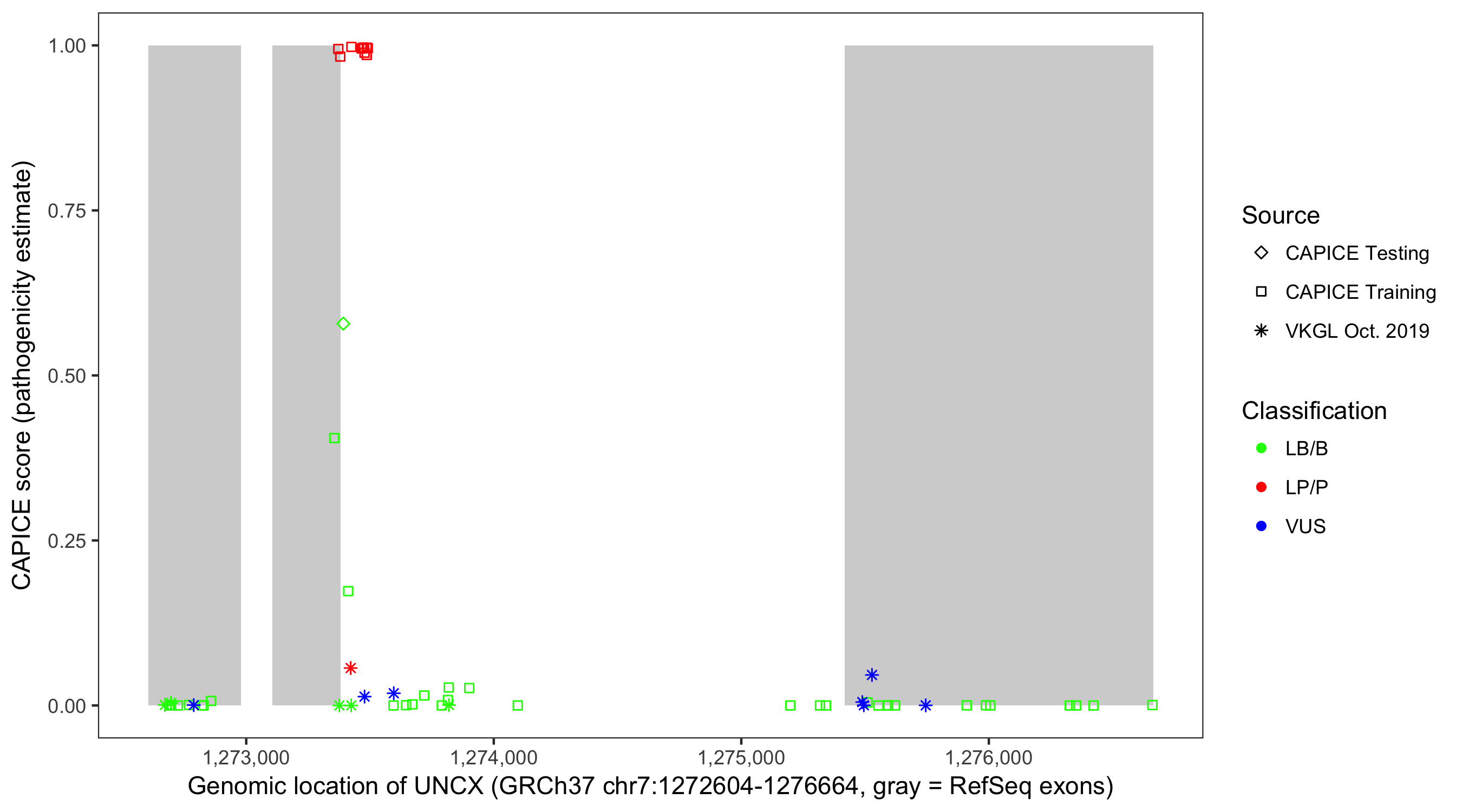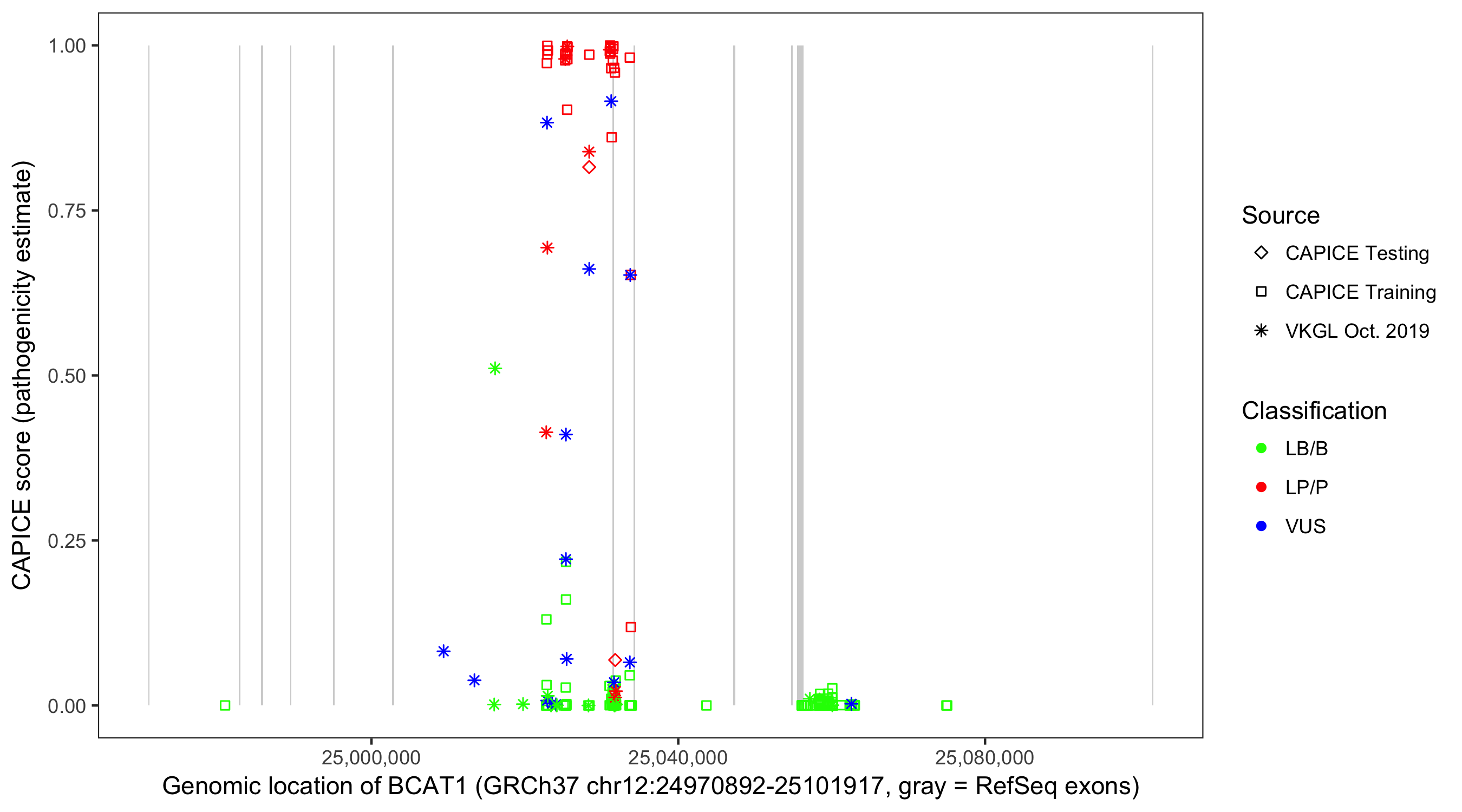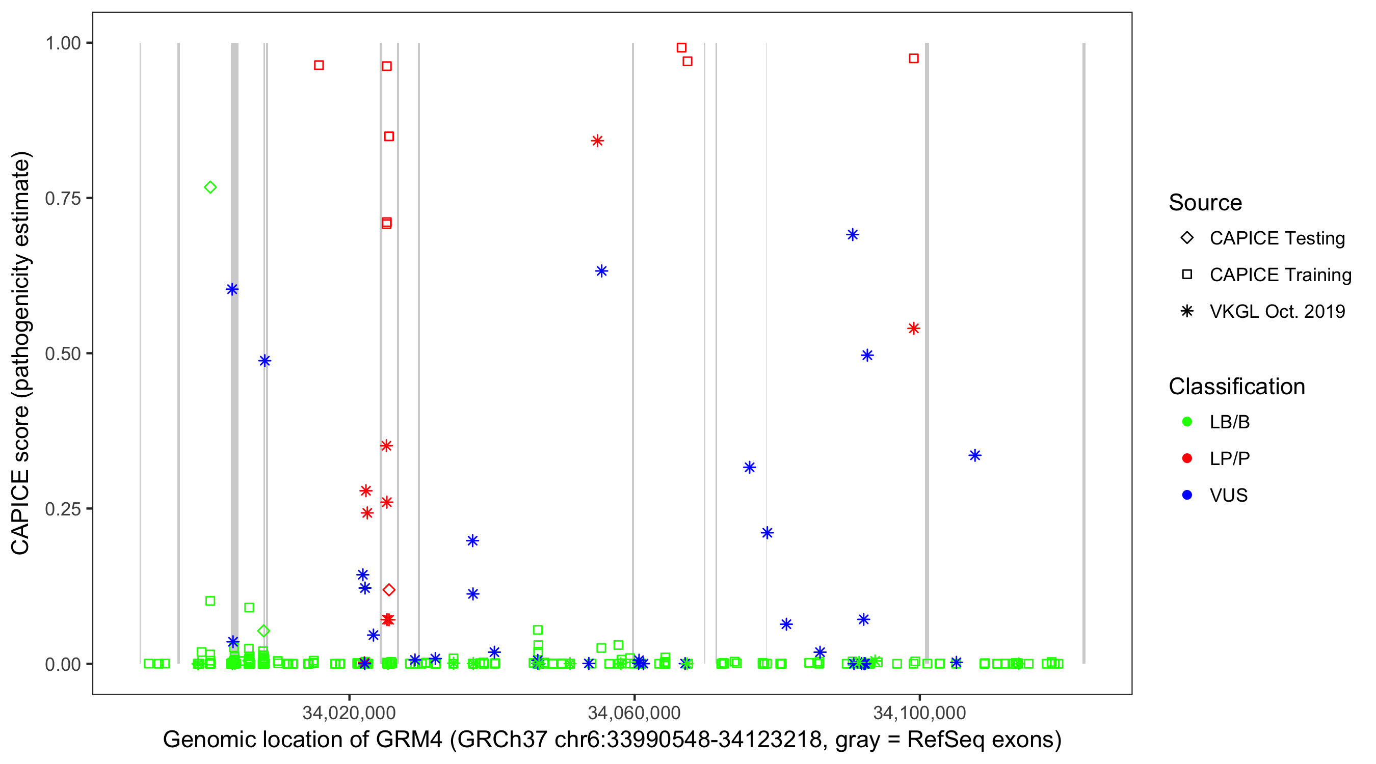Shown are CAPICE train/test variants plus VKGL Oct 2019.