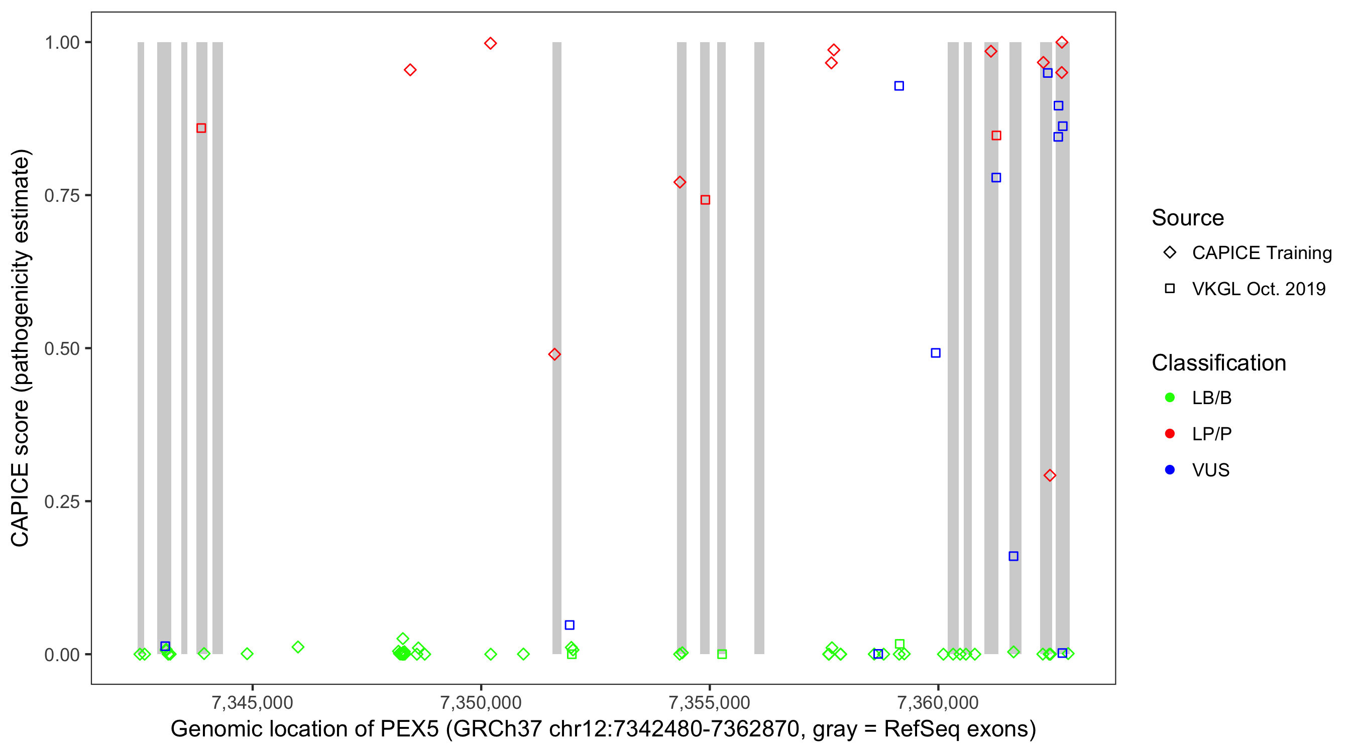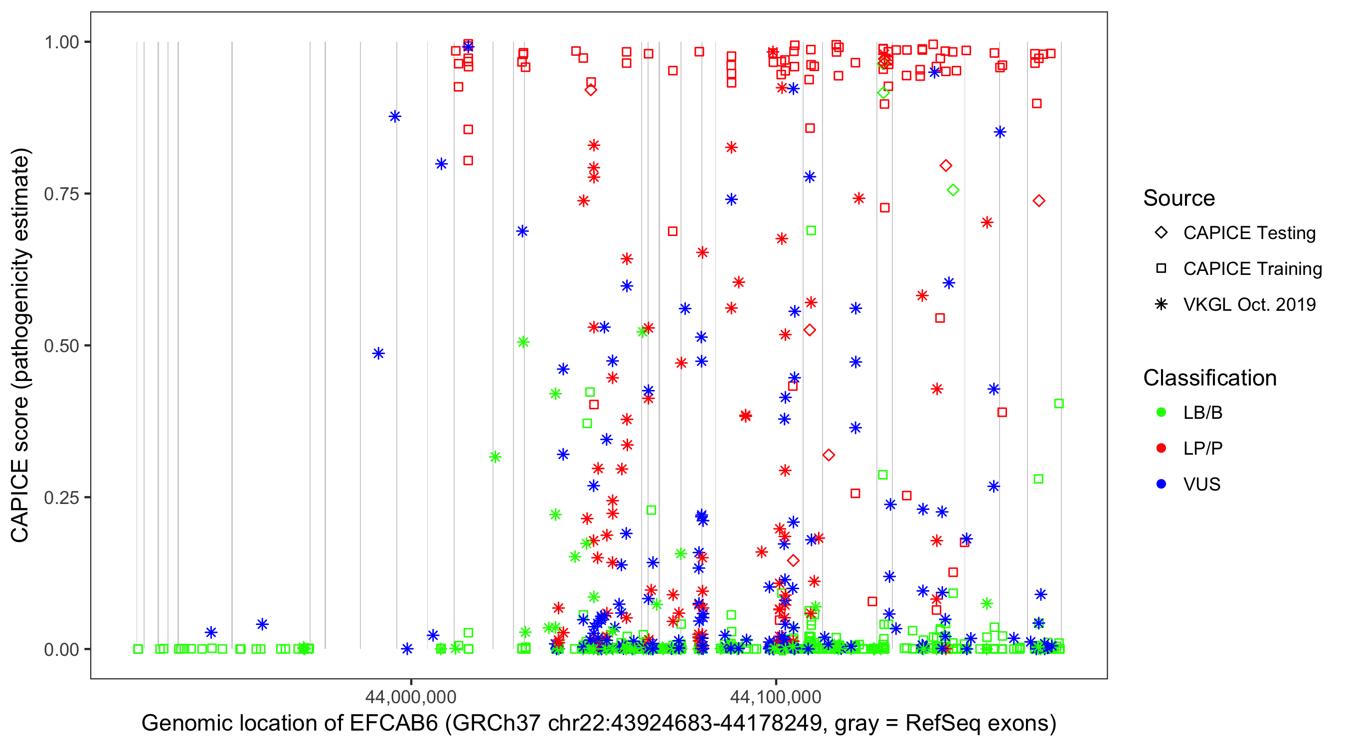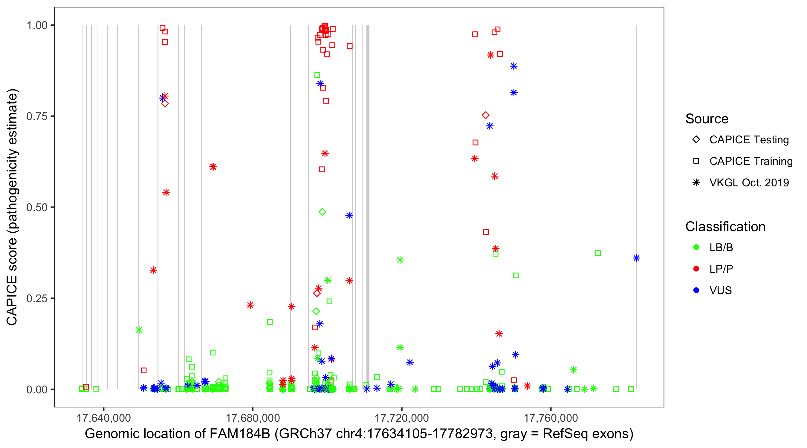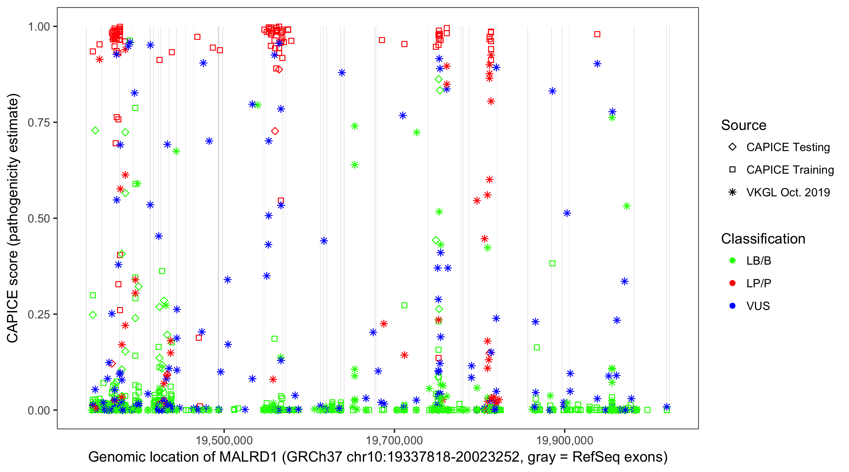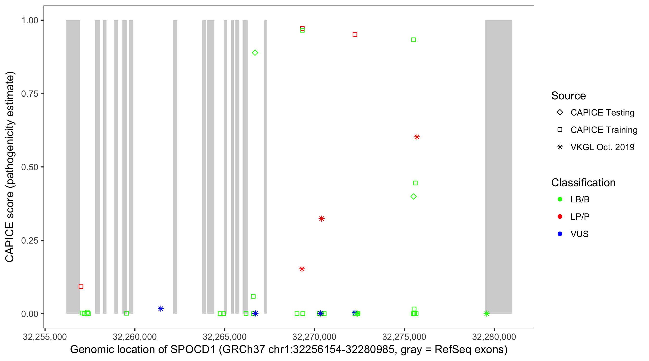 Shown are CAPICE train/test variants plus VKGL Oct 2019.