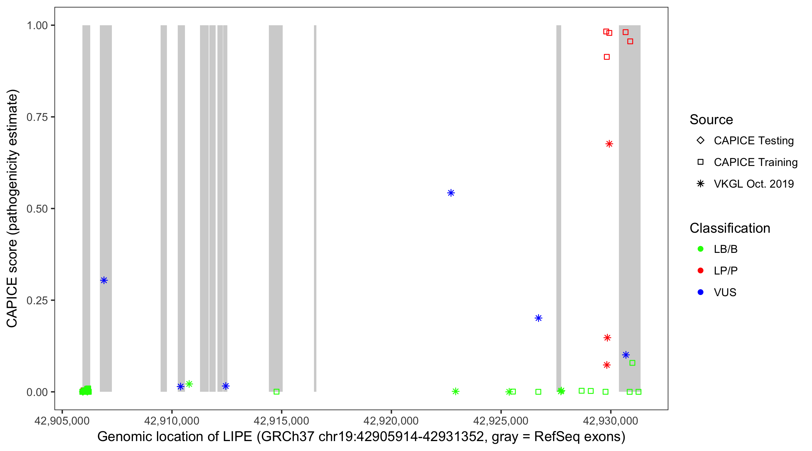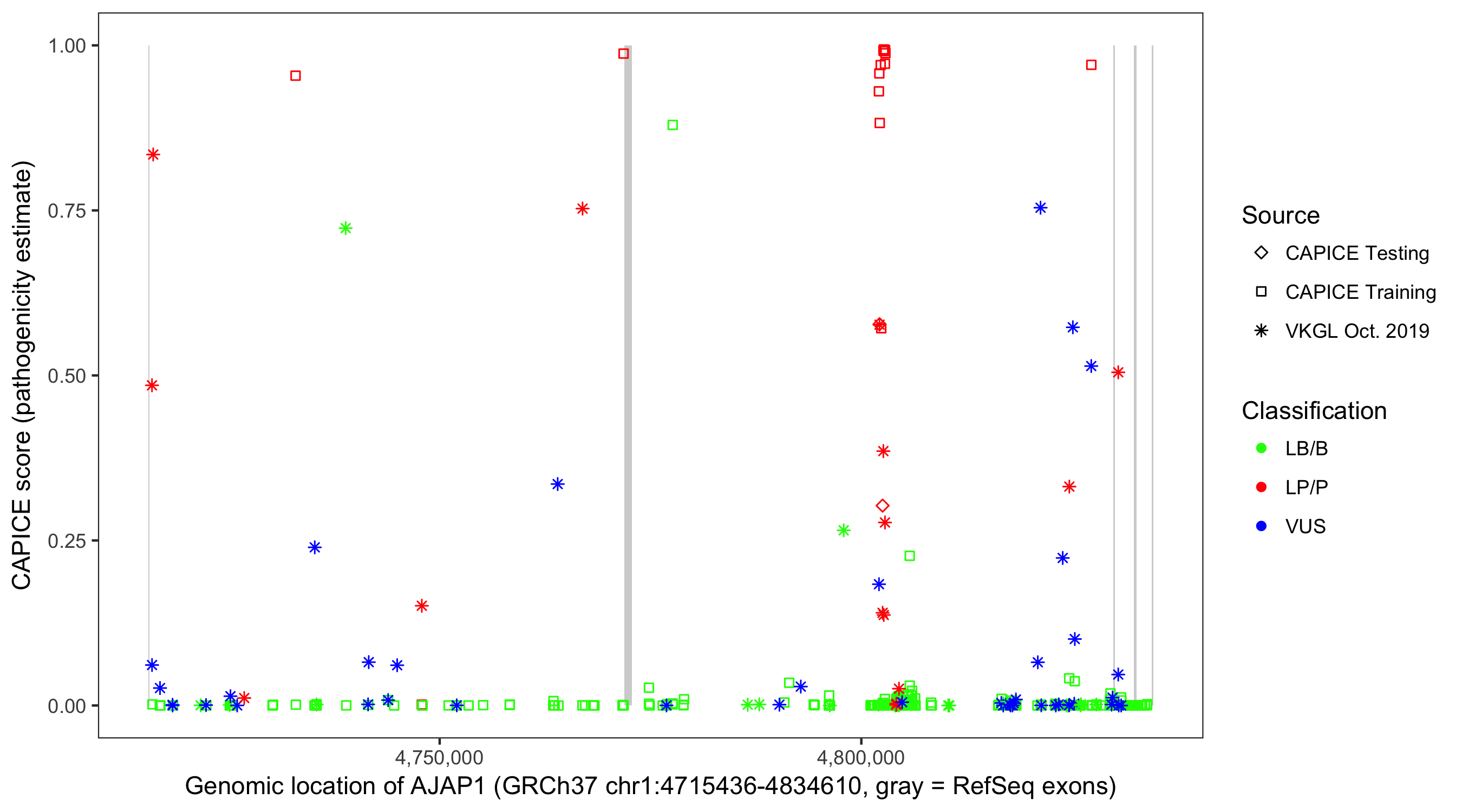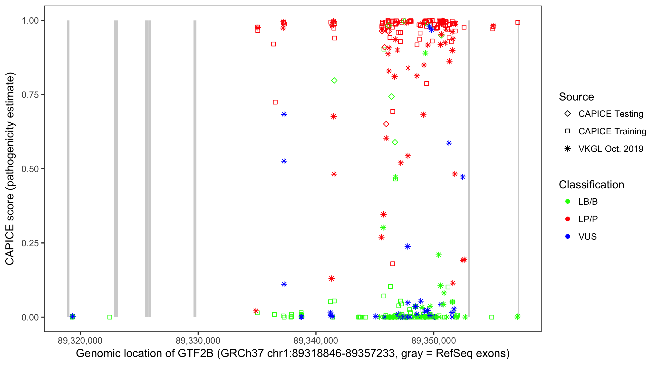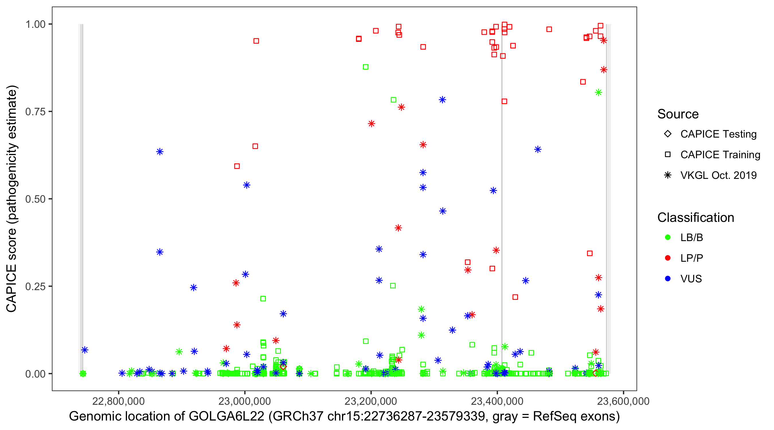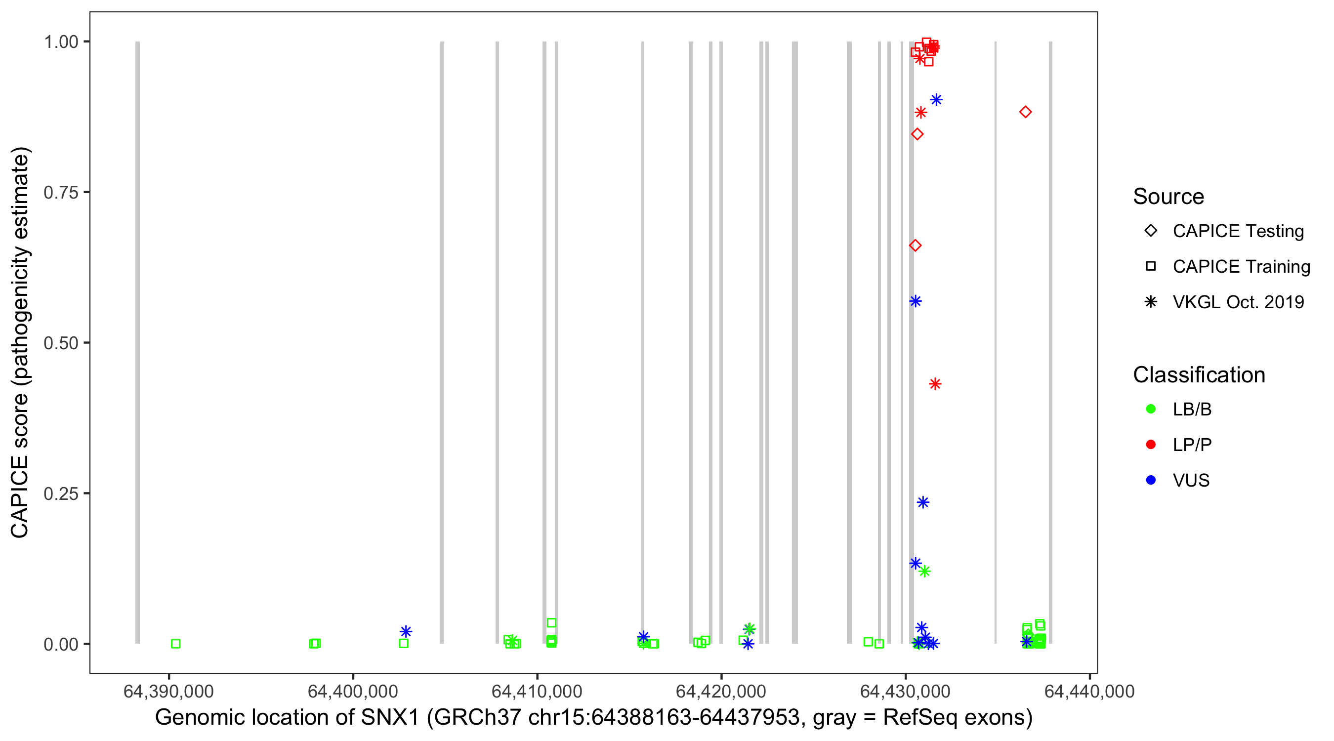 Shown are CAPICE train/test variants plus VKGL Oct 2019.