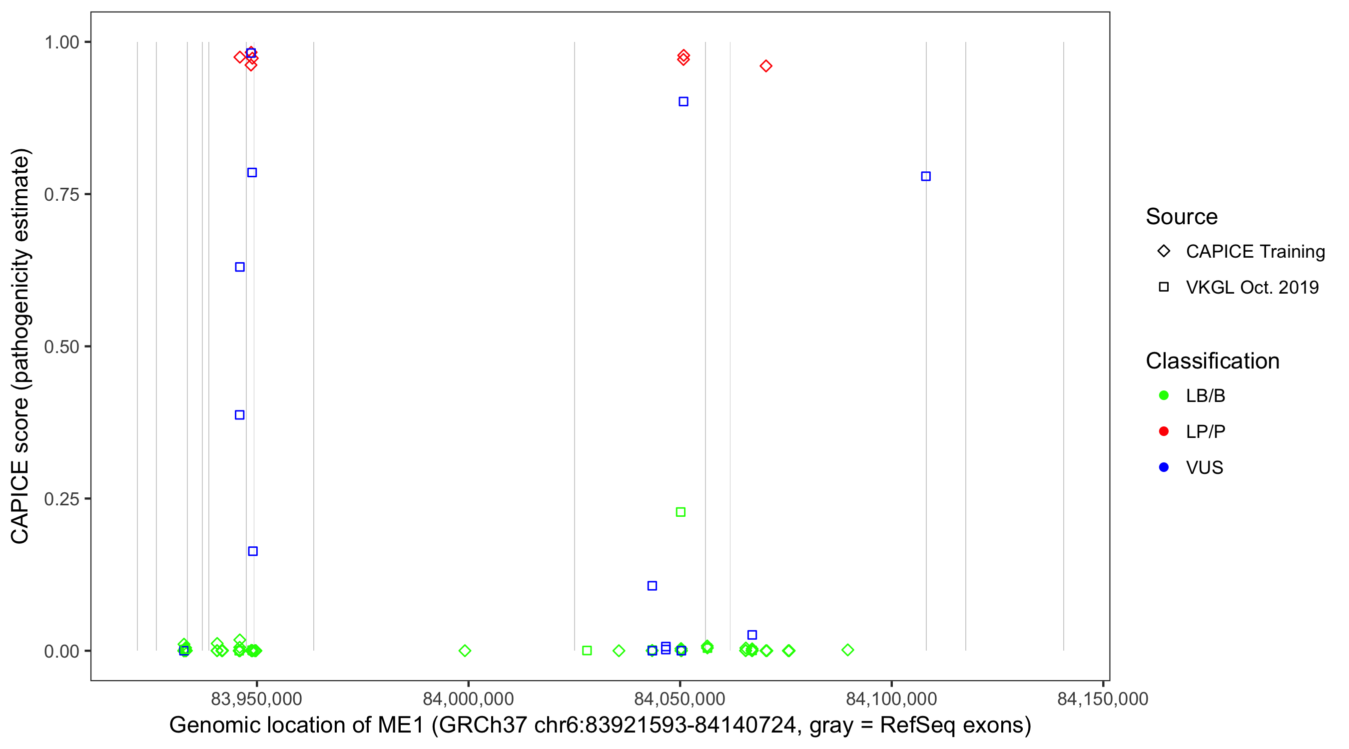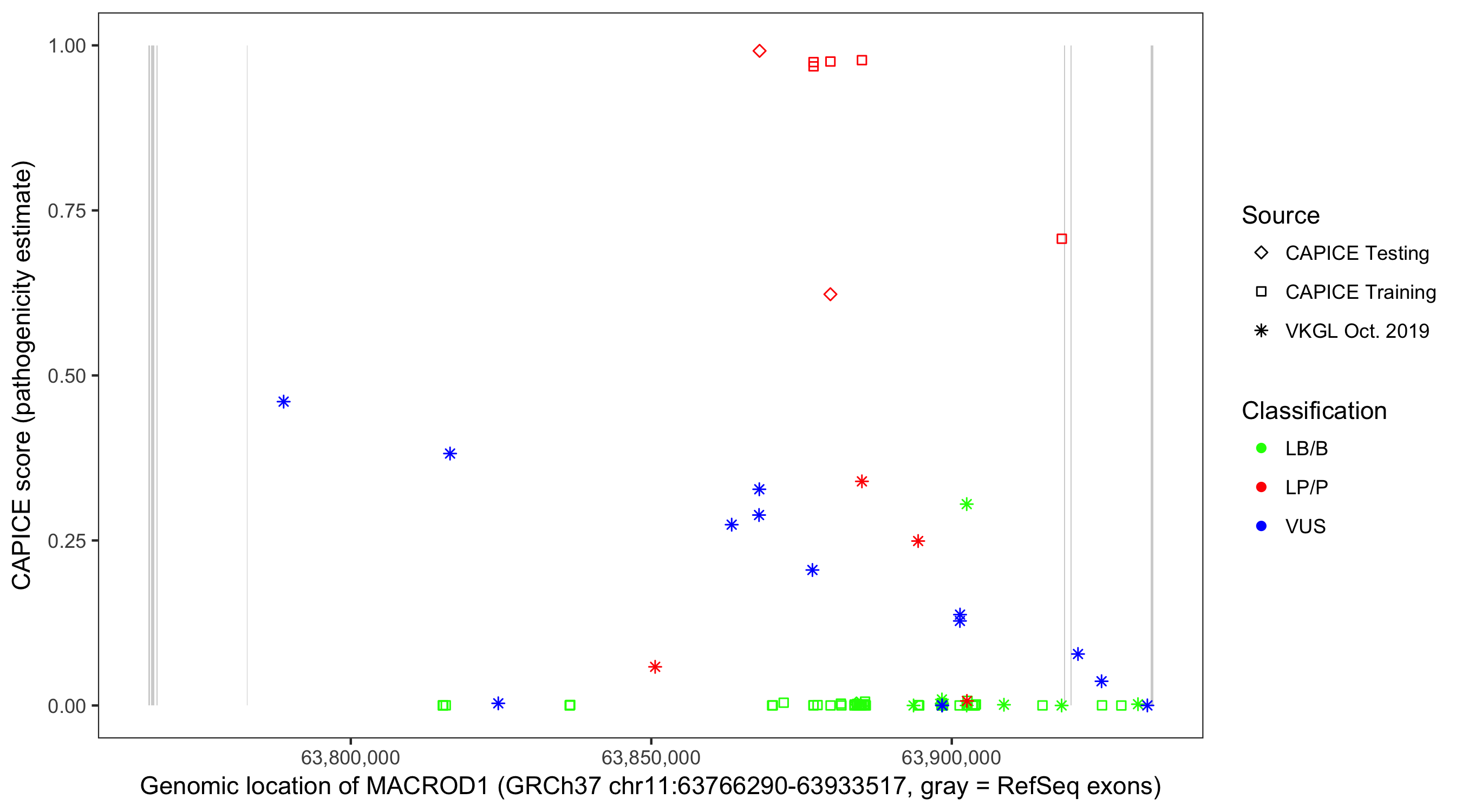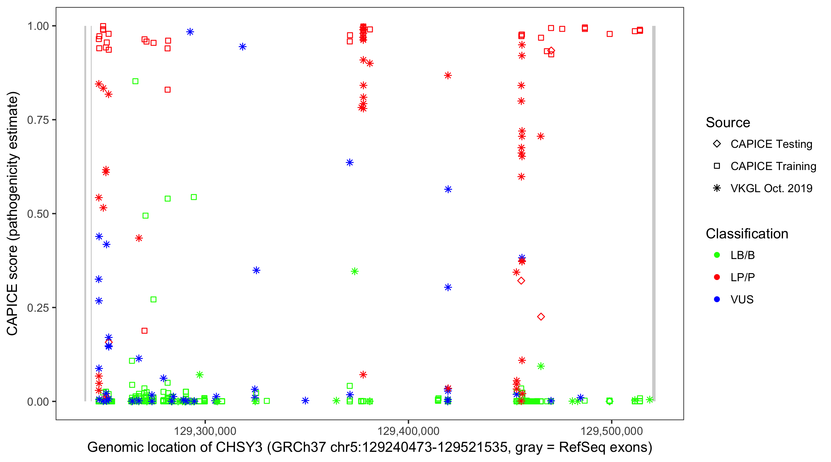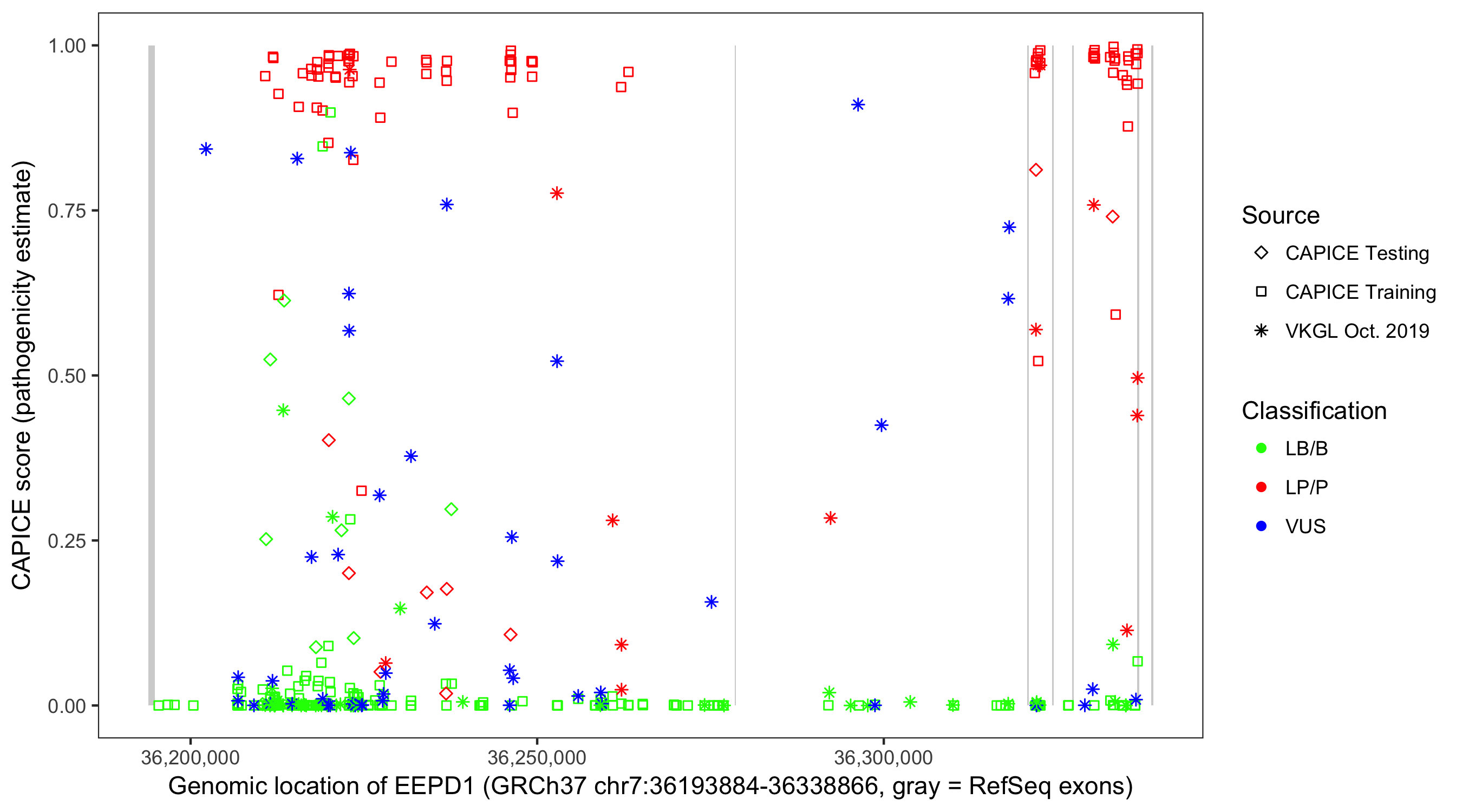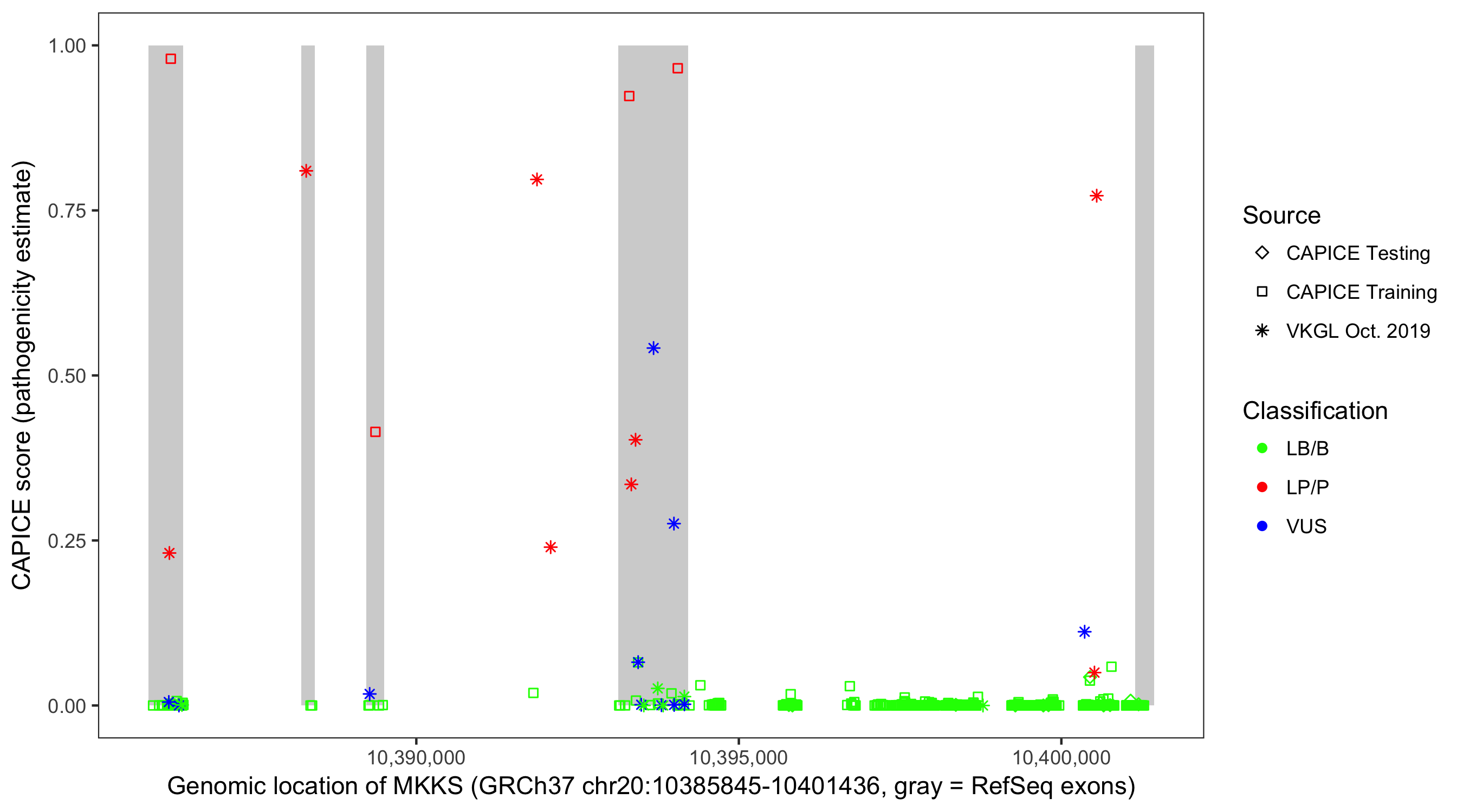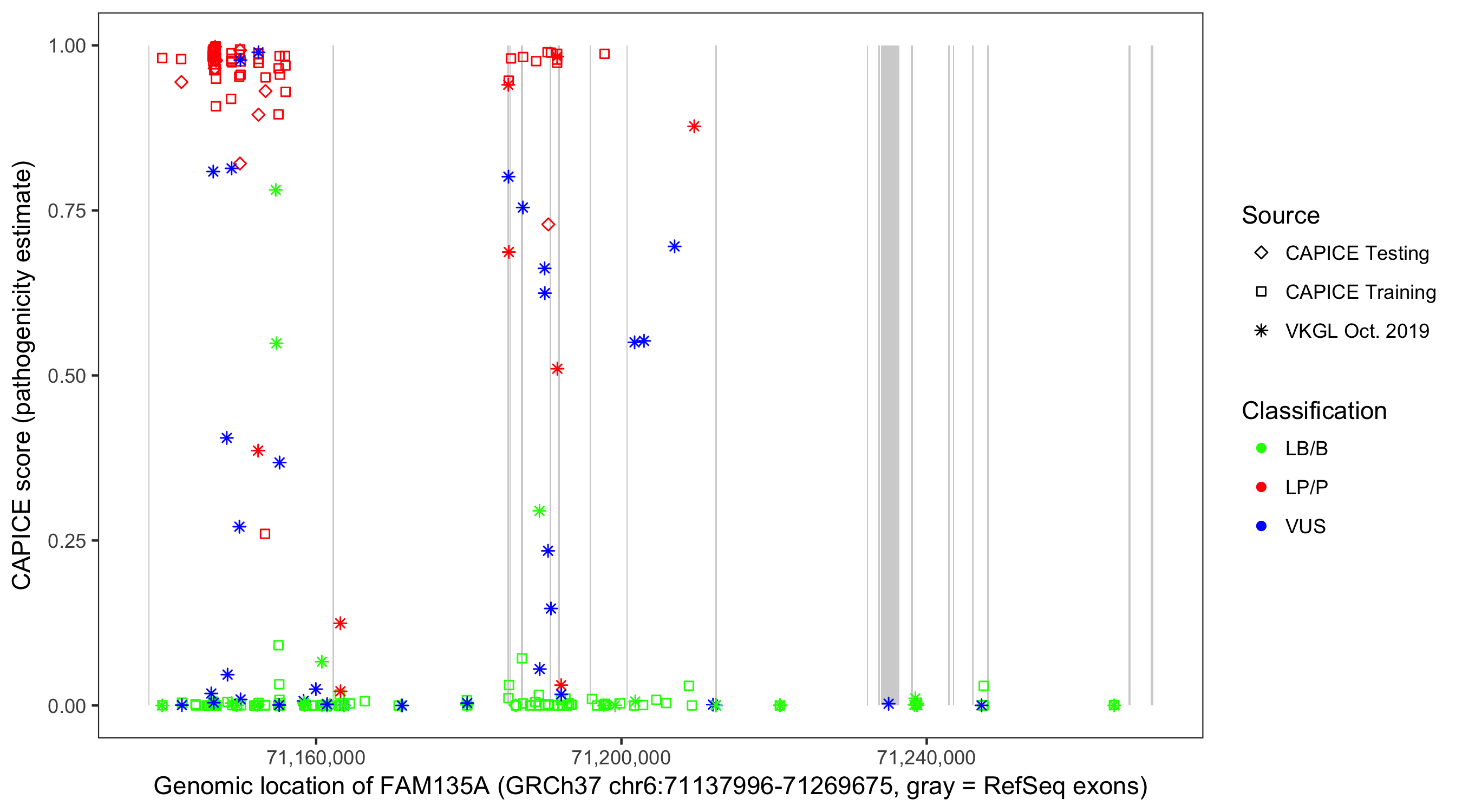 Shown are CAPICE train/test variants plus VKGL Oct 2019.