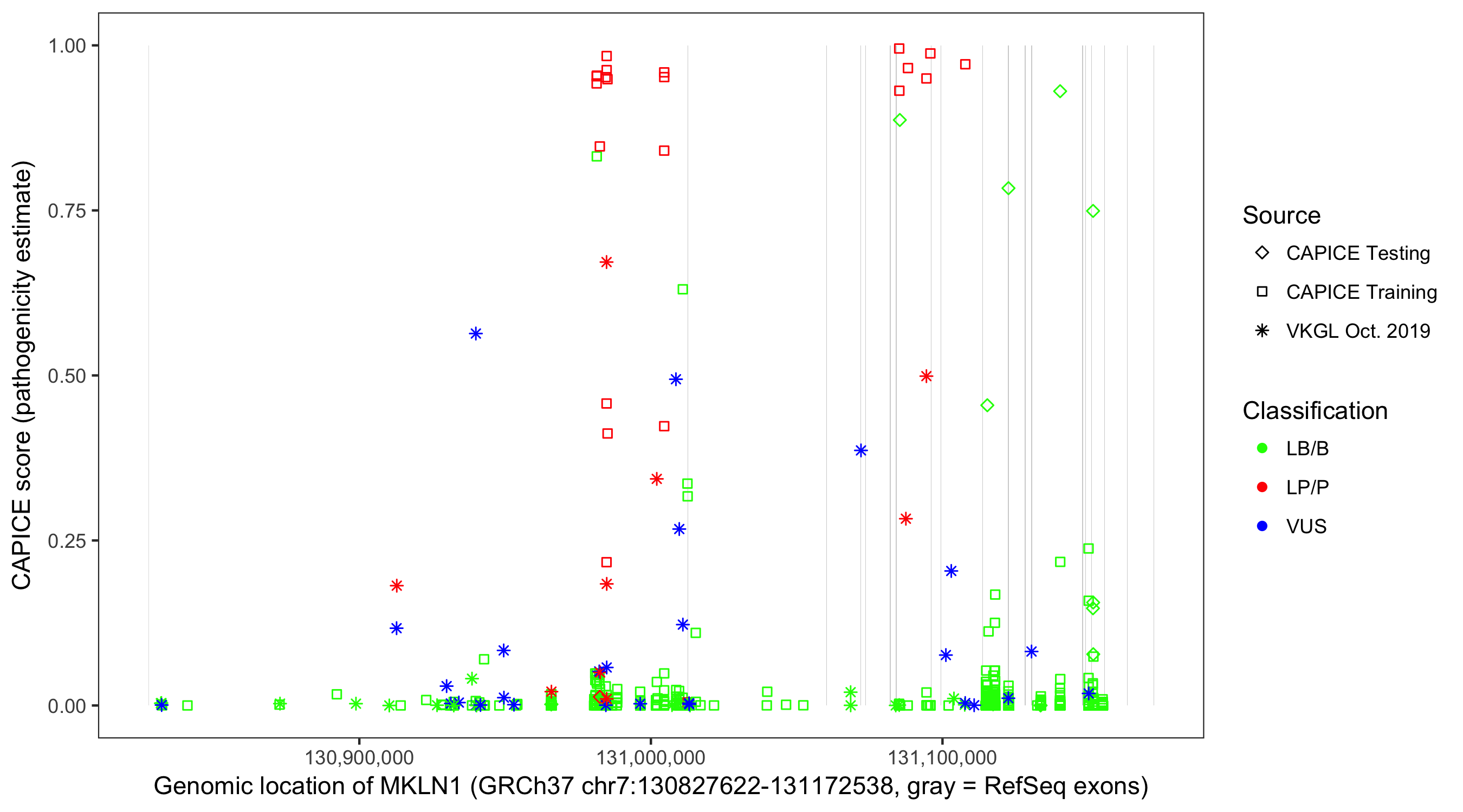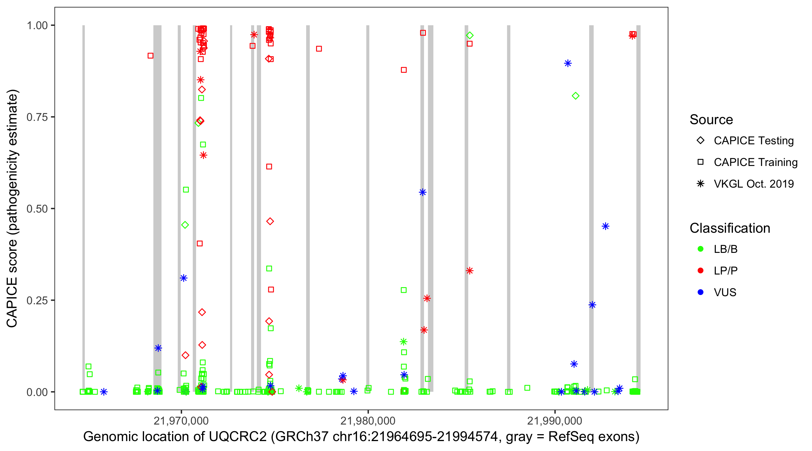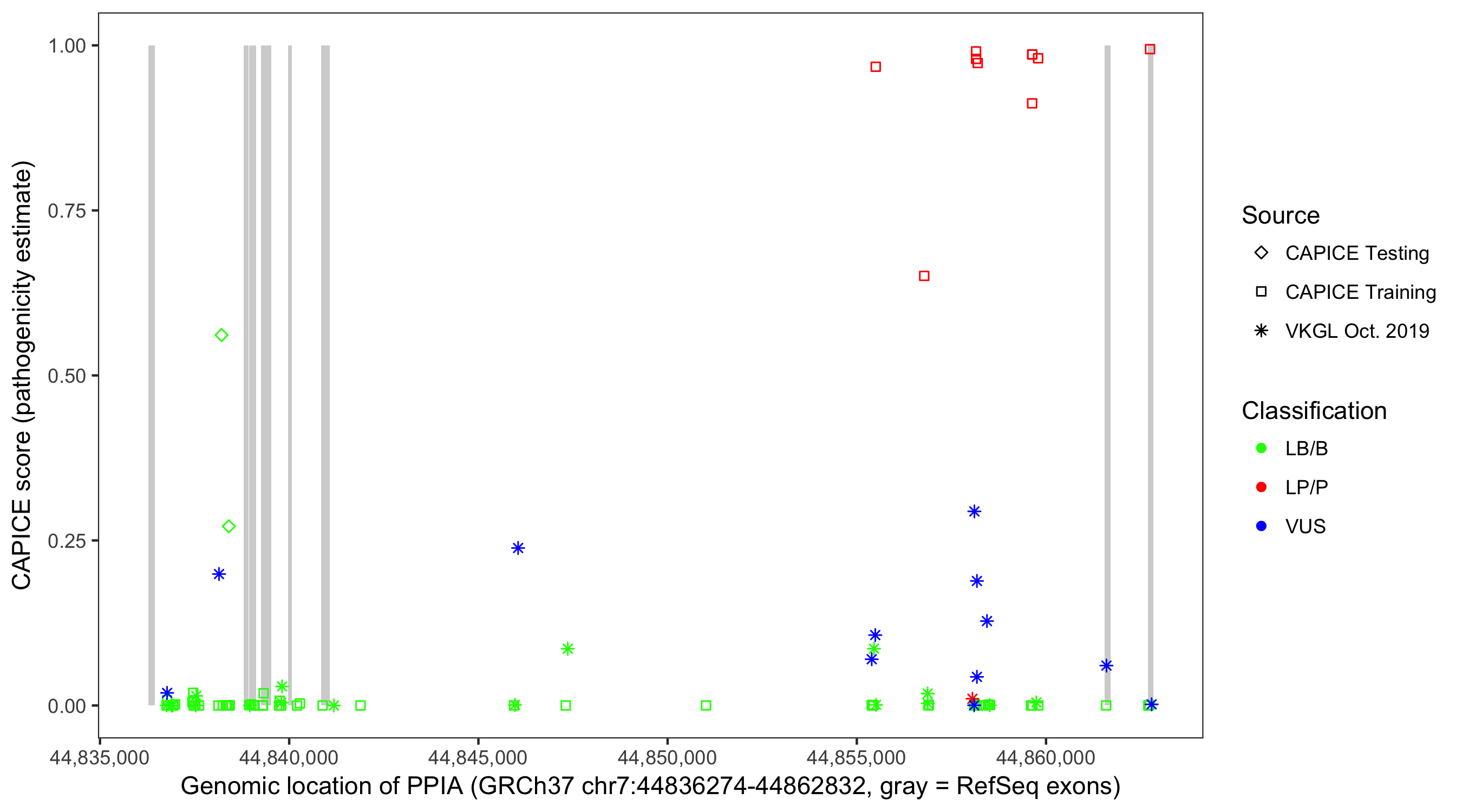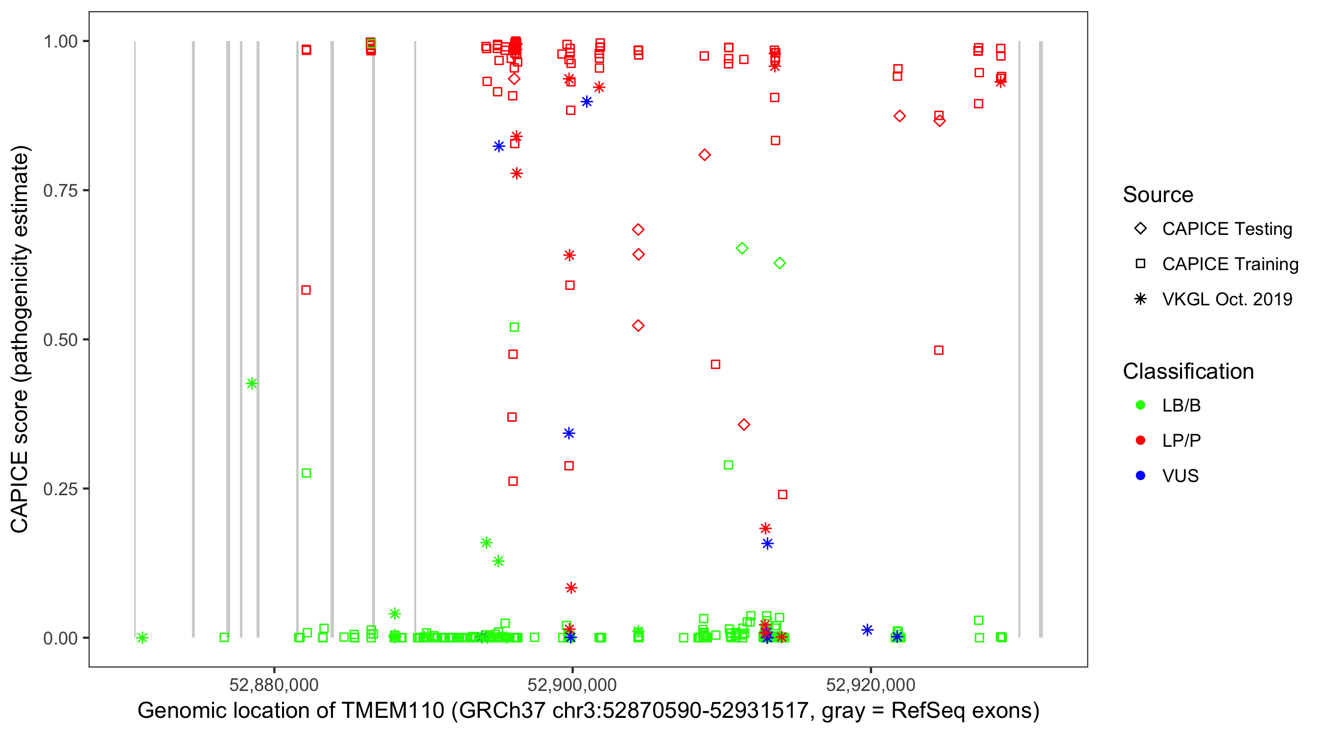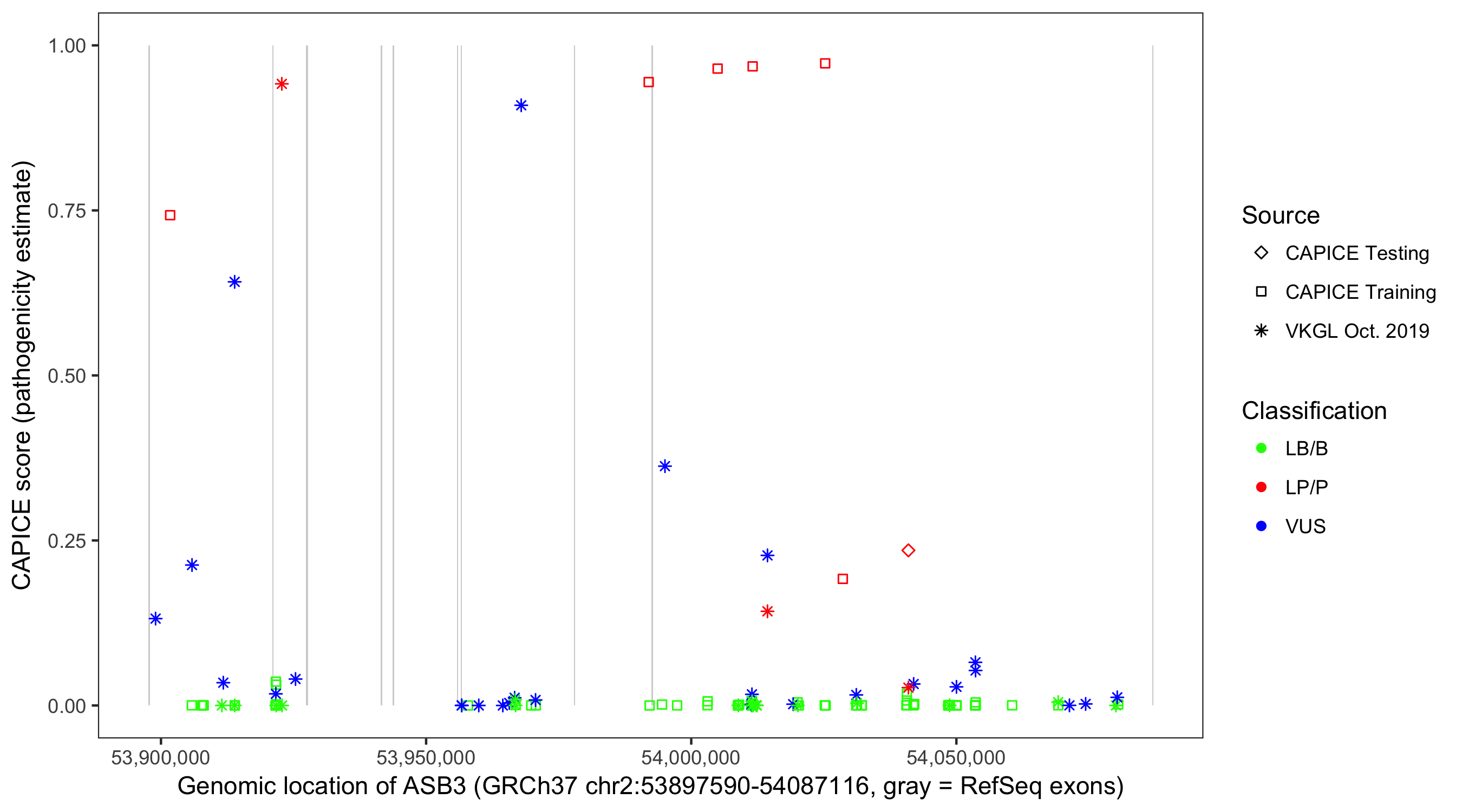 Shown are CAPICE train/test variants plus VKGL Oct 2019.