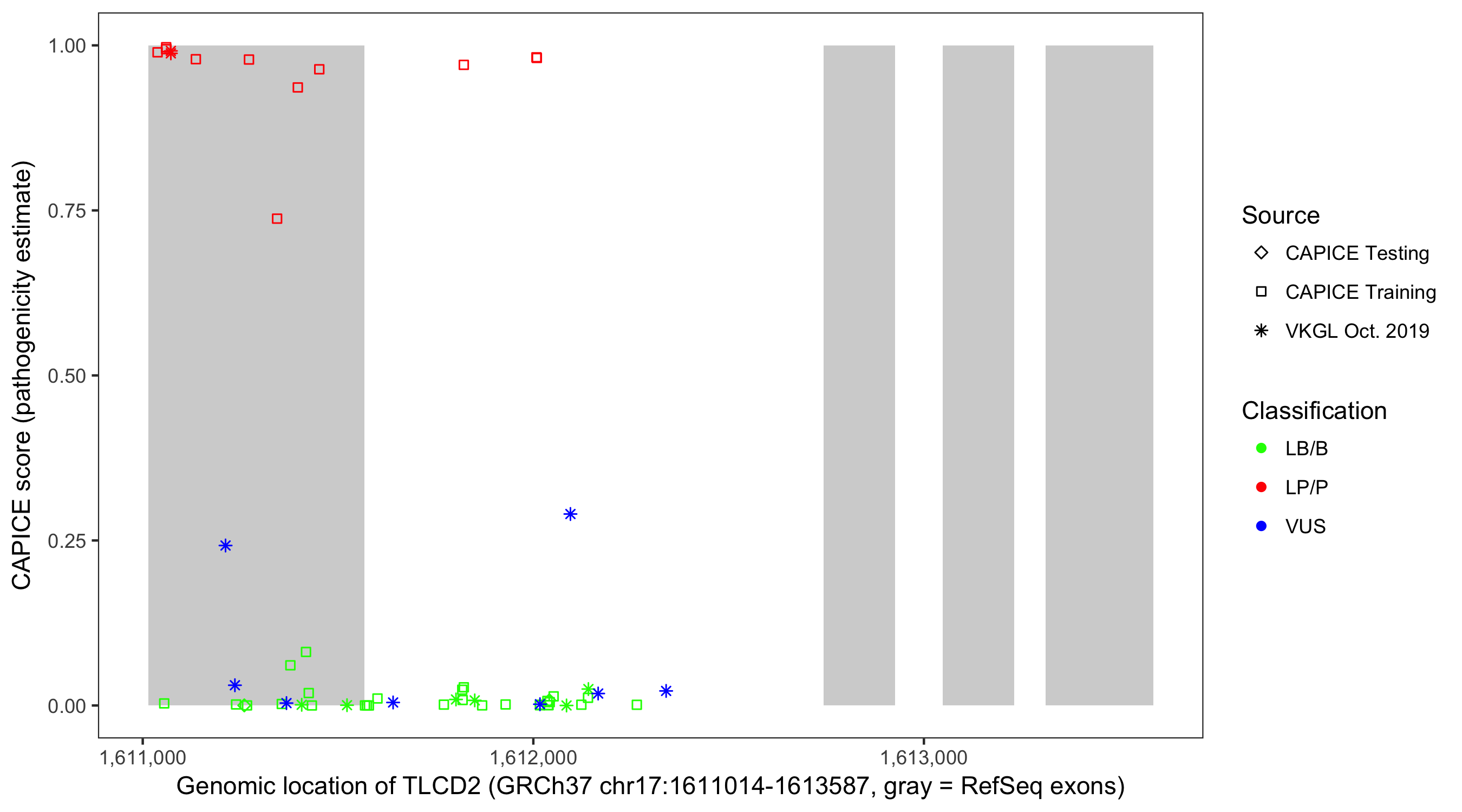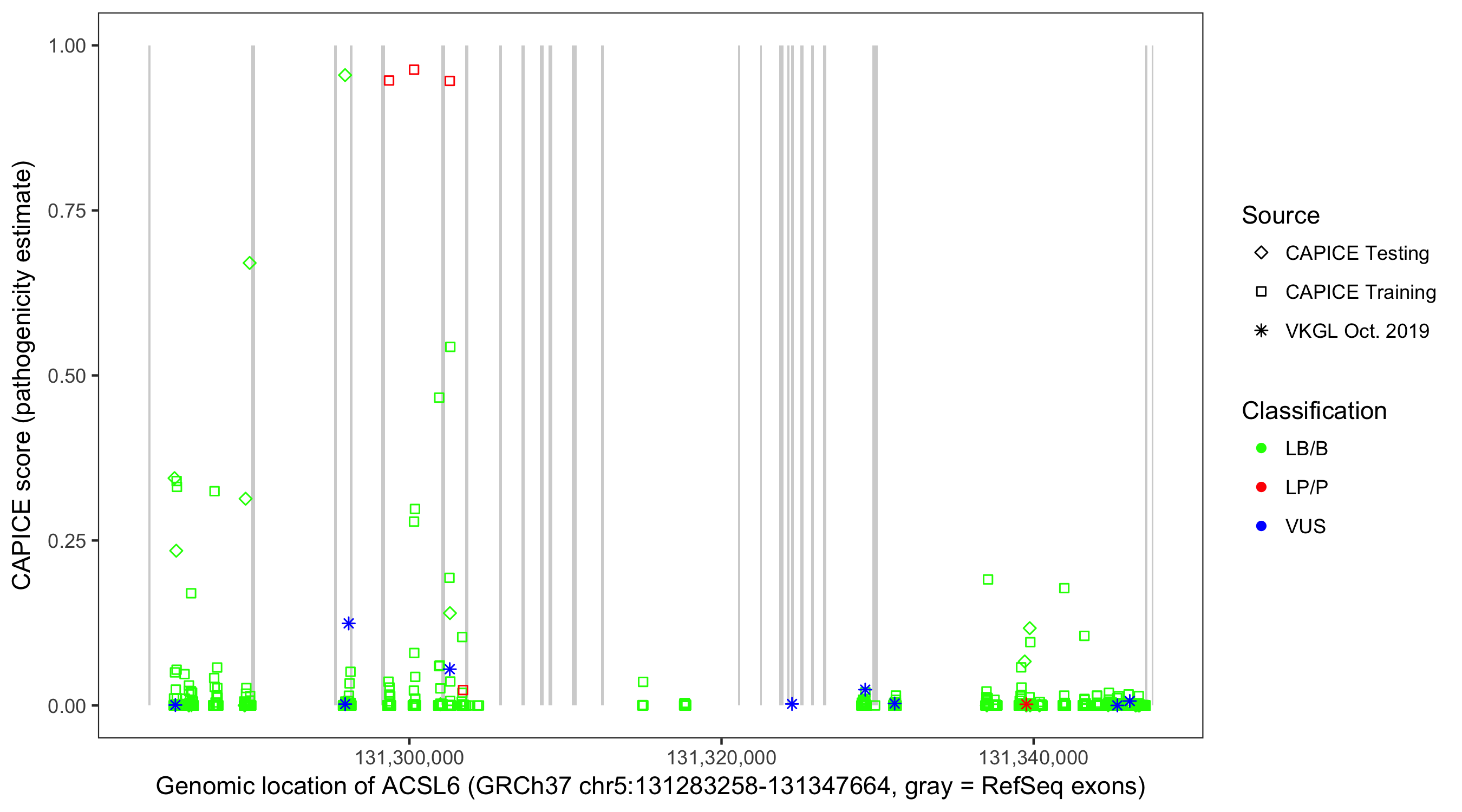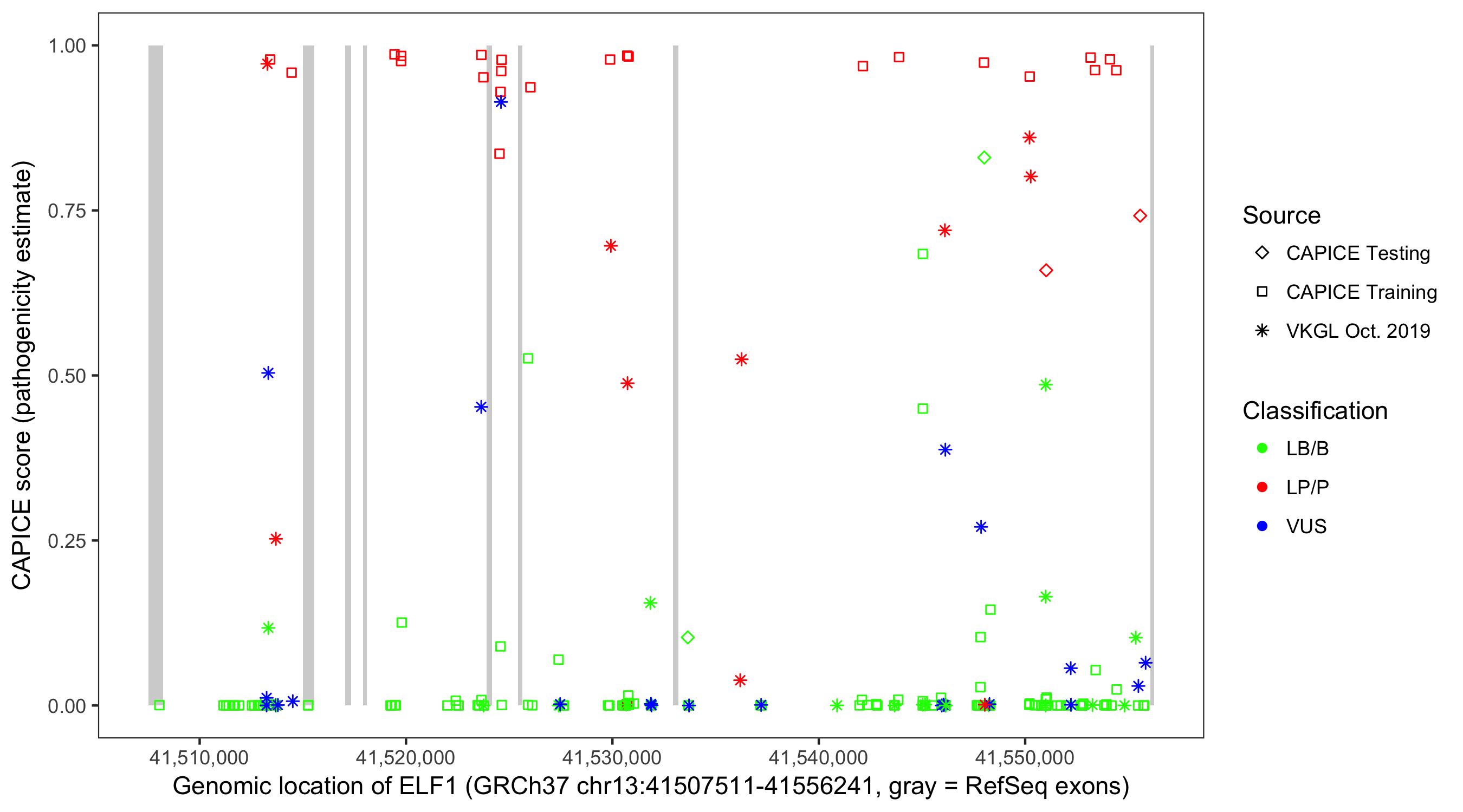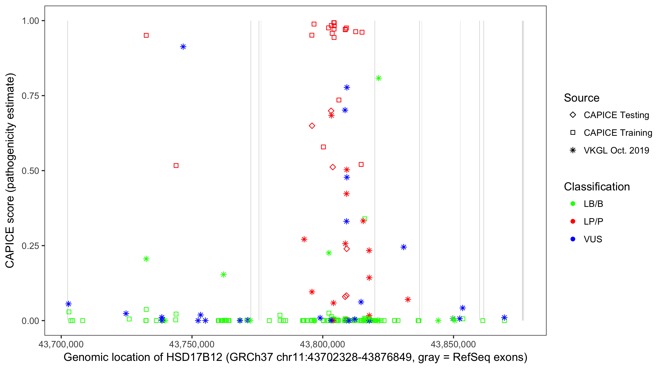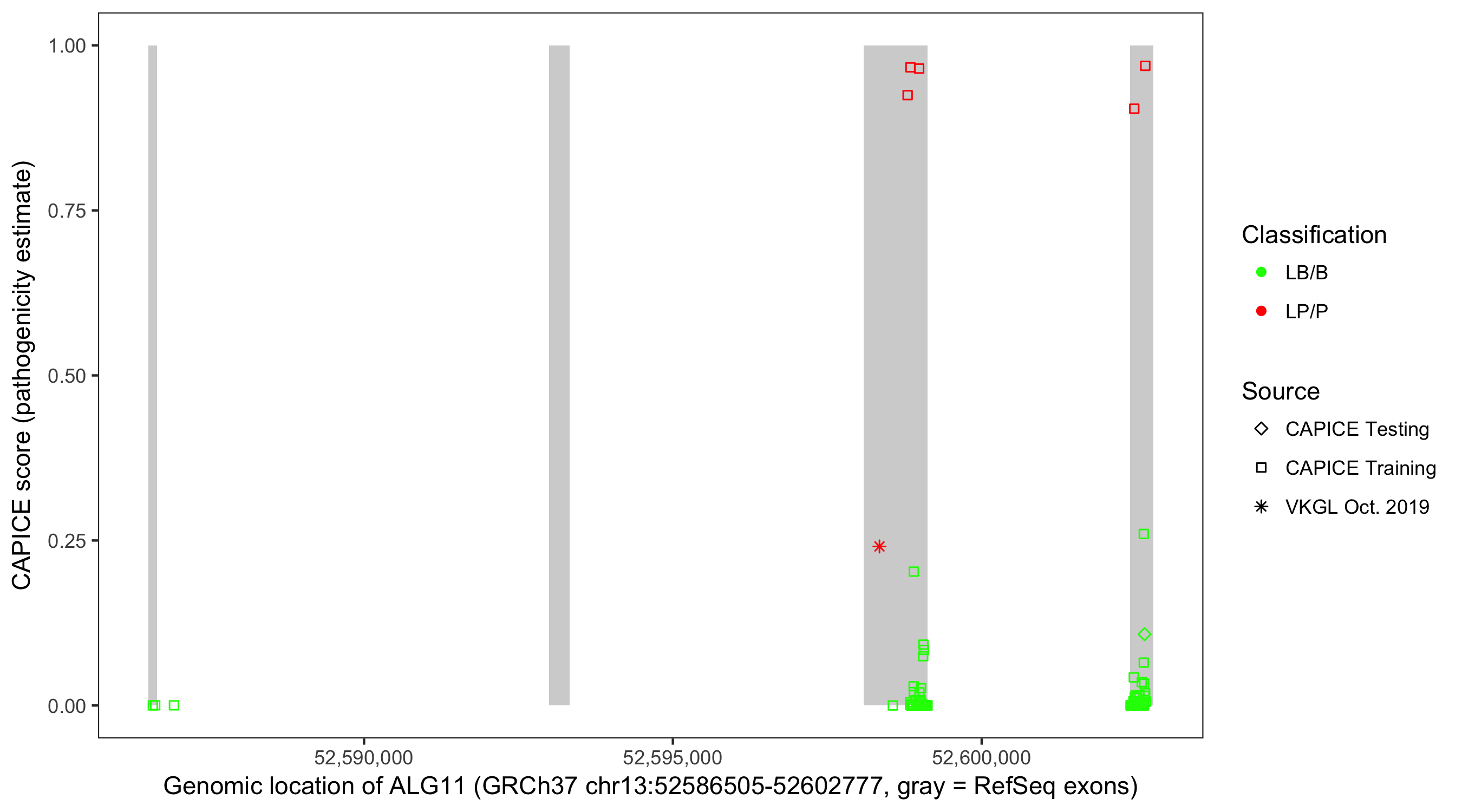 Shown are CAPICE train/test variants plus VKGL Oct 2019.