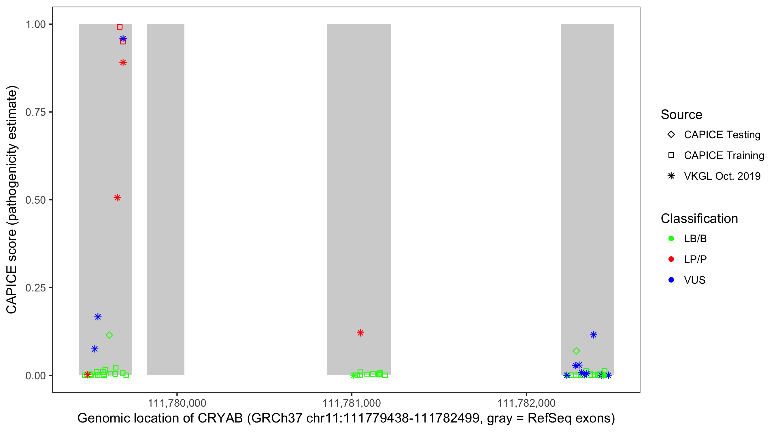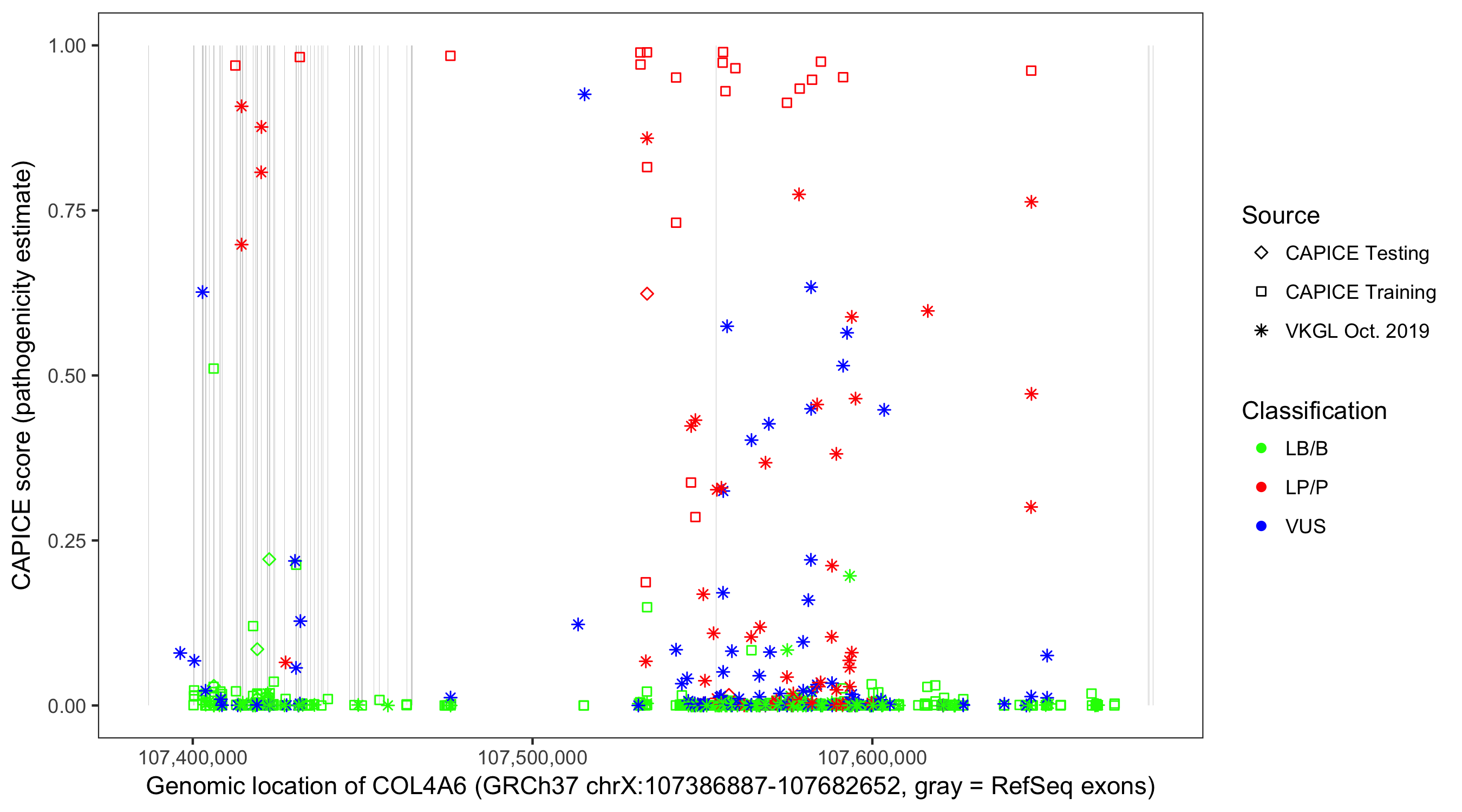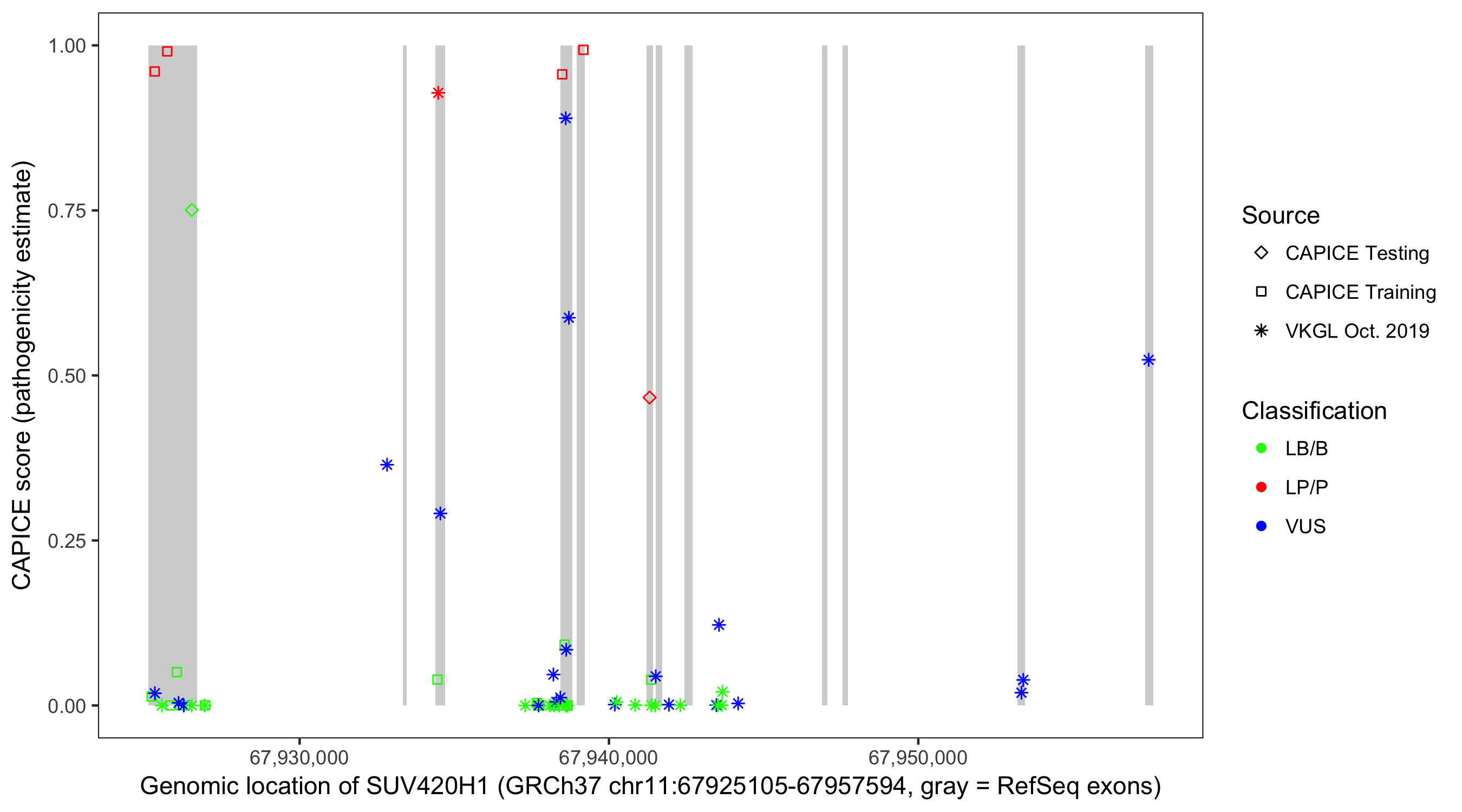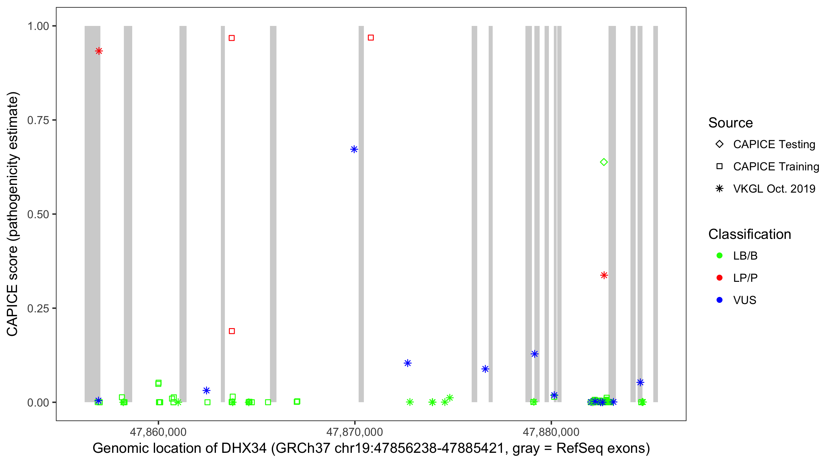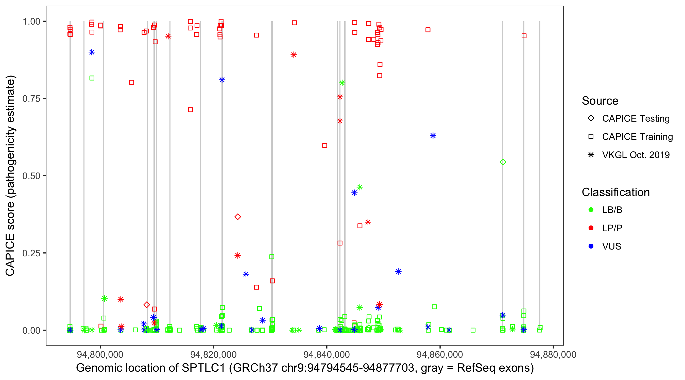 Shown are CAPICE train/test variants plus VKGL Oct 2019.