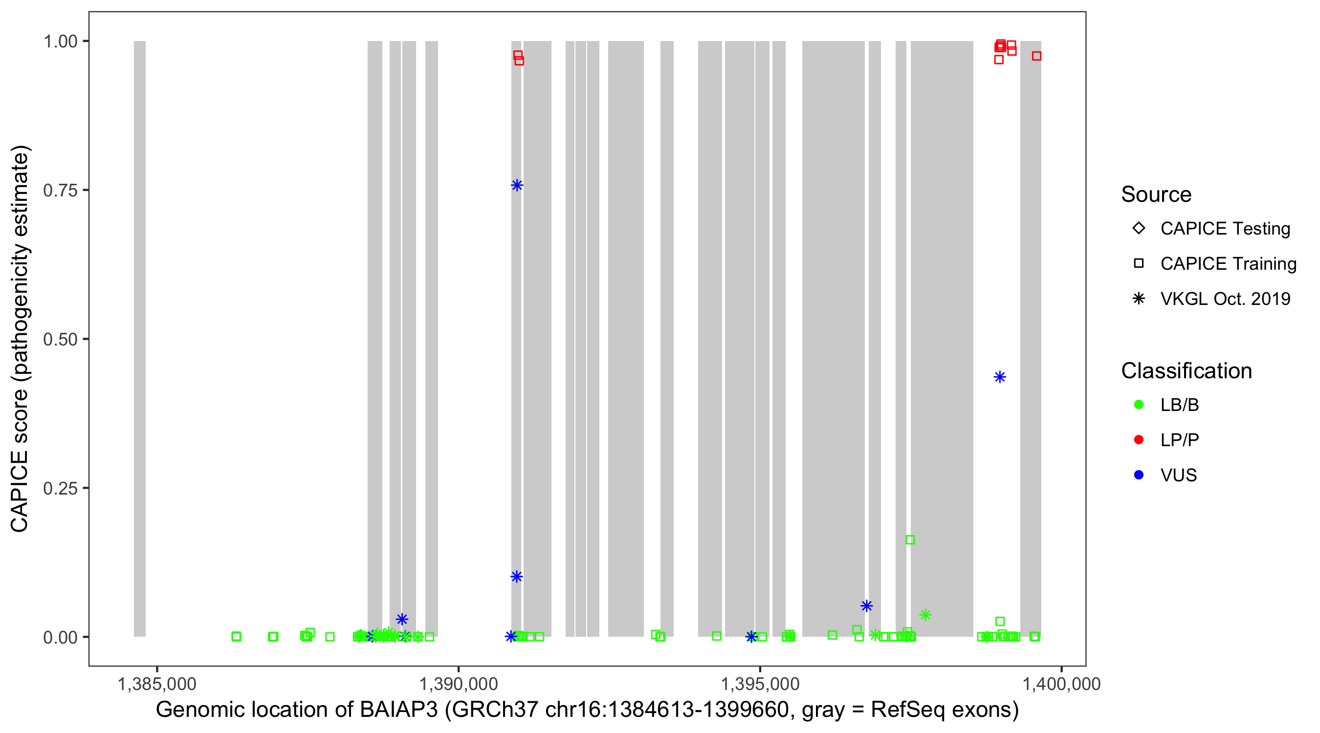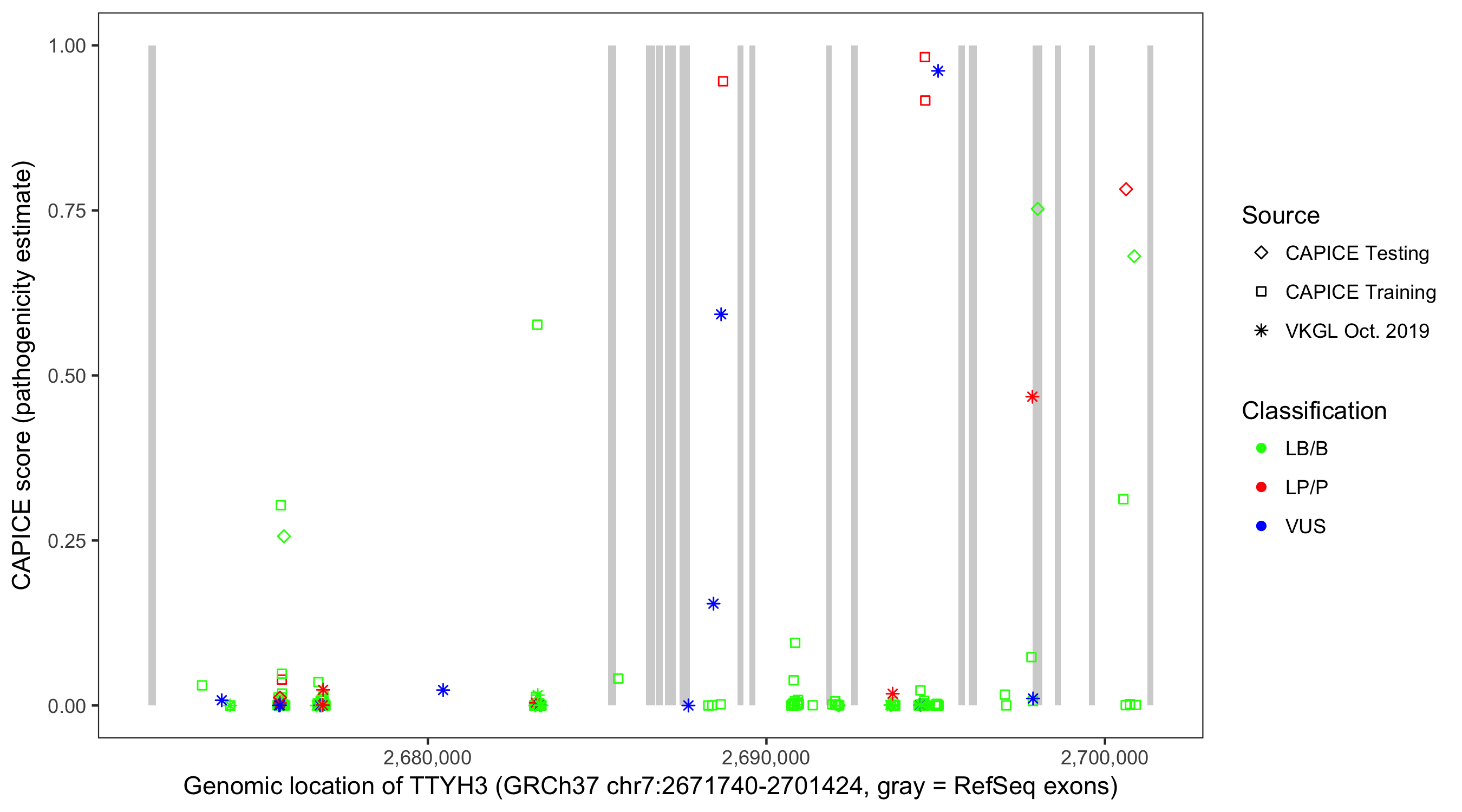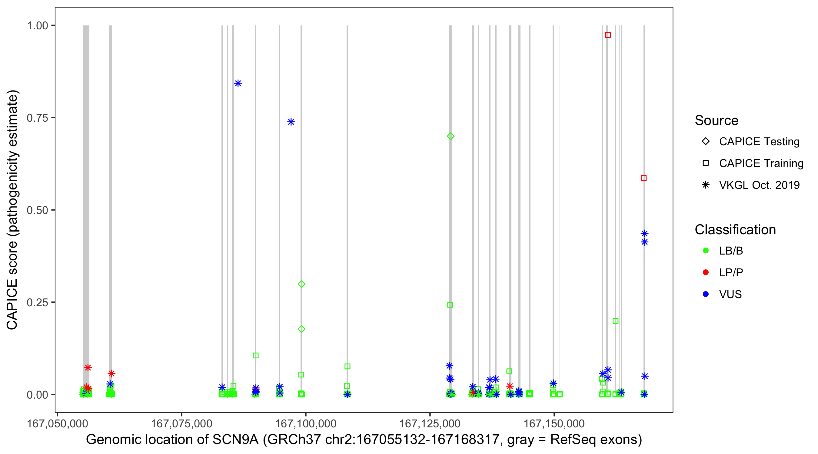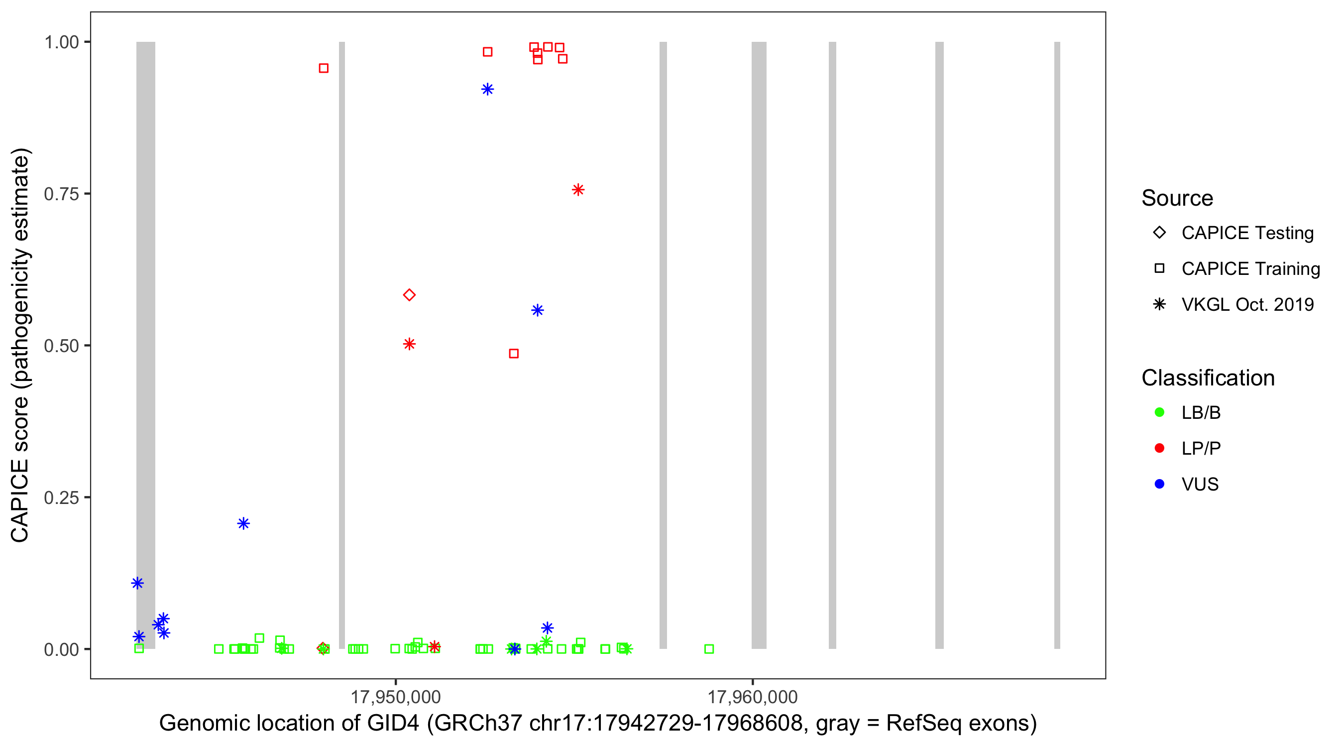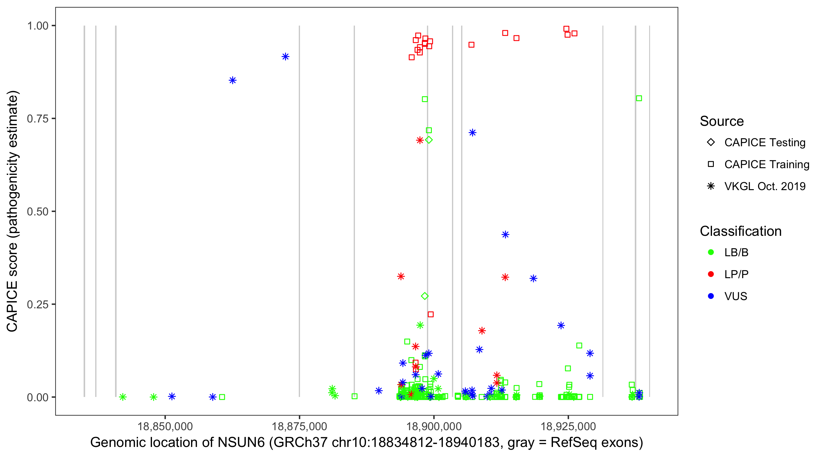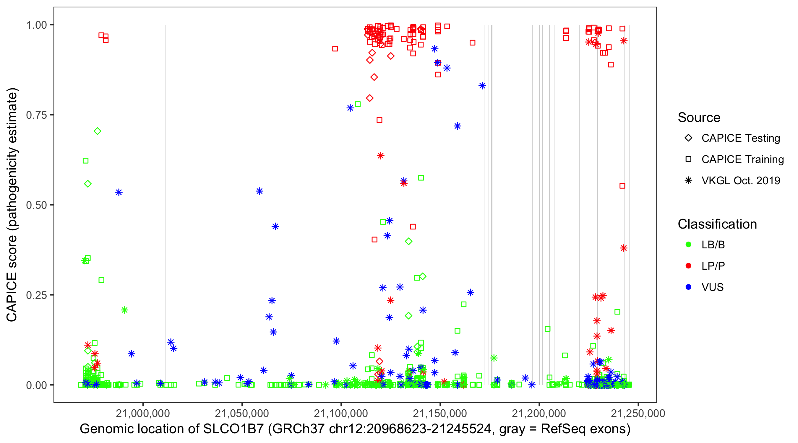Shown are CAPICE train/test variants plus VKGL Oct 2019.