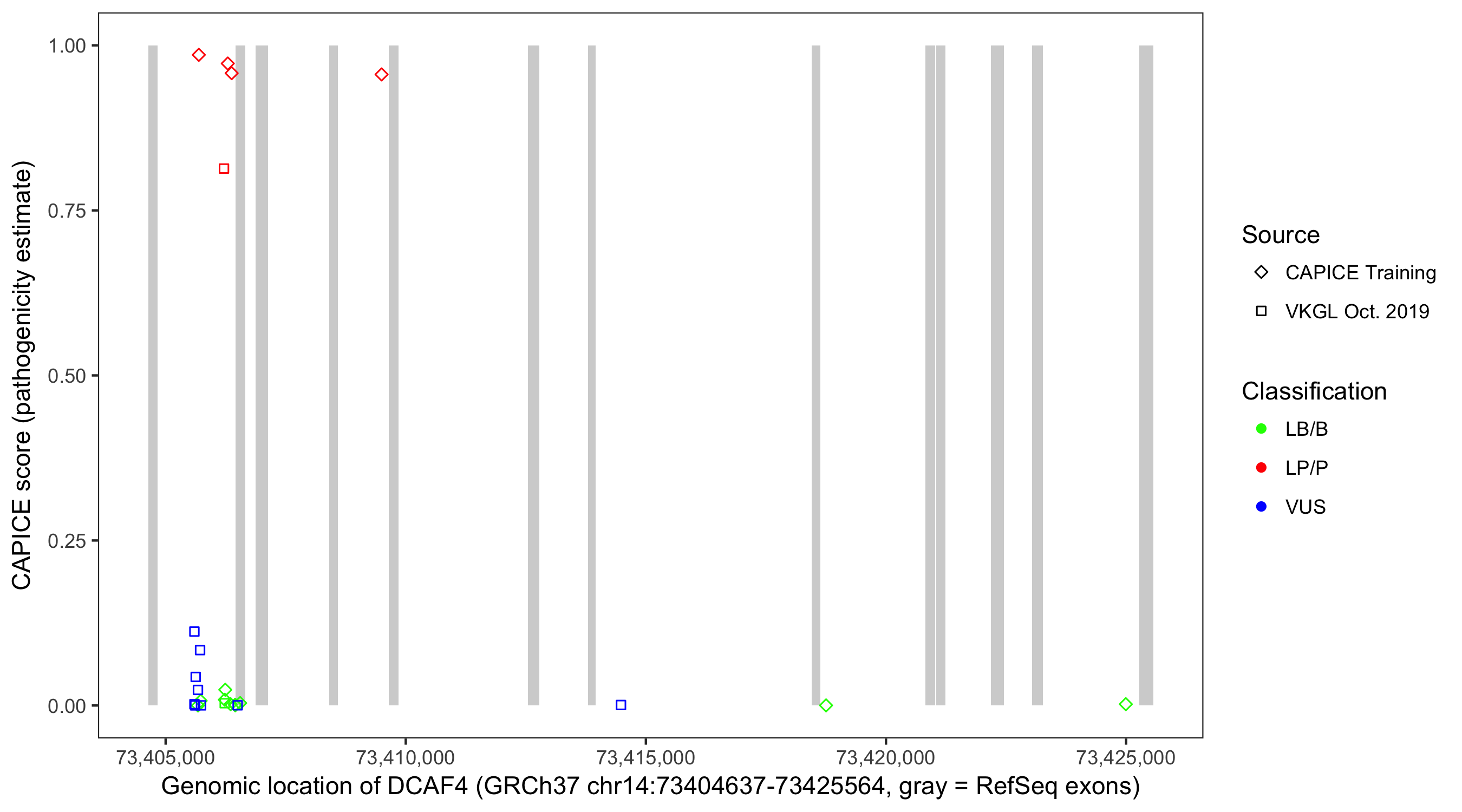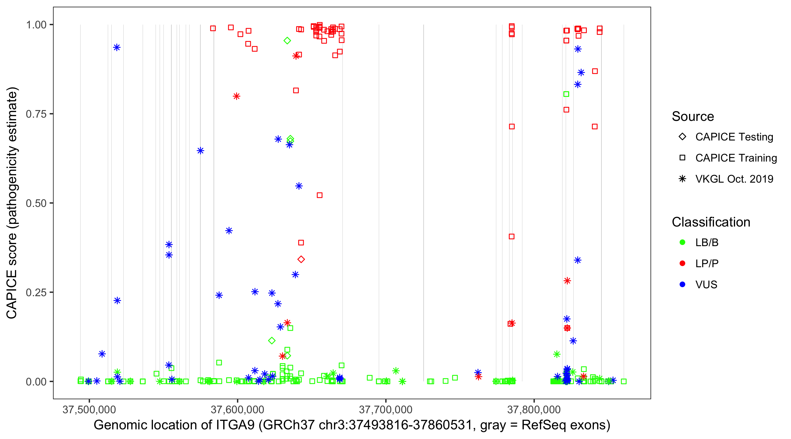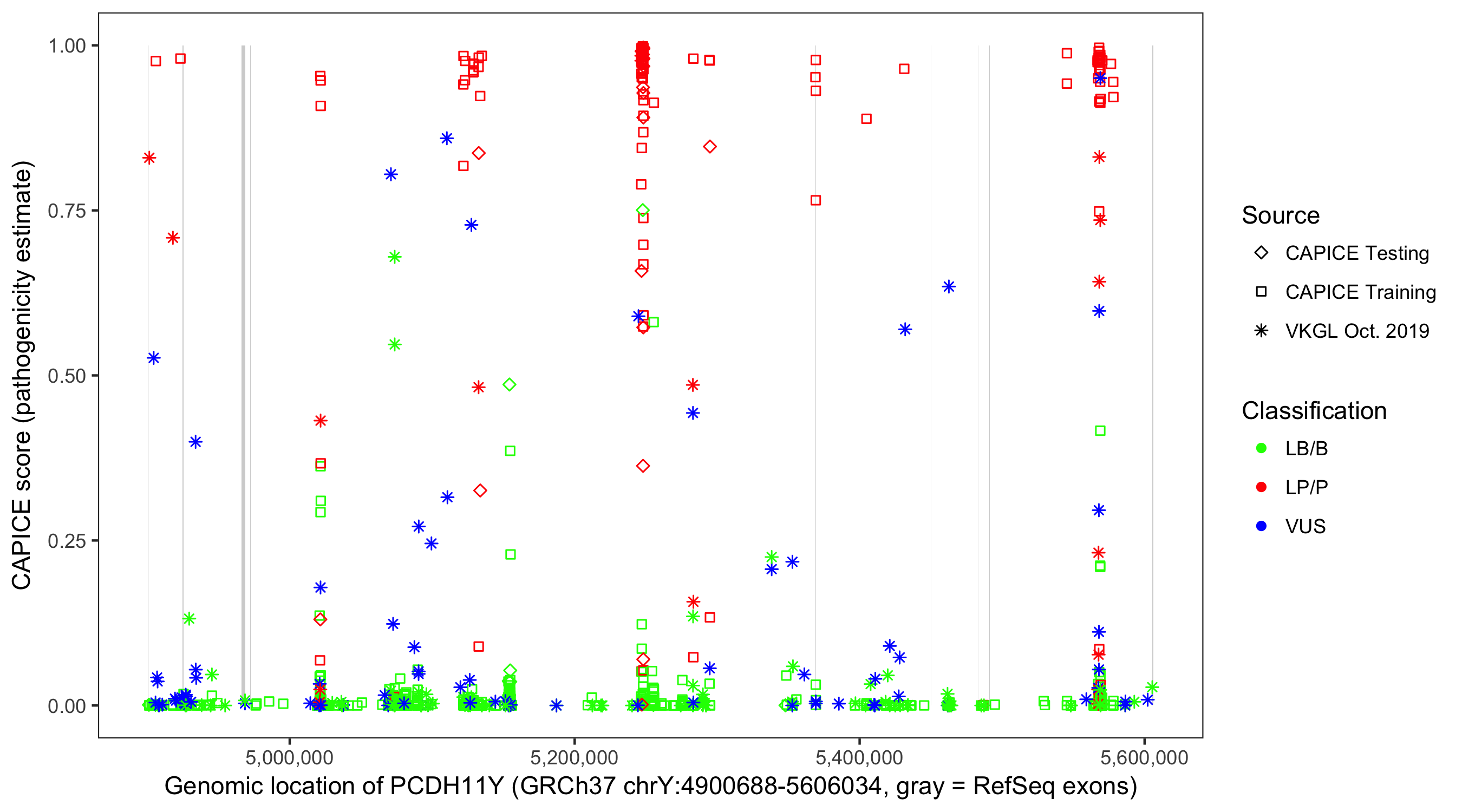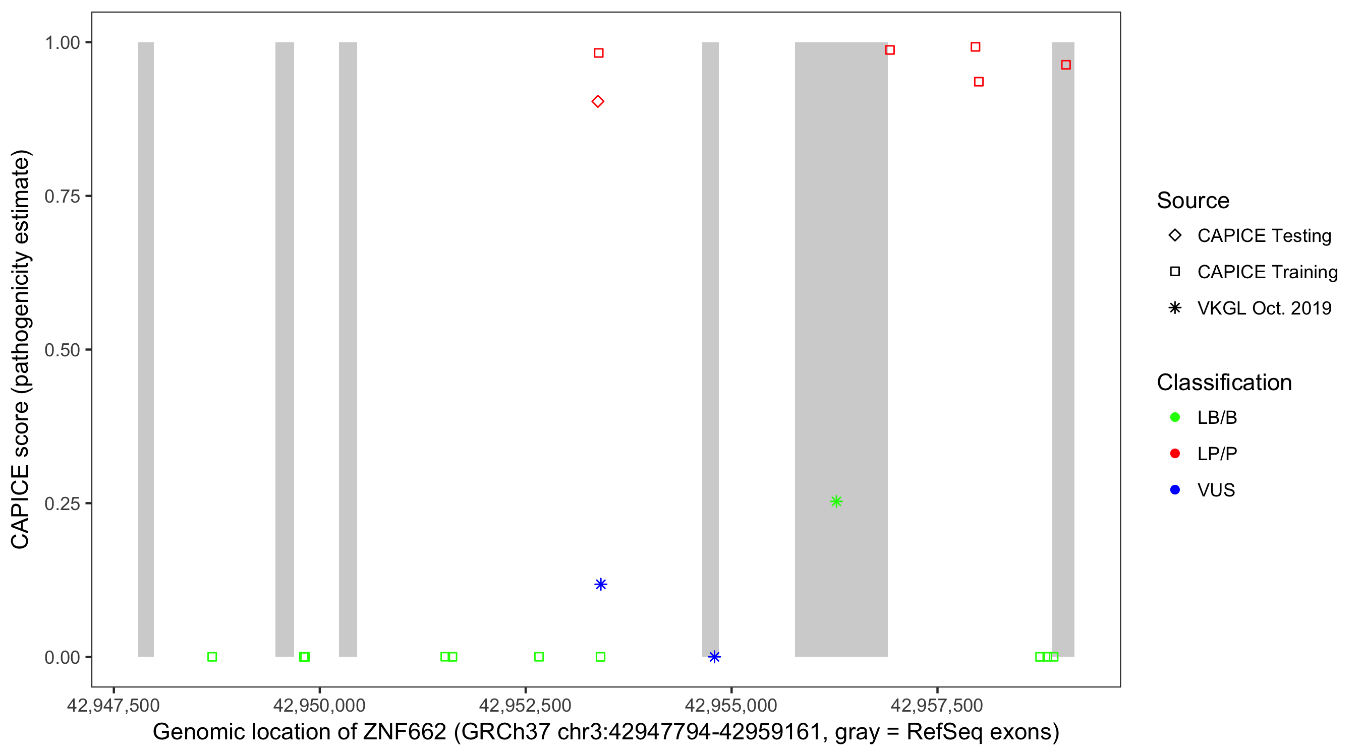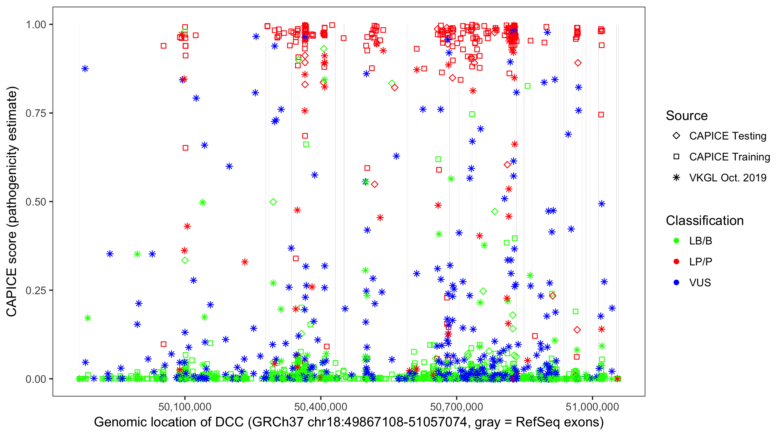 Shown are CAPICE train/test variants plus VKGL Oct 2019.