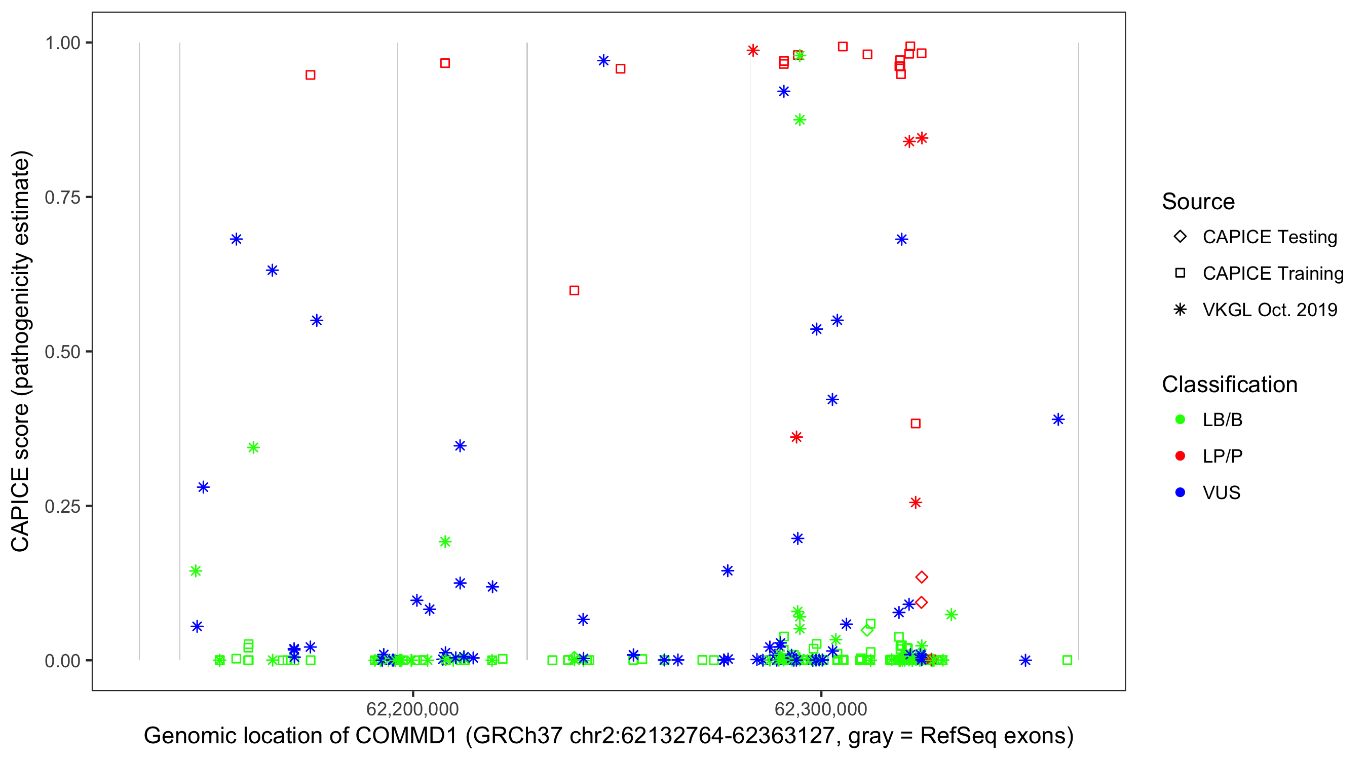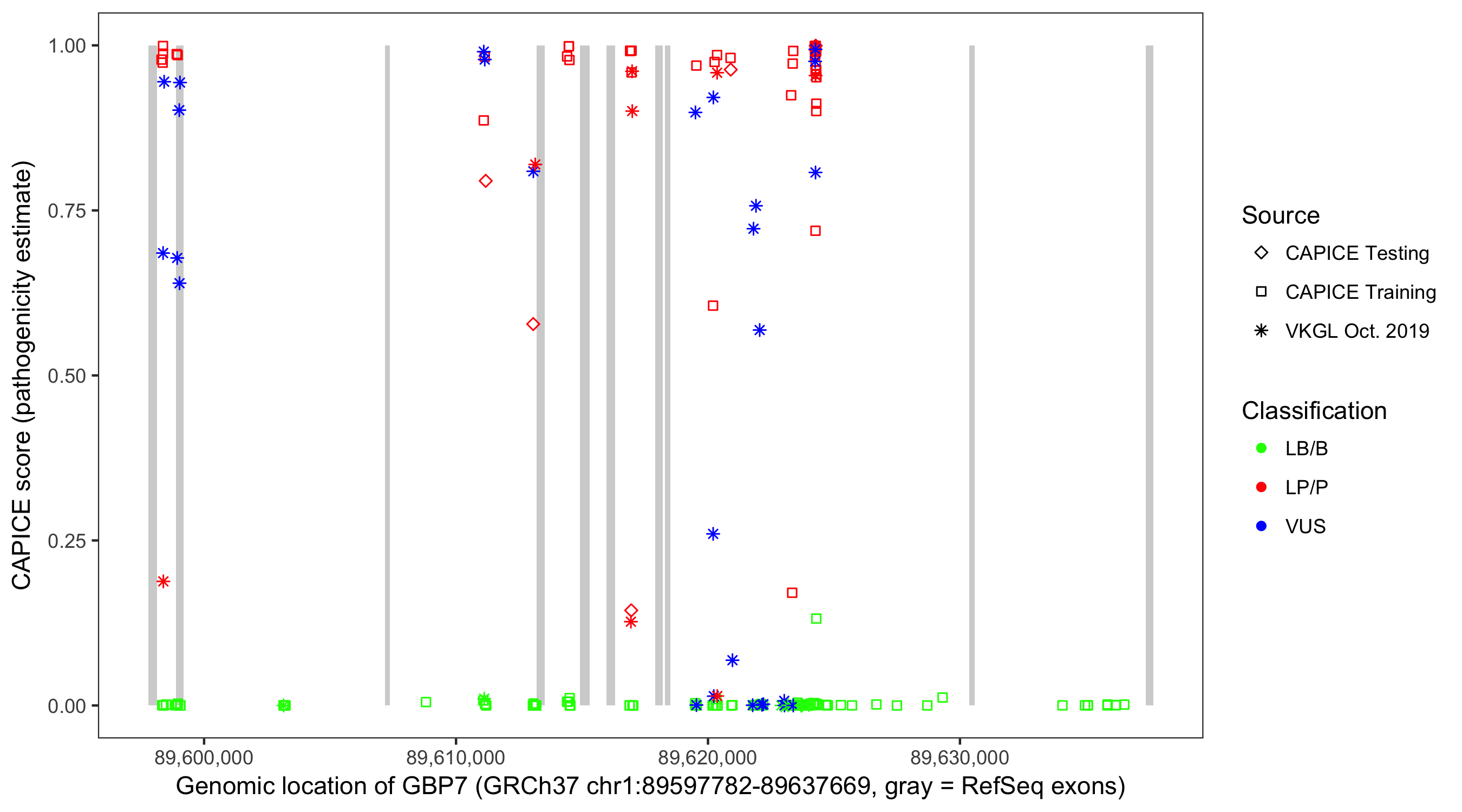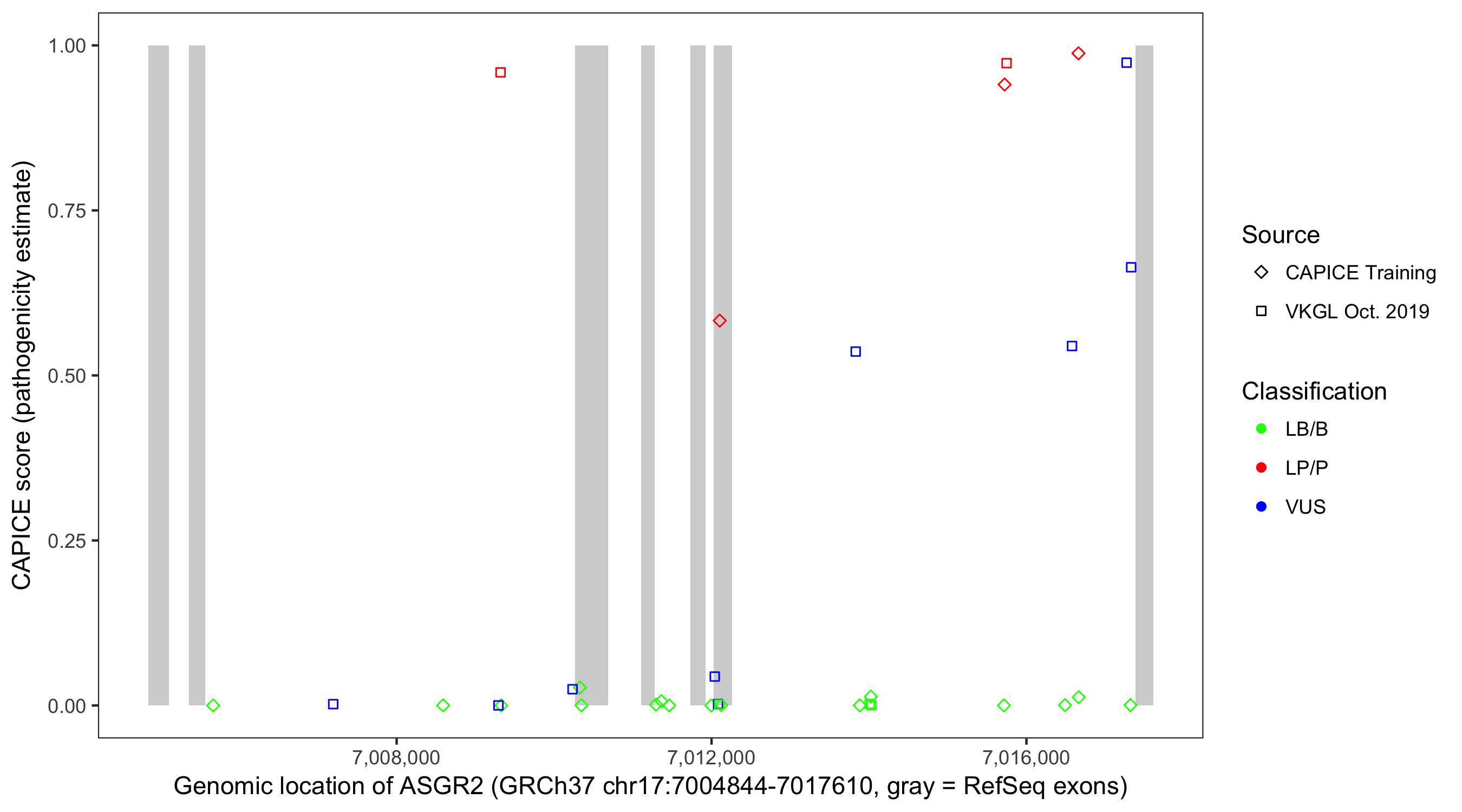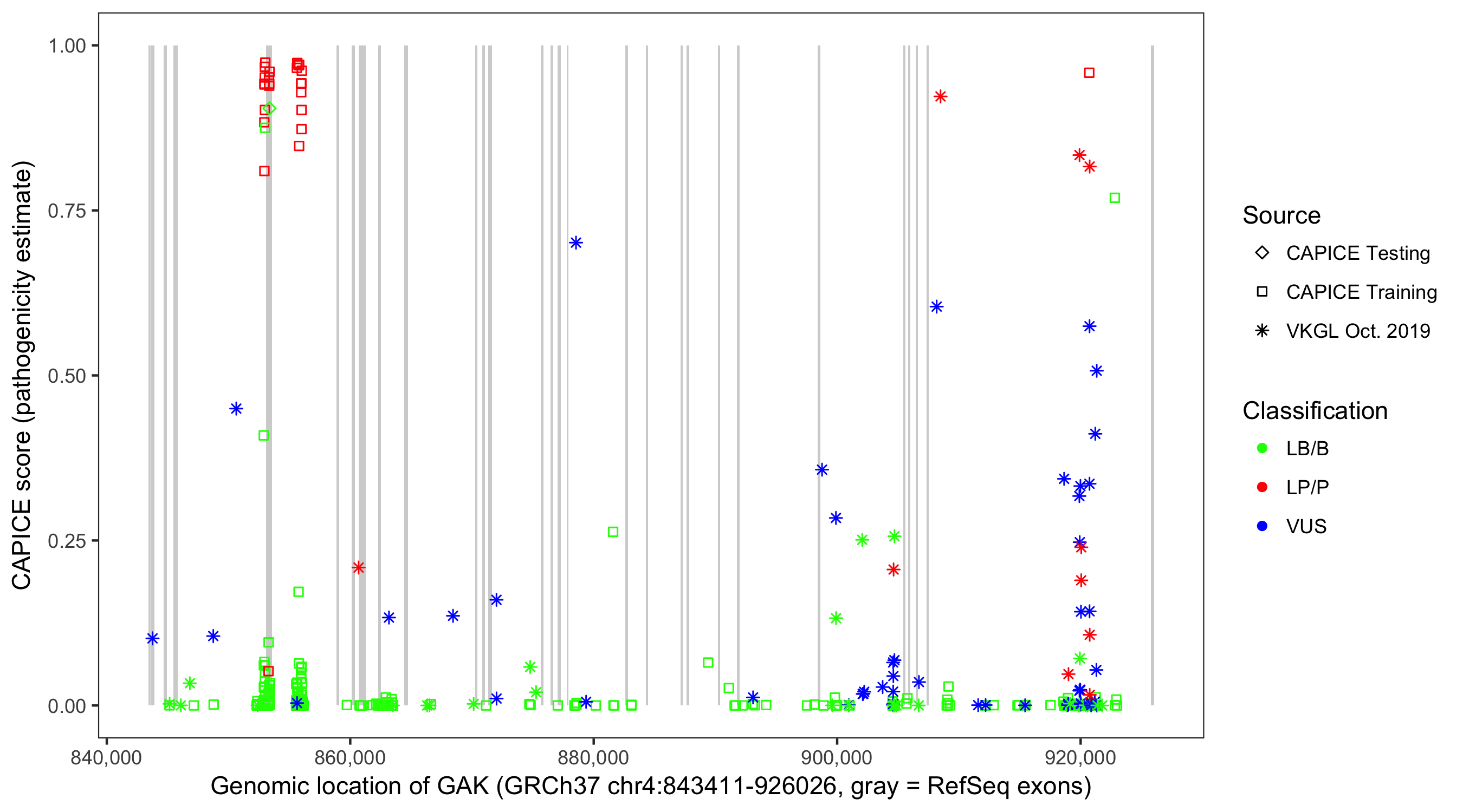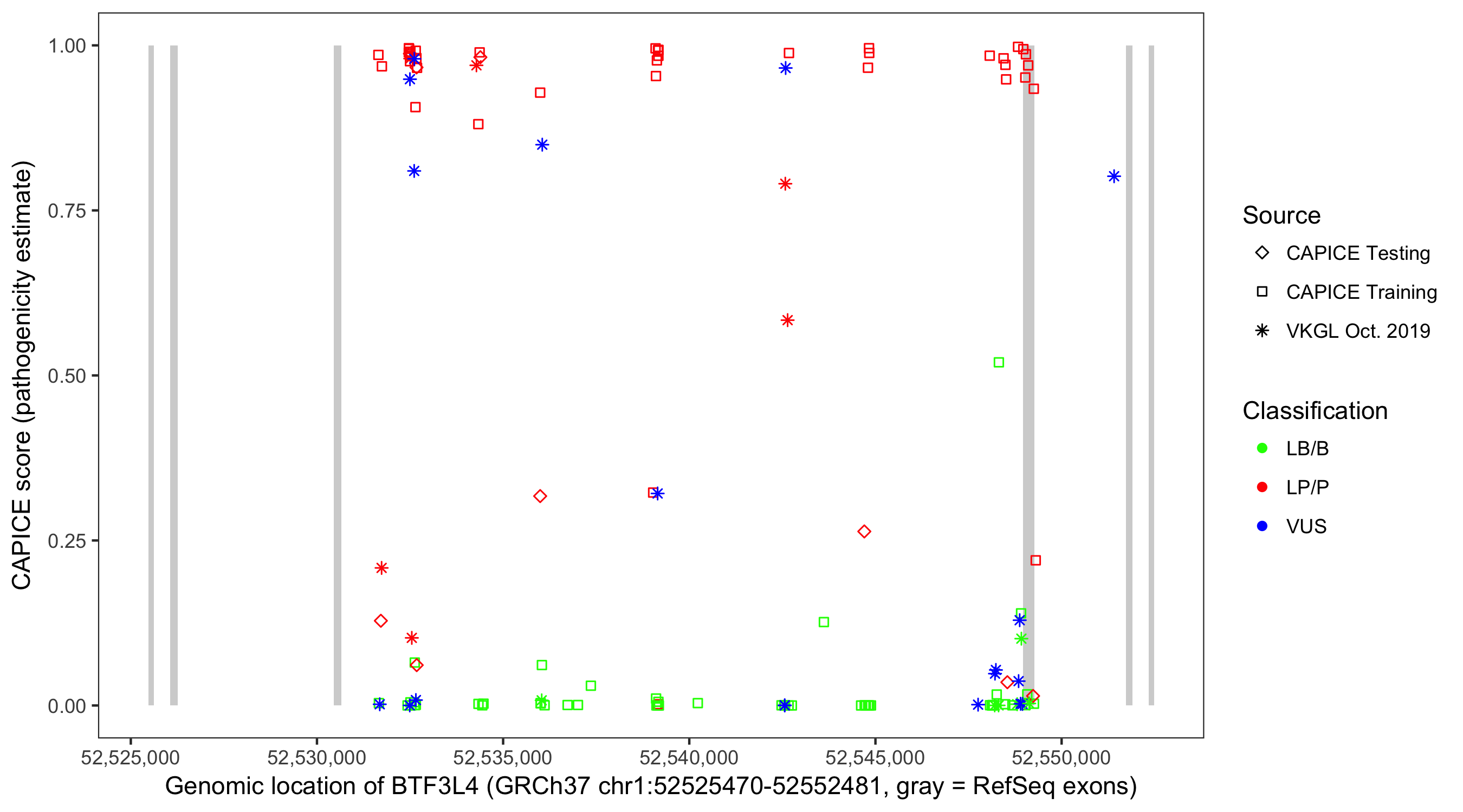 Shown are CAPICE train/test variants plus VKGL Oct 2019.