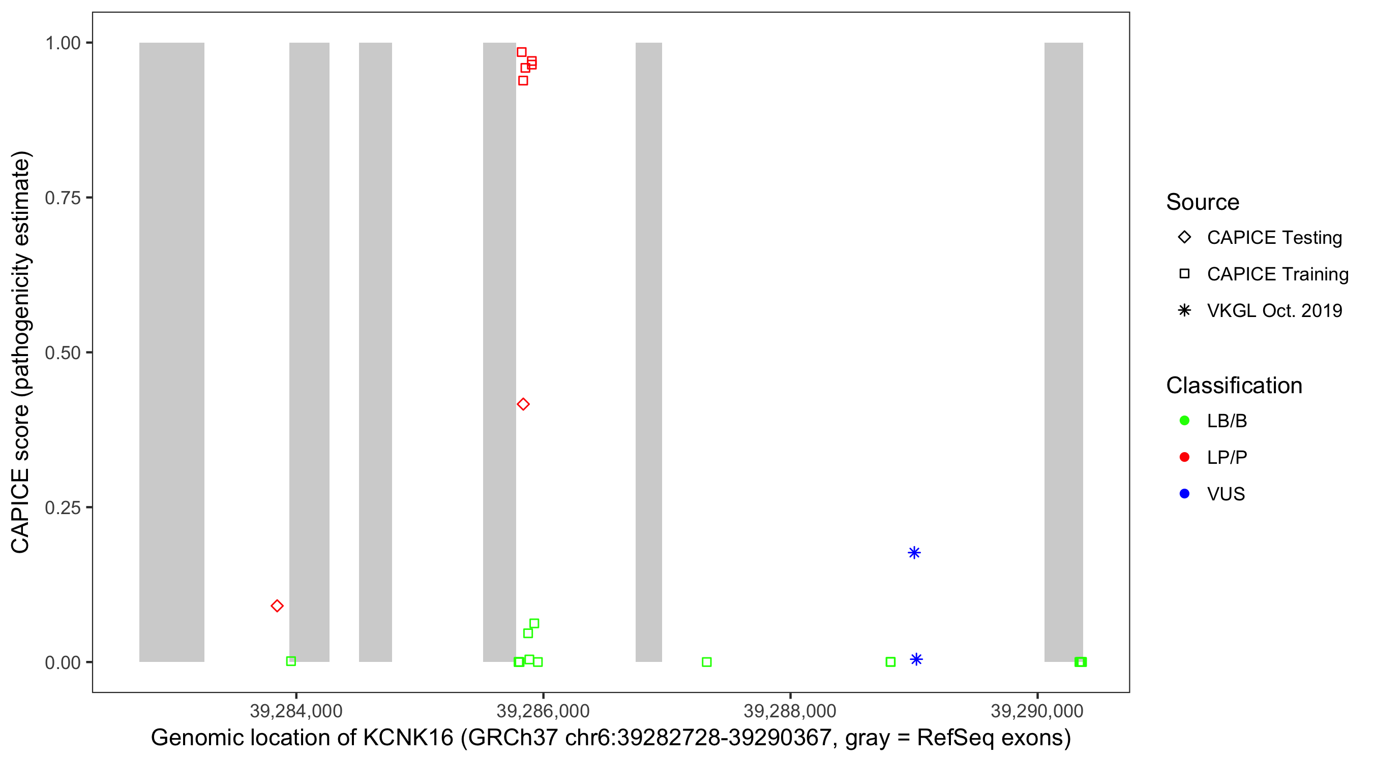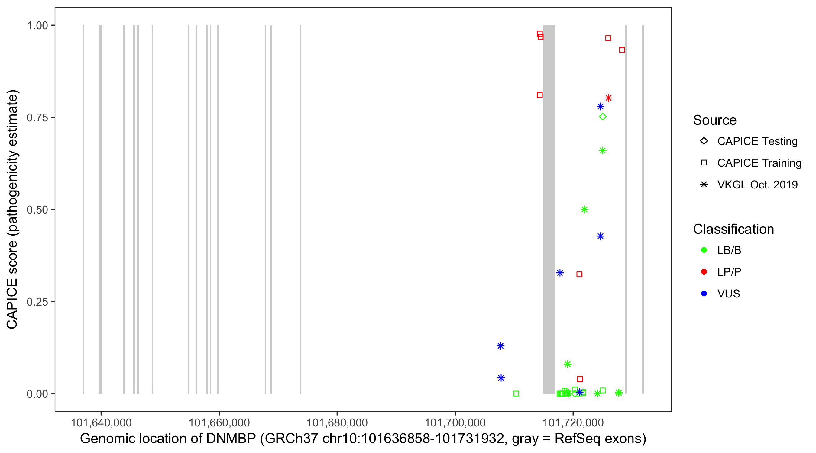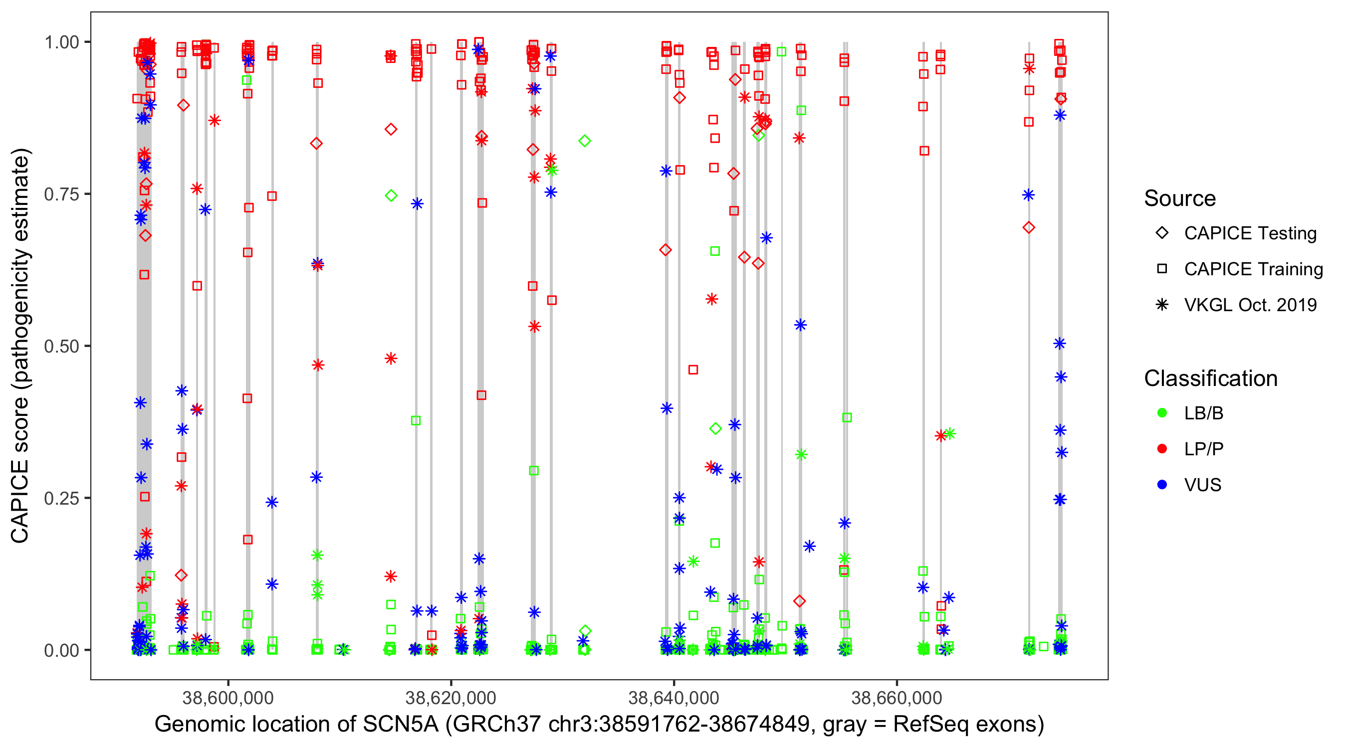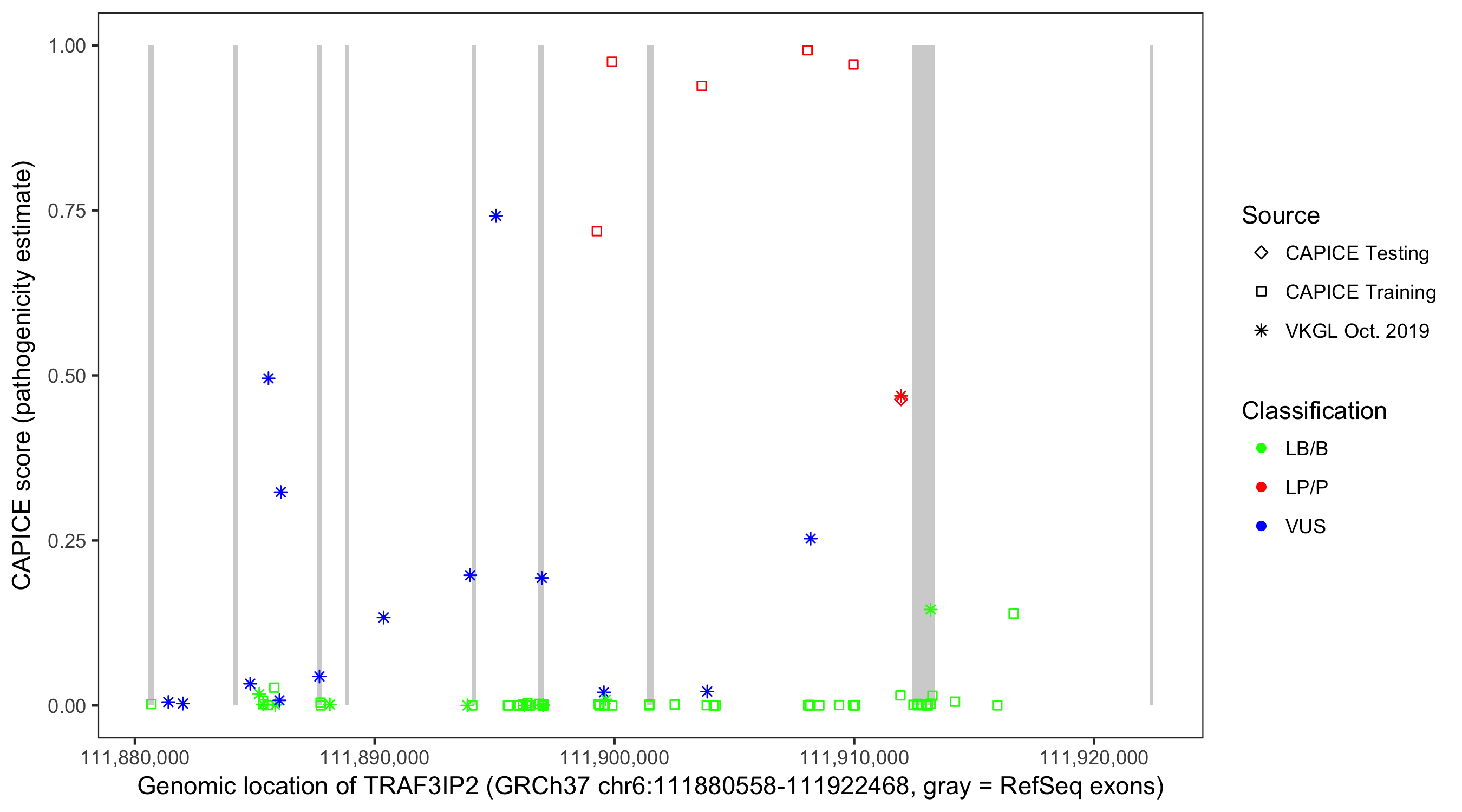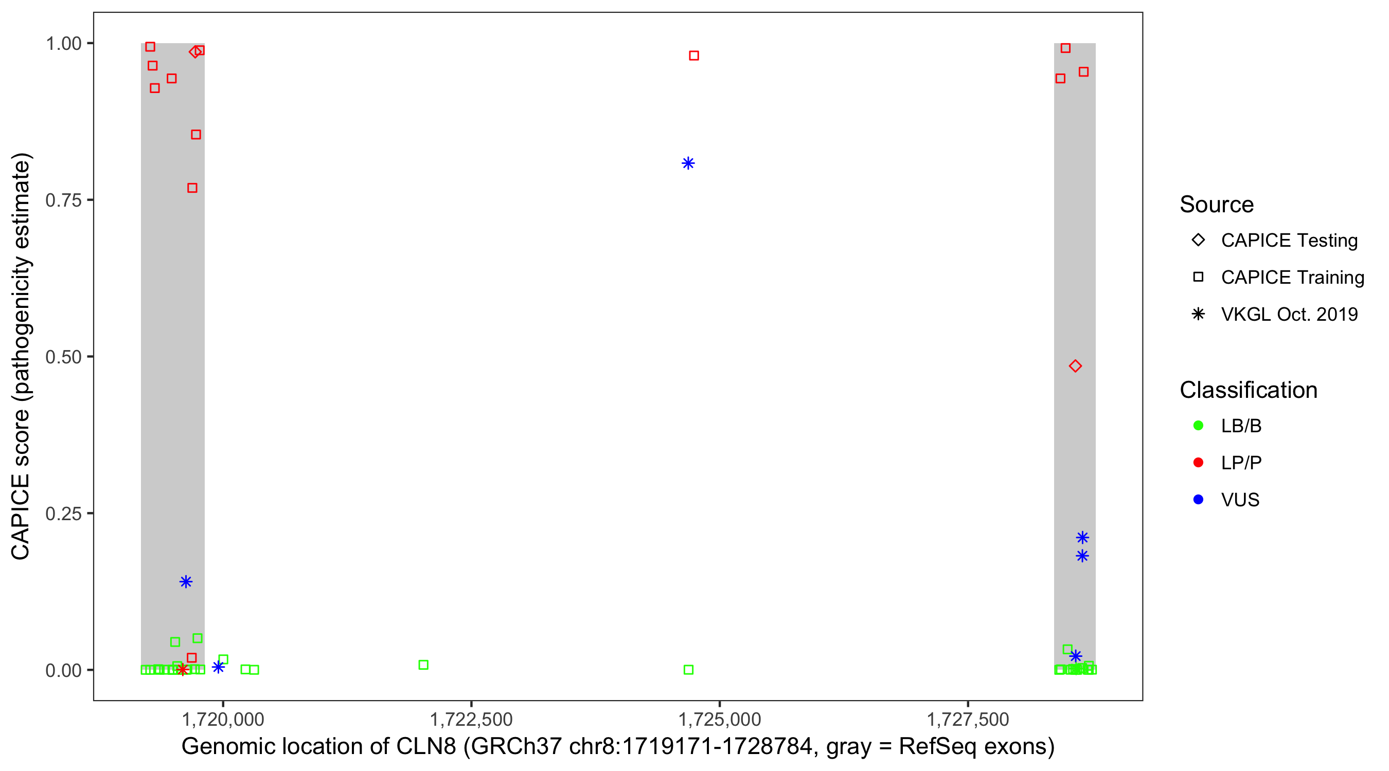 Shown are CAPICE train/test variants plus VKGL Oct 2019.