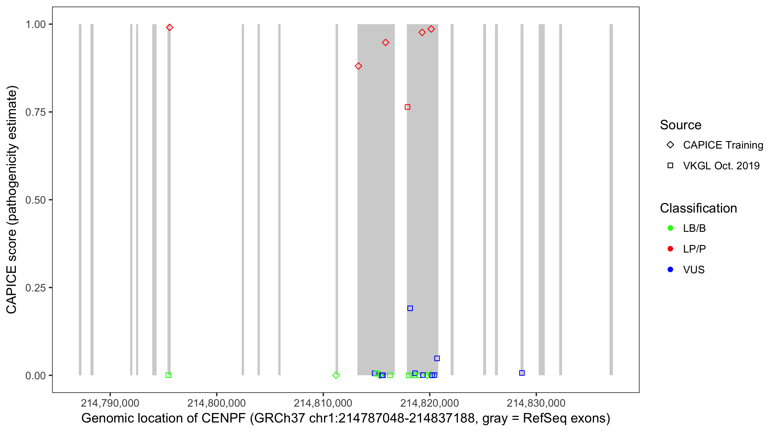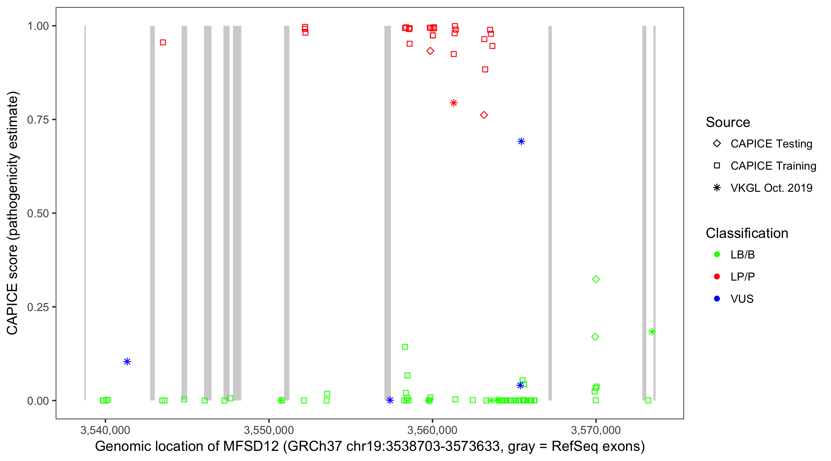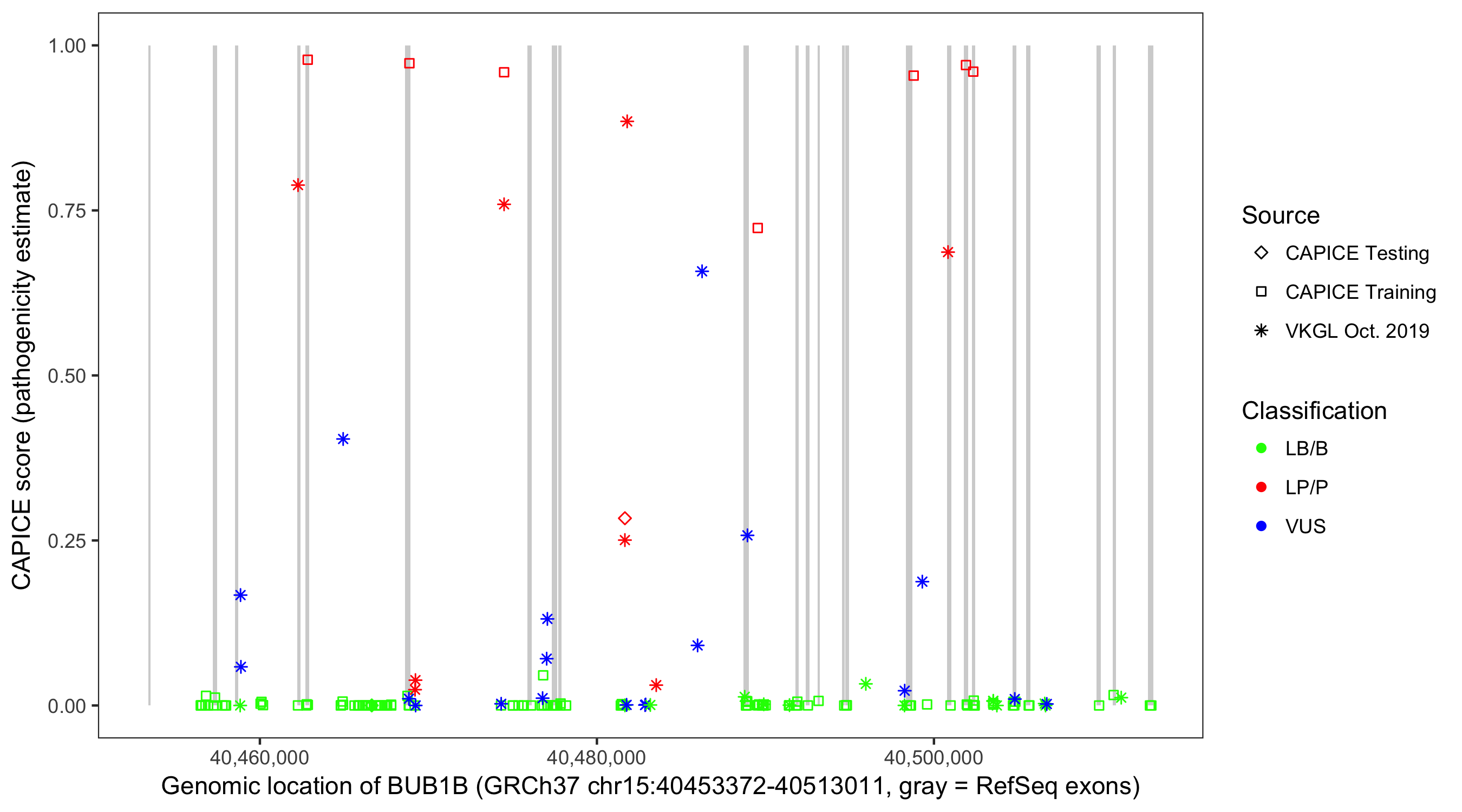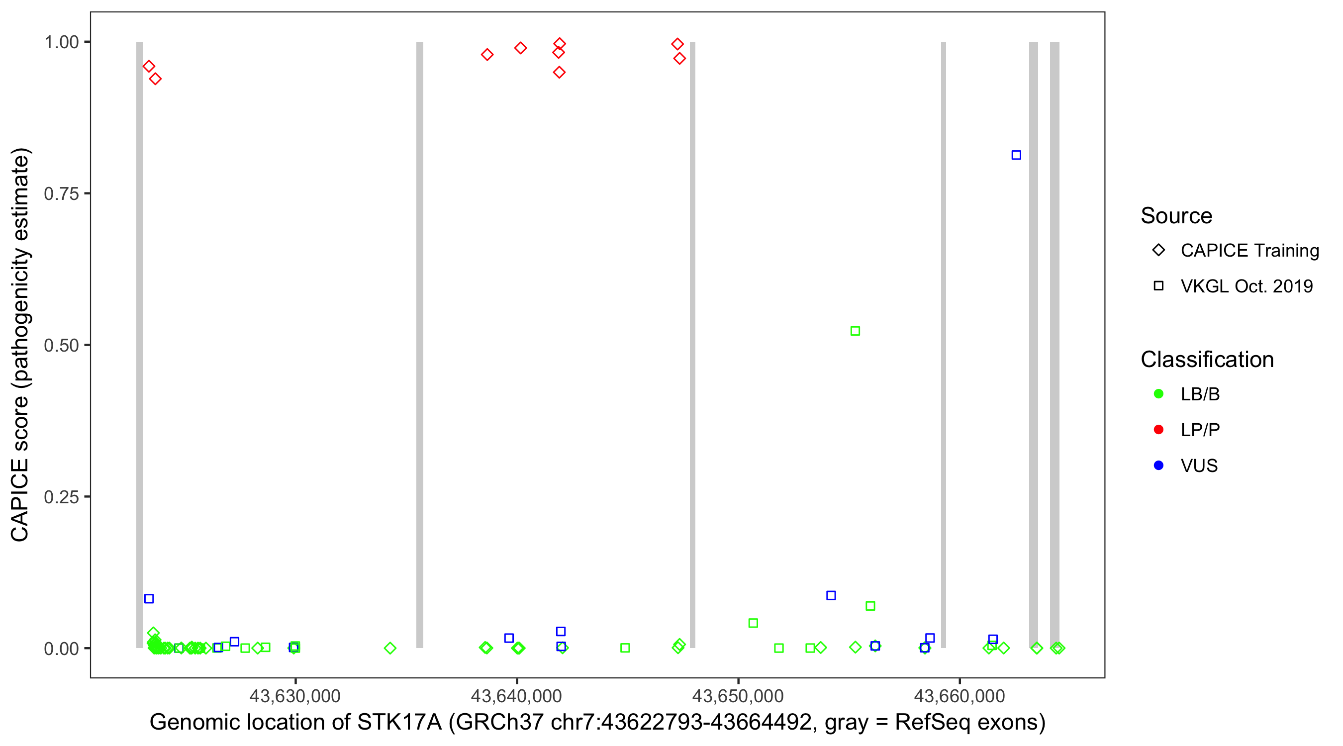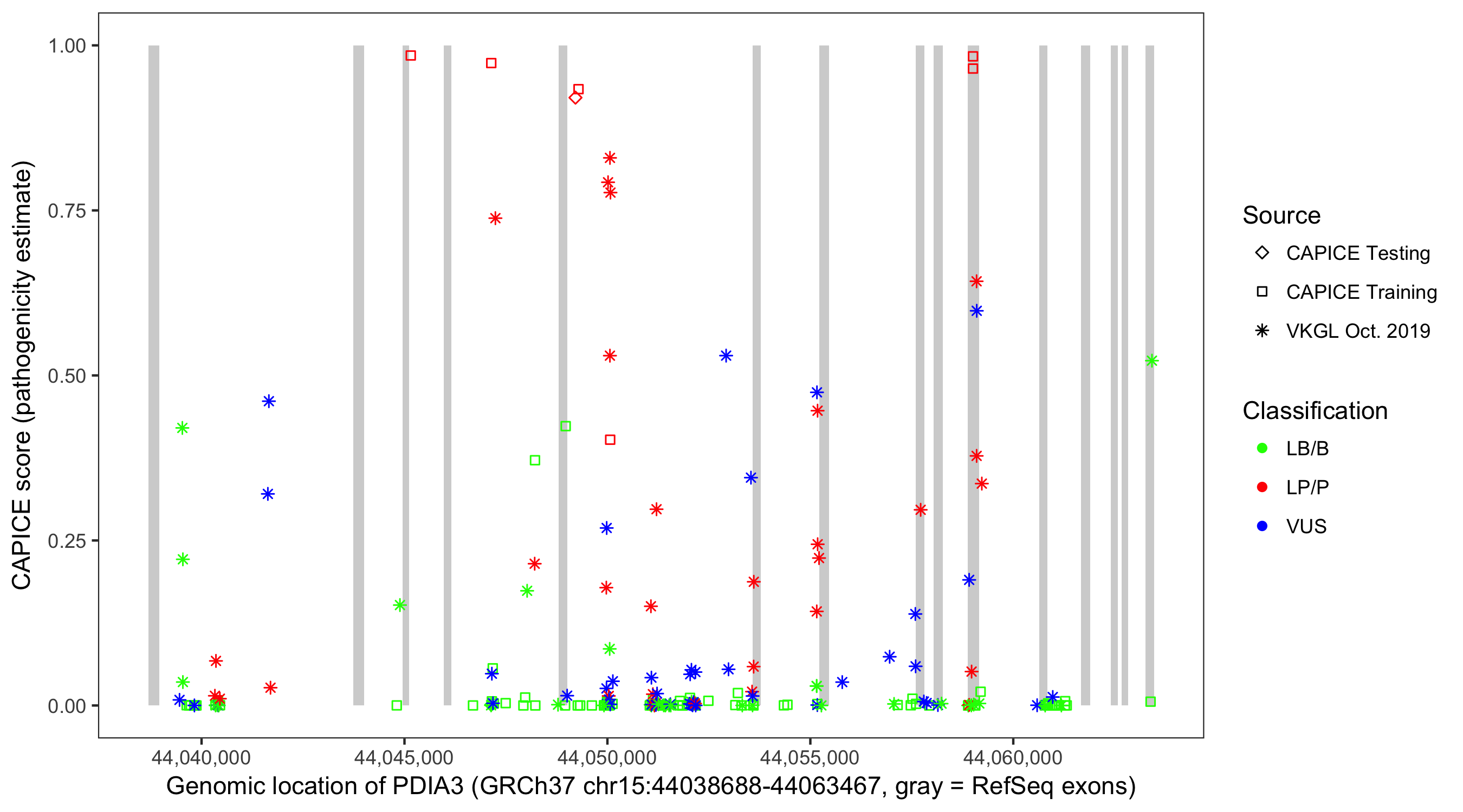 Shown are CAPICE train/test variants plus VKGL Oct 2019.