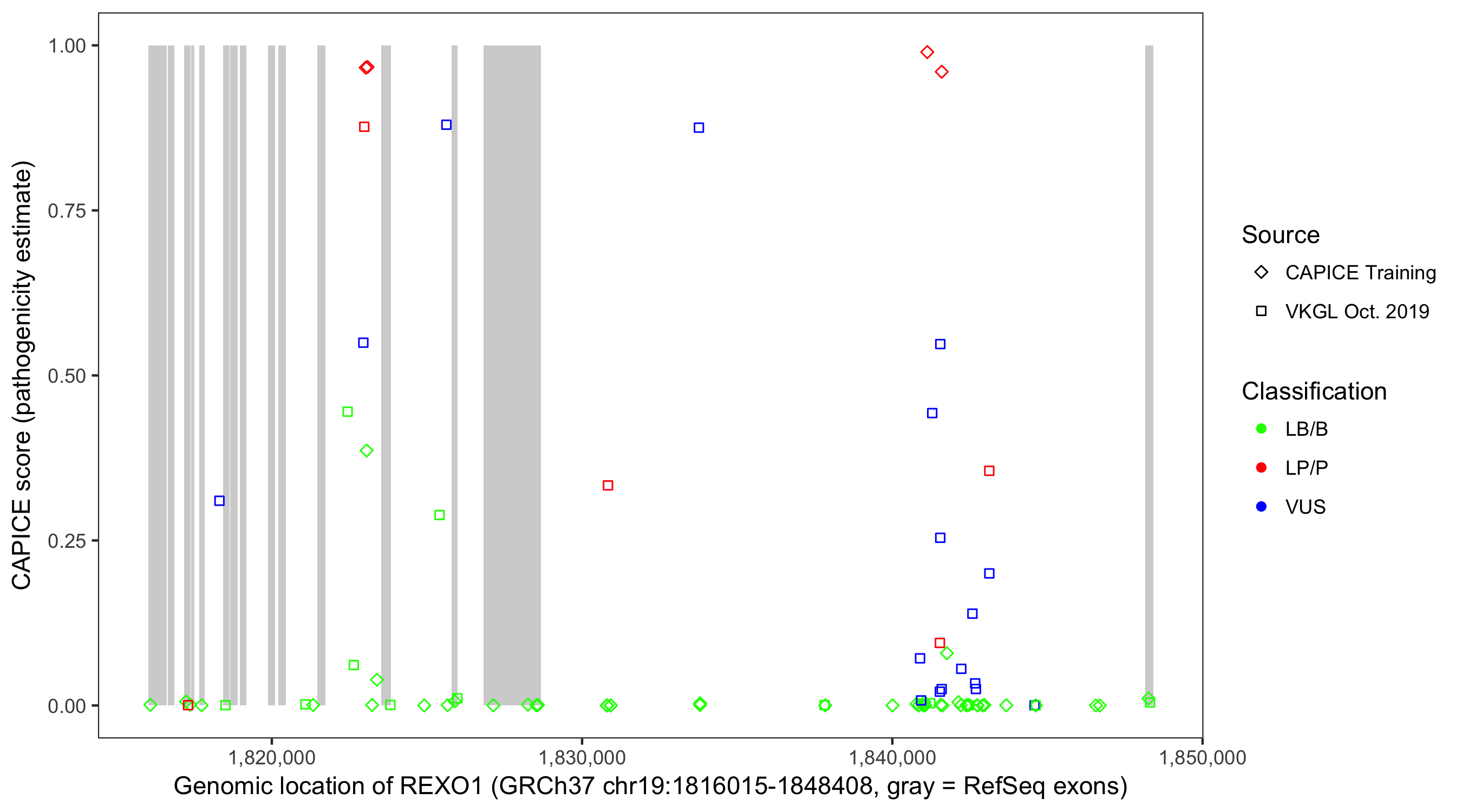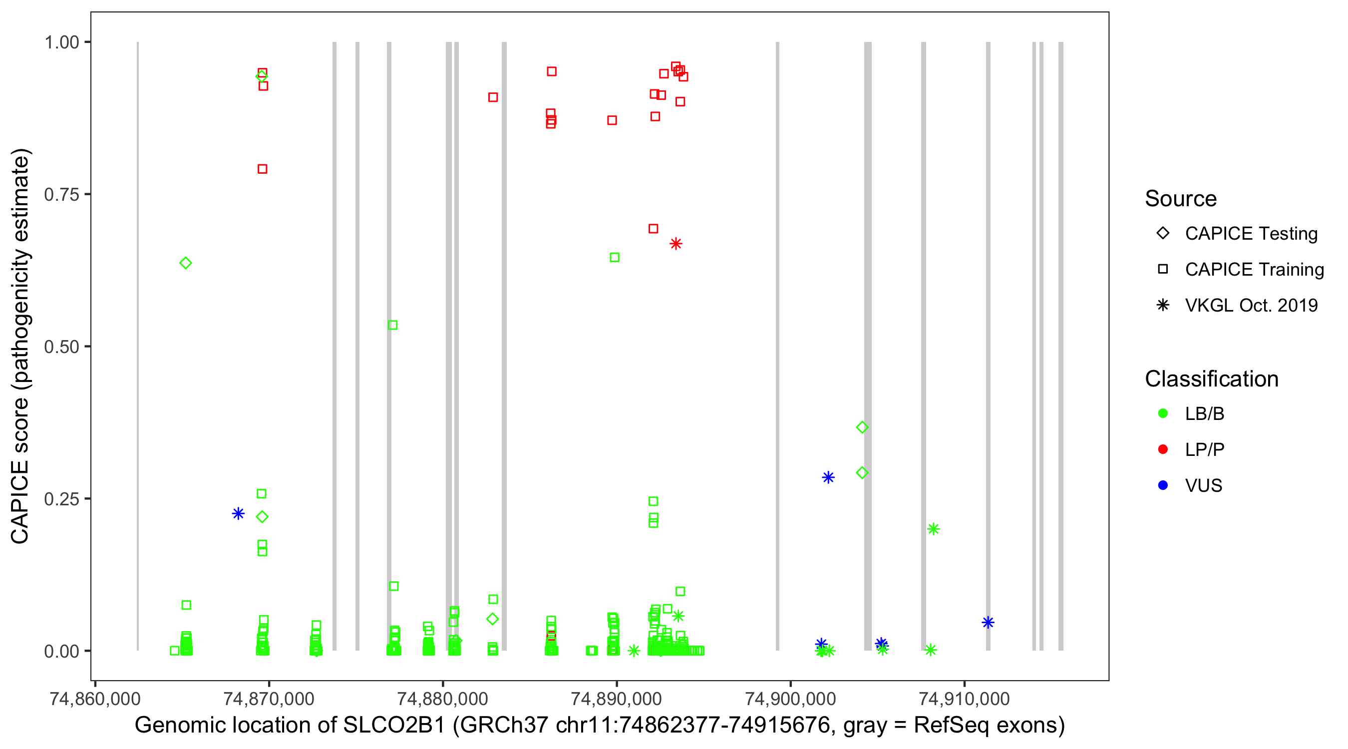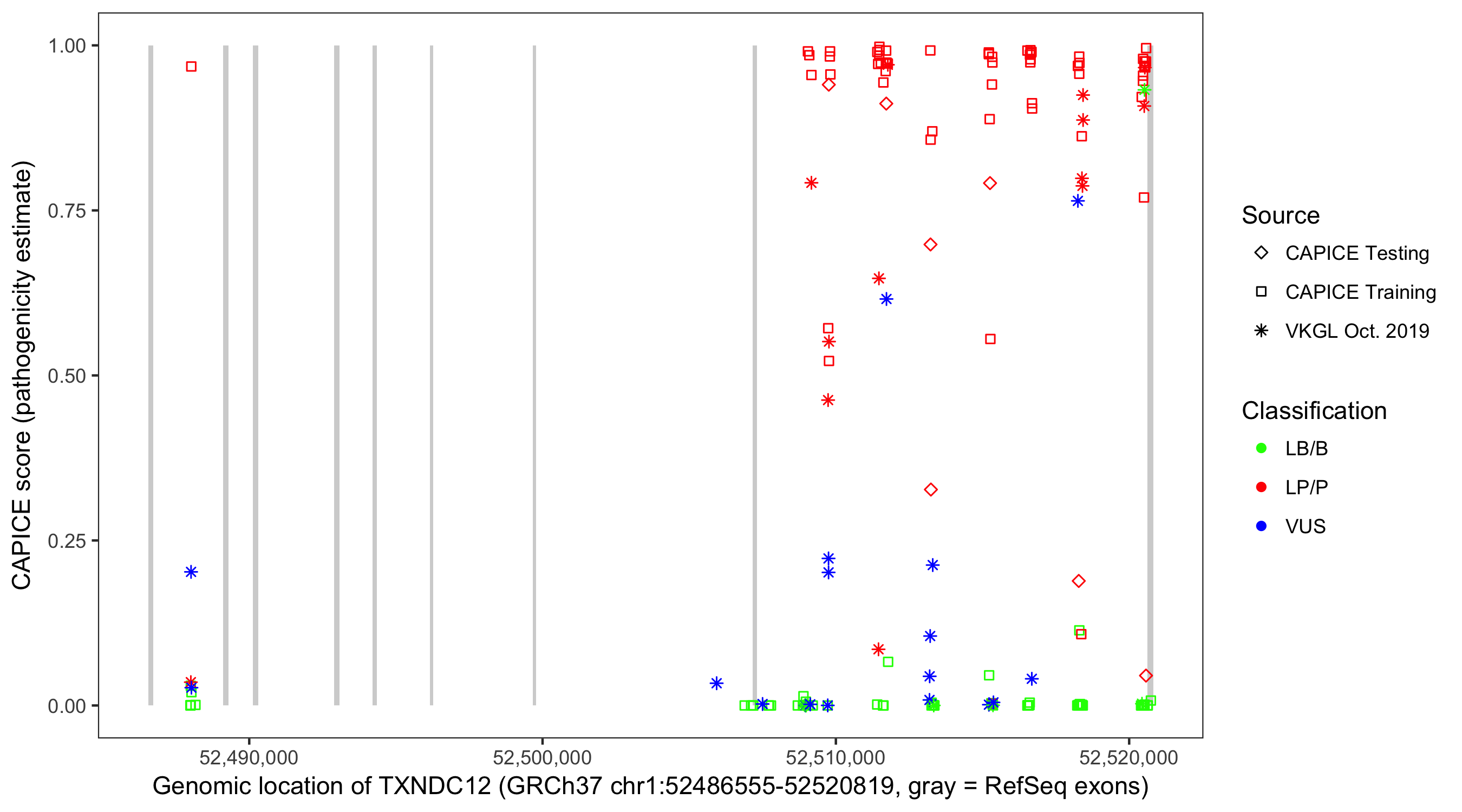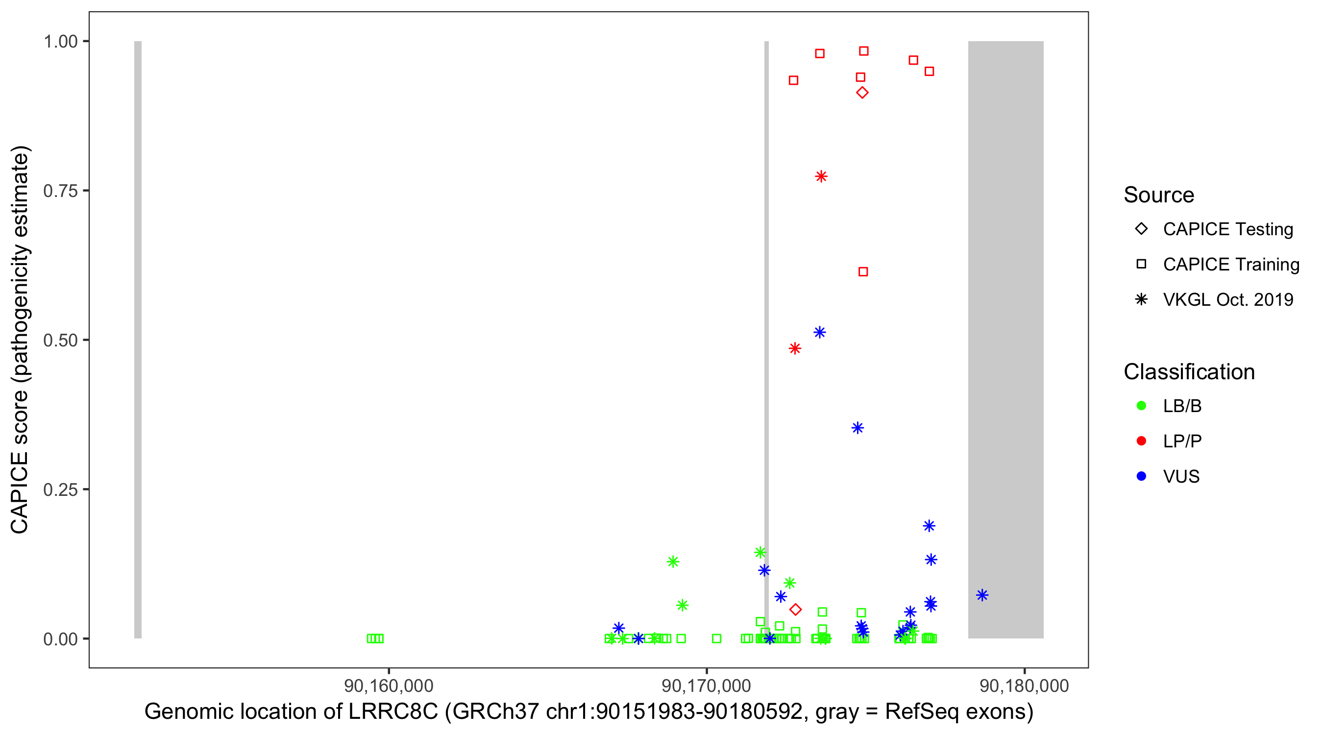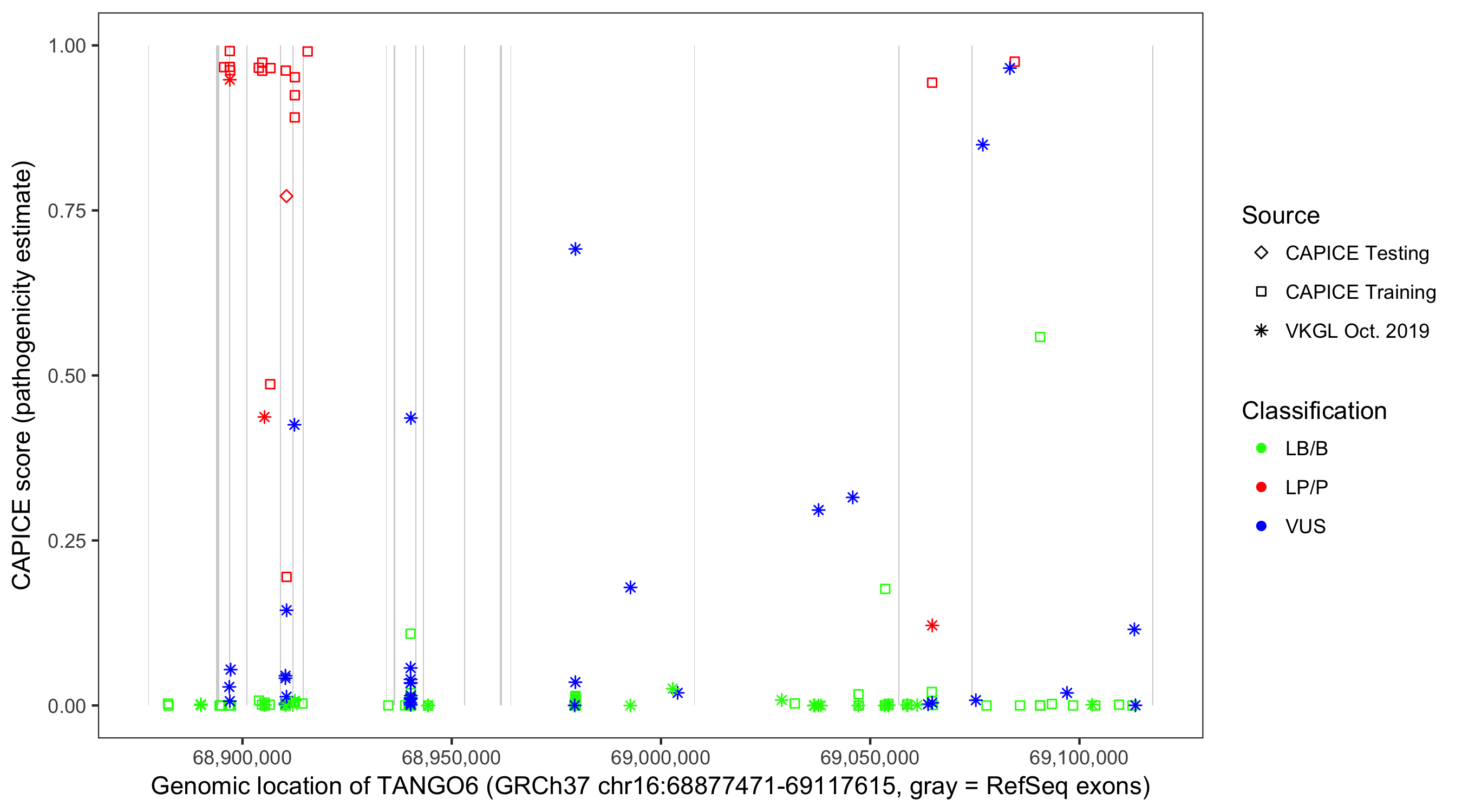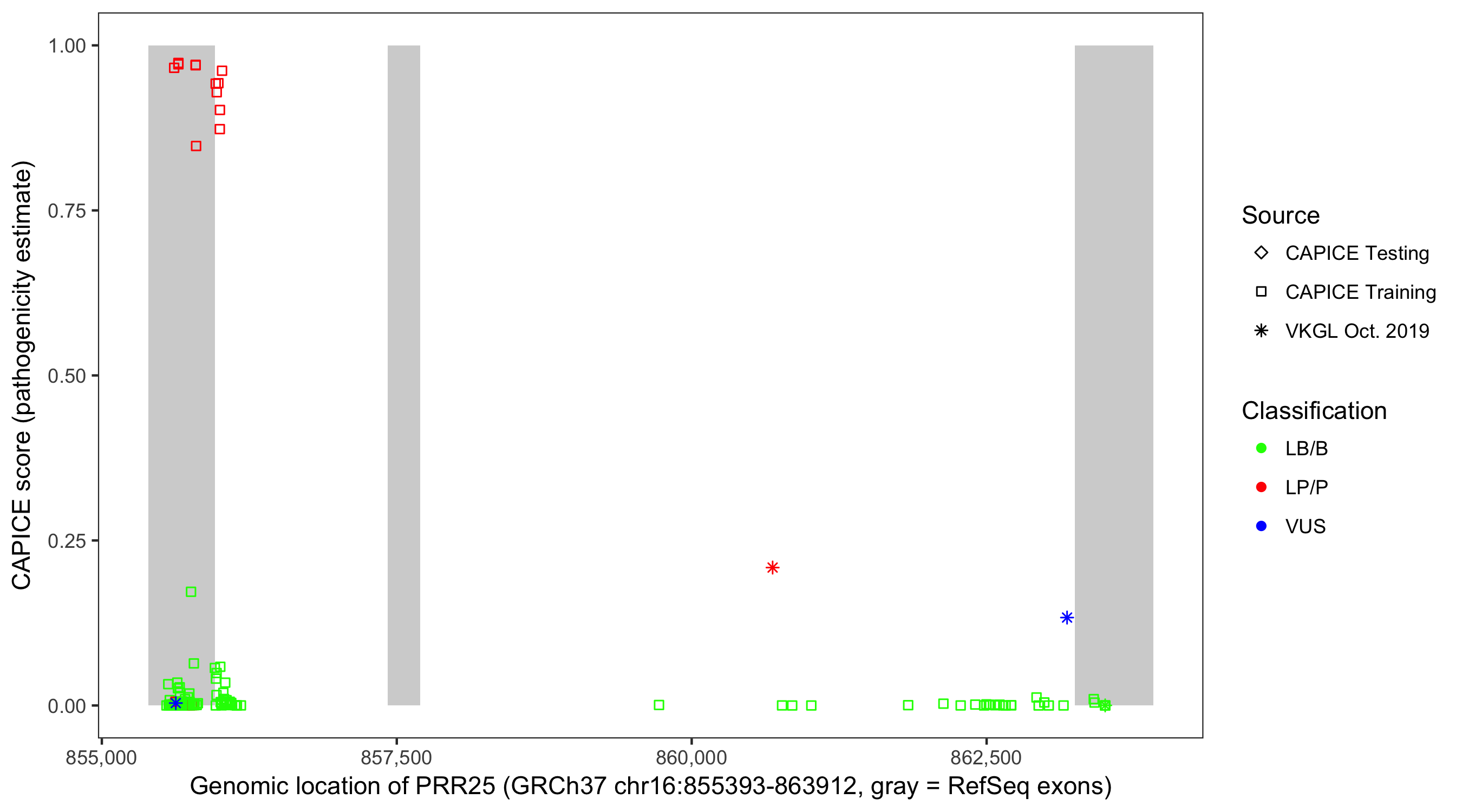 Shown are CAPICE train/test variants plus VKGL Oct 2019.