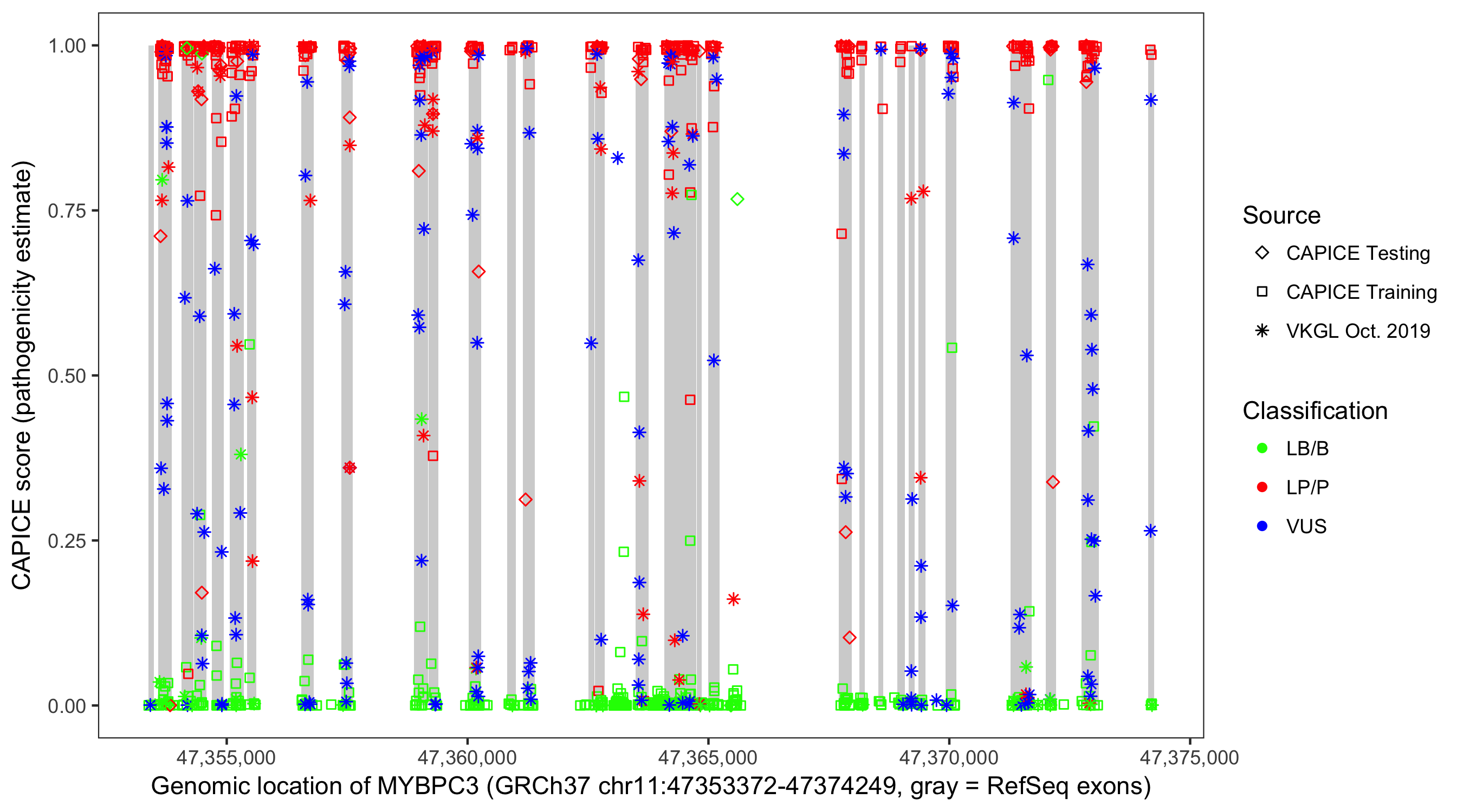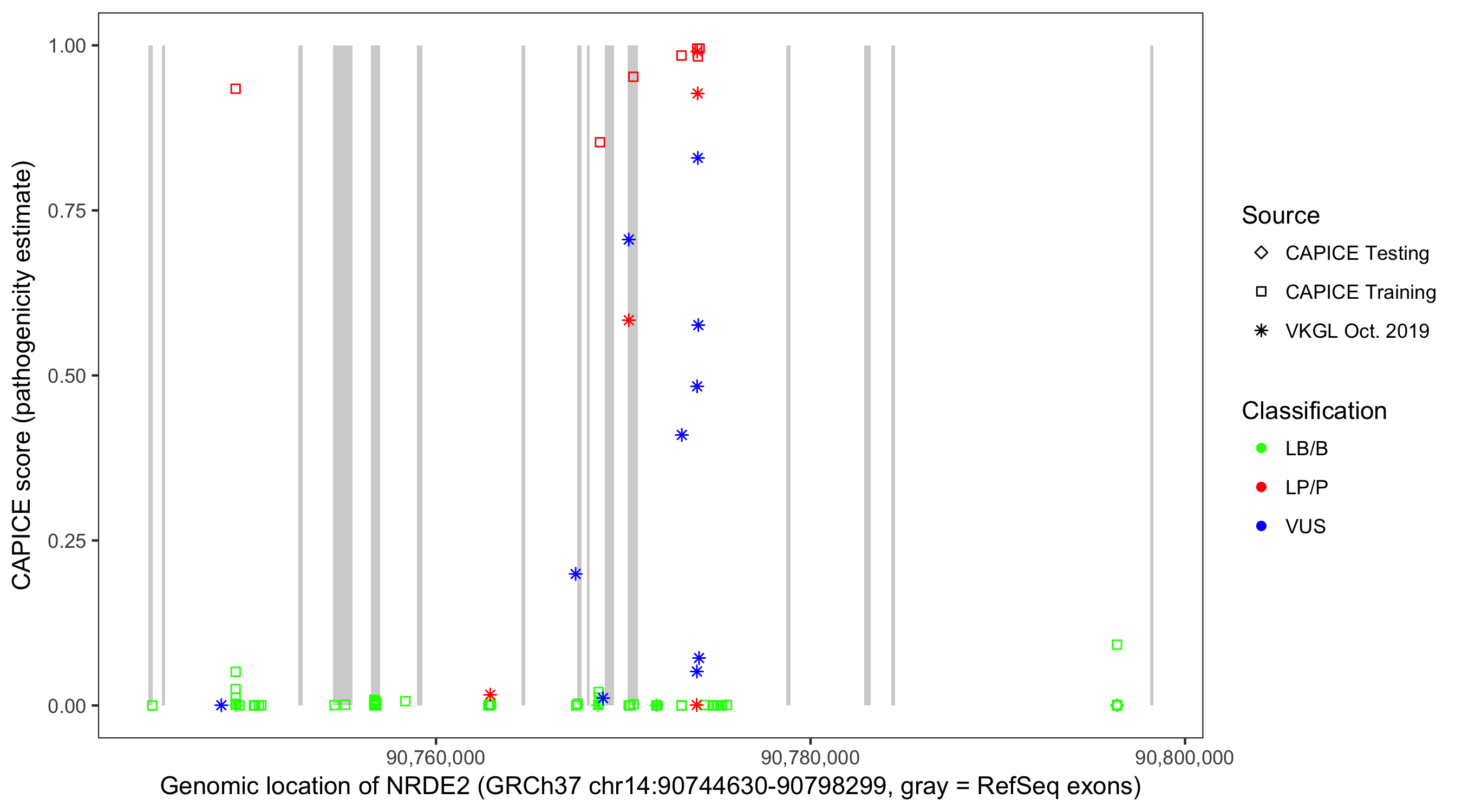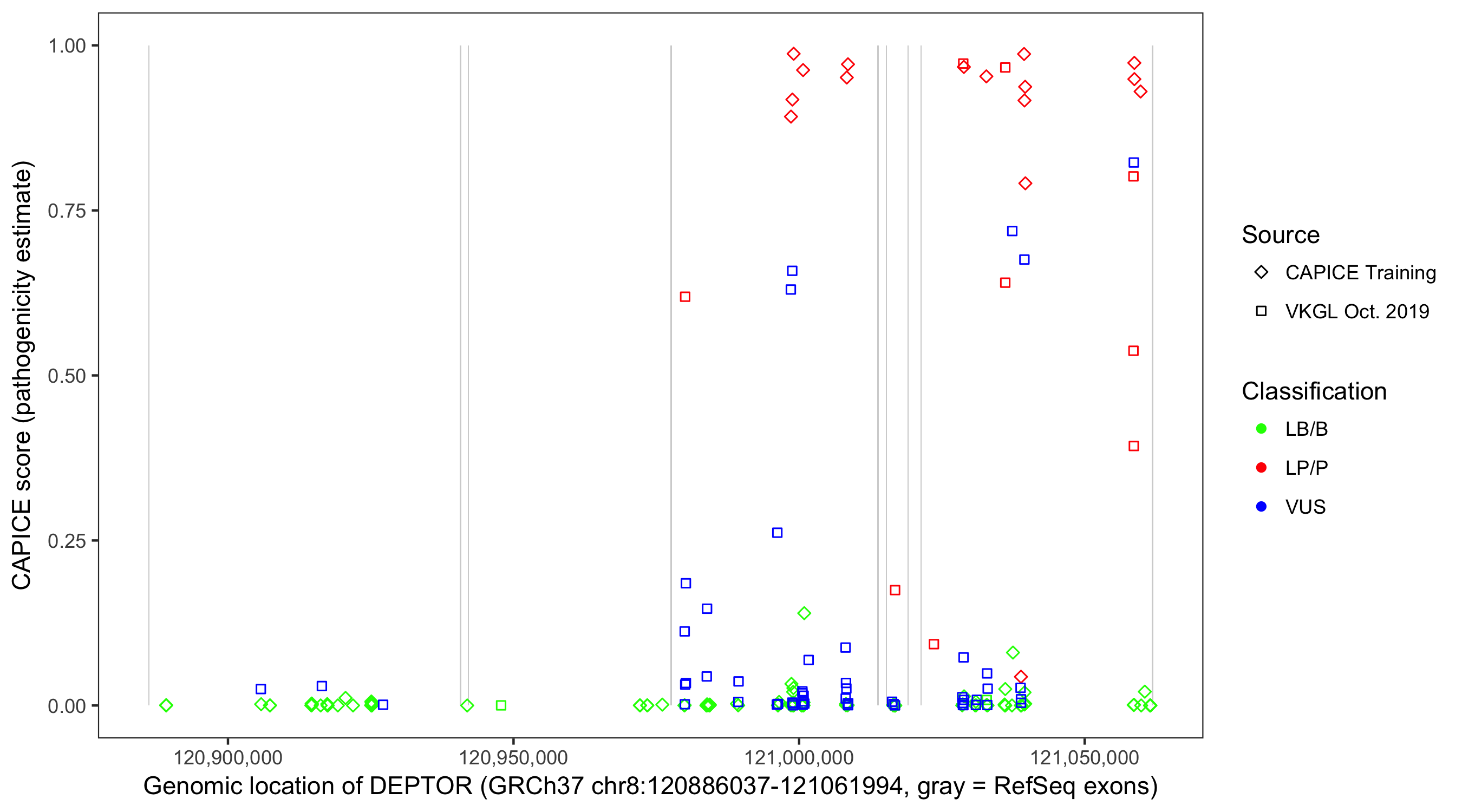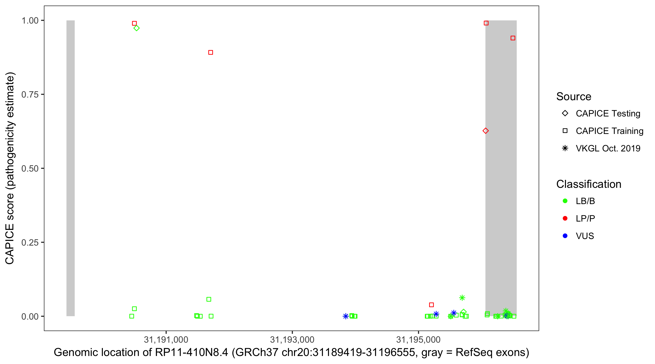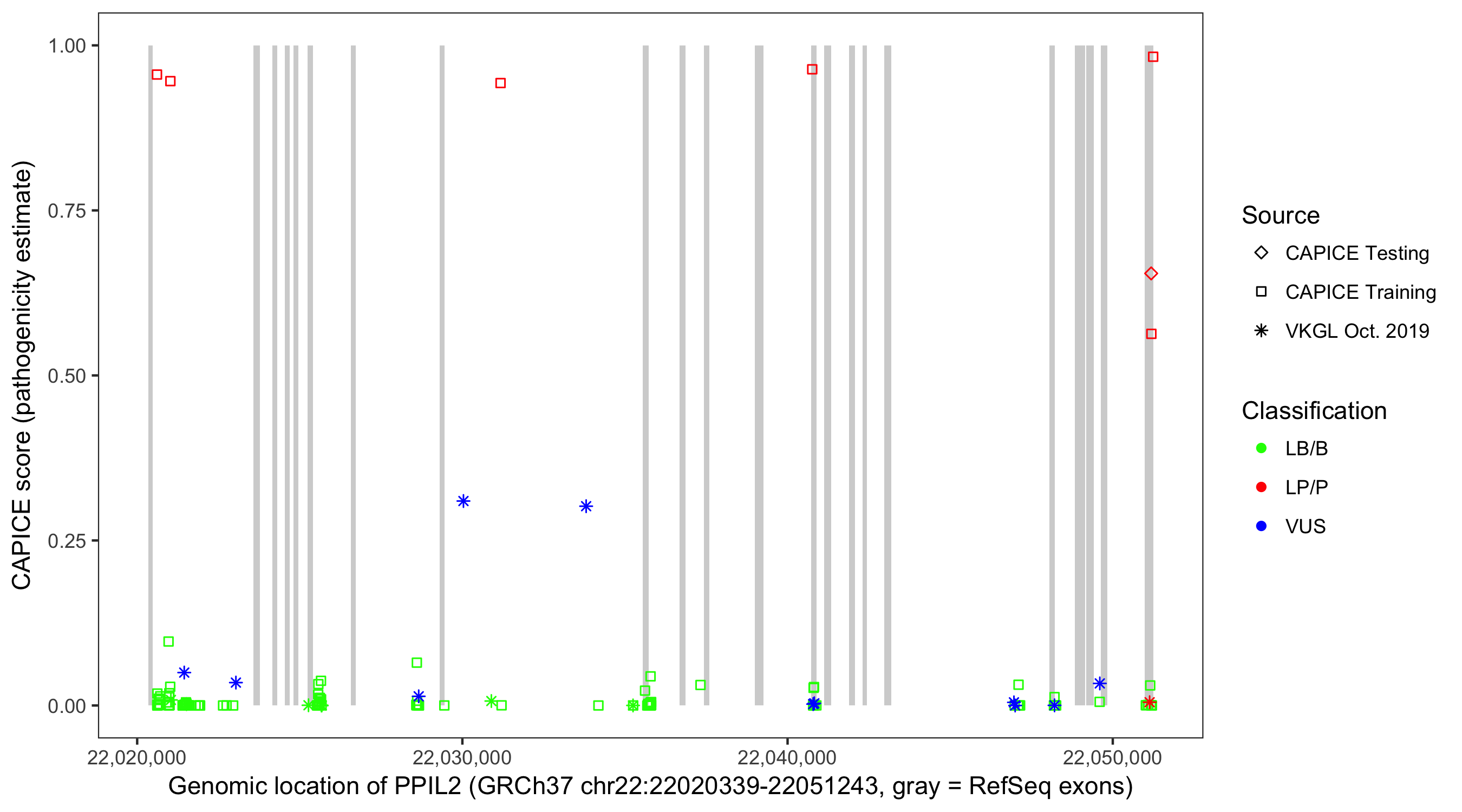 Shown are CAPICE train/test variants plus VKGL Oct 2019.