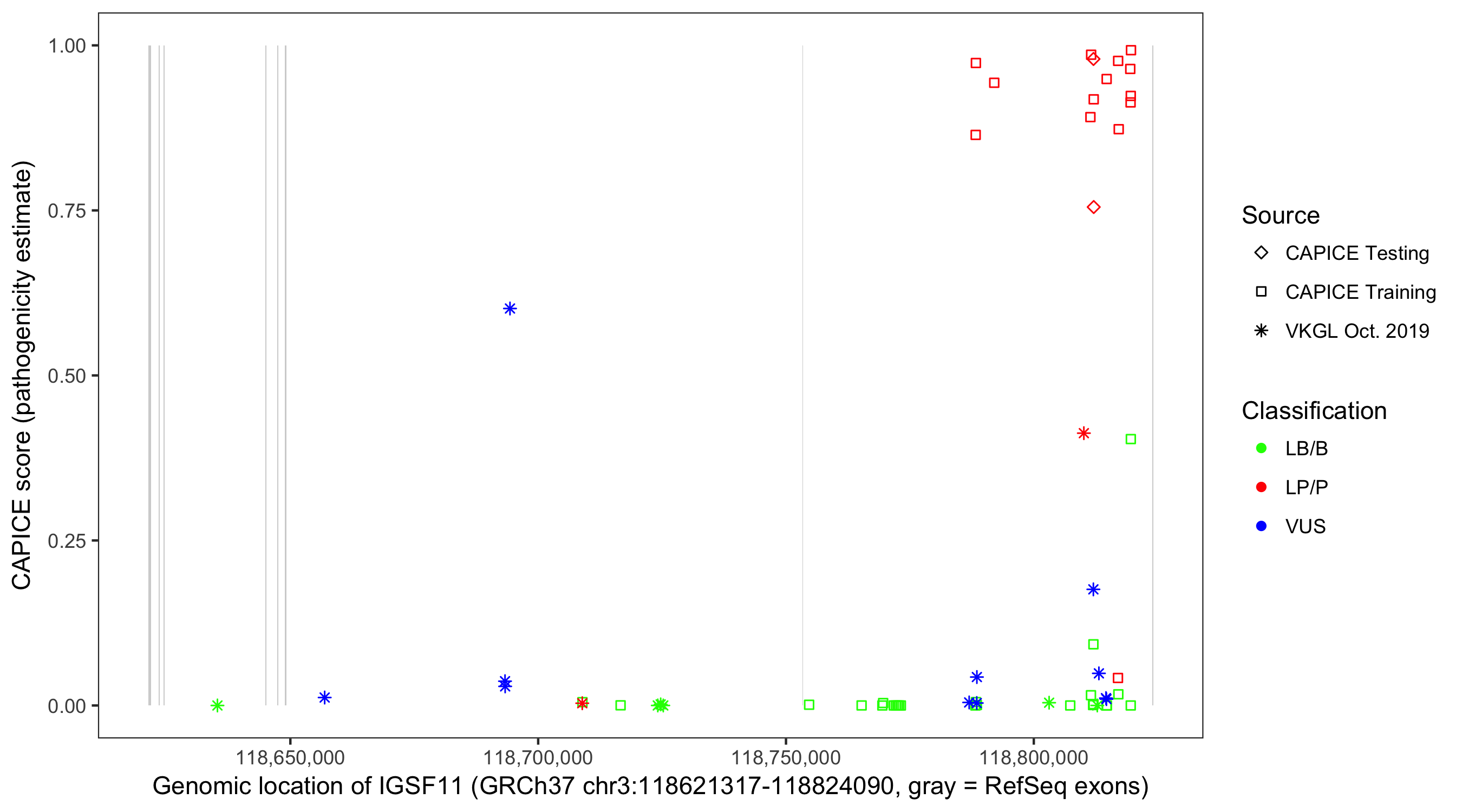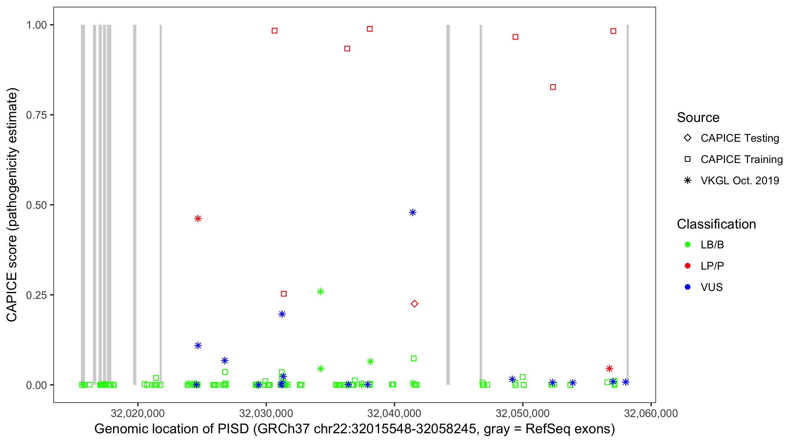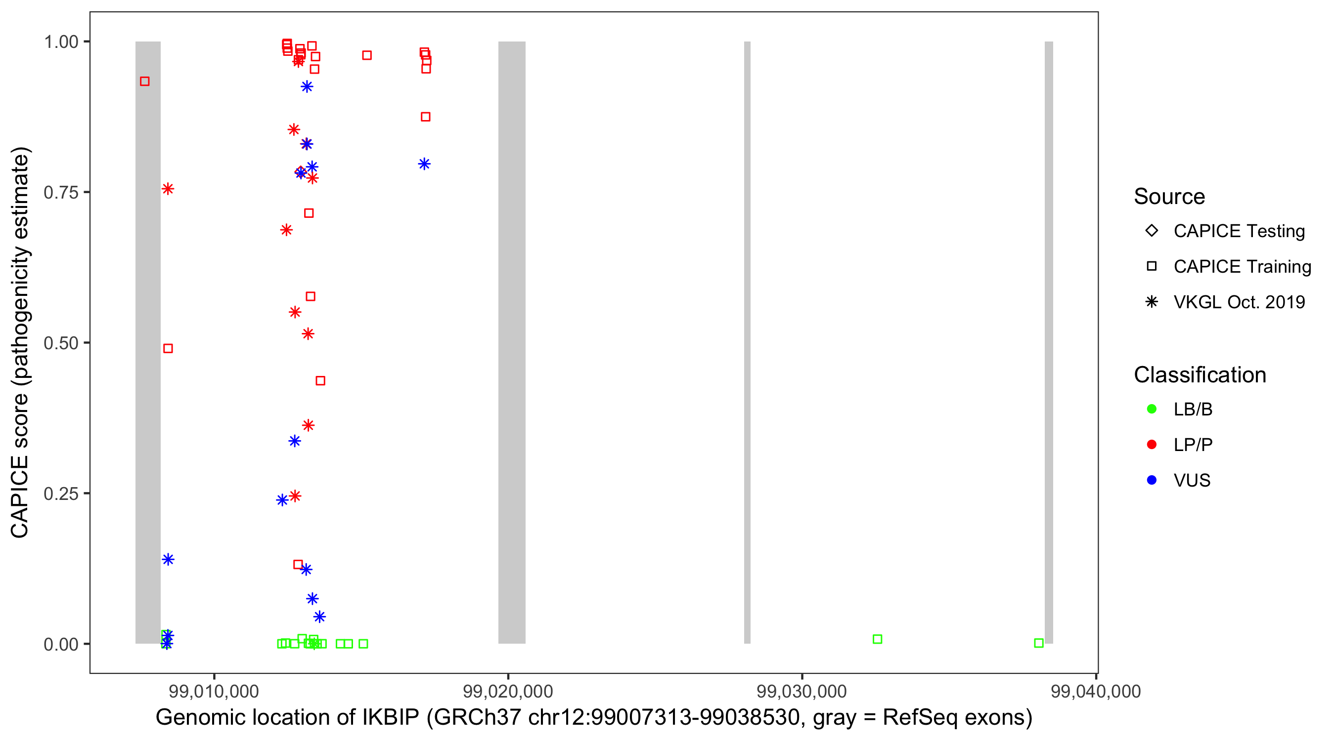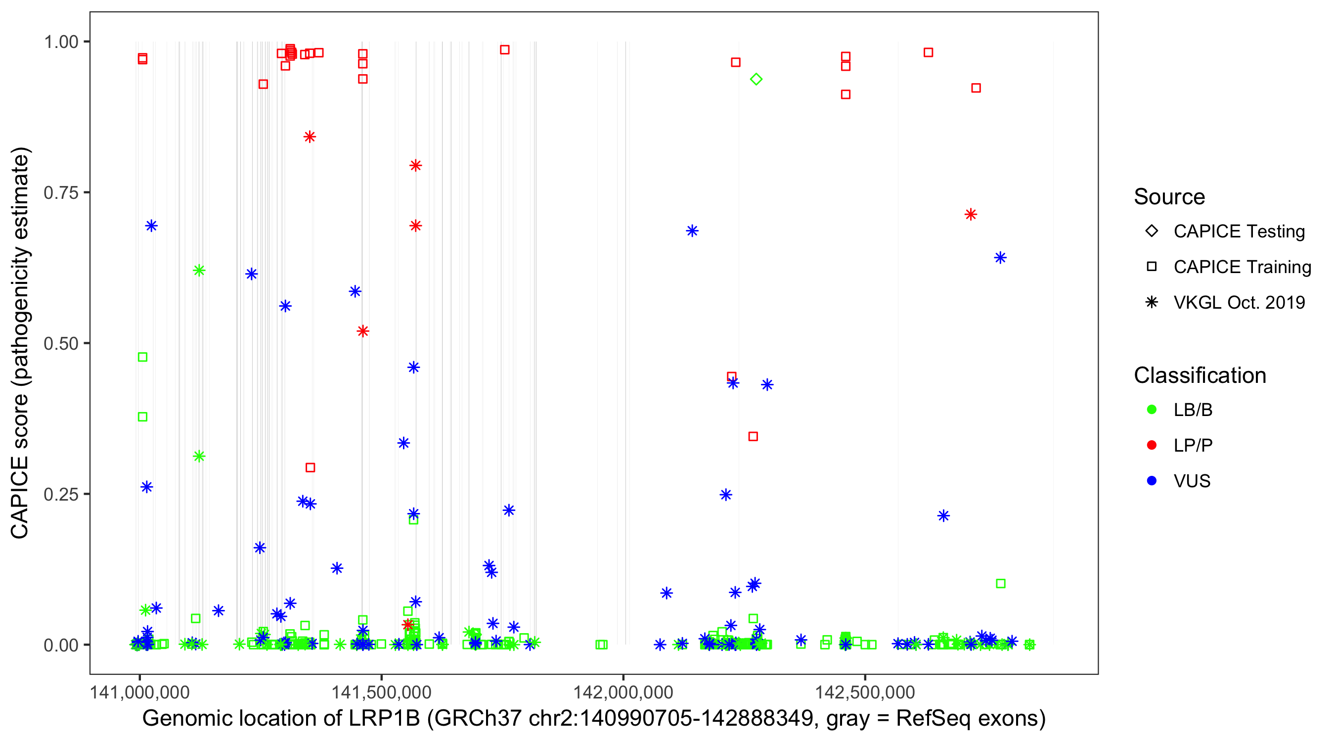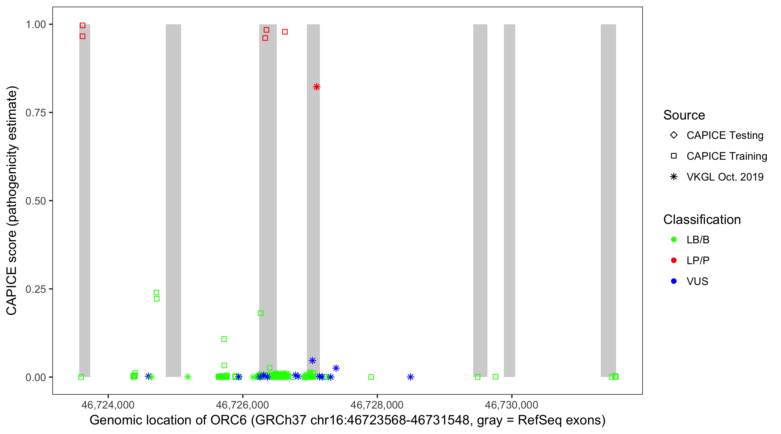 Shown are CAPICE train/test variants plus VKGL Oct 2019.