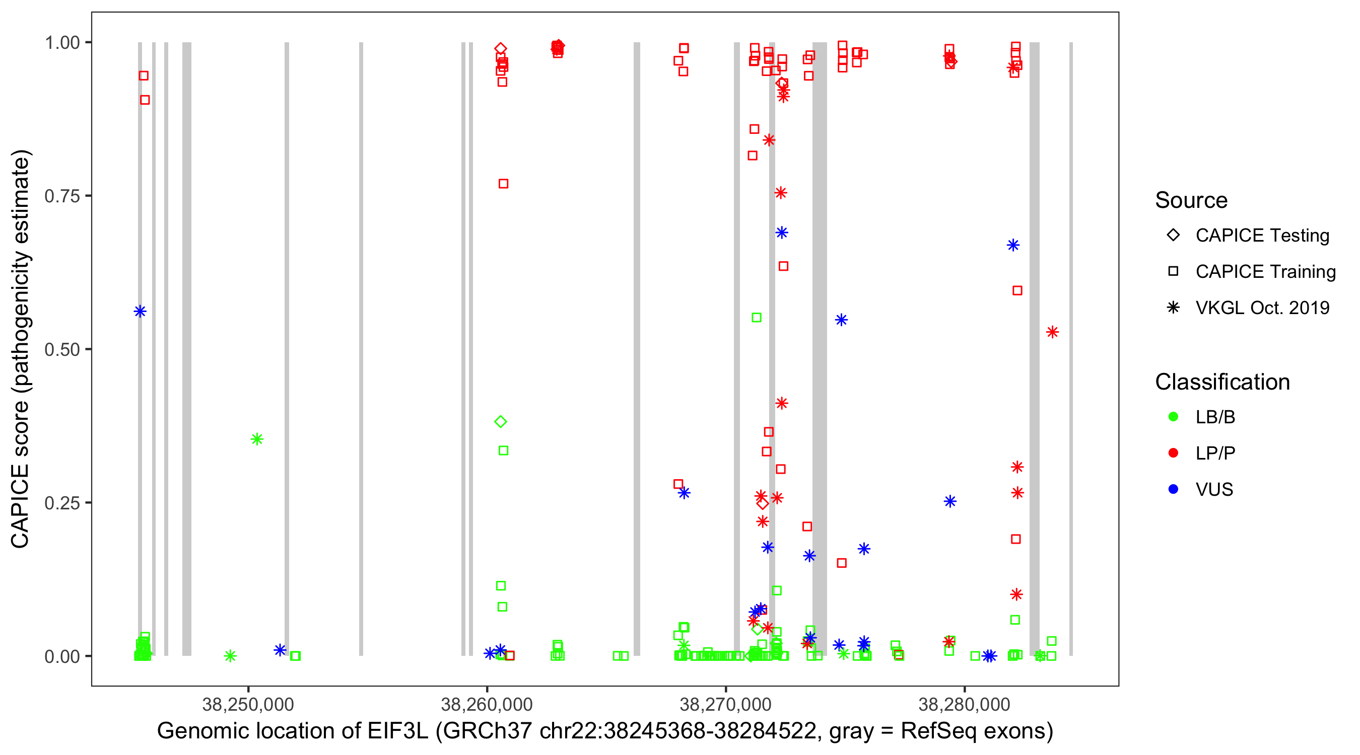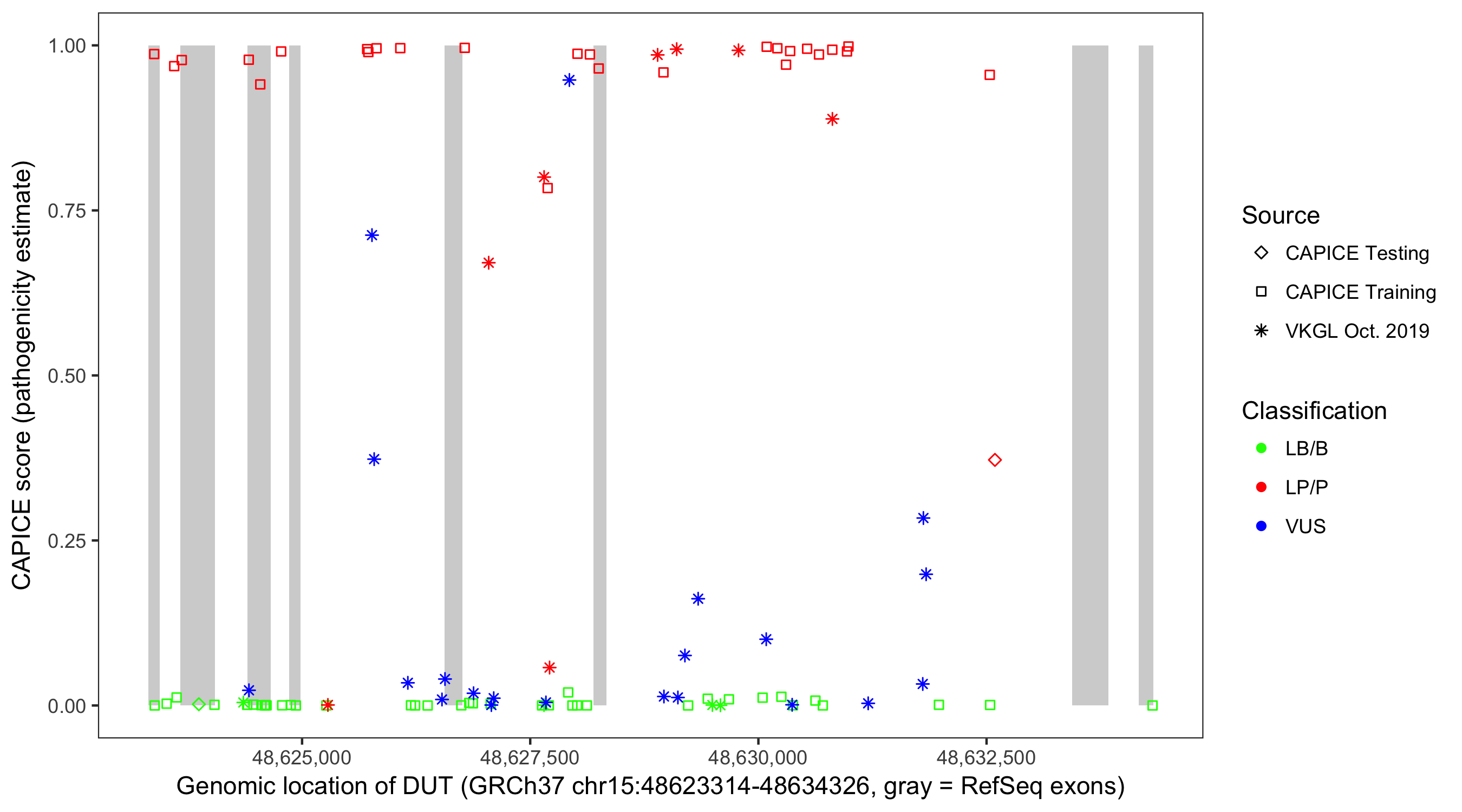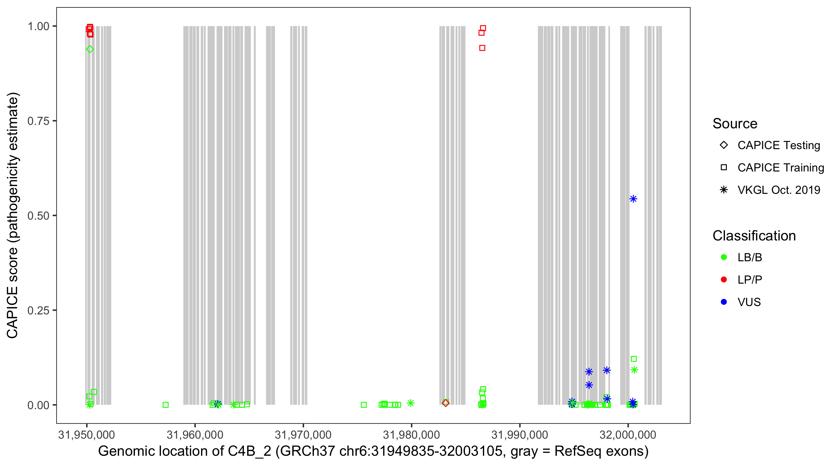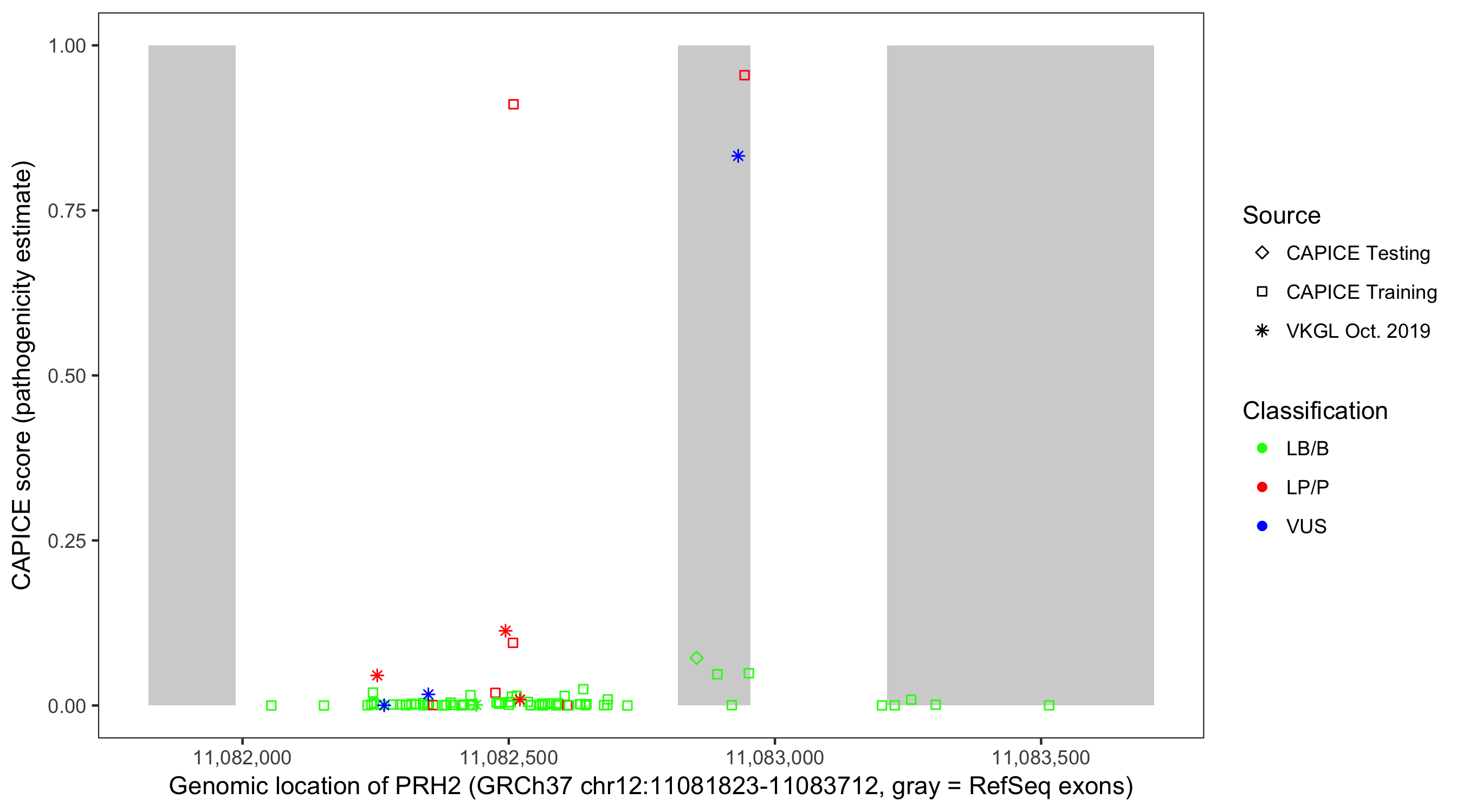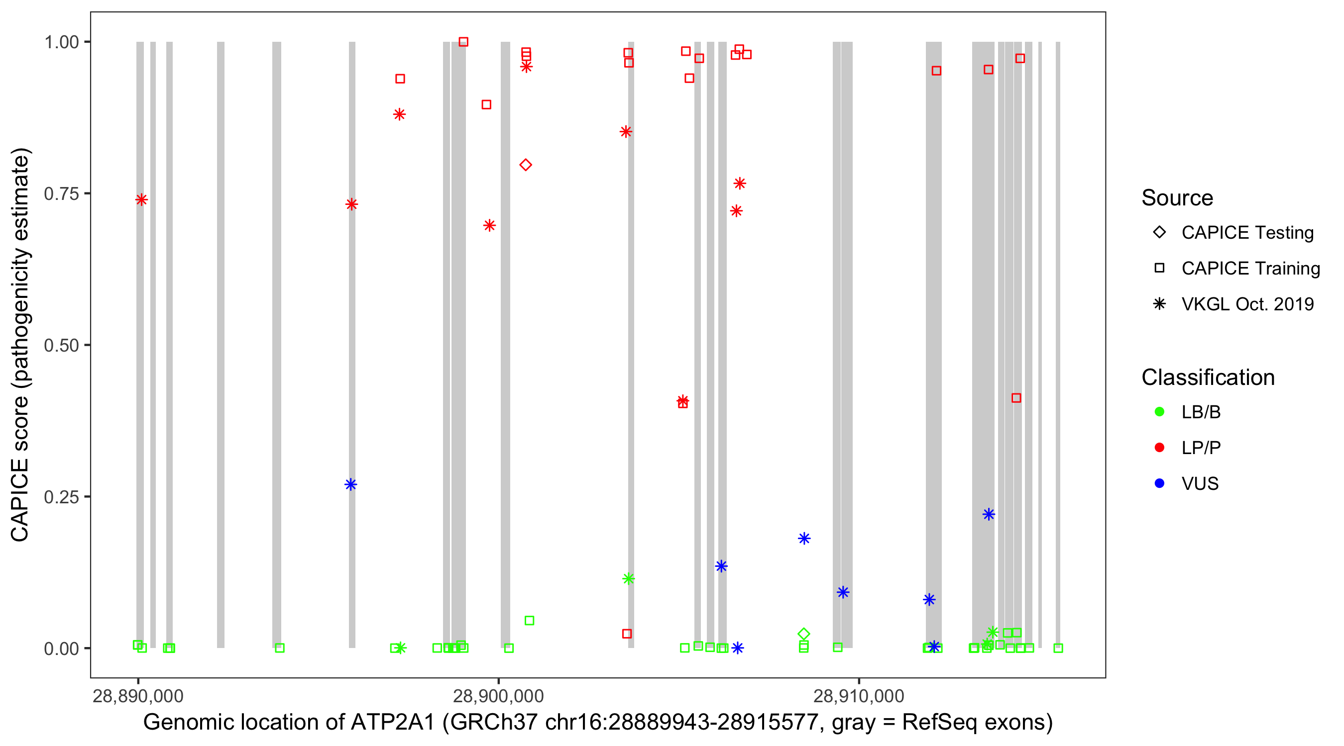 Shown are CAPICE train/test variants plus VKGL Oct 2019.