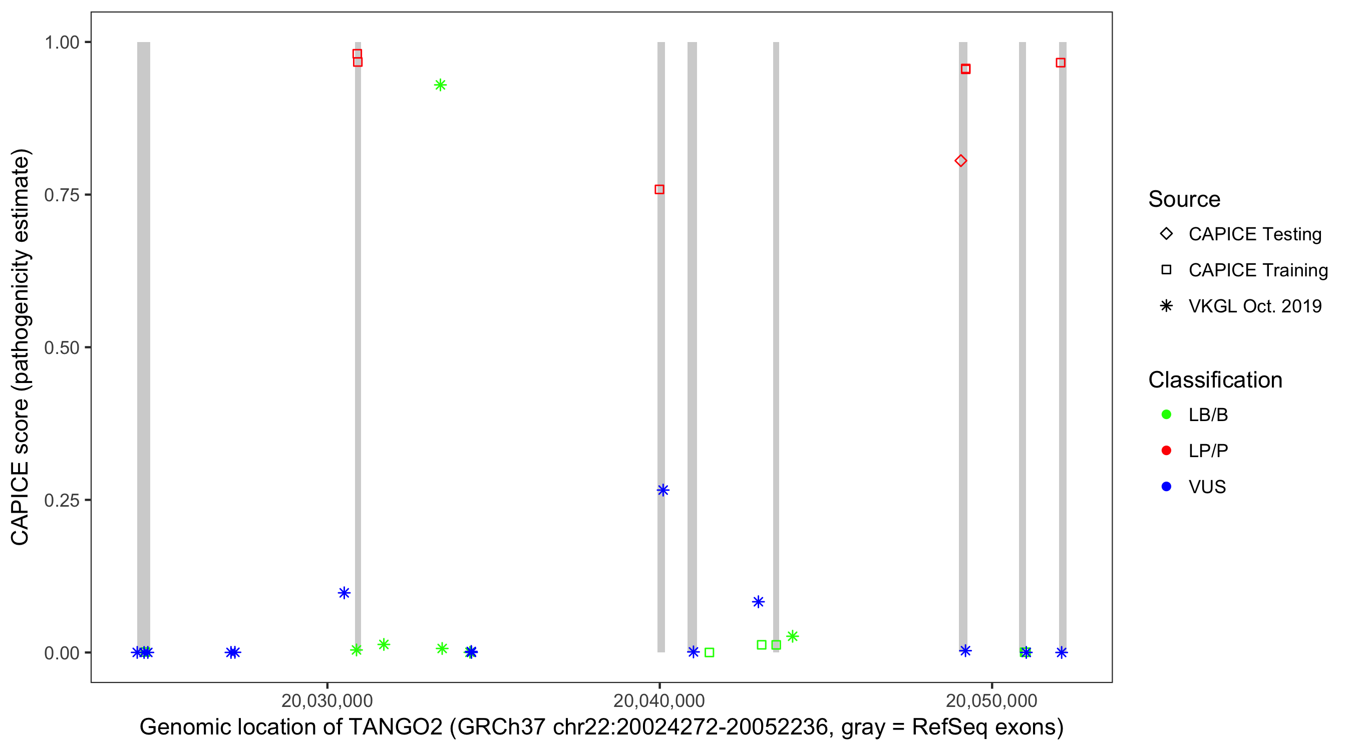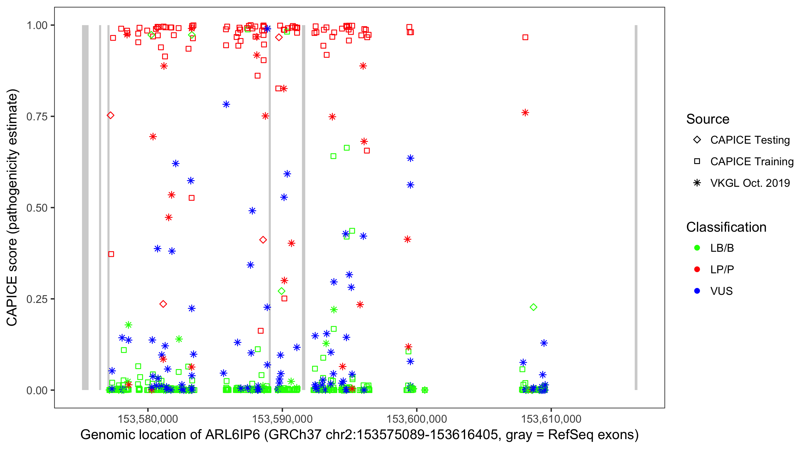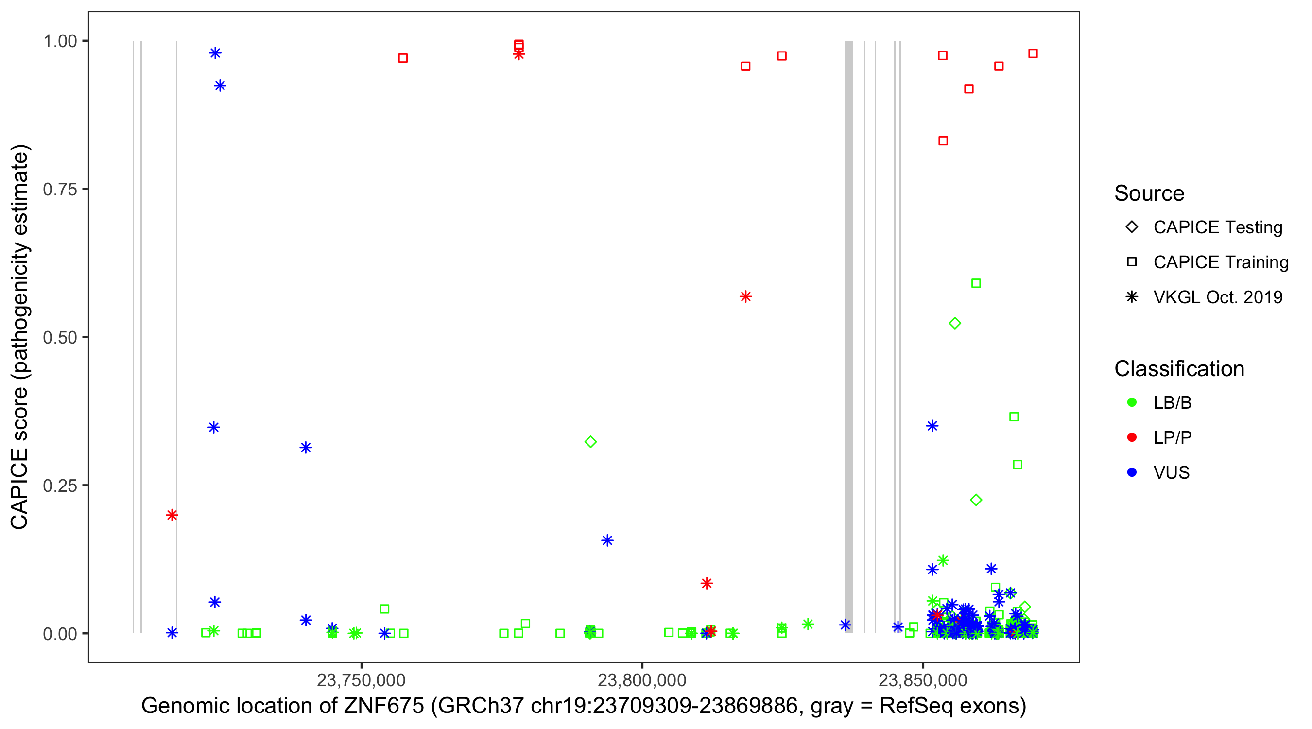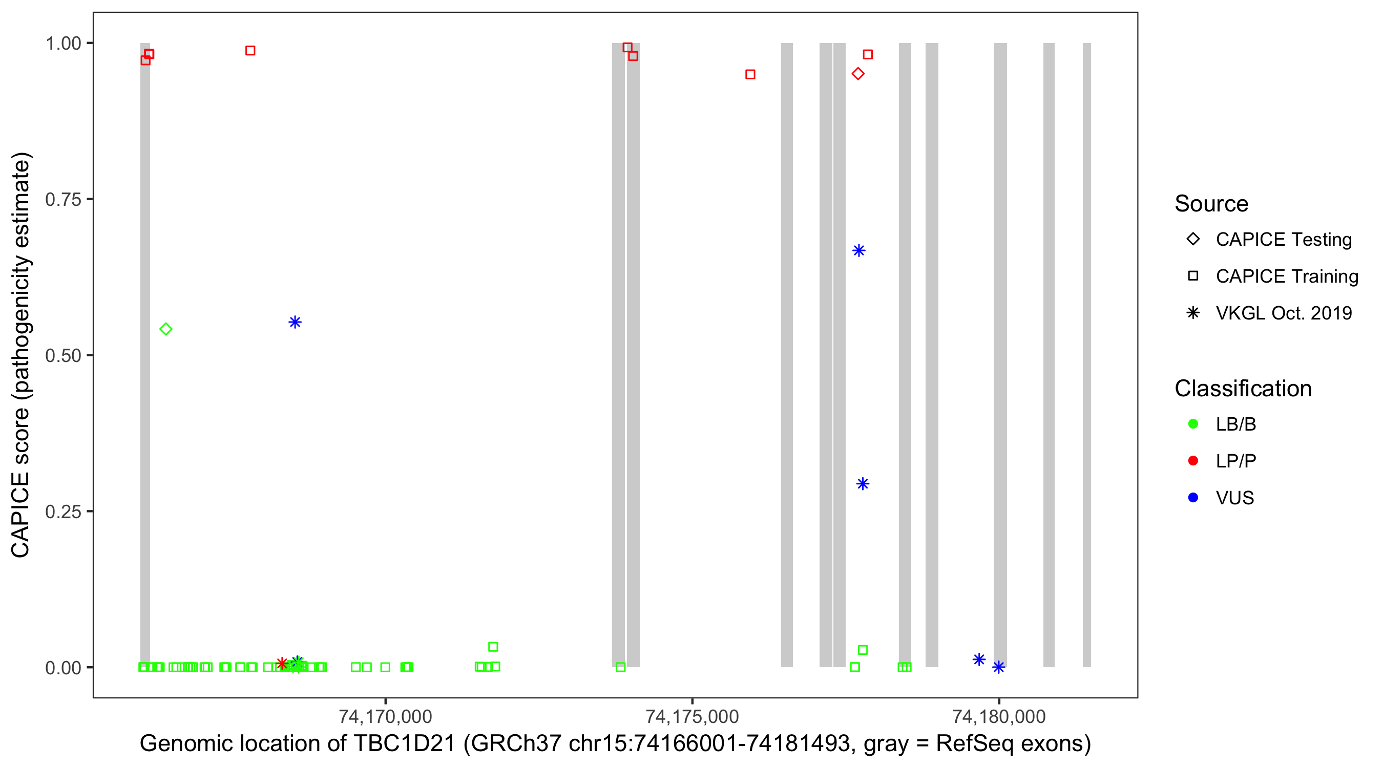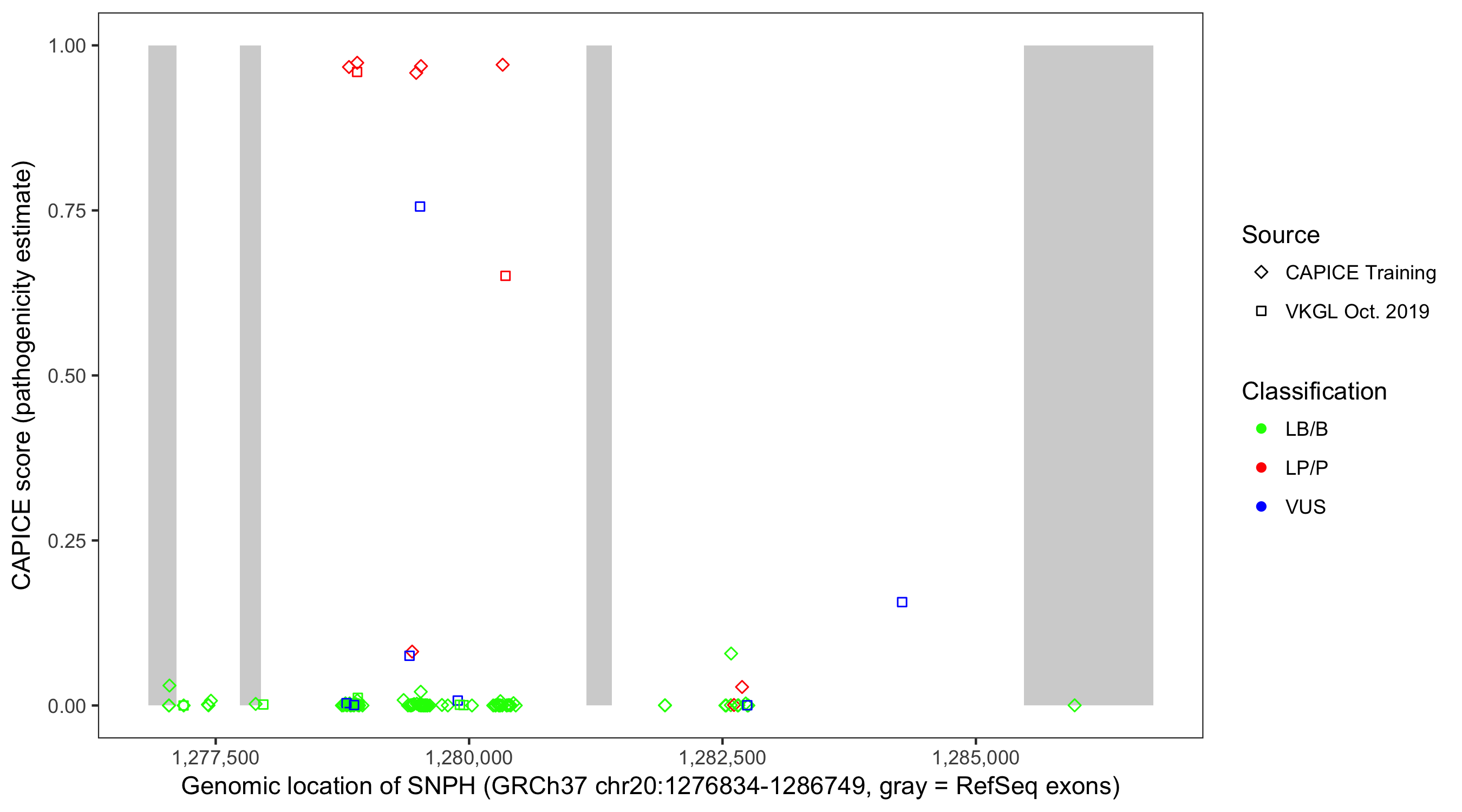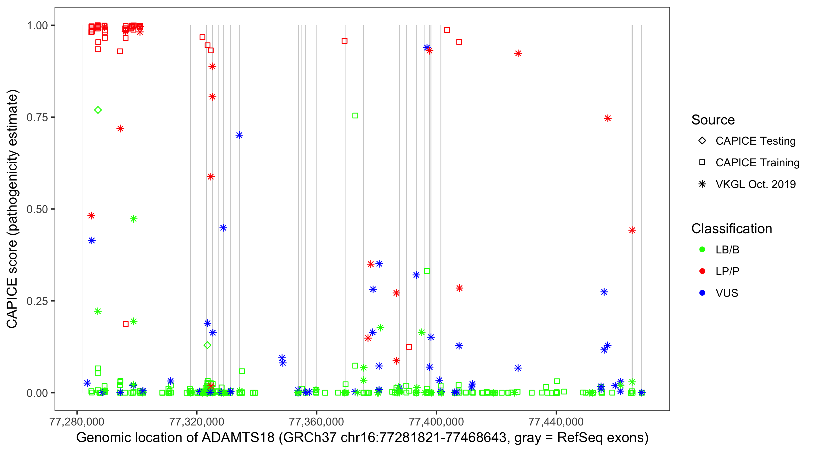 Shown are CAPICE train/test variants plus VKGL Oct 2019.