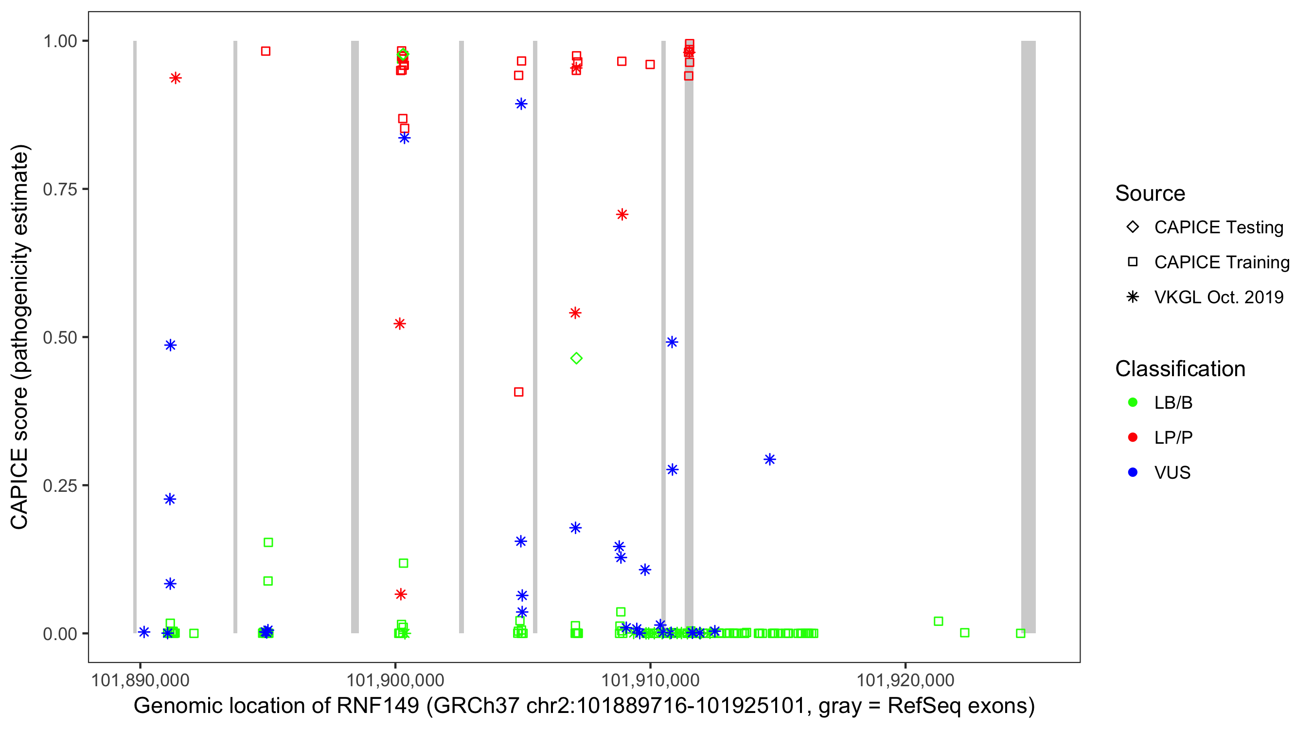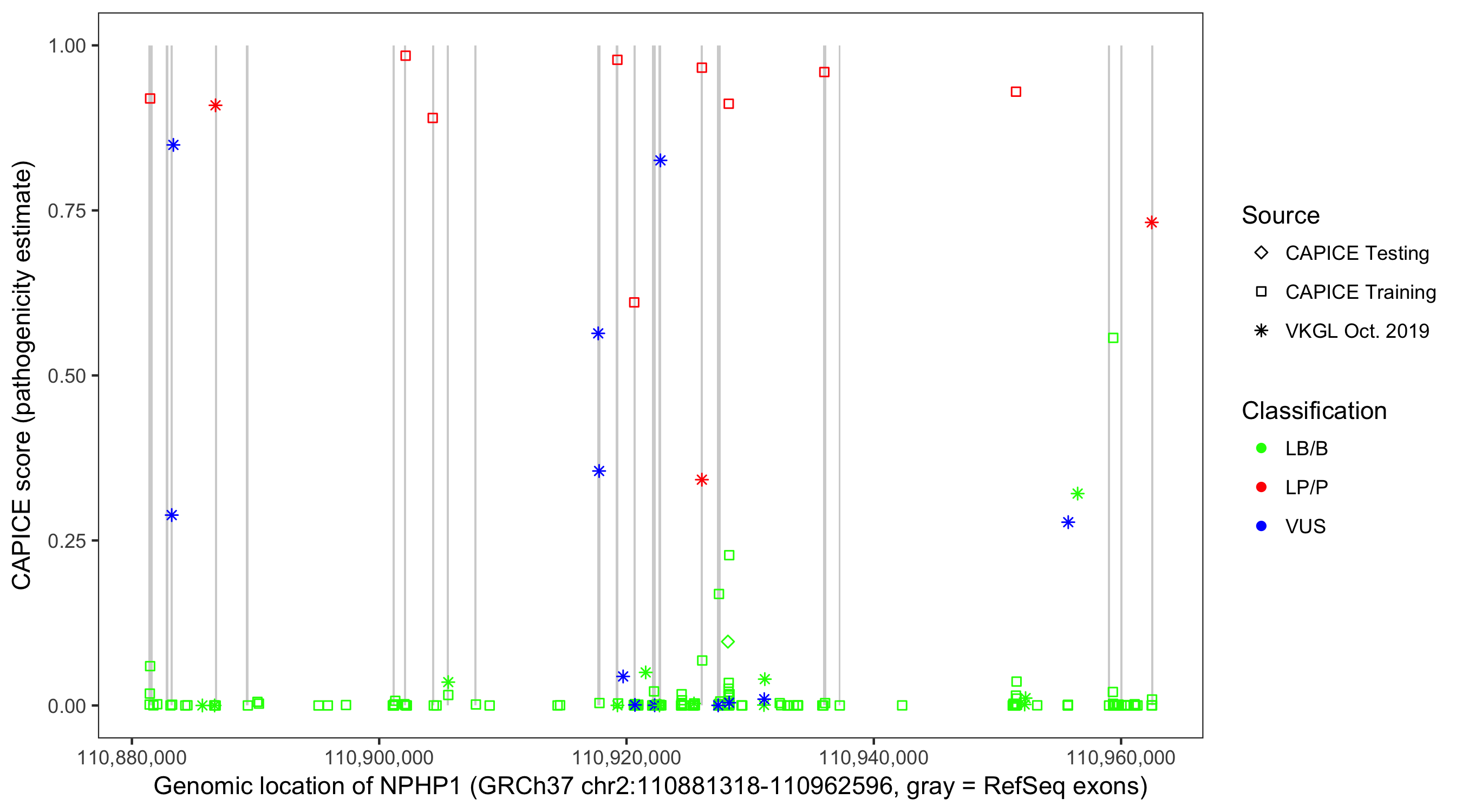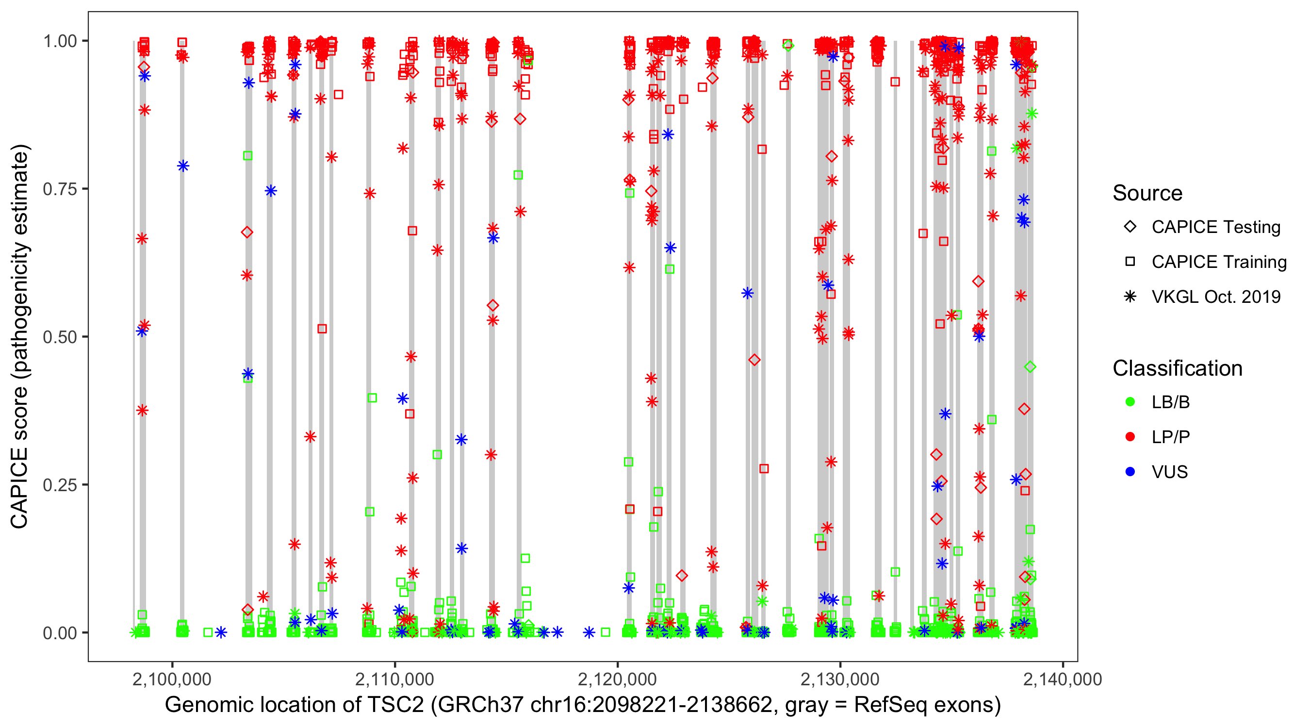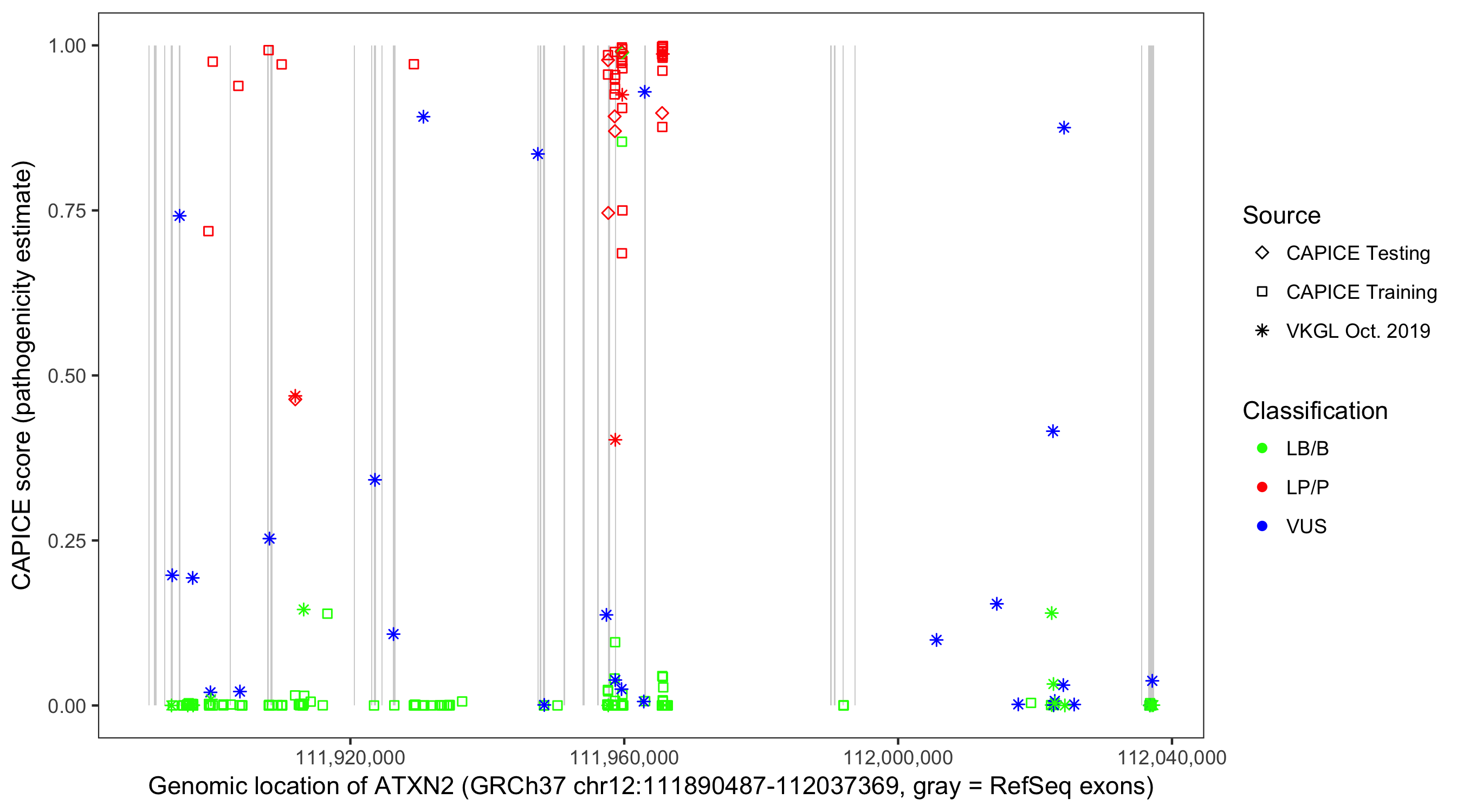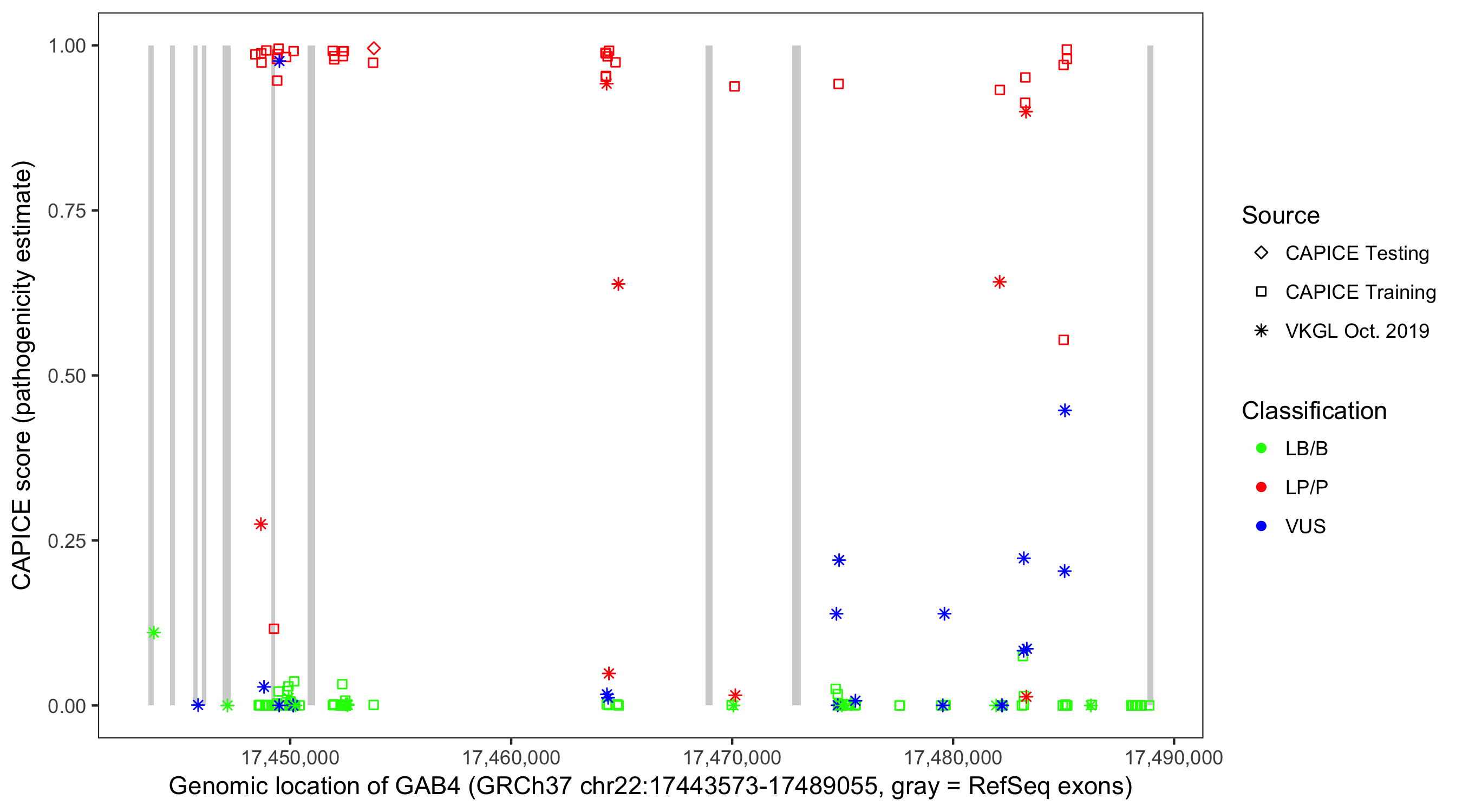 Shown are CAPICE train/test variants plus VKGL Oct 2019.
