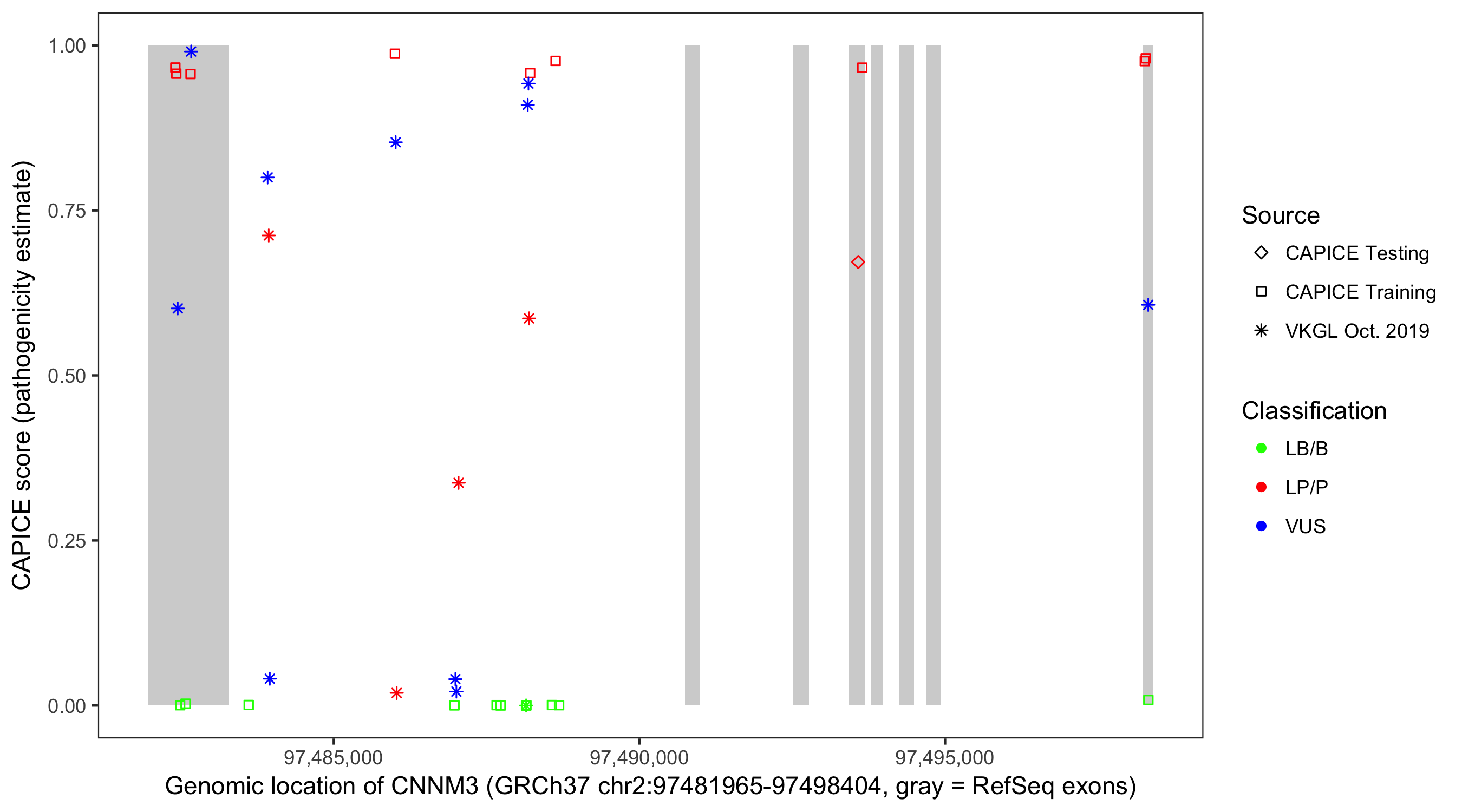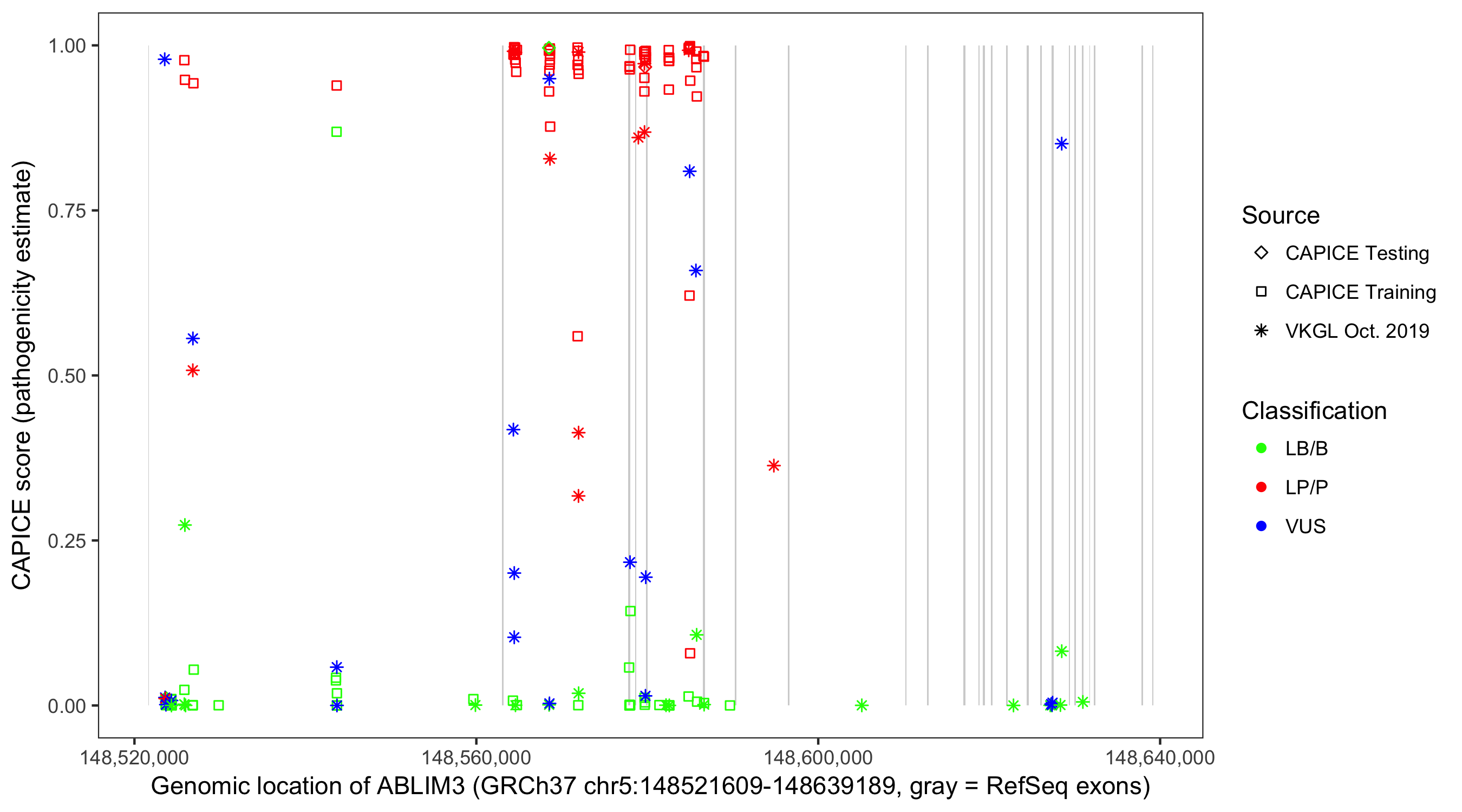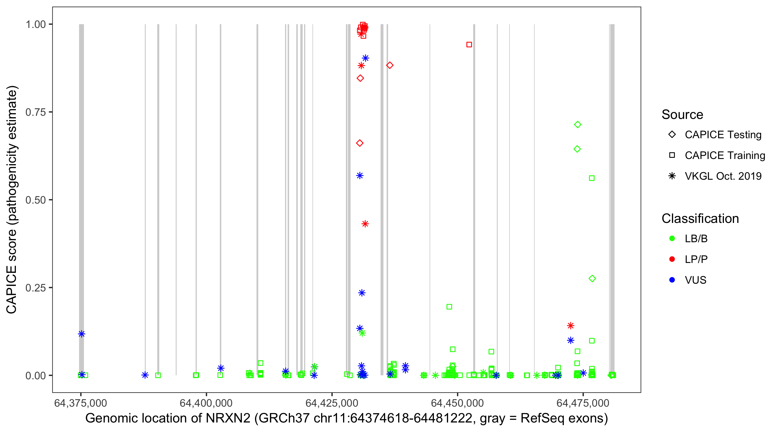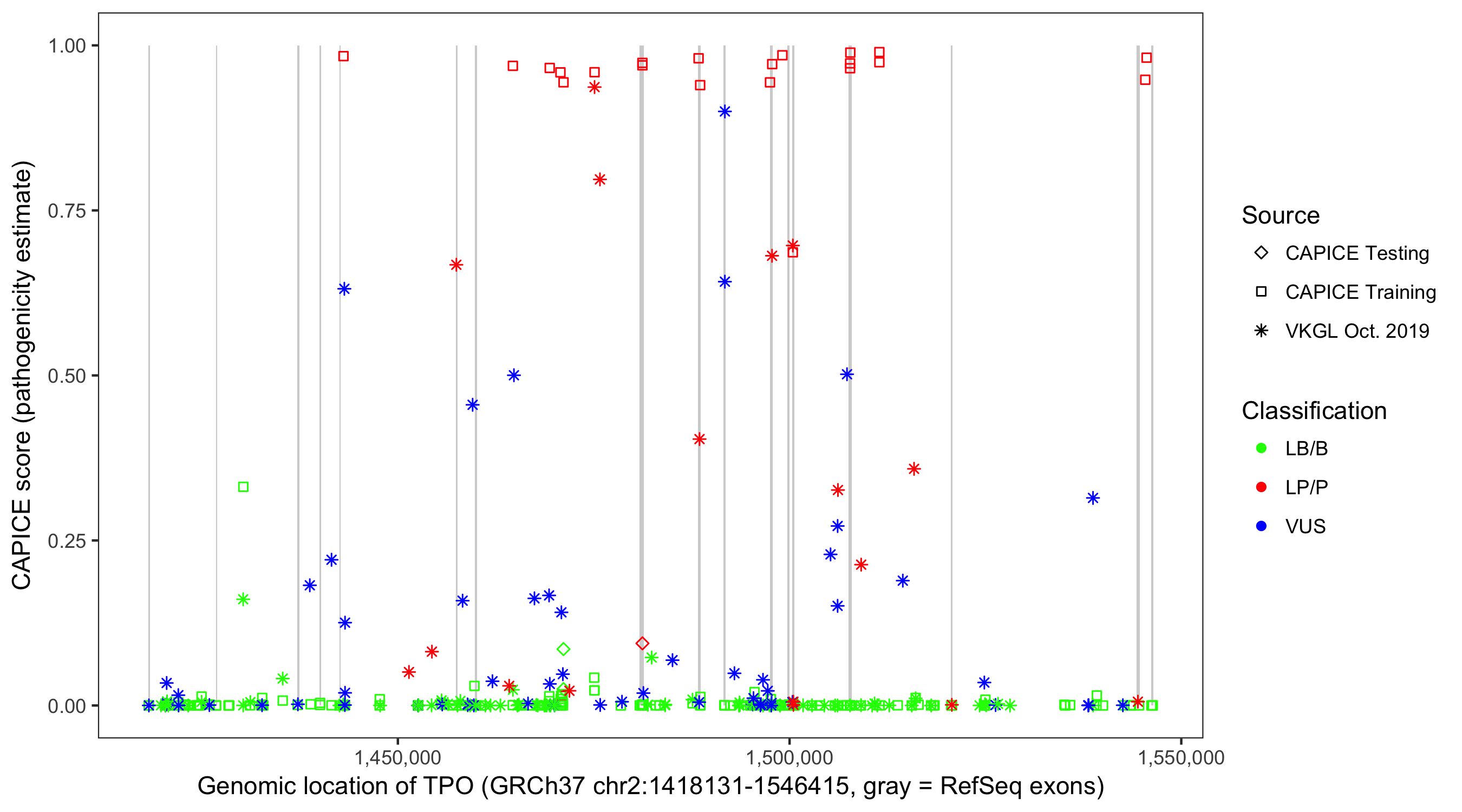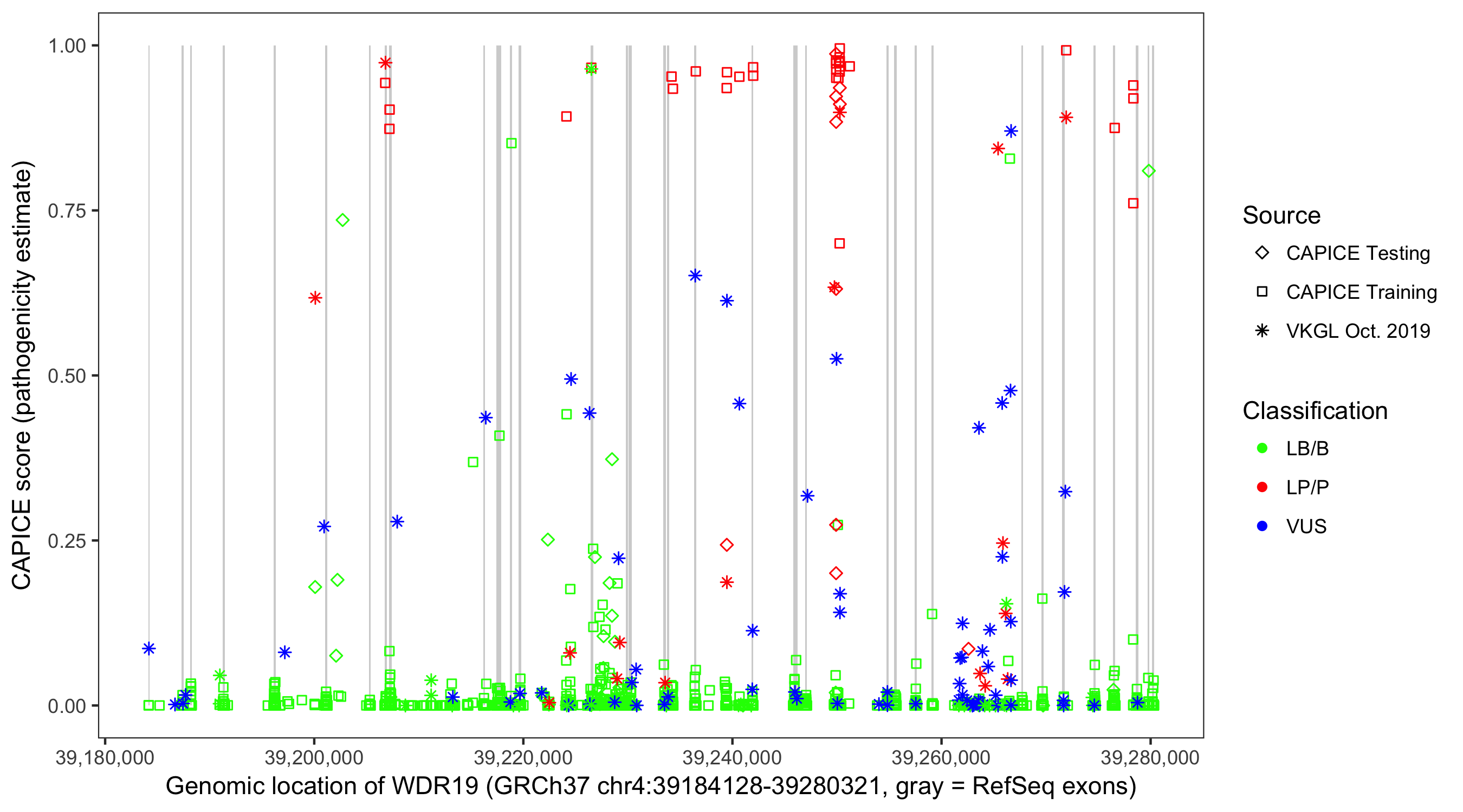 Shown are CAPICE train/test variants plus VKGL Oct 2019.