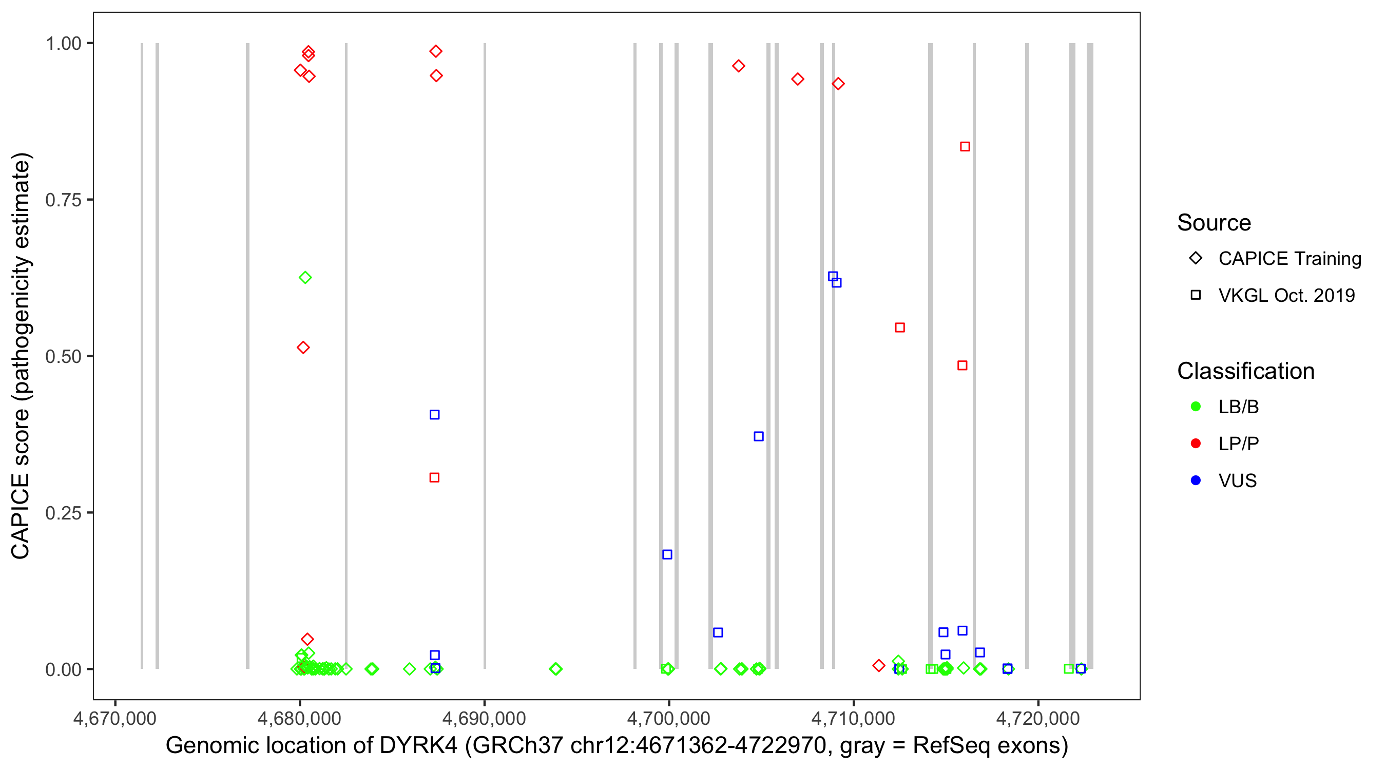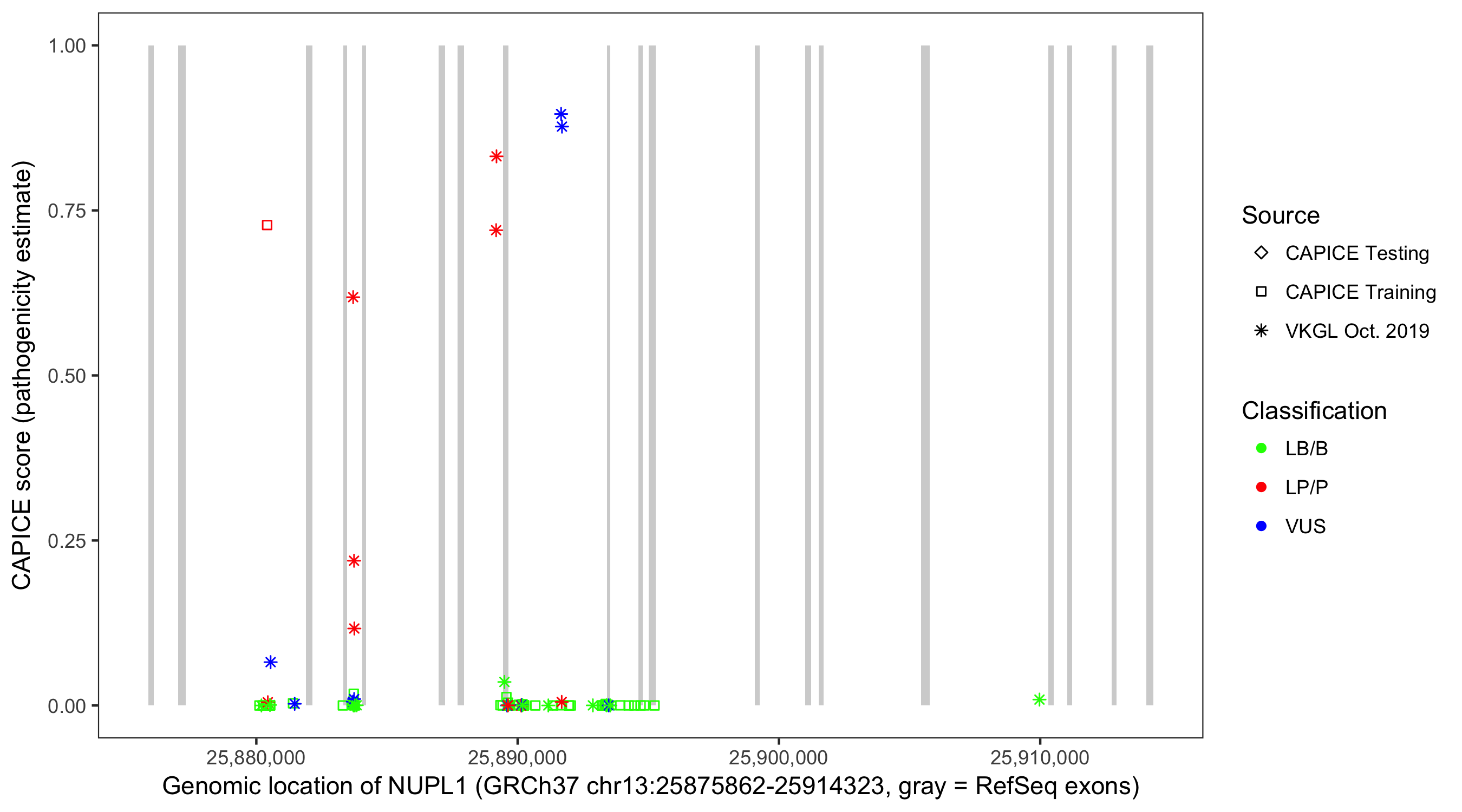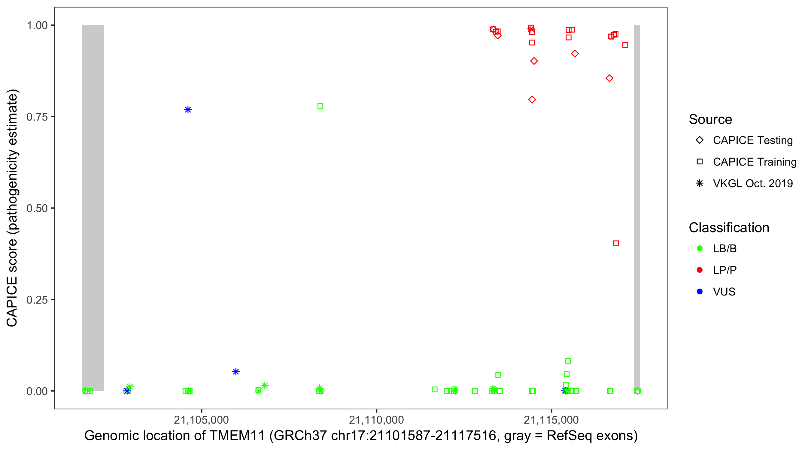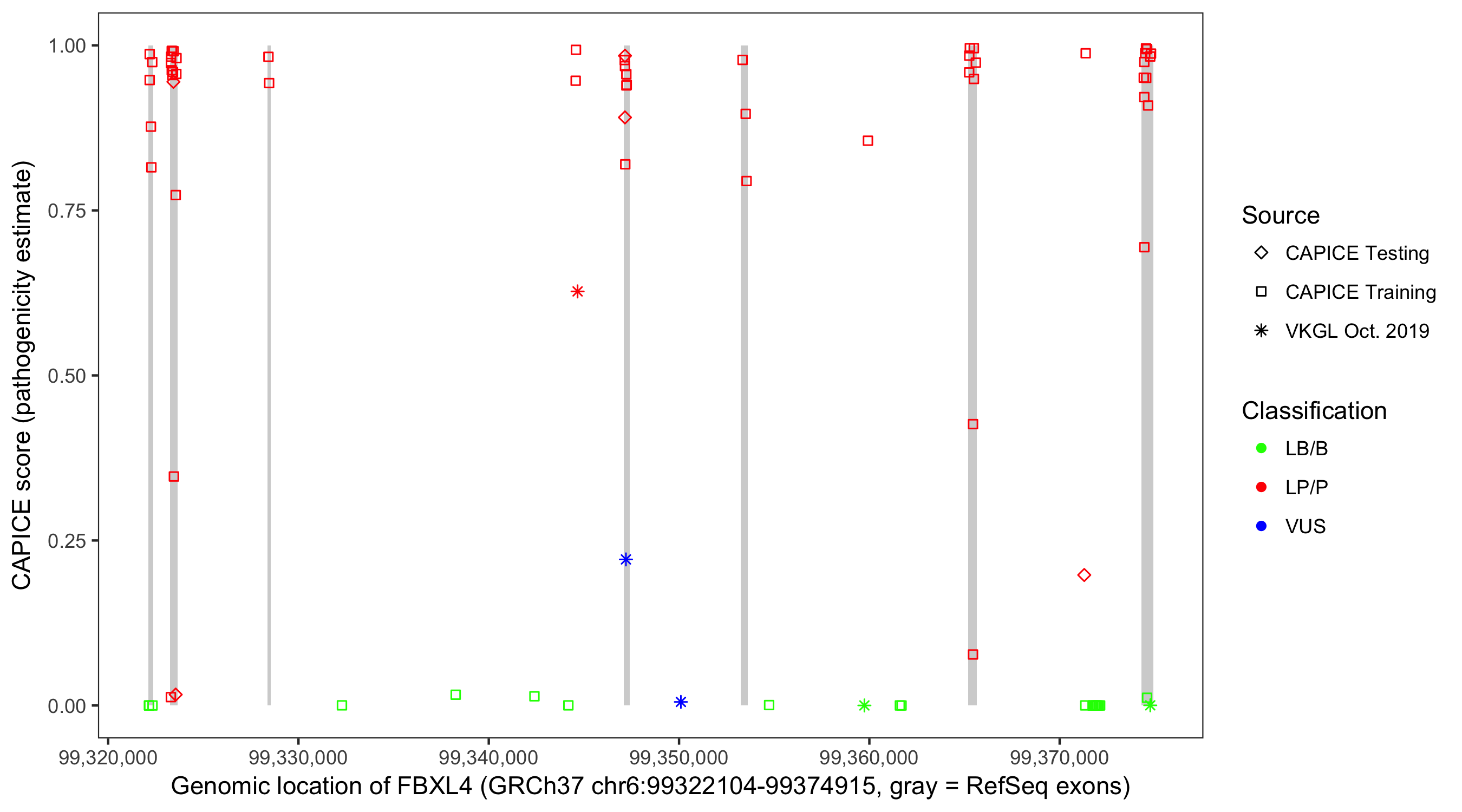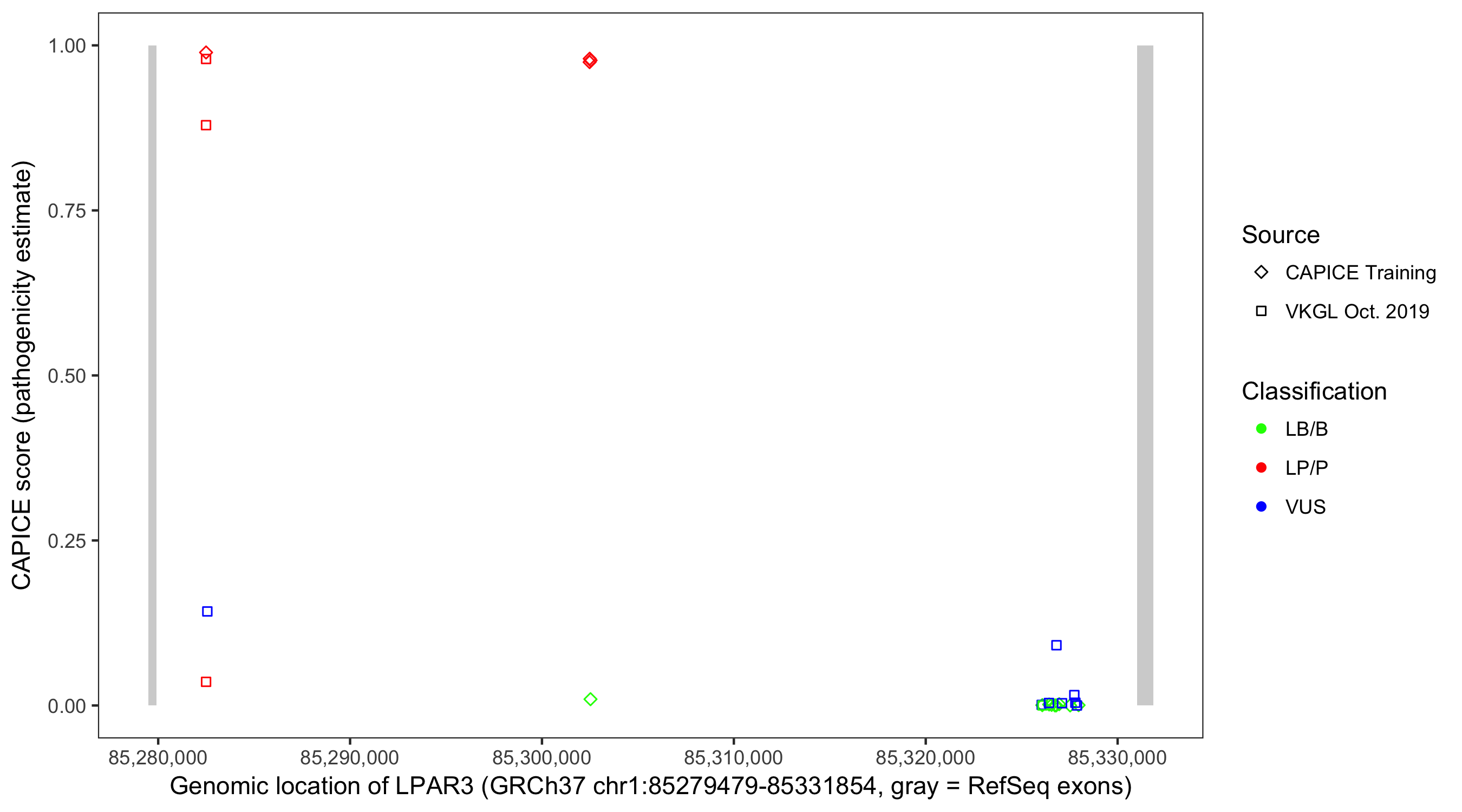 Shown are CAPICE train/test variants plus VKGL Oct 2019.