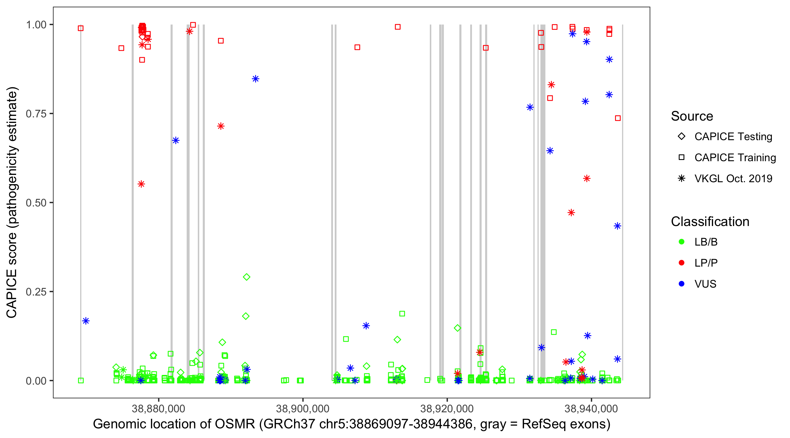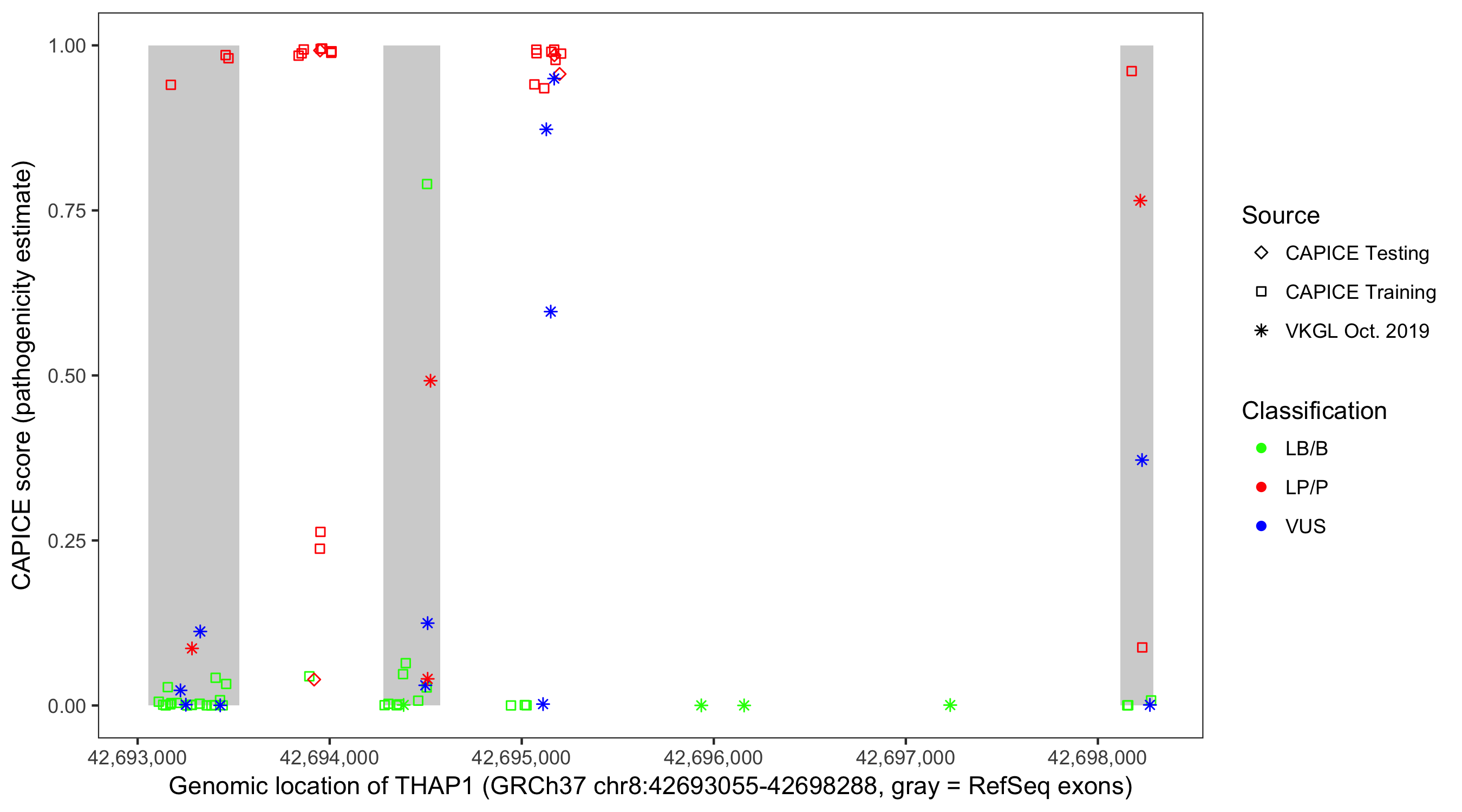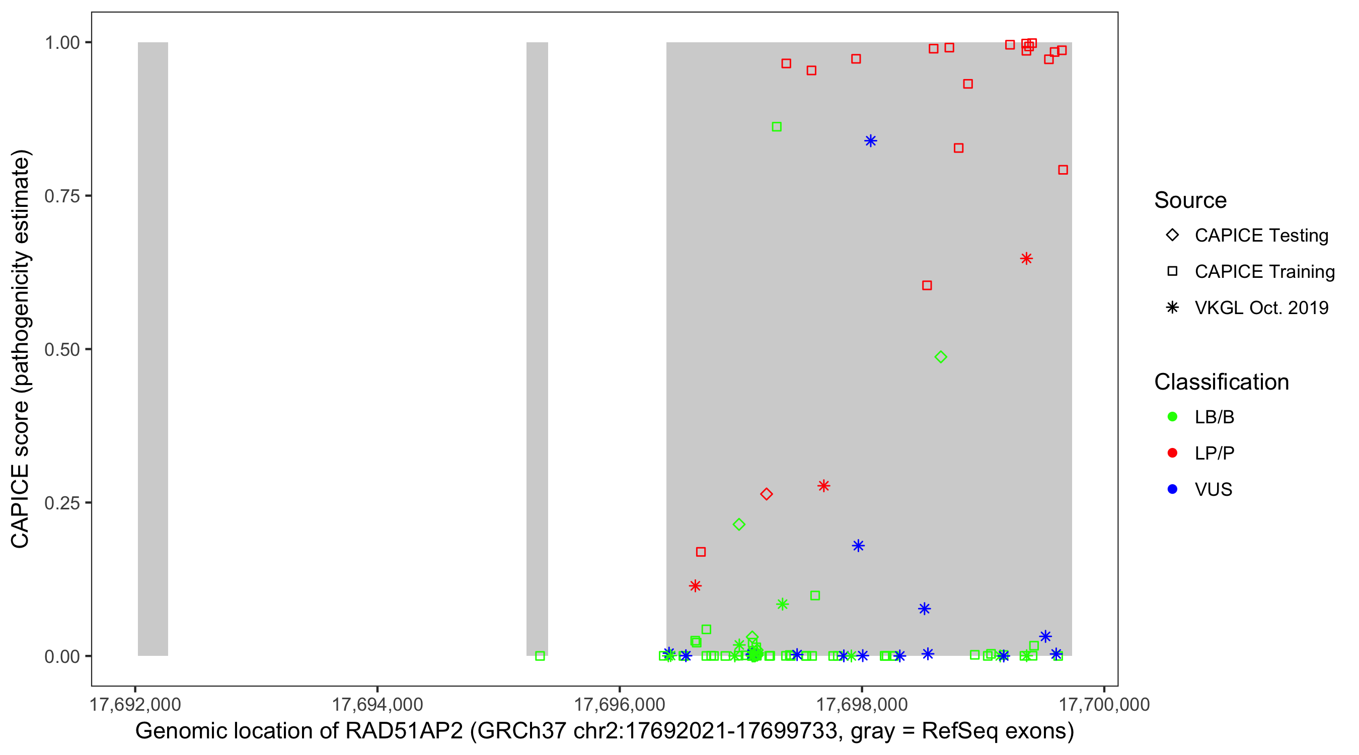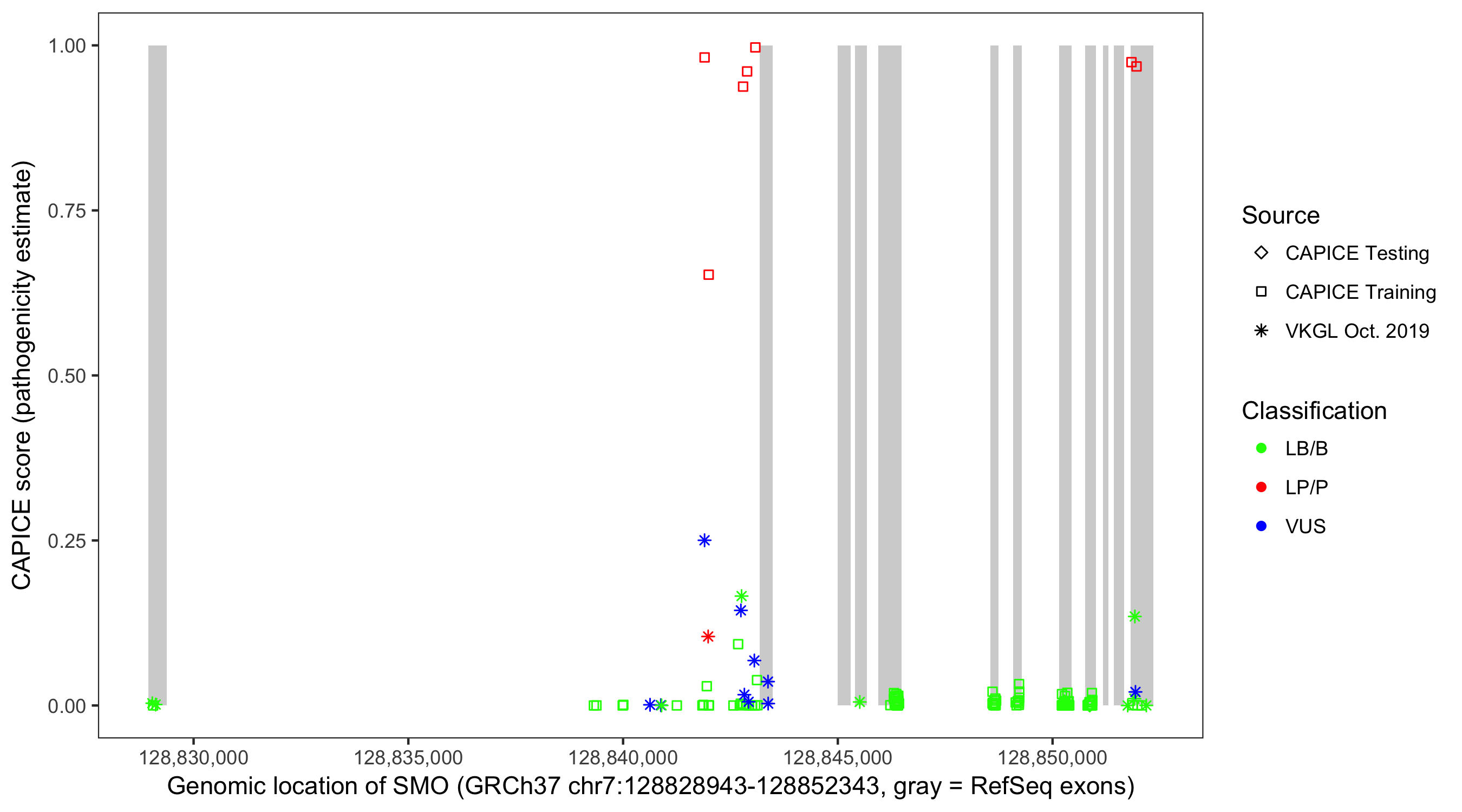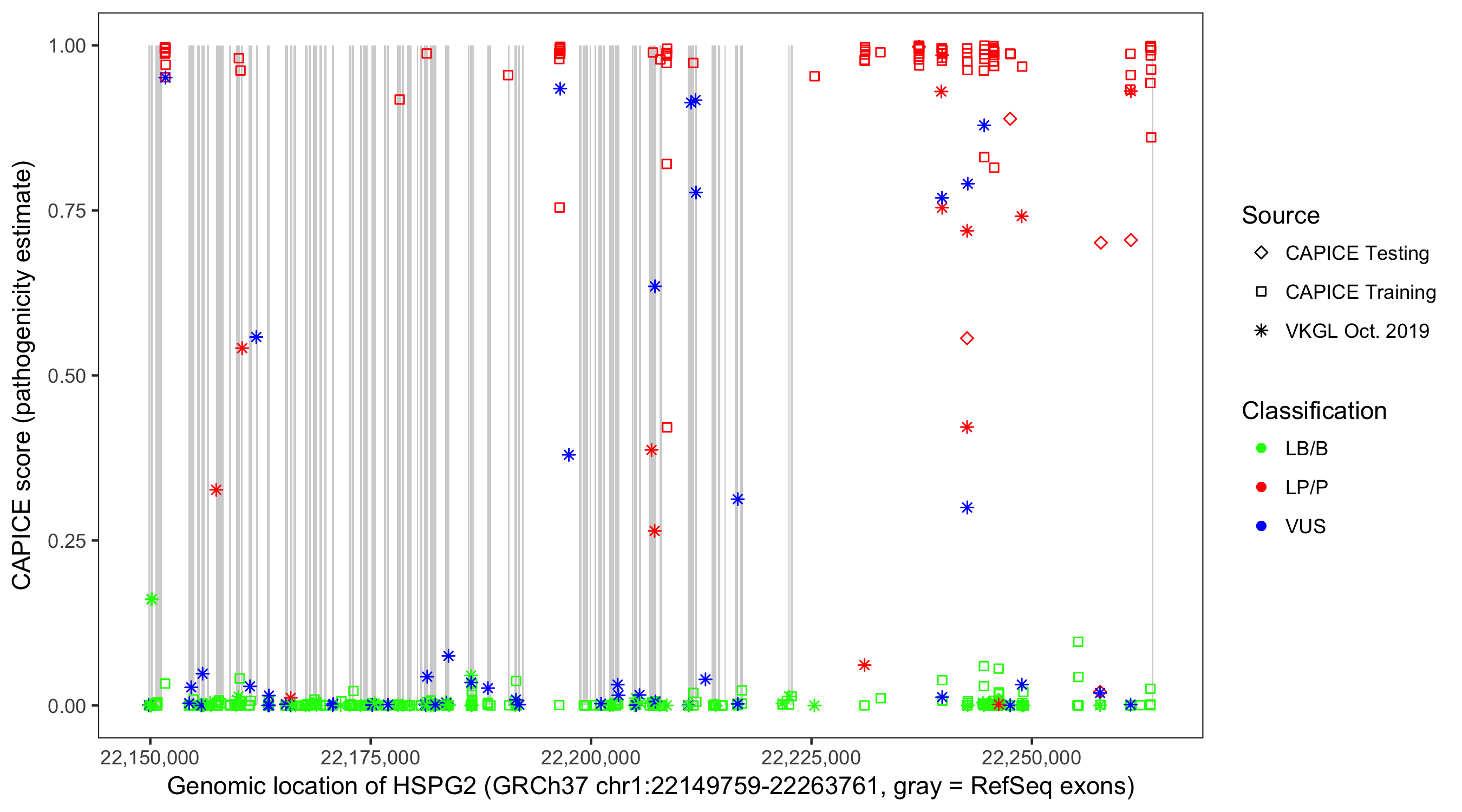 Shown are CAPICE train/test variants plus VKGL Oct 2019.
