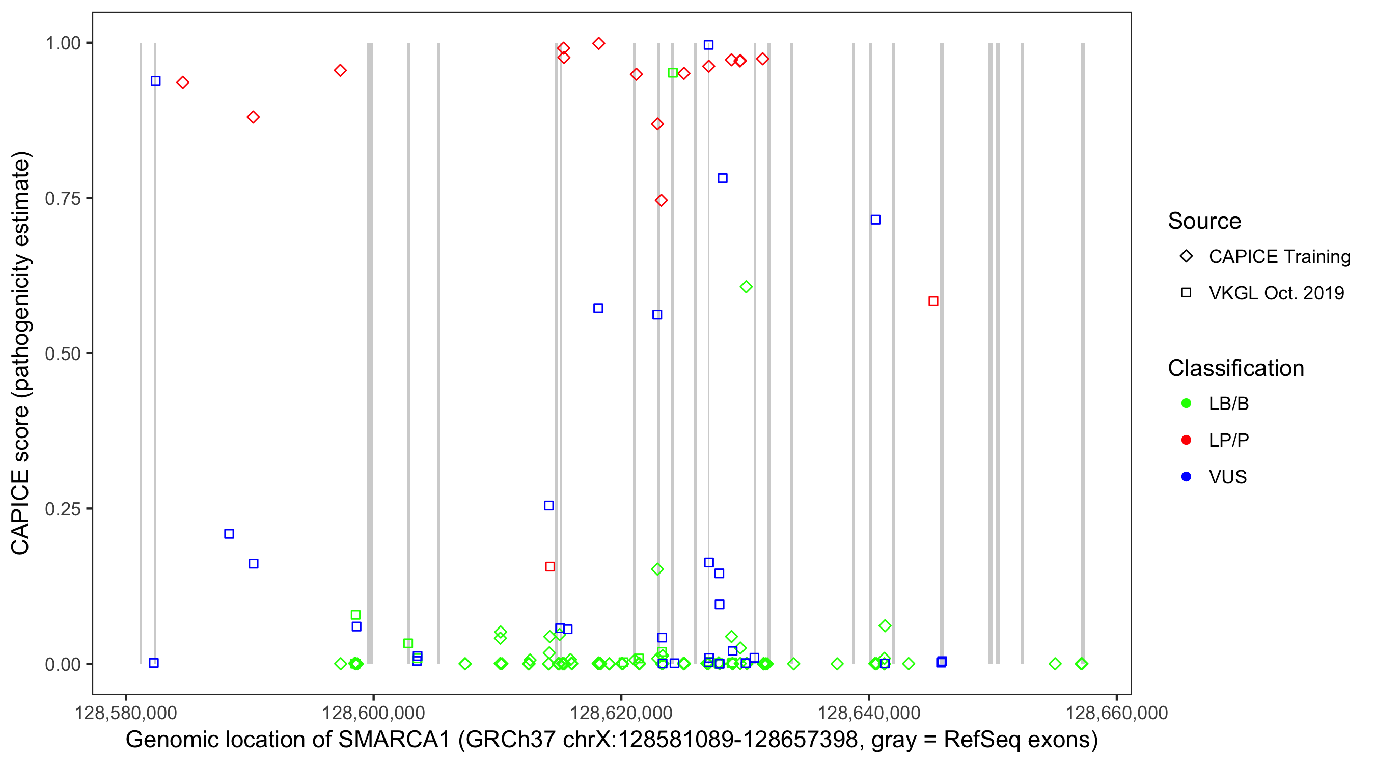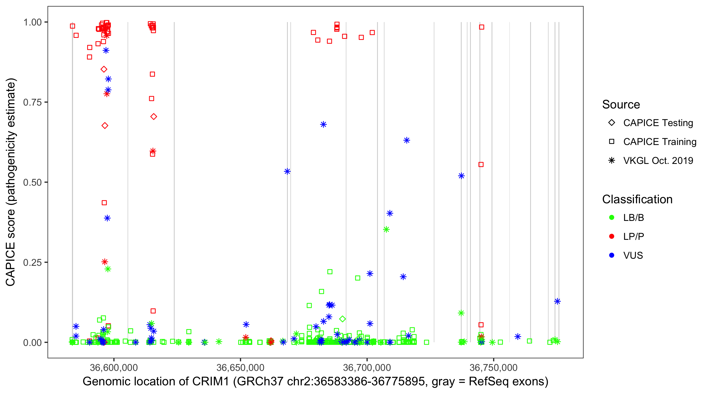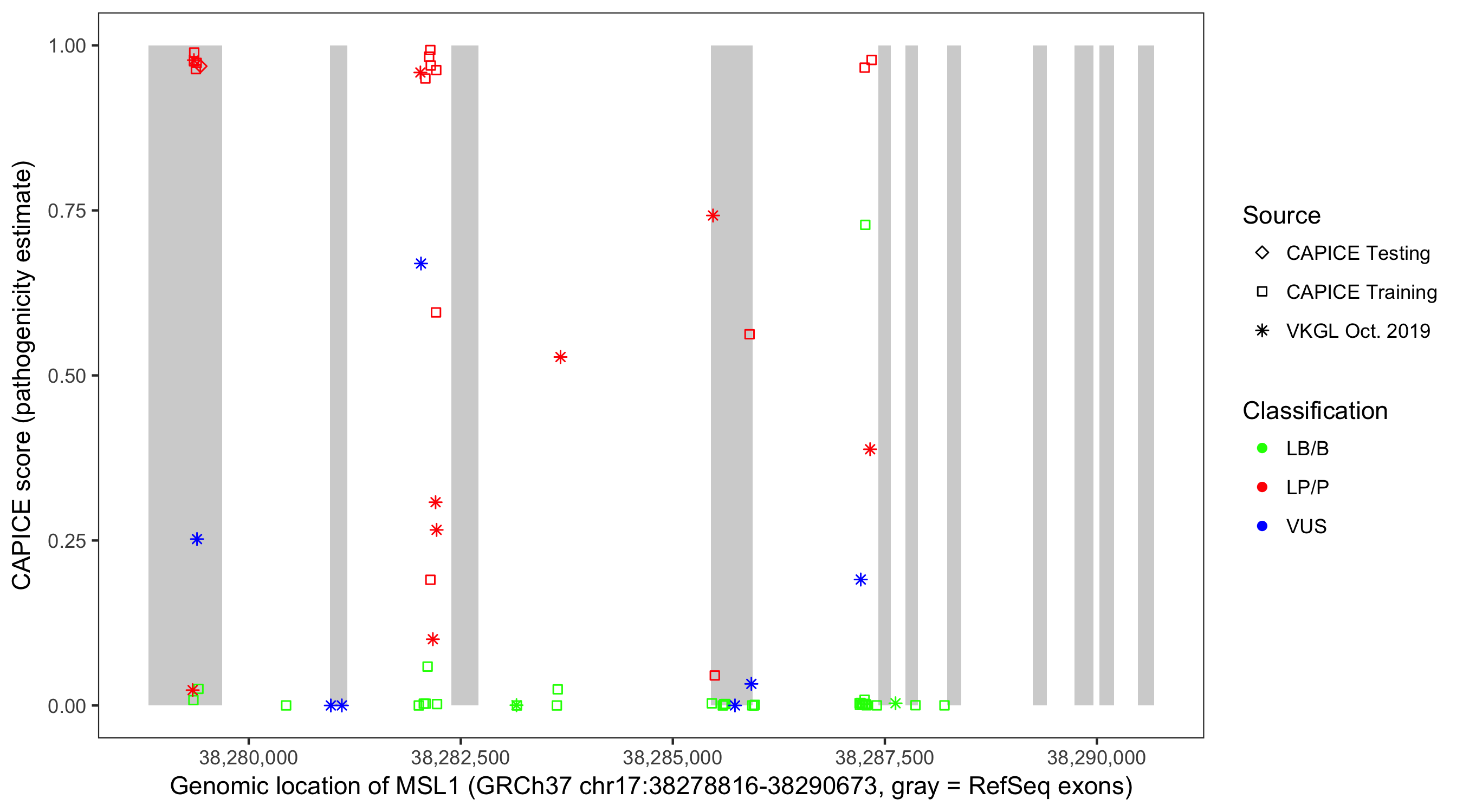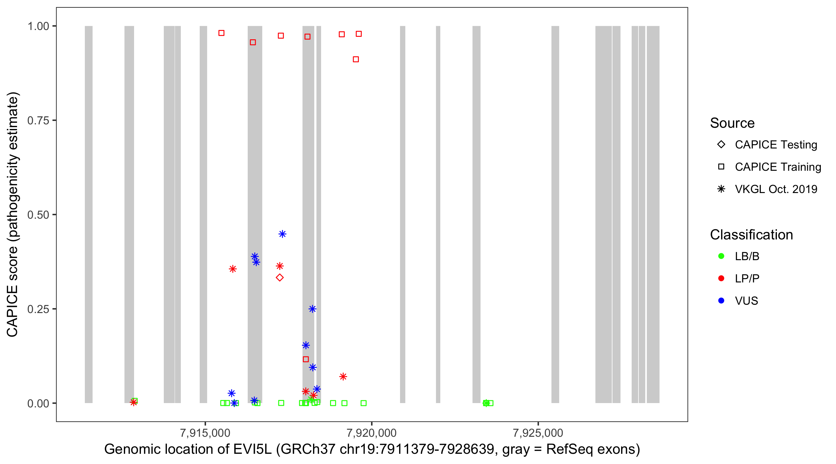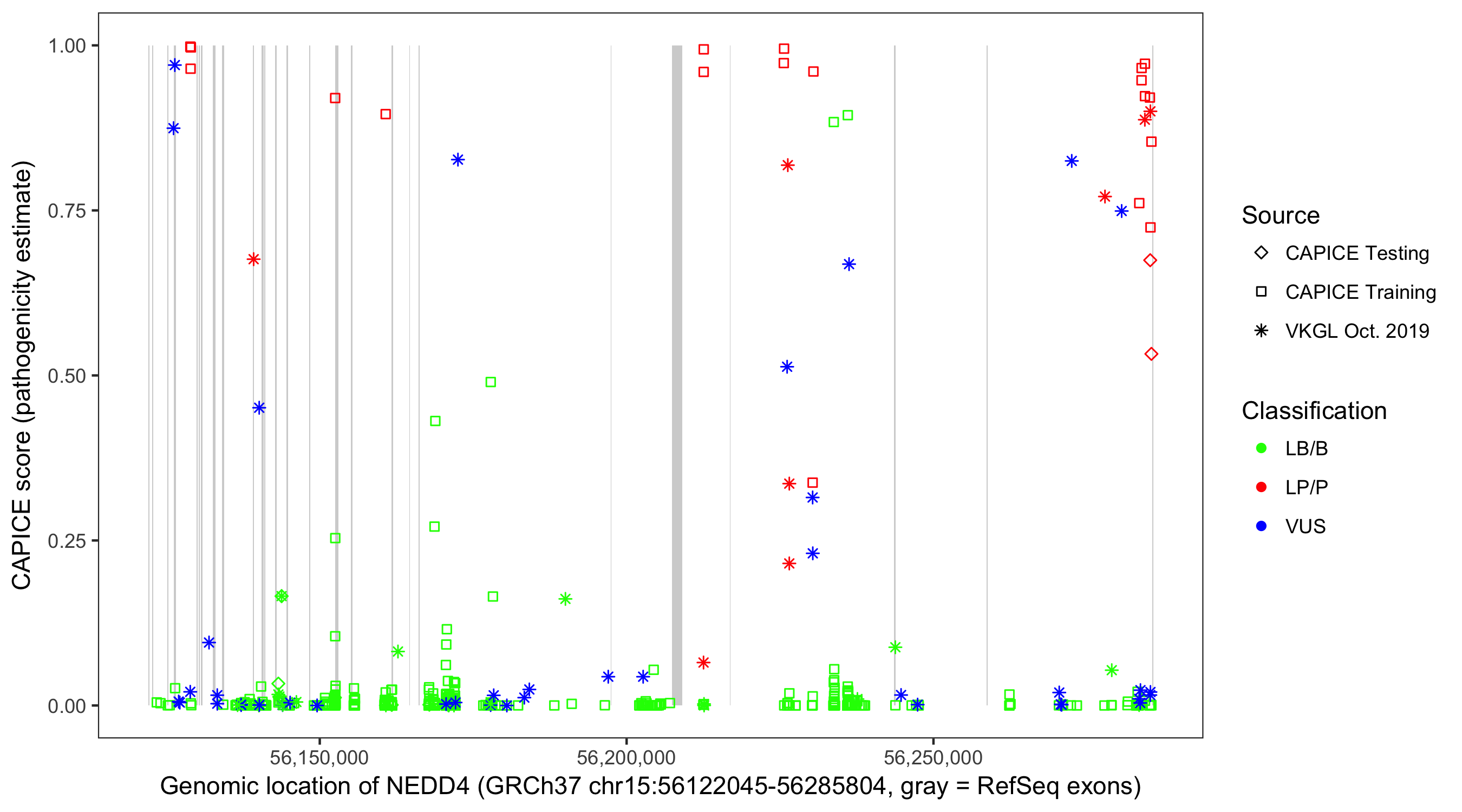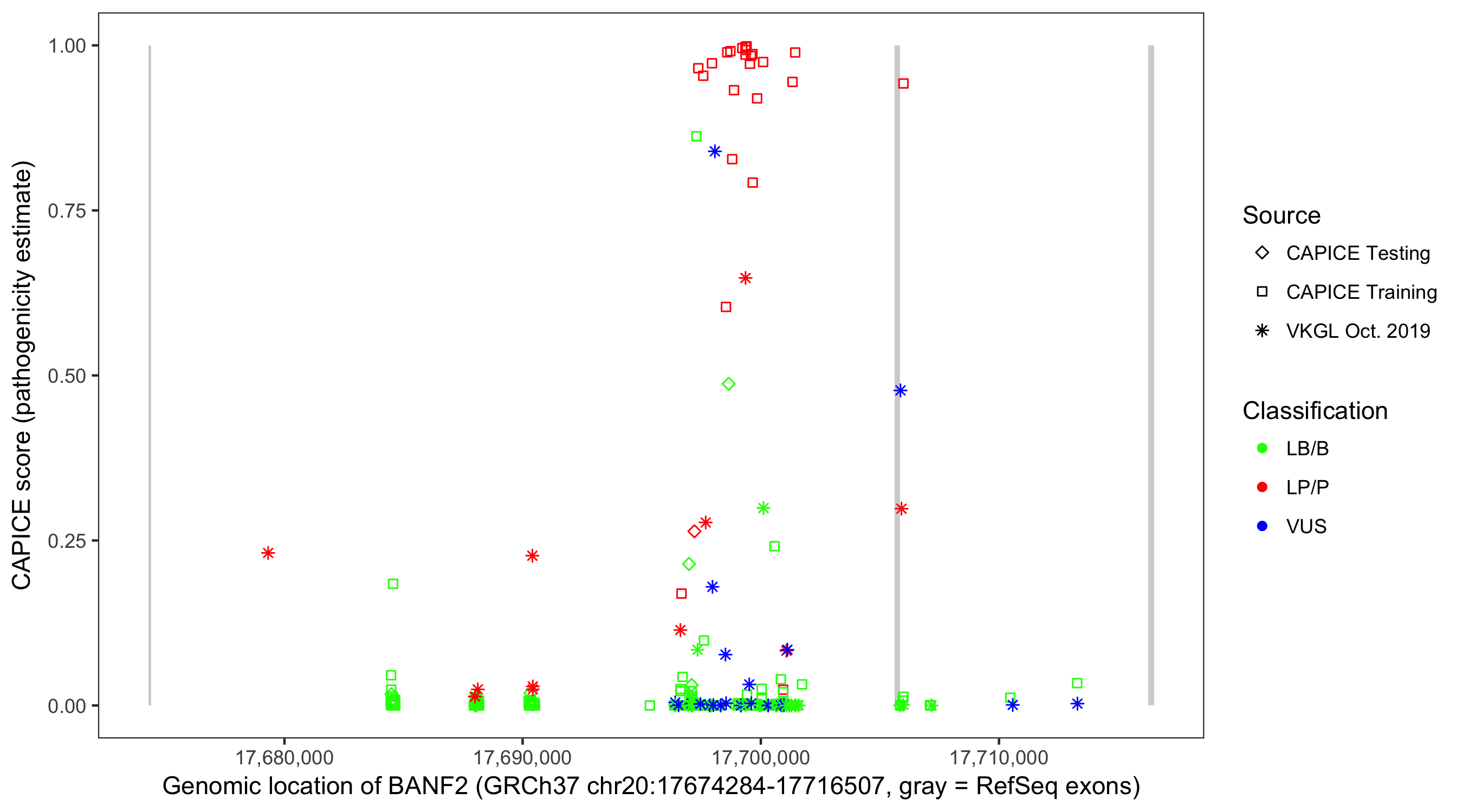 Shown are CAPICE train/test variants plus VKGL Oct 2019.