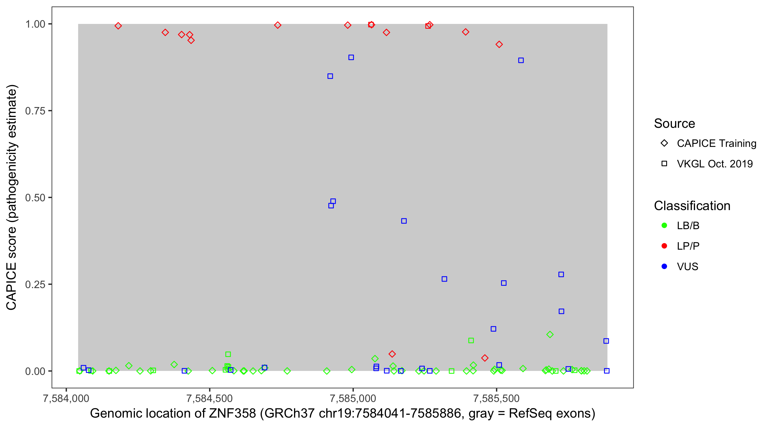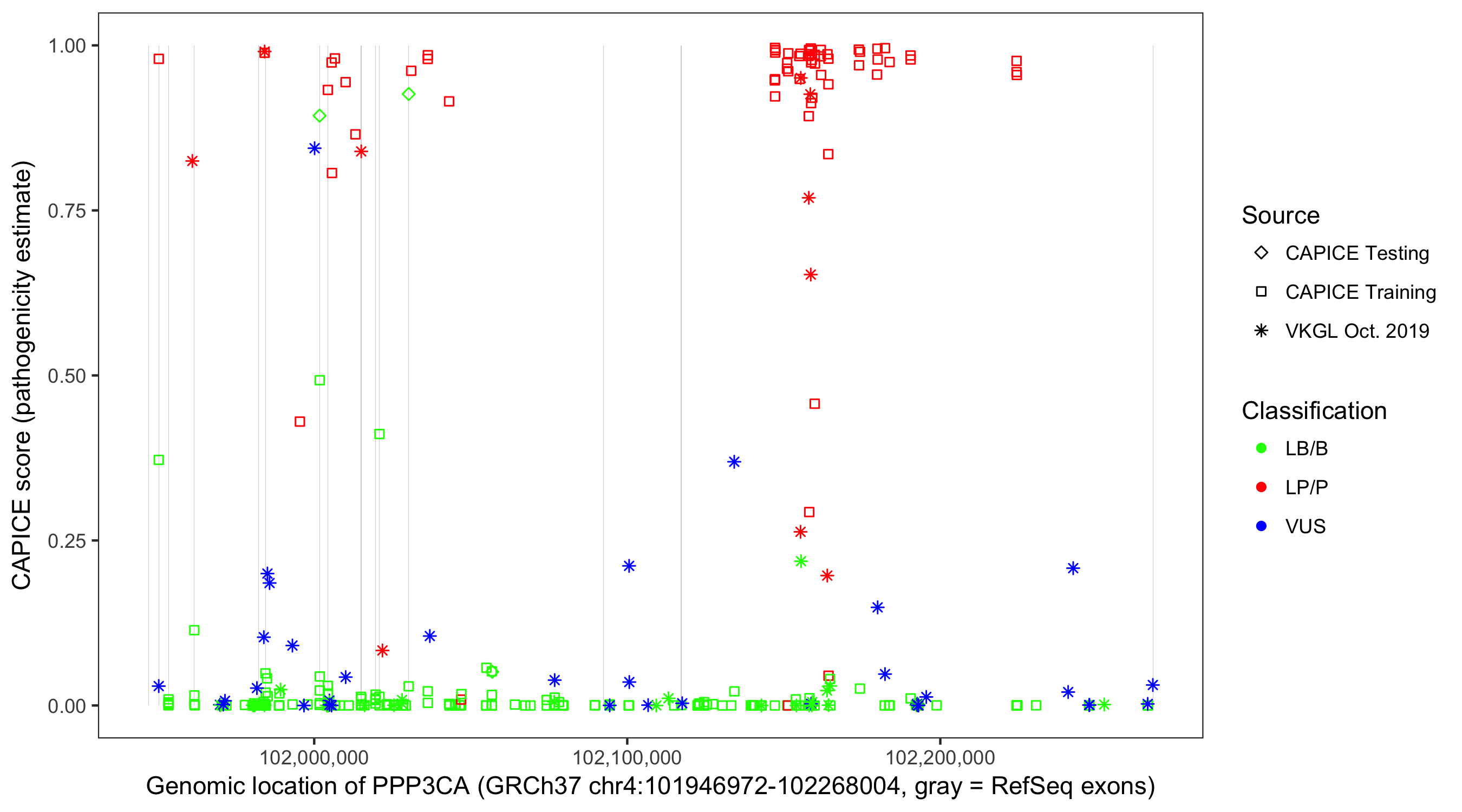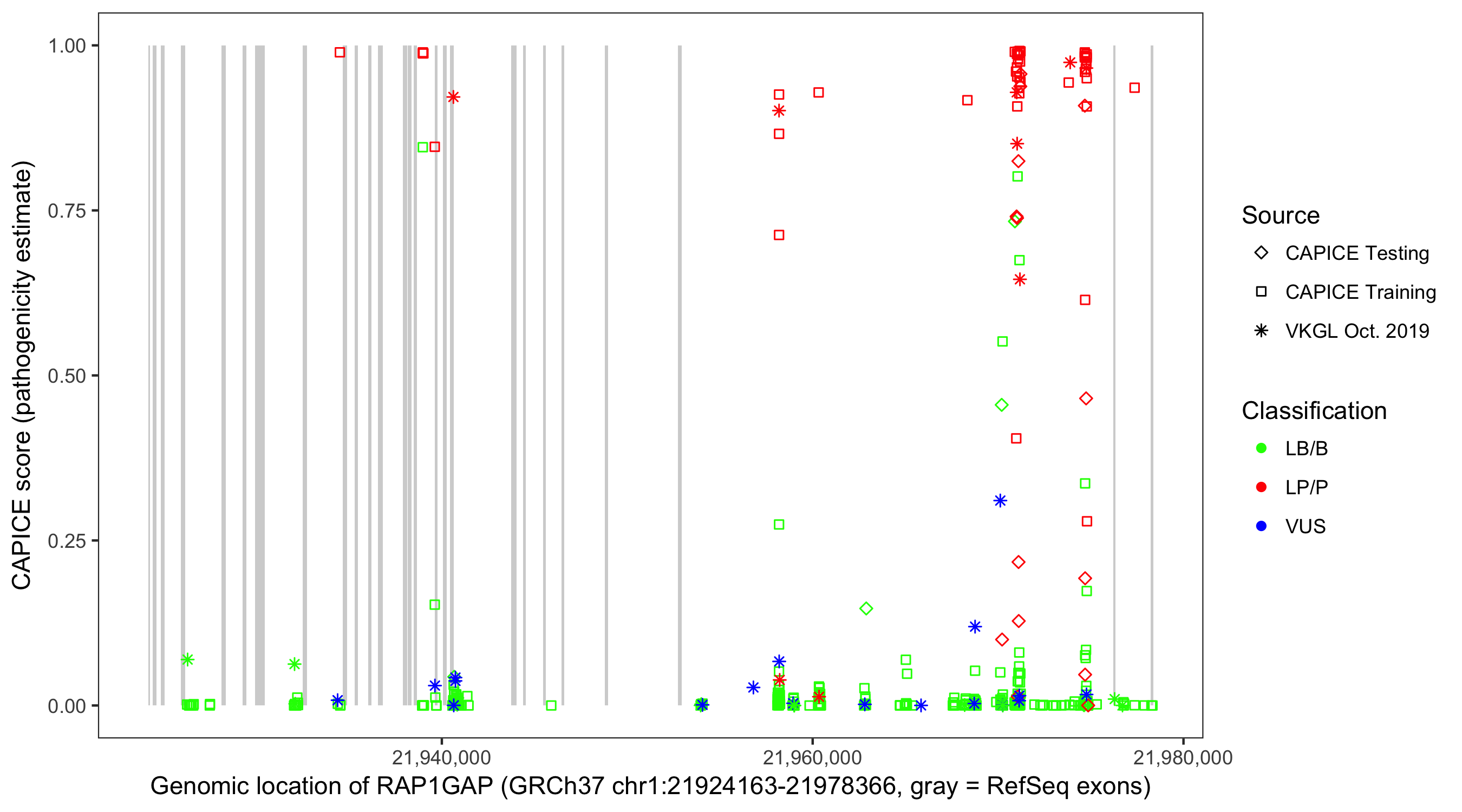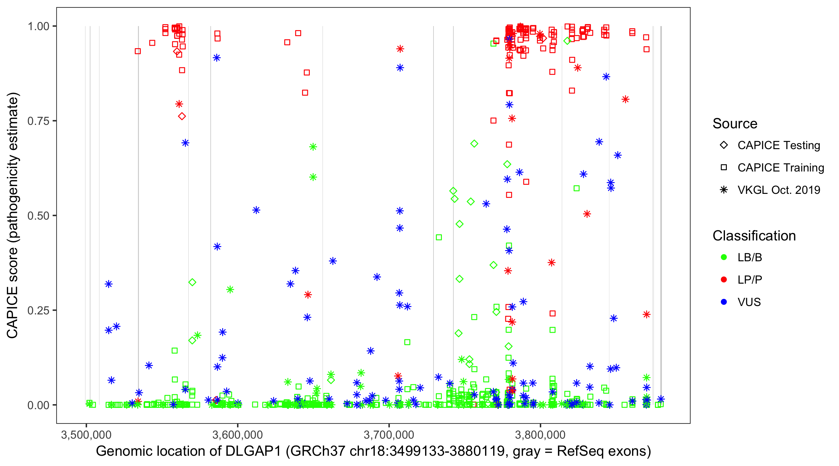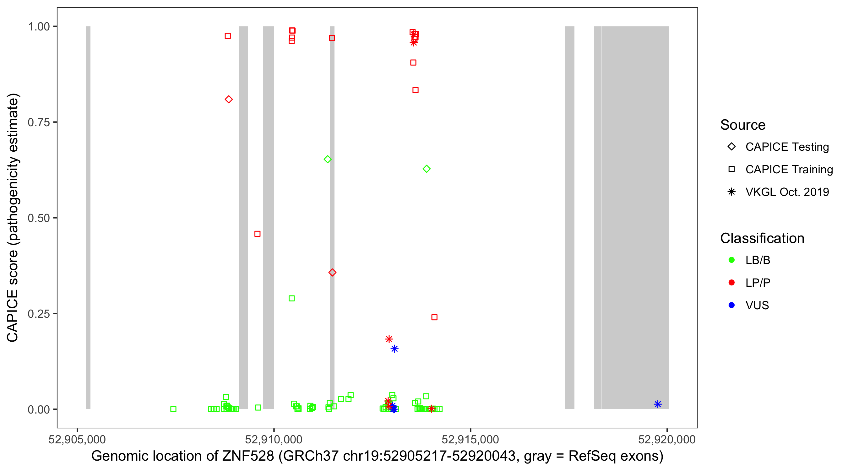 Shown are CAPICE train/test variants plus VKGL Oct 2019.