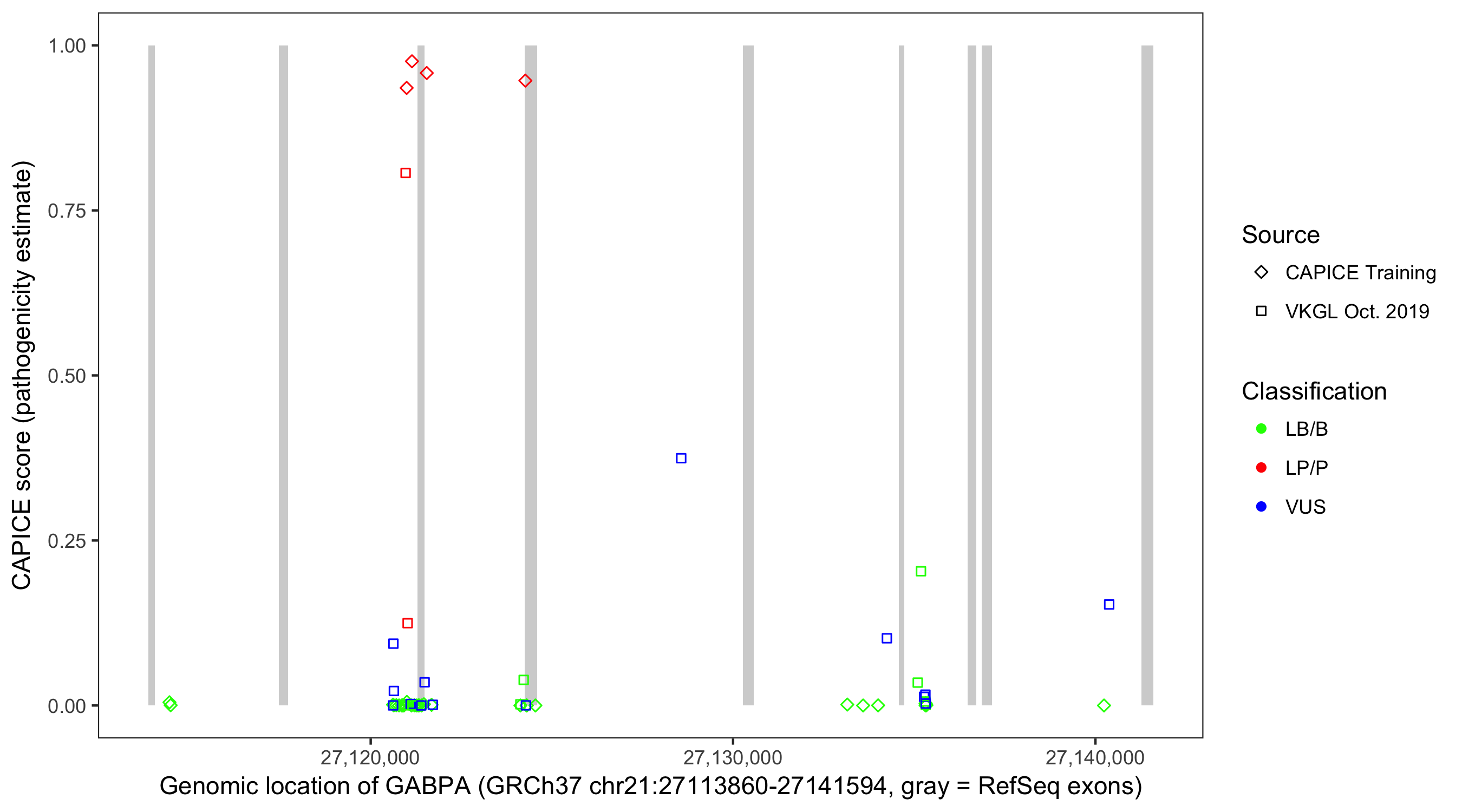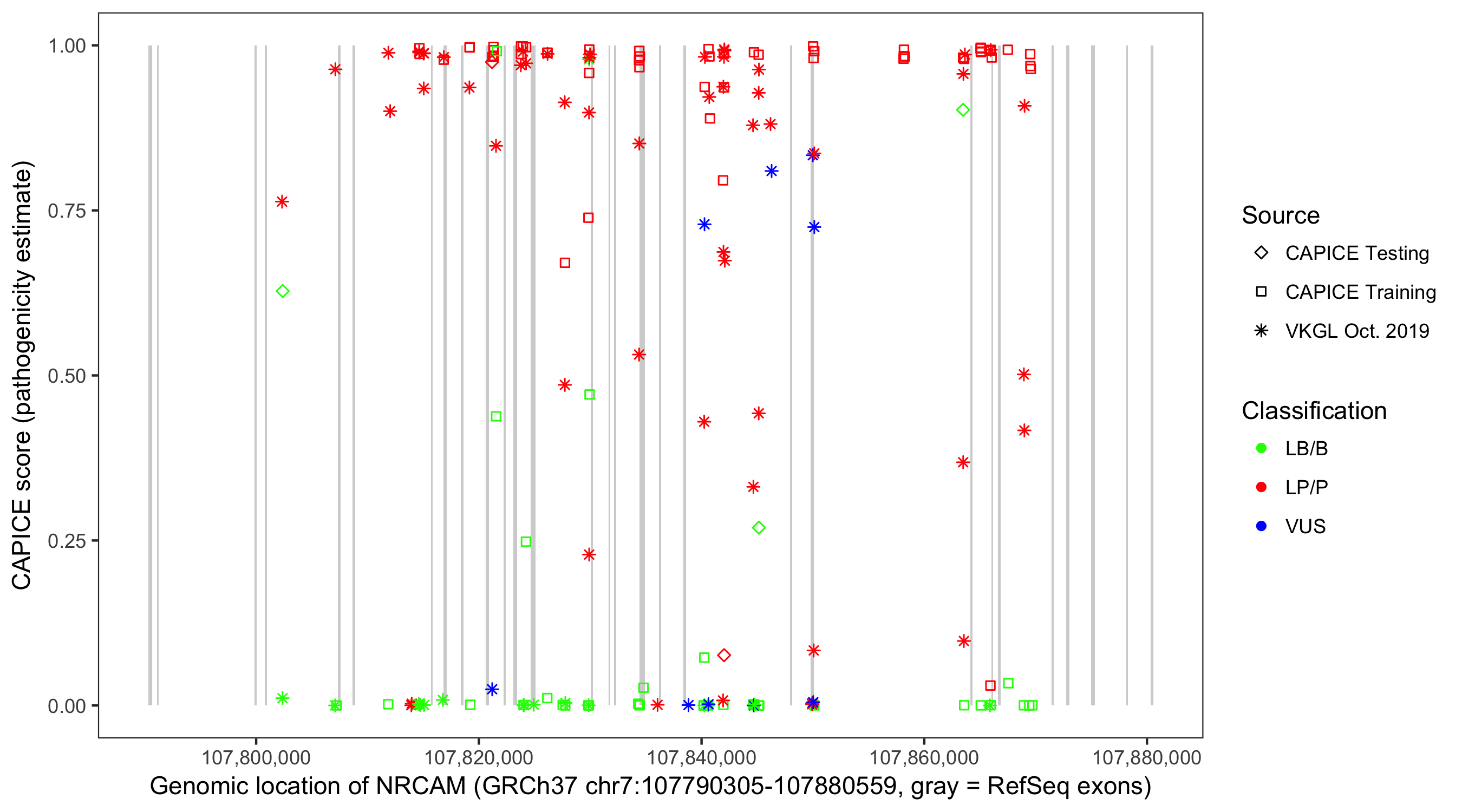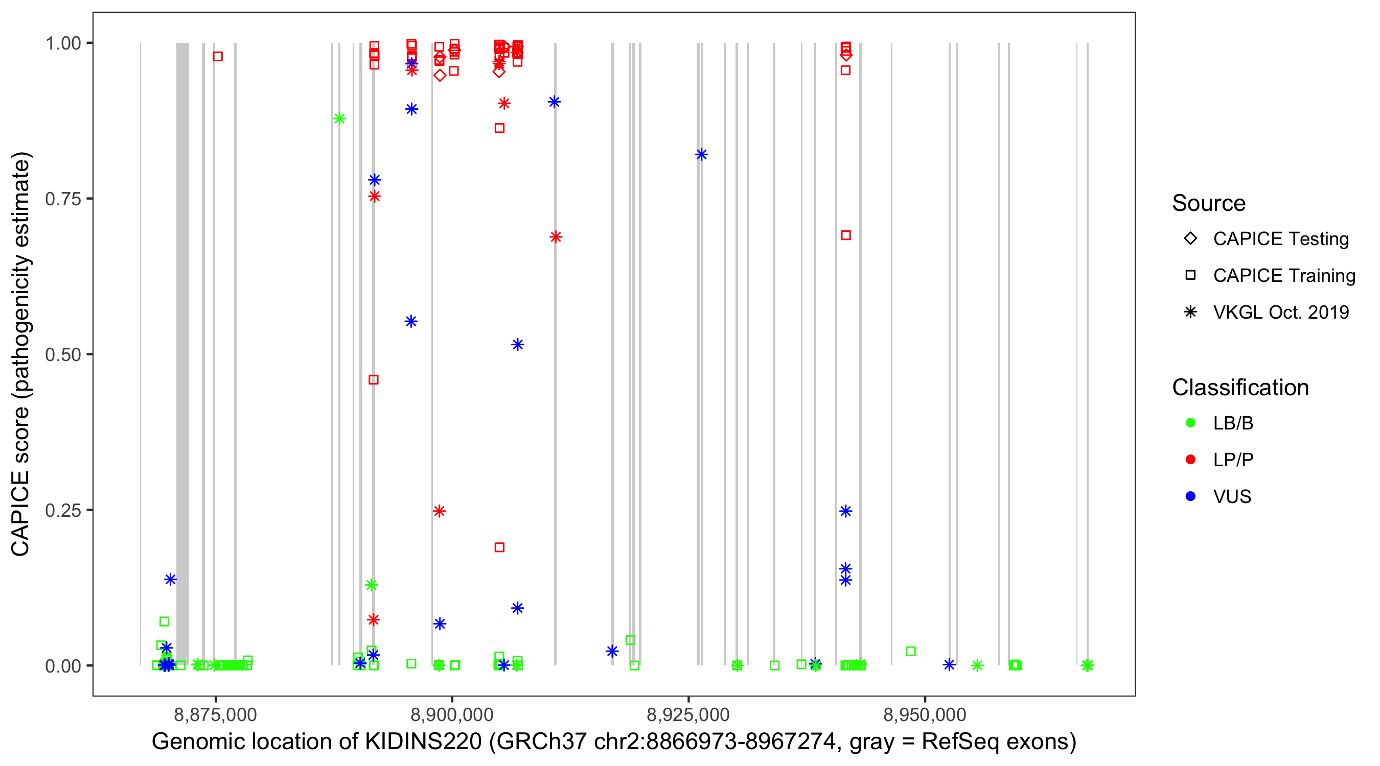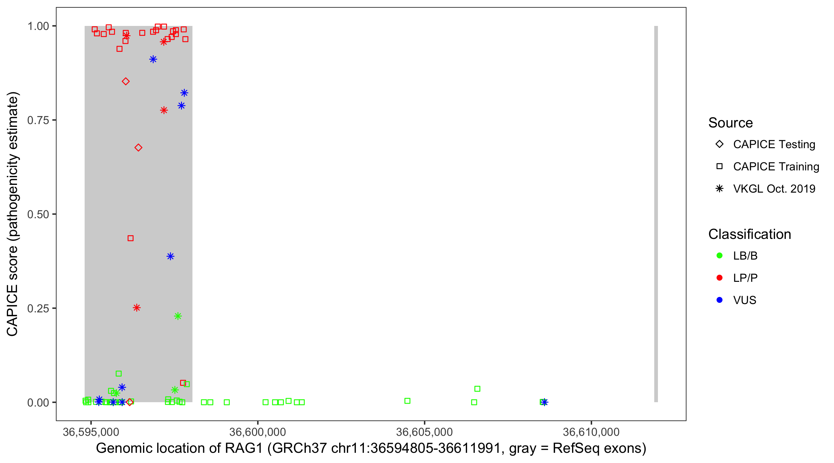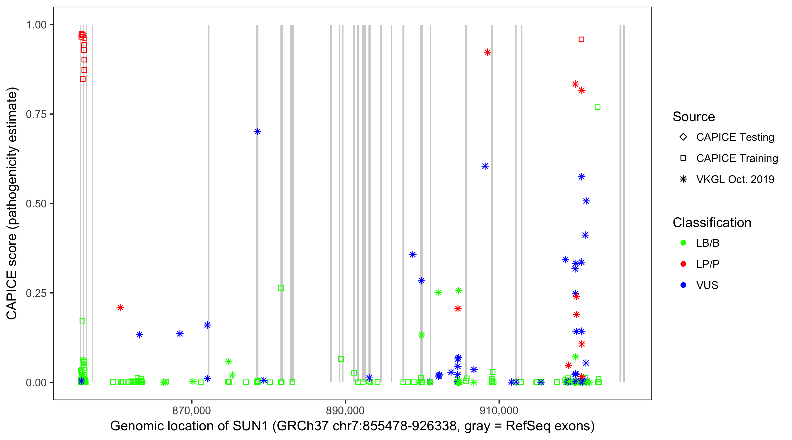 Shown are CAPICE train/test variants plus VKGL Oct 2019.