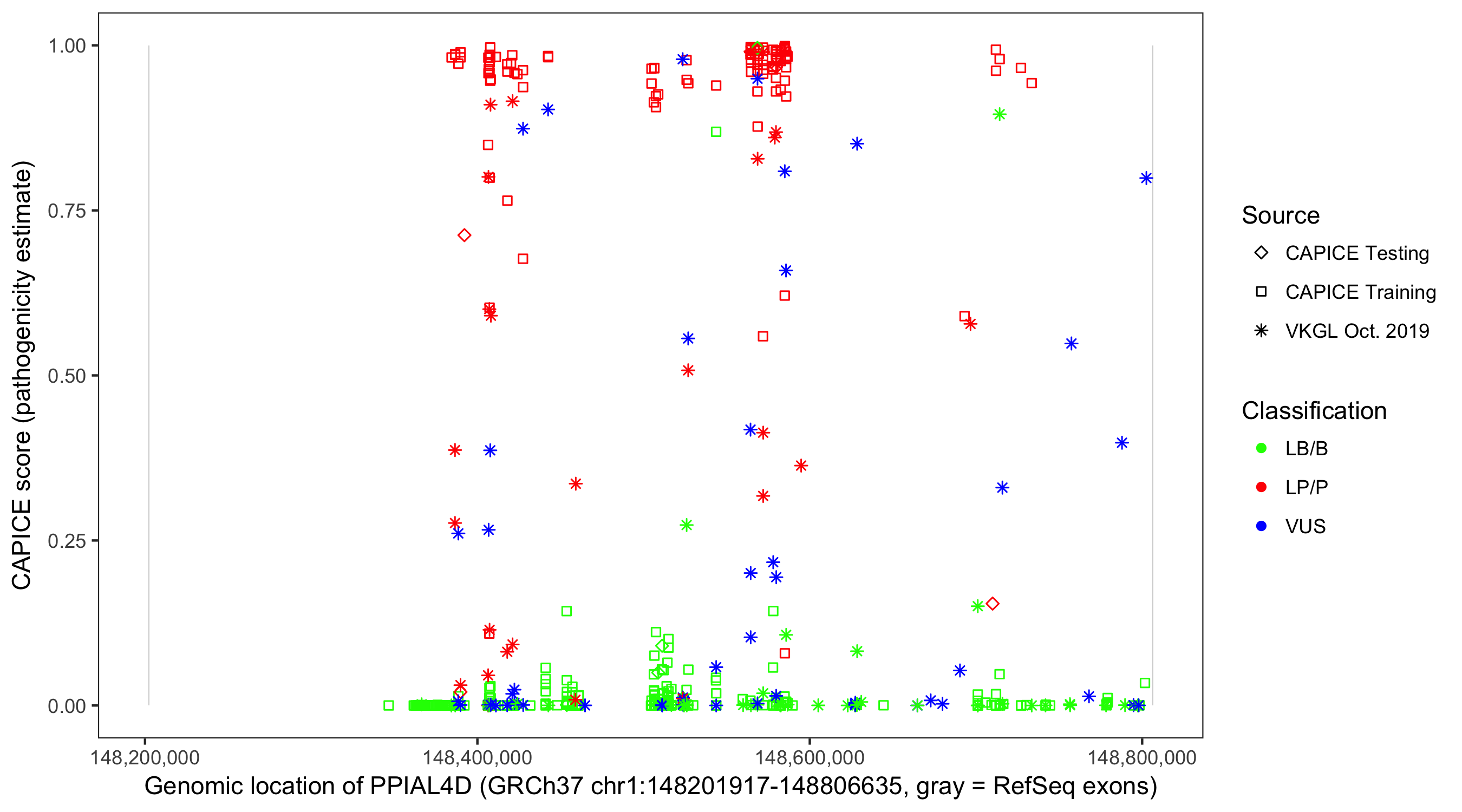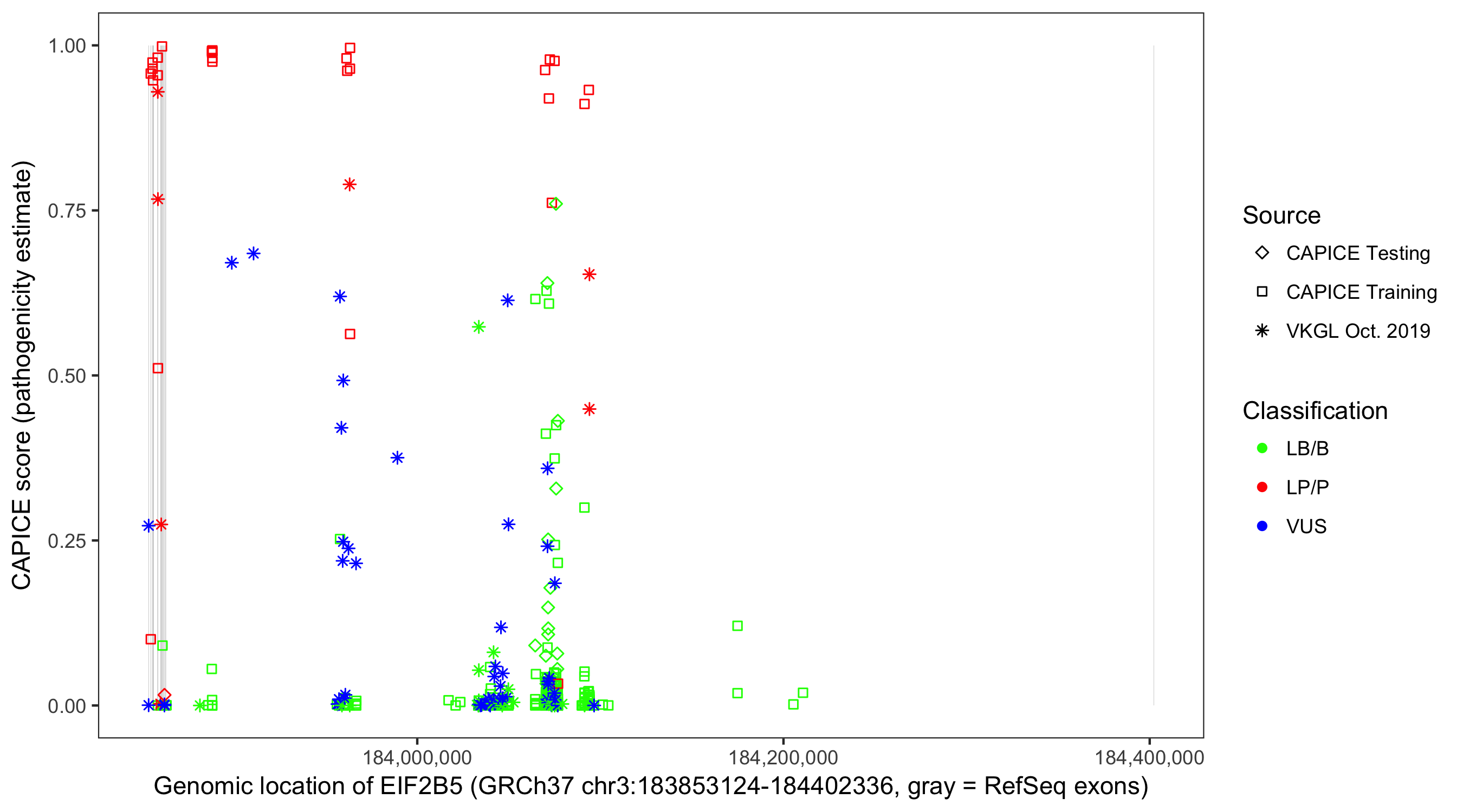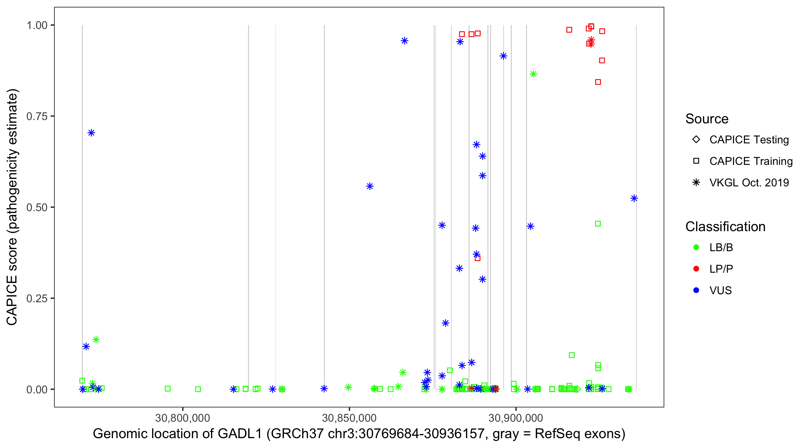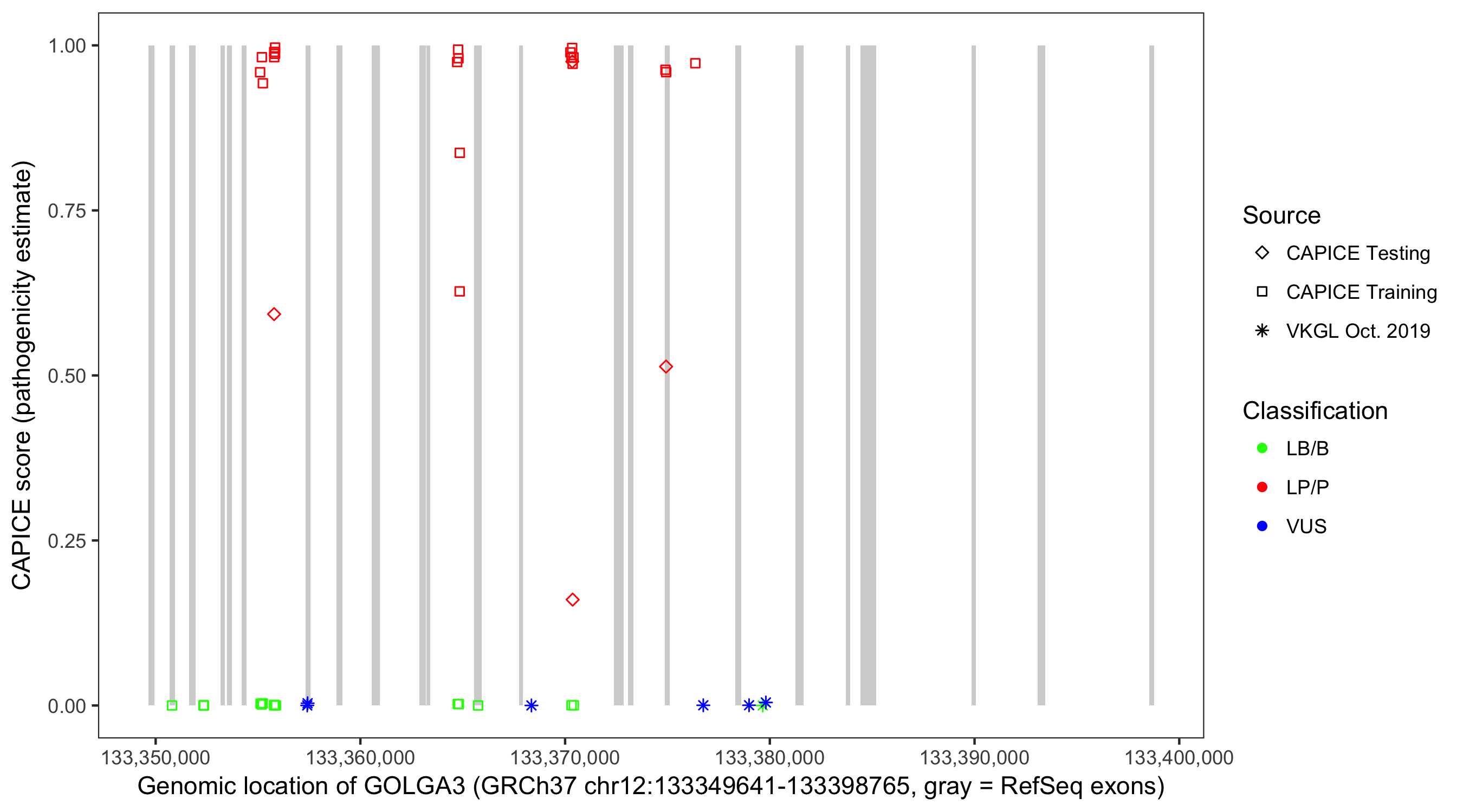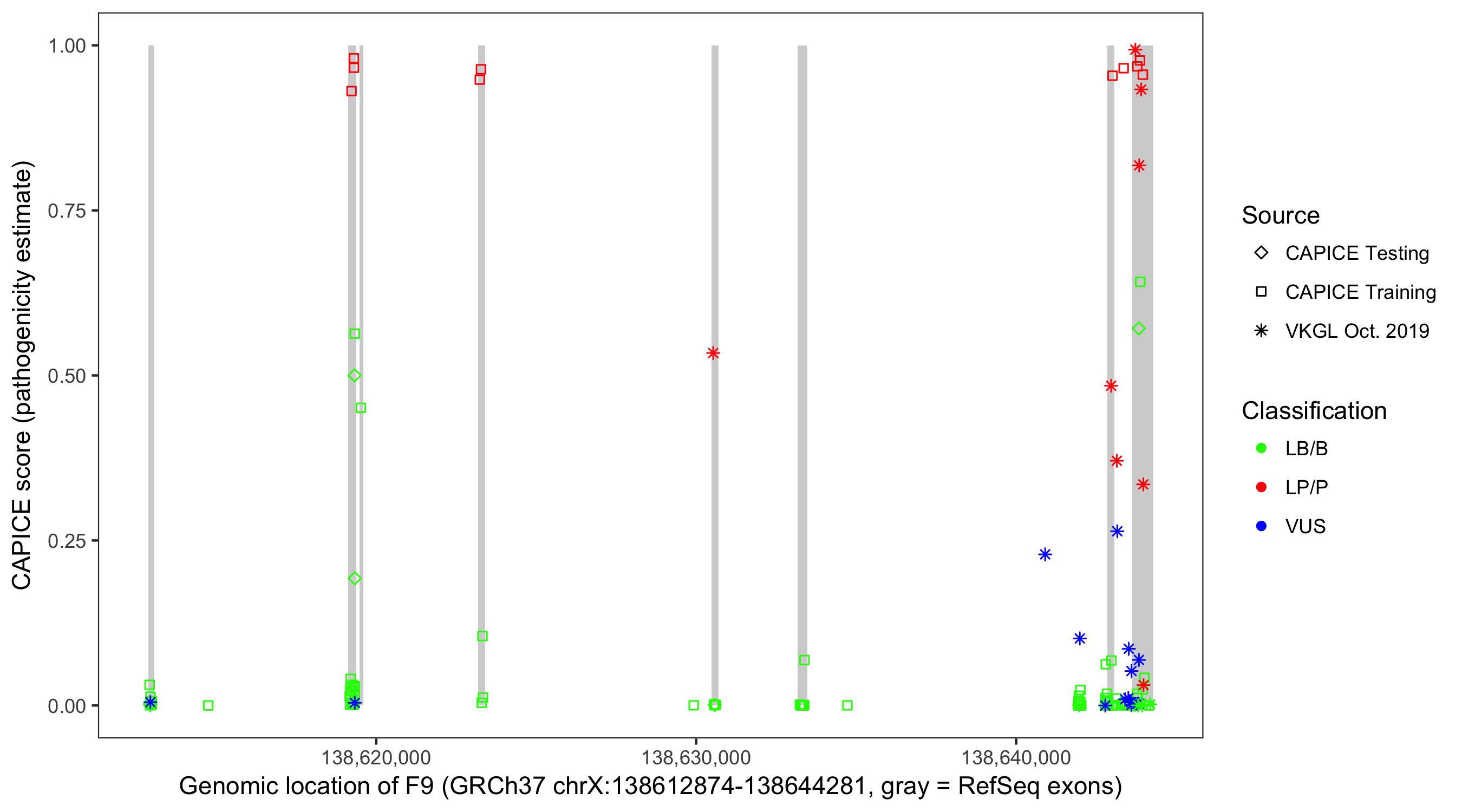 Shown are CAPICE train/test variants plus VKGL Oct 2019.