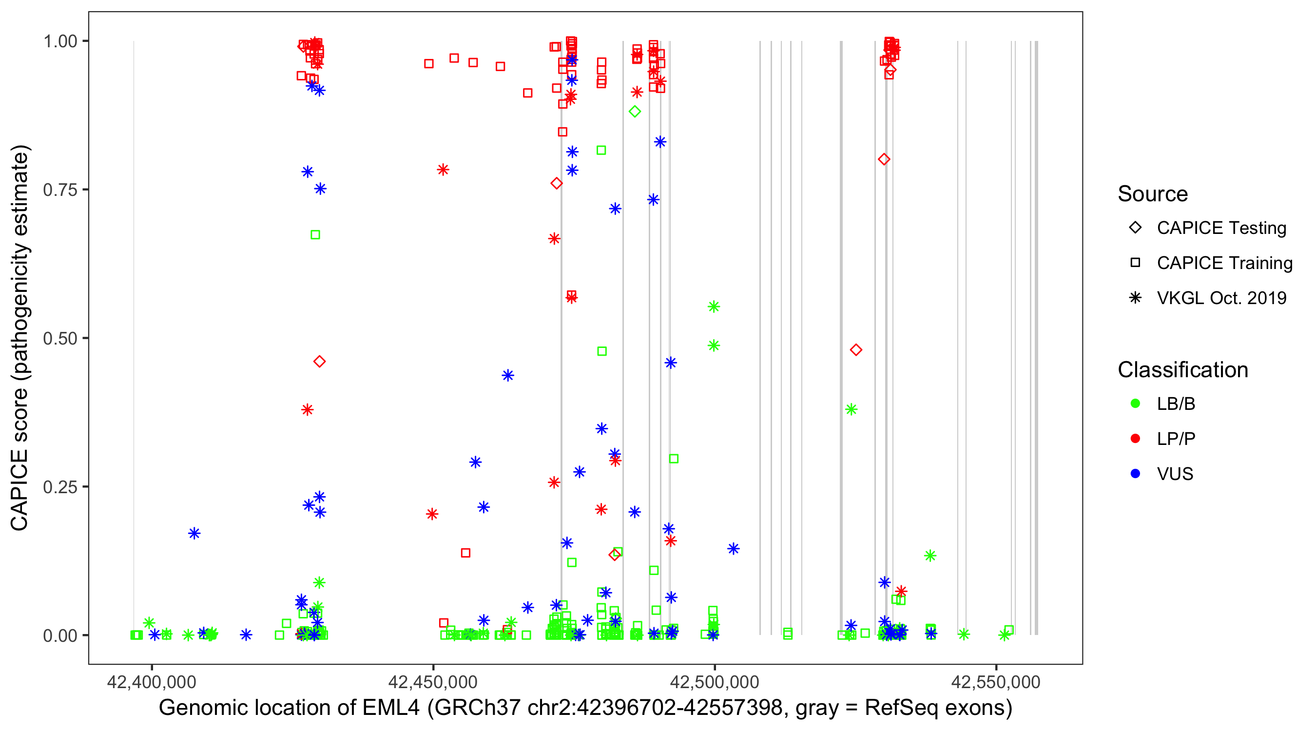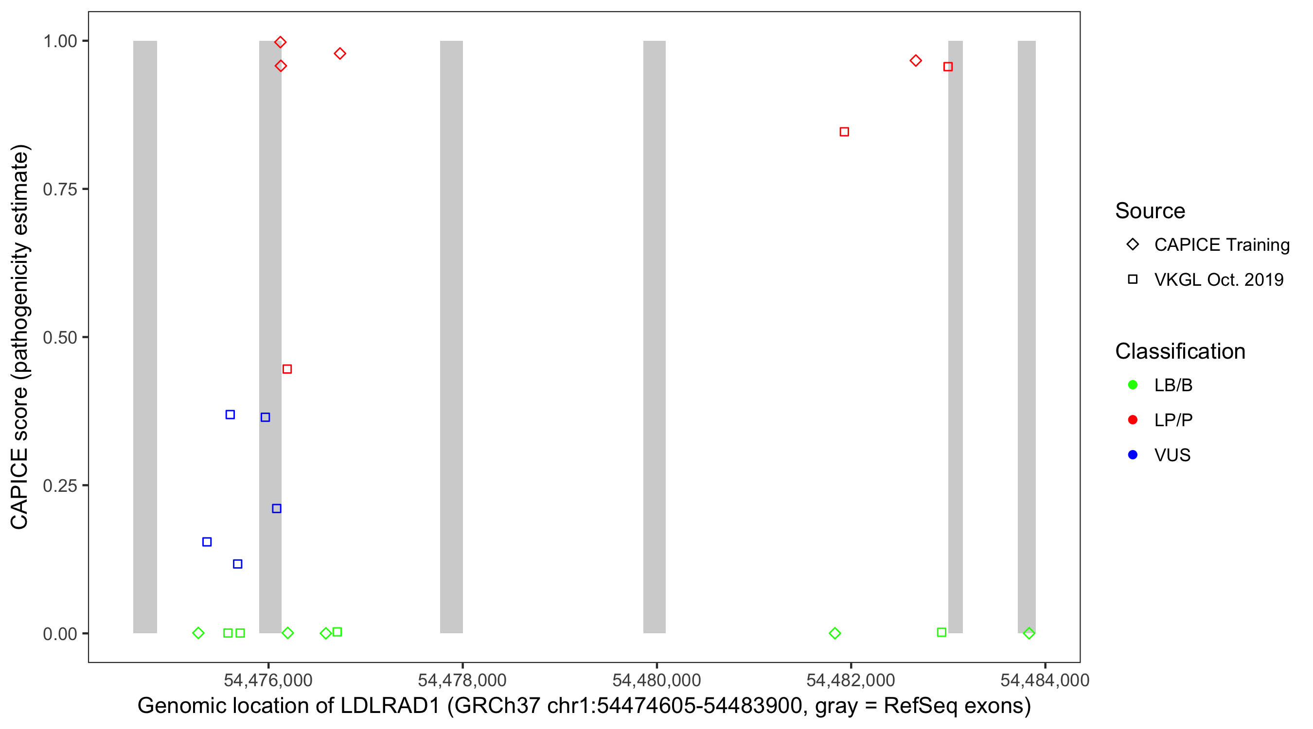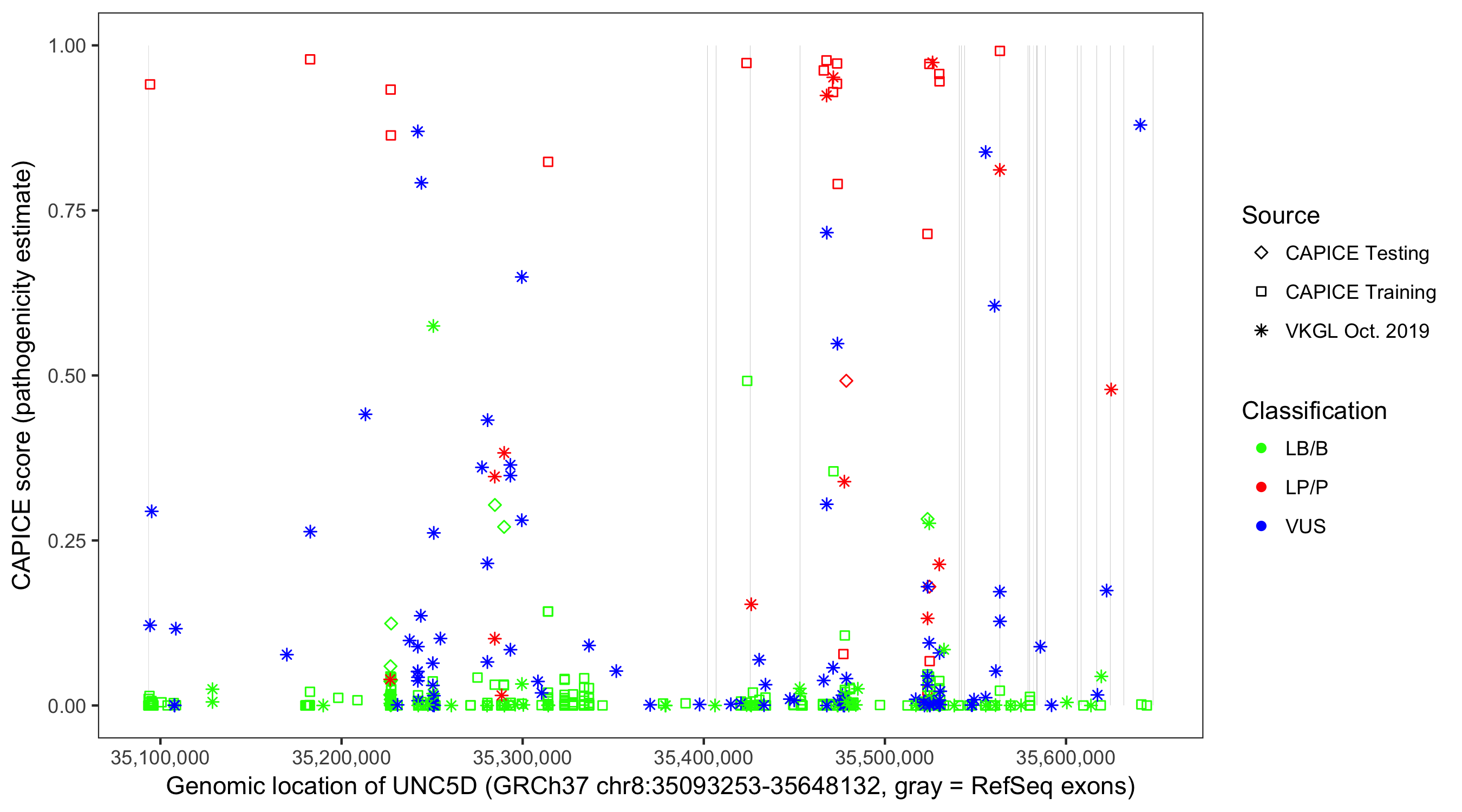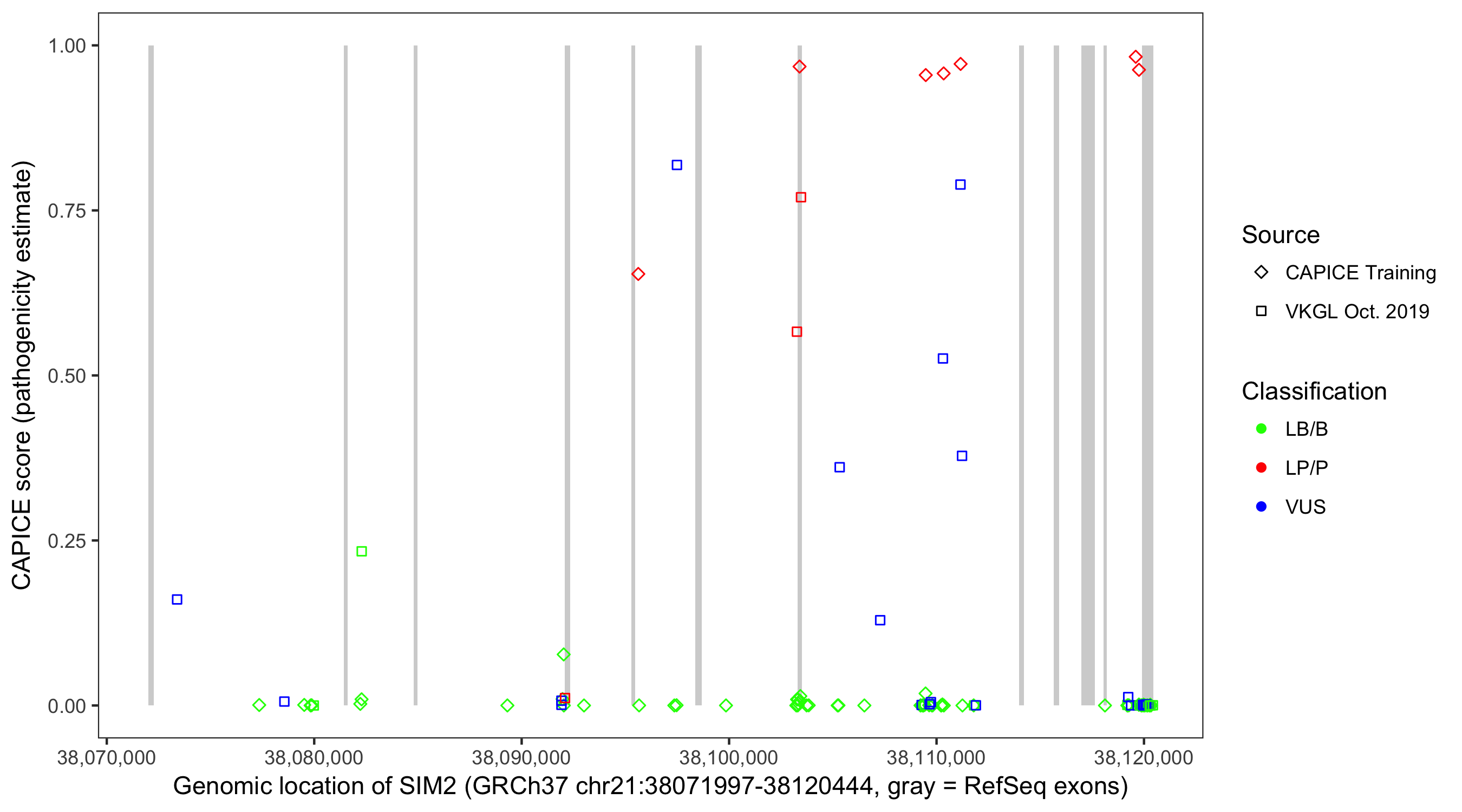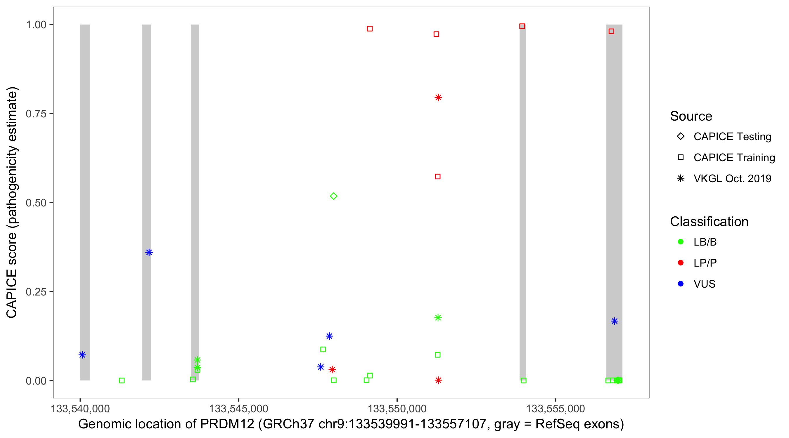 Shown are CAPICE train/test variants plus VKGL Oct 2019.