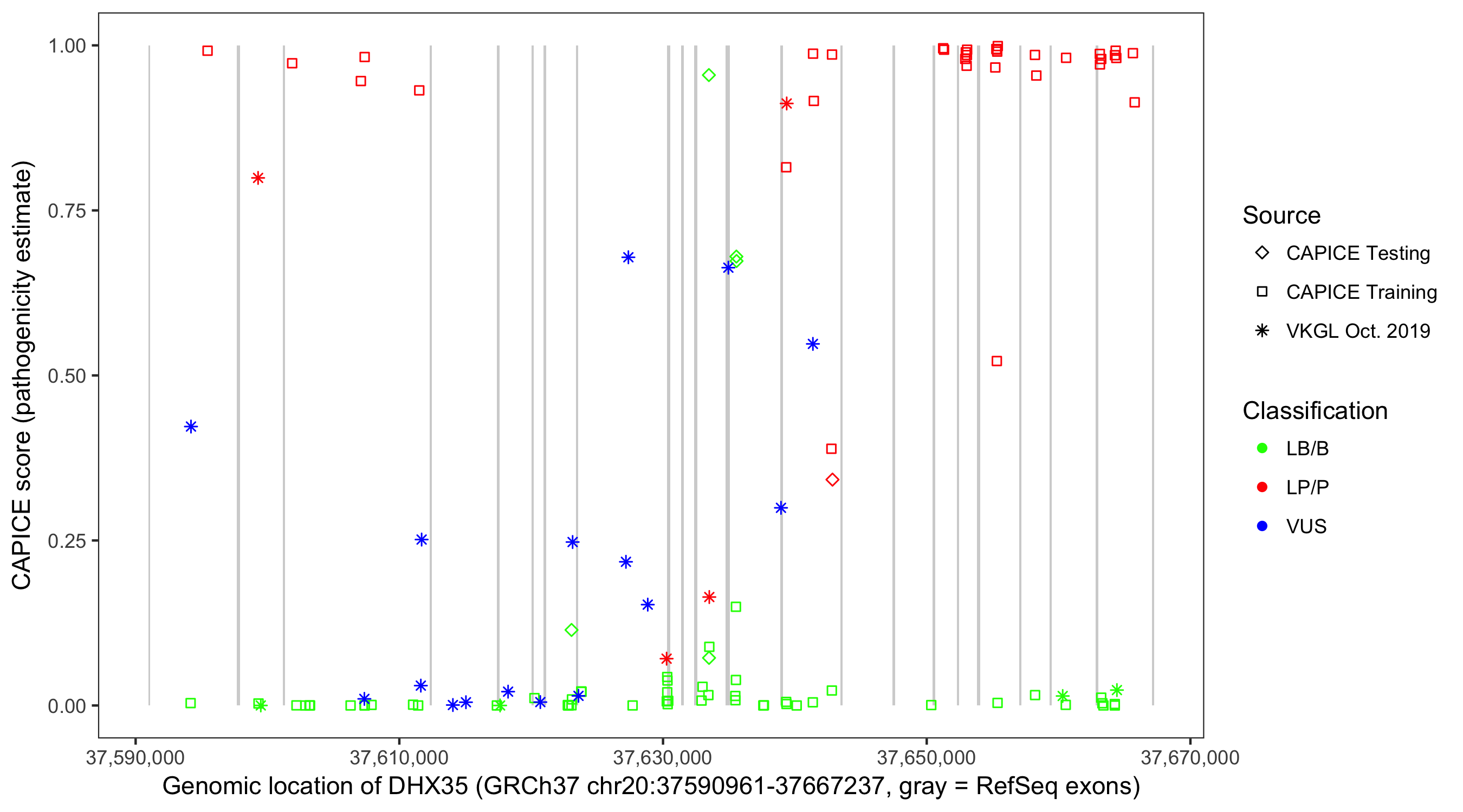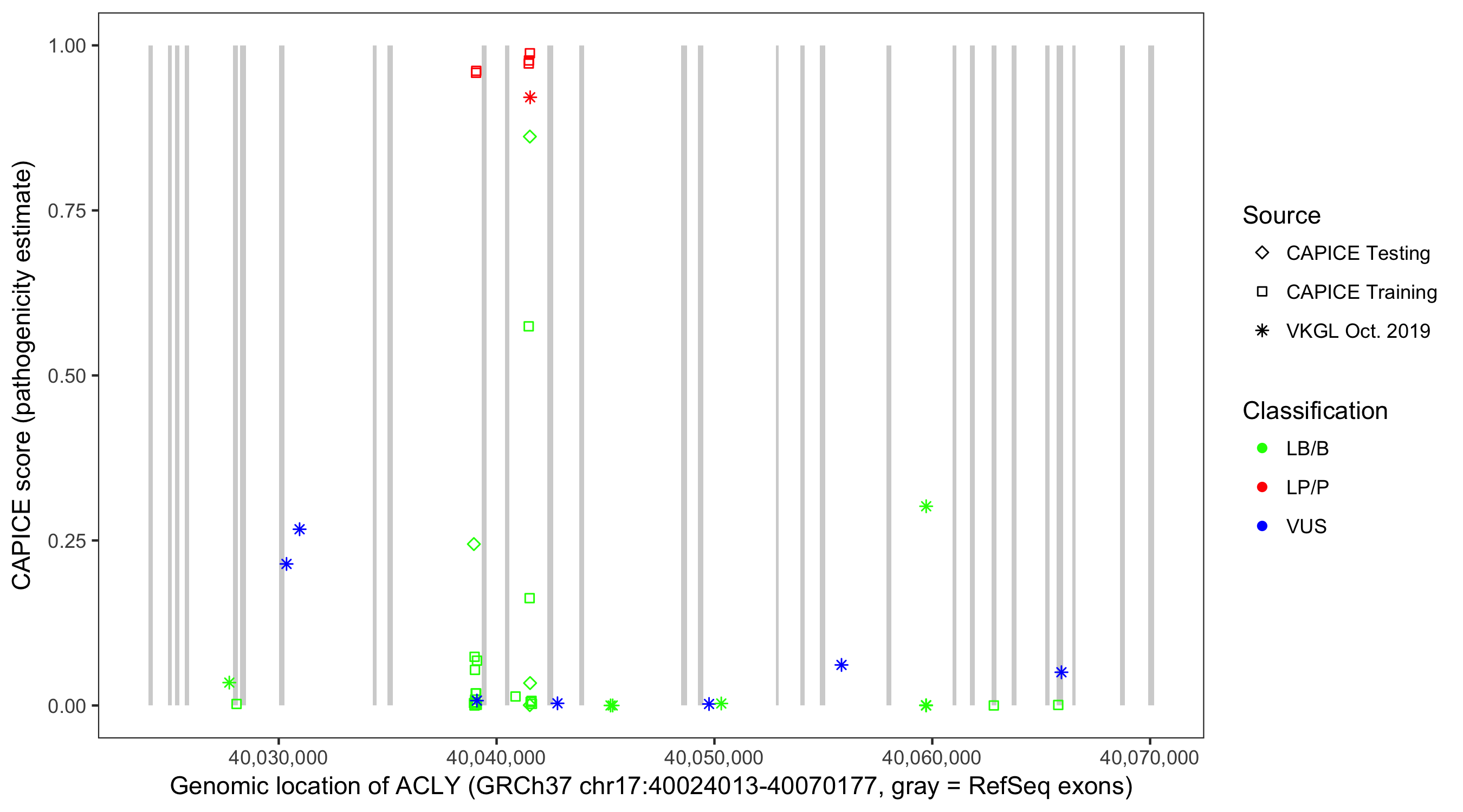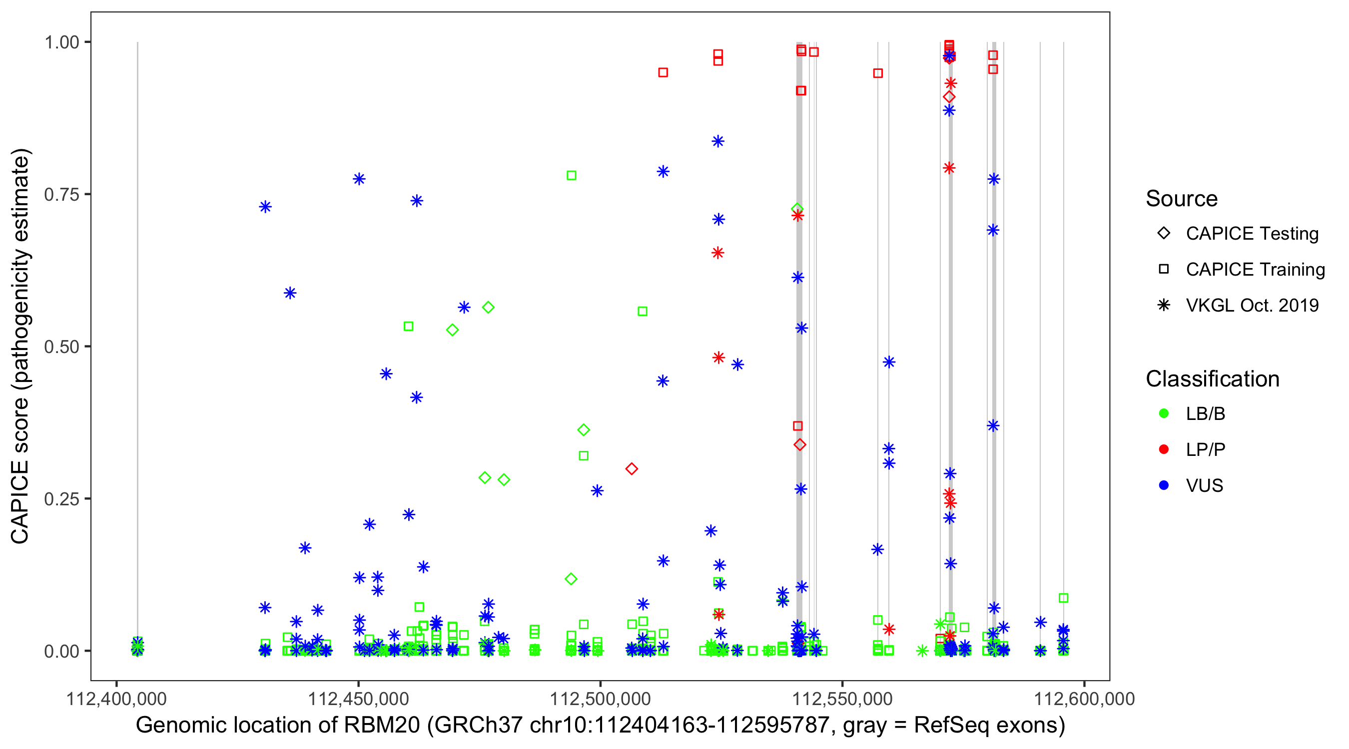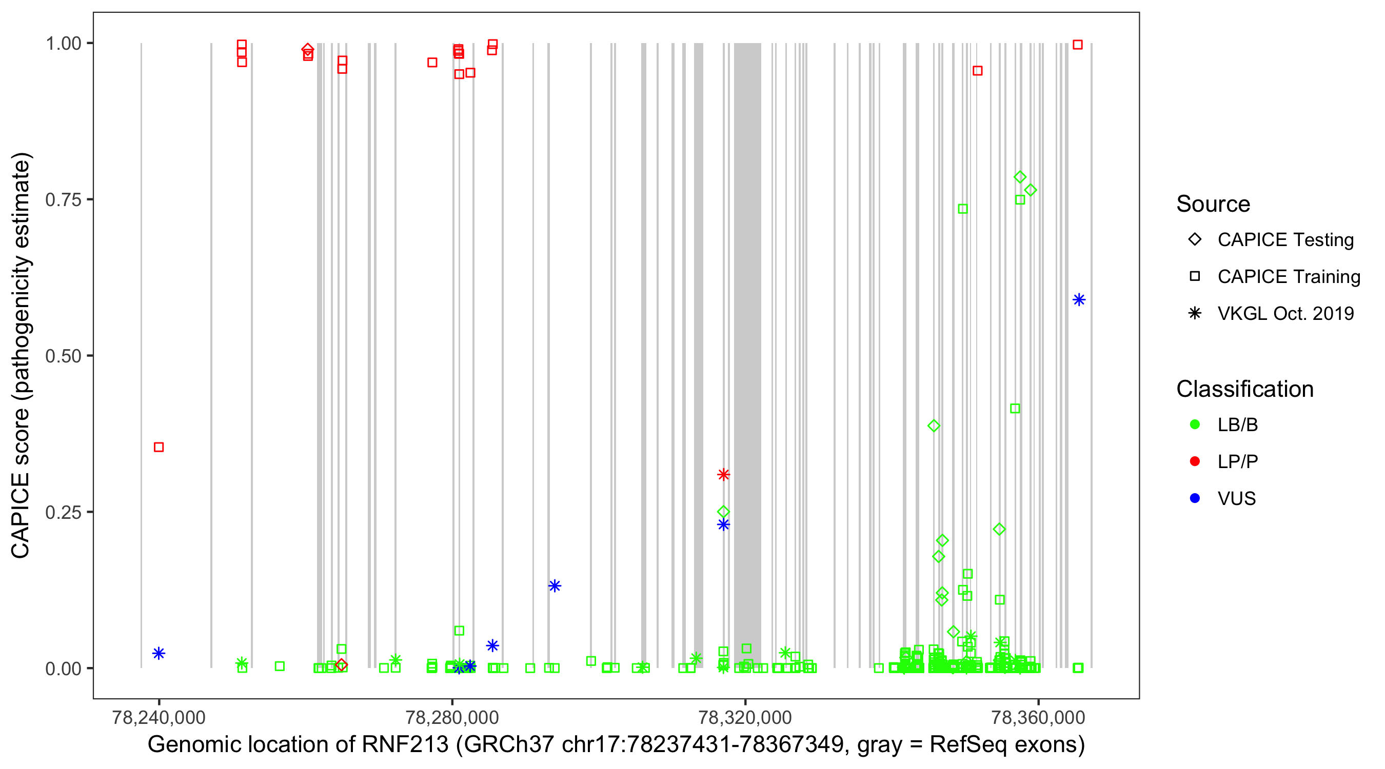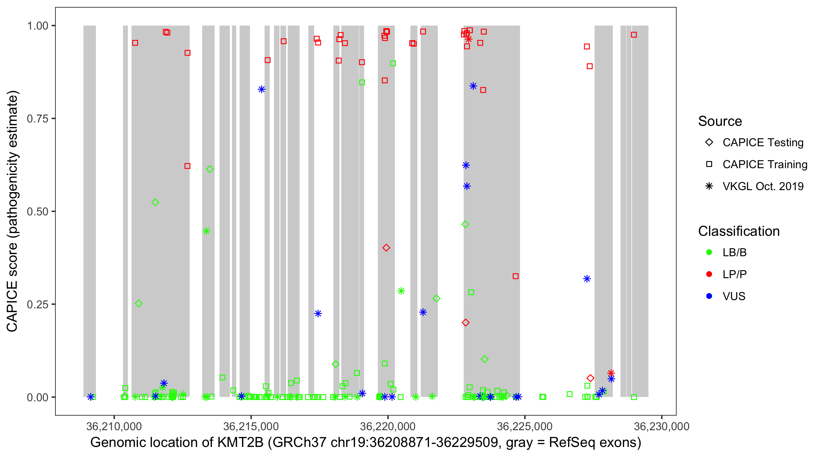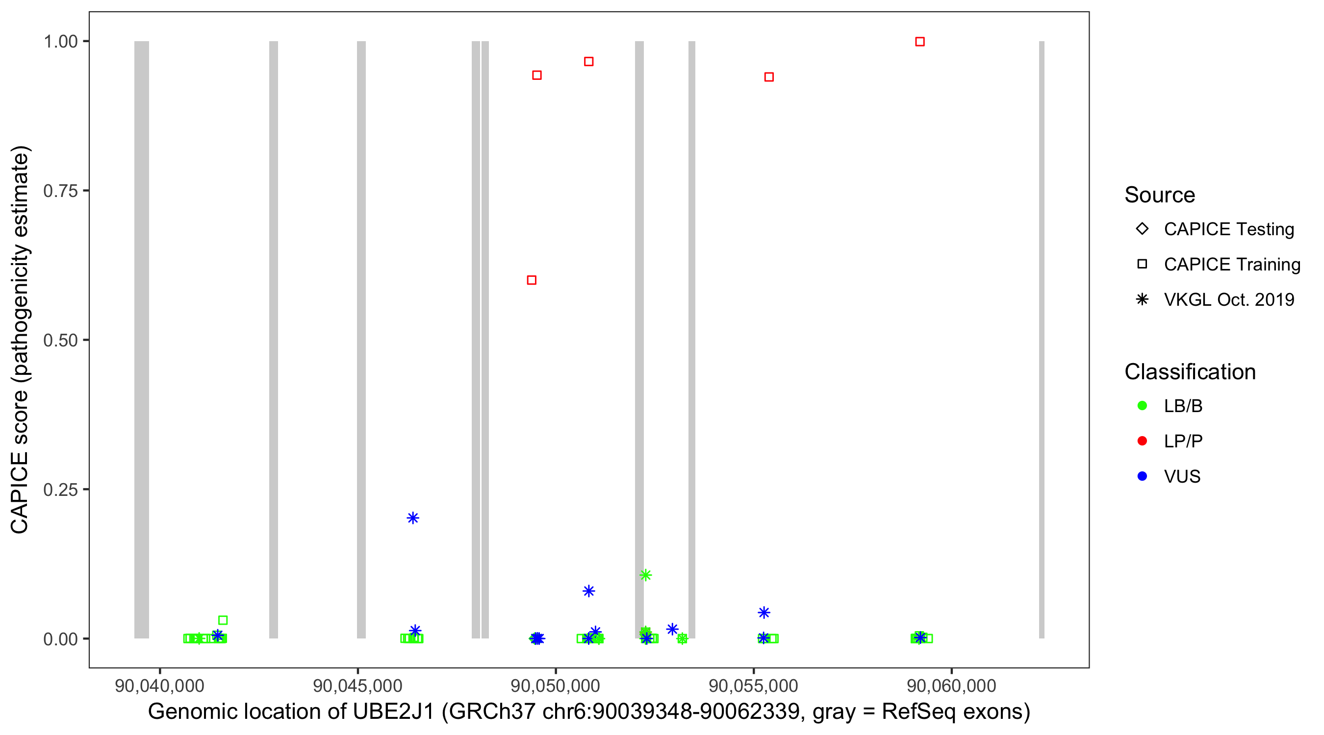 Shown are CAPICE train/test variants plus VKGL Oct 2019.