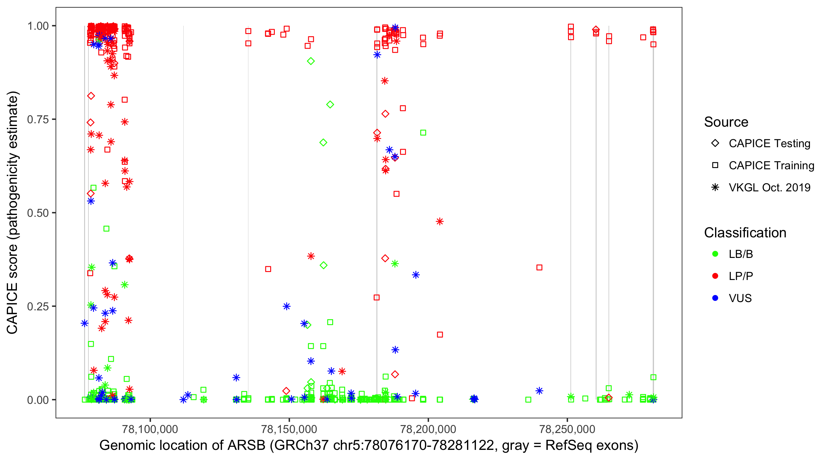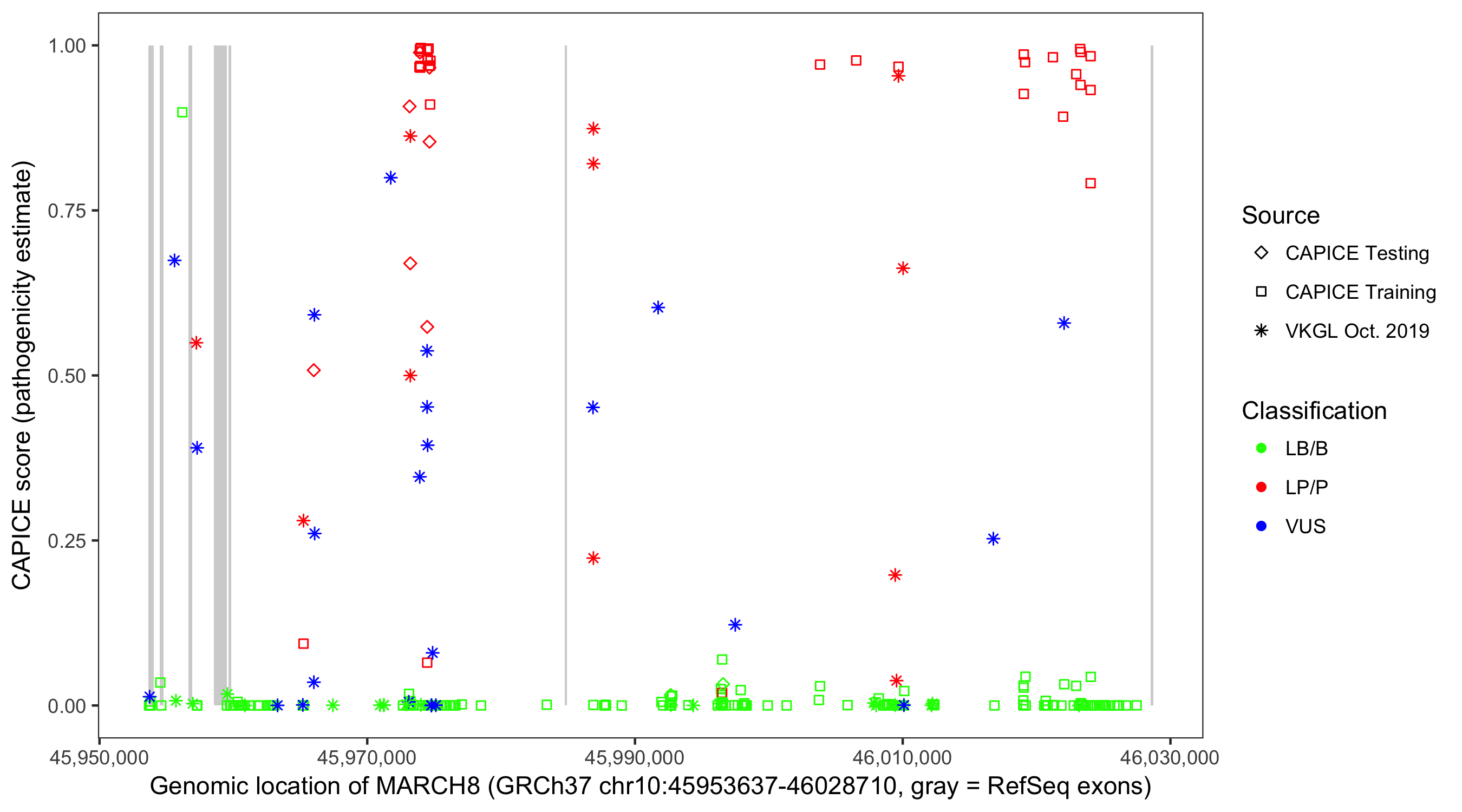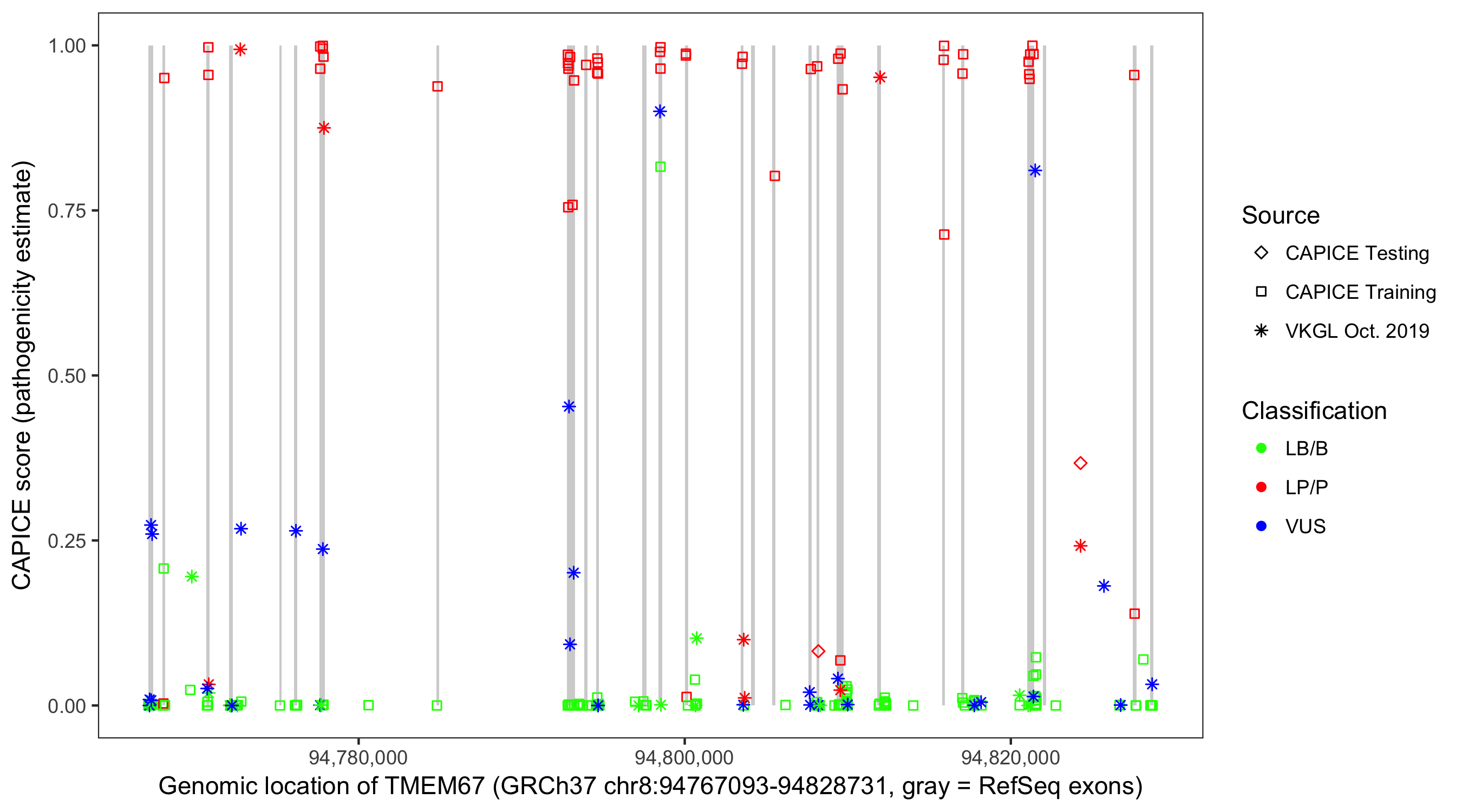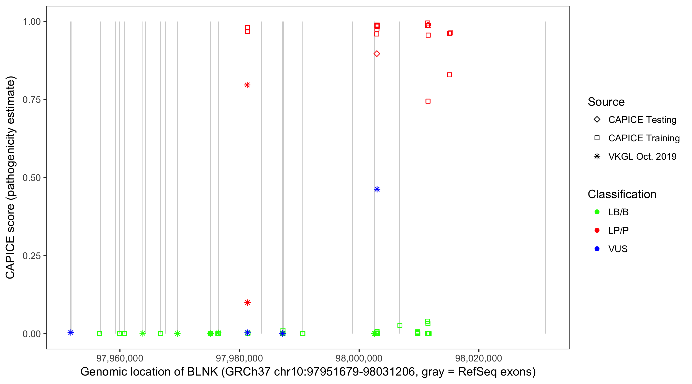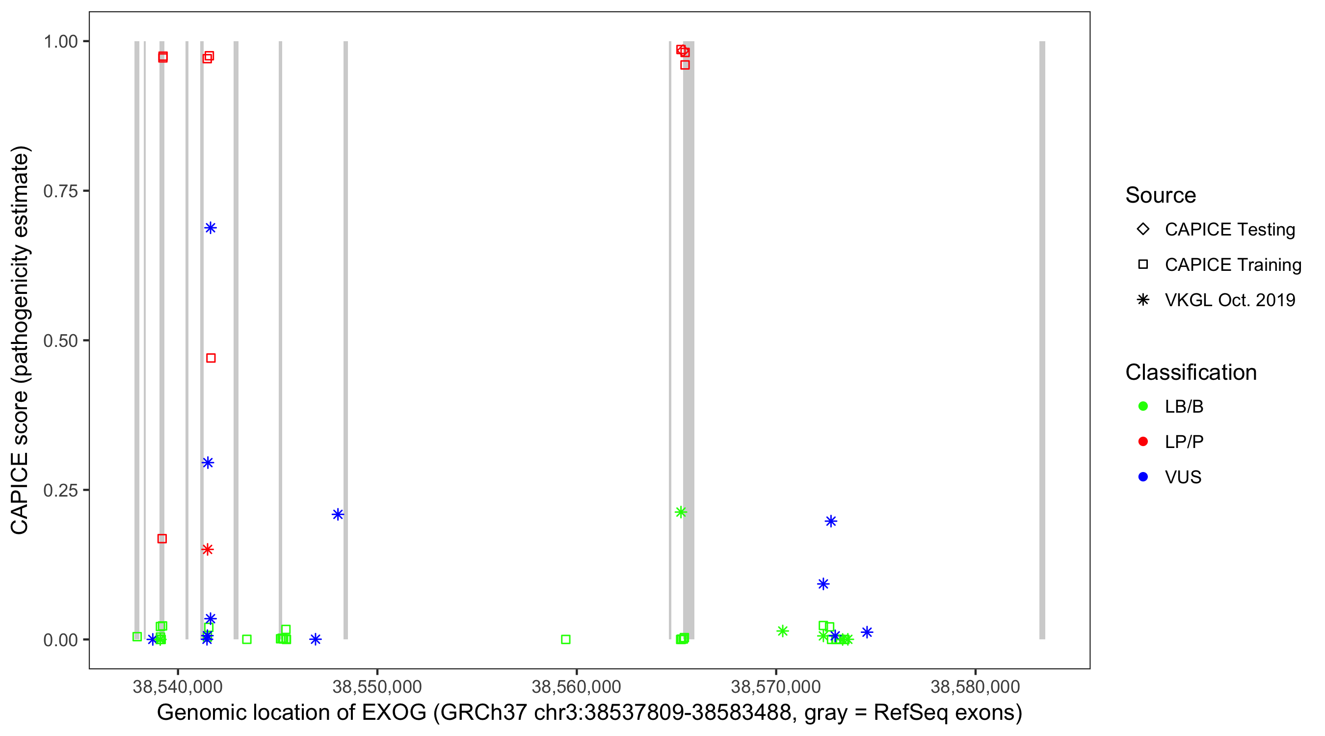 Shown are CAPICE train/test variants plus VKGL Oct 2019.