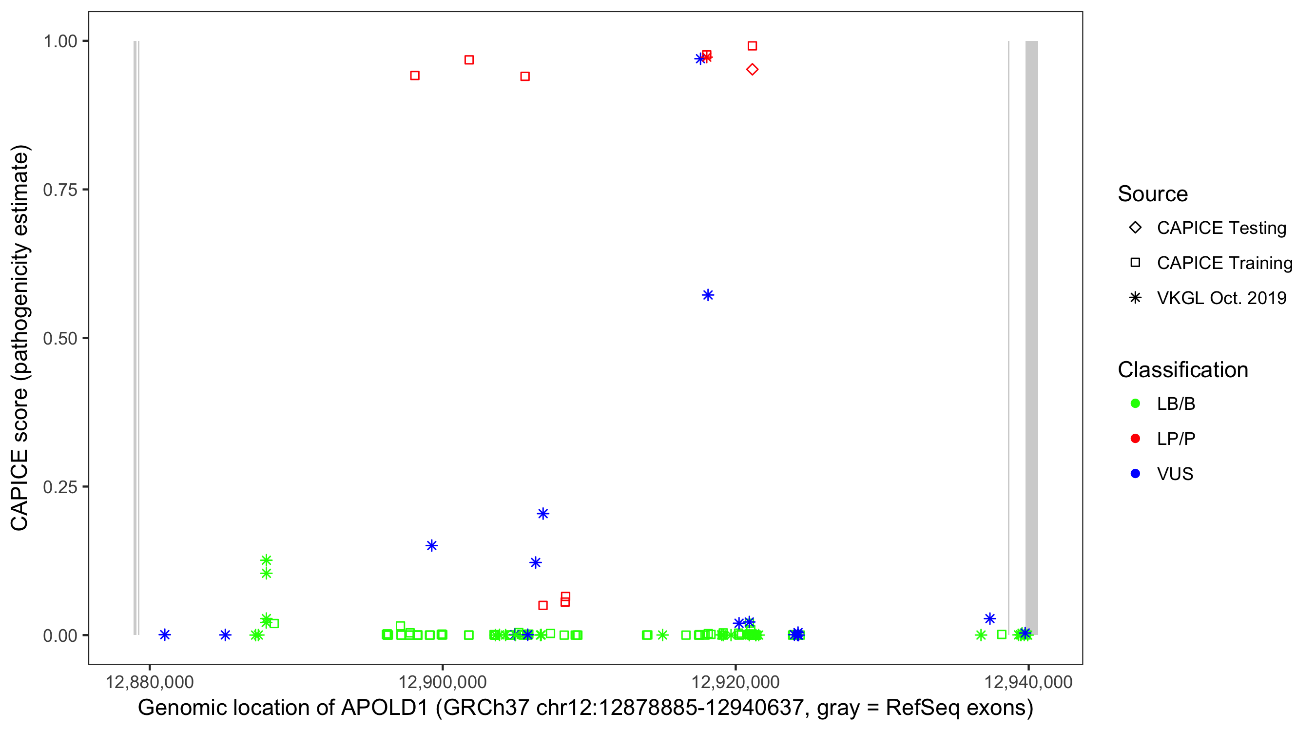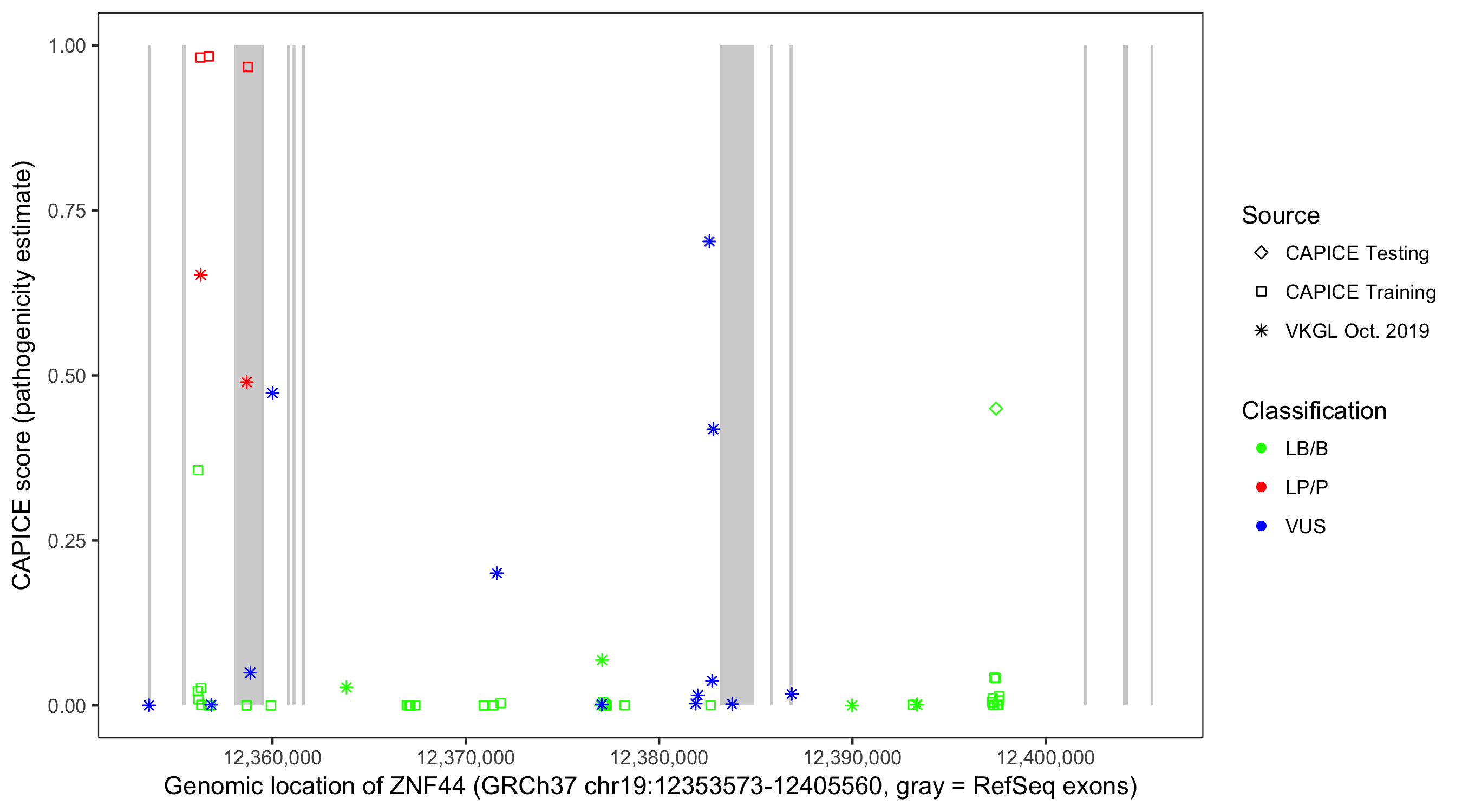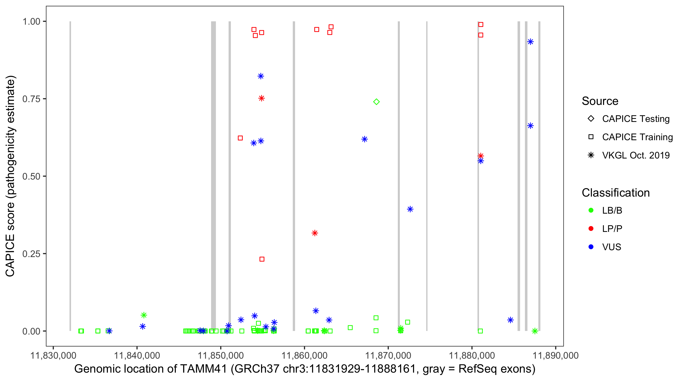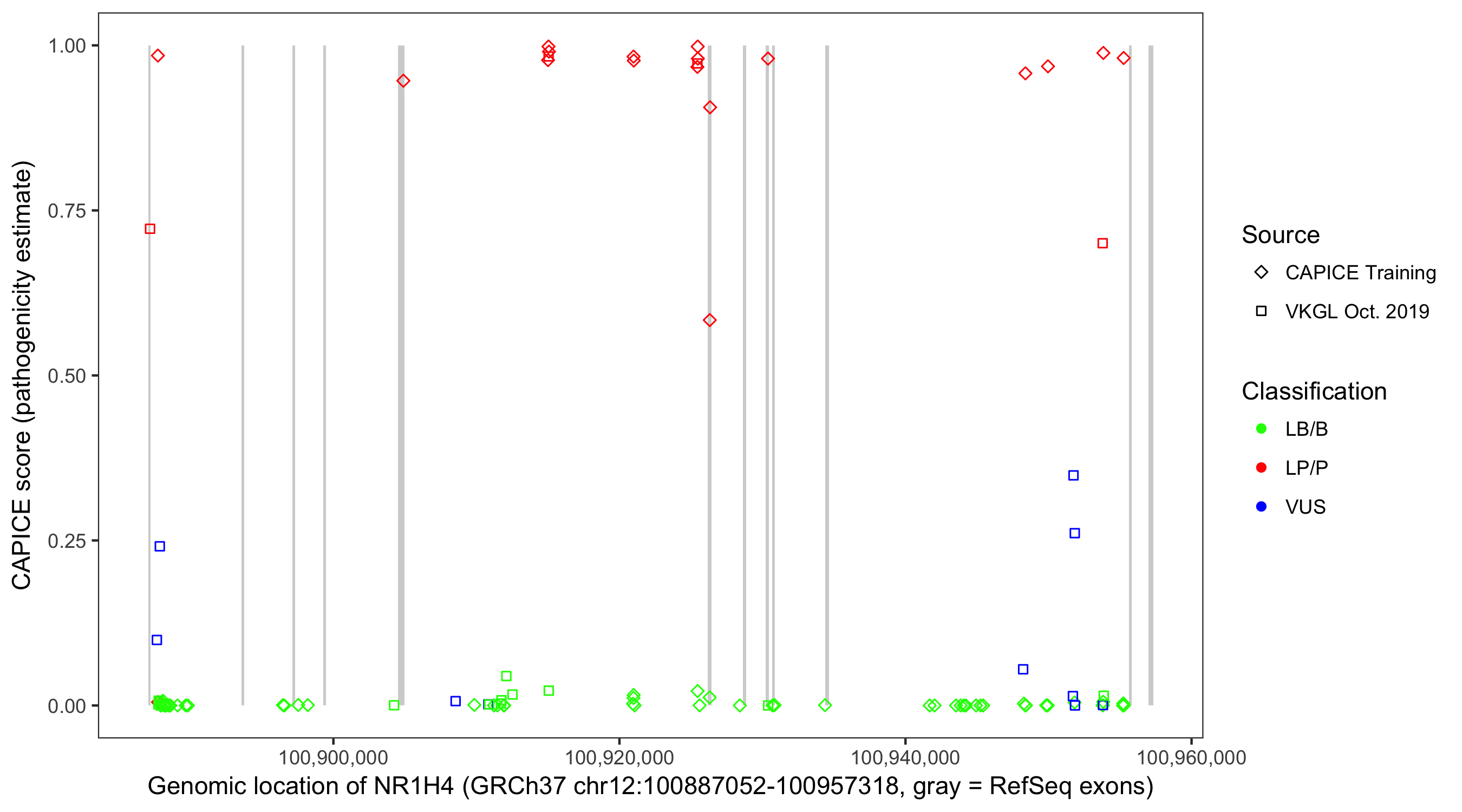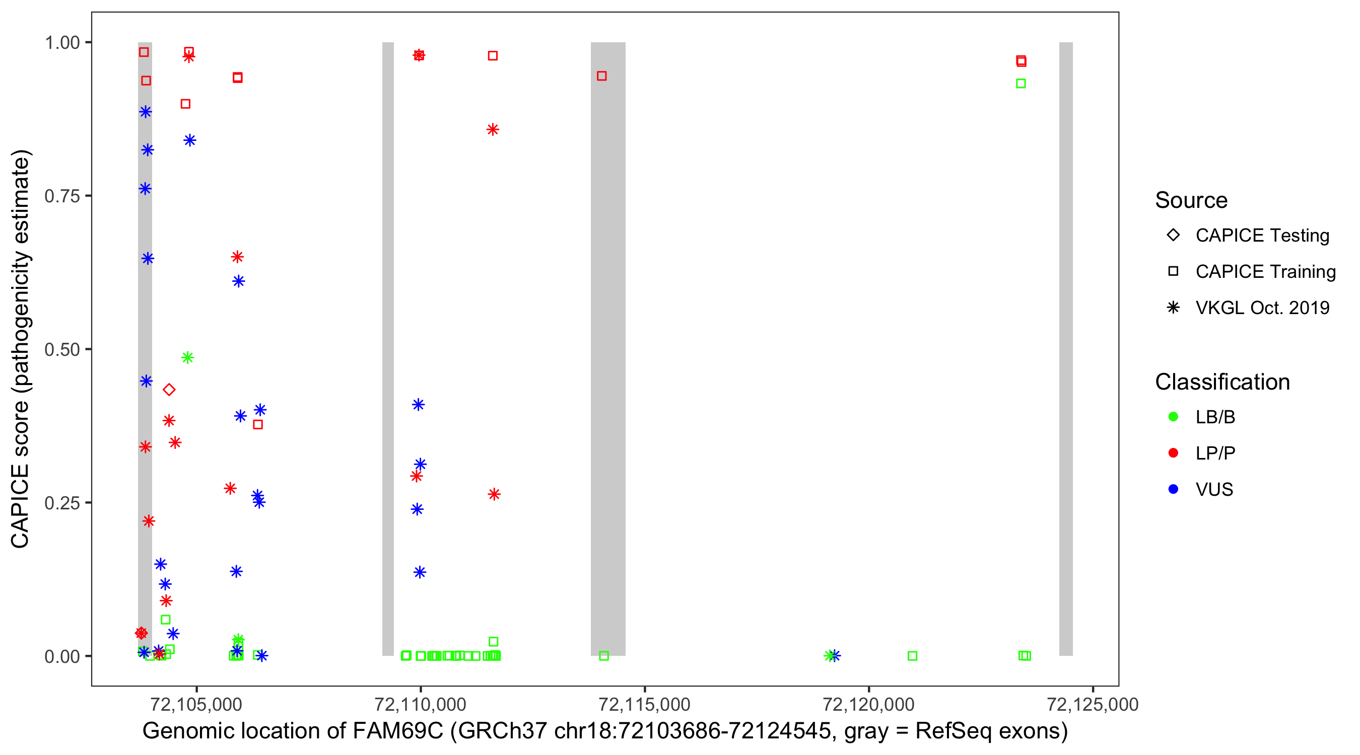 Shown are CAPICE train/test variants plus VKGL Oct 2019.