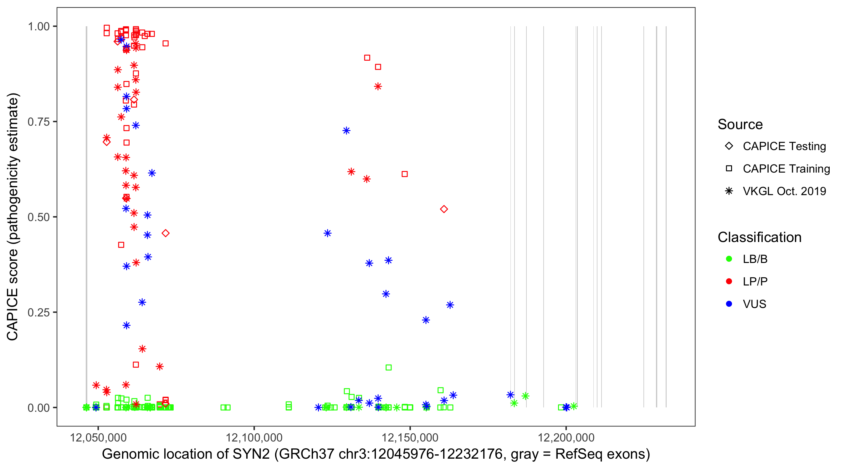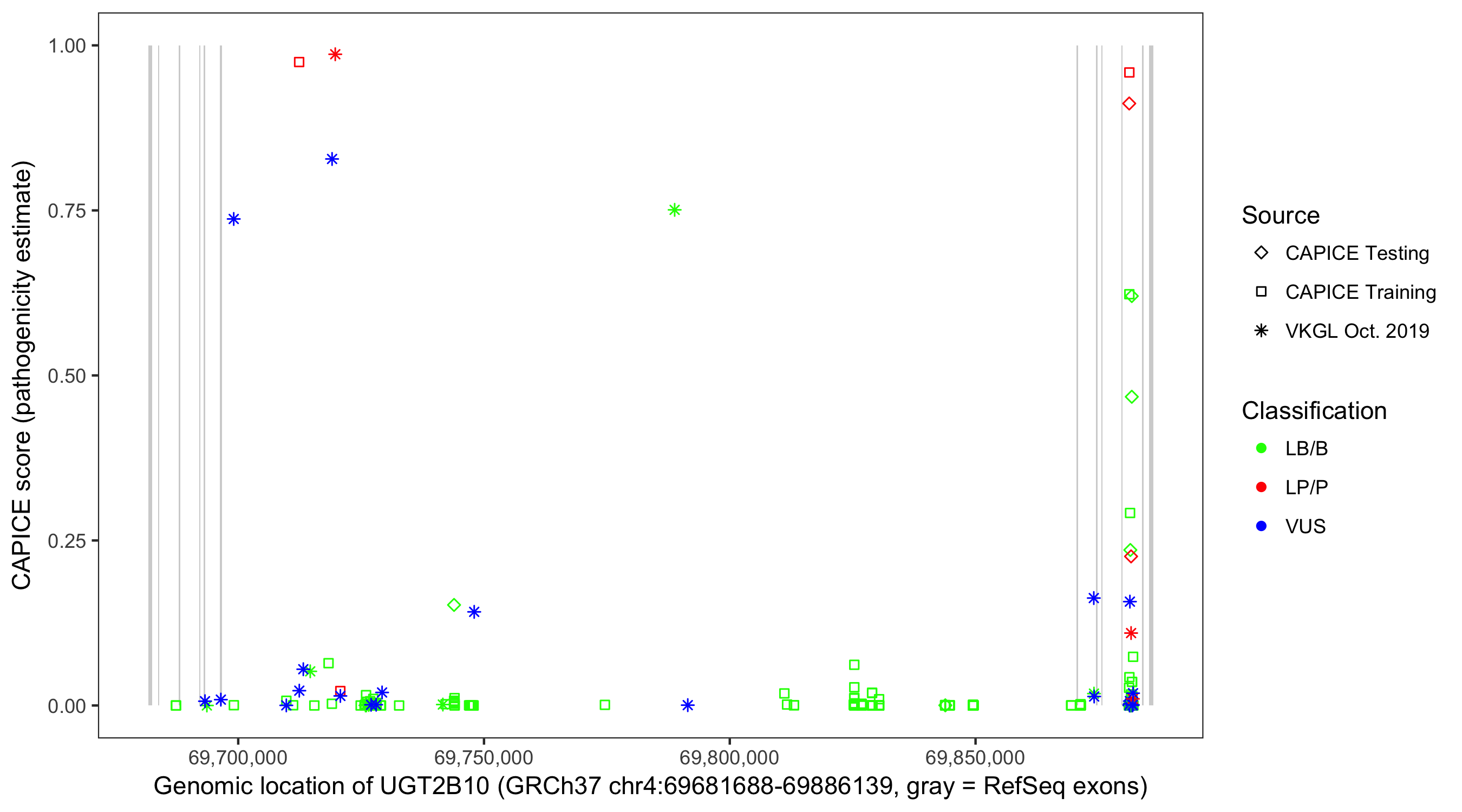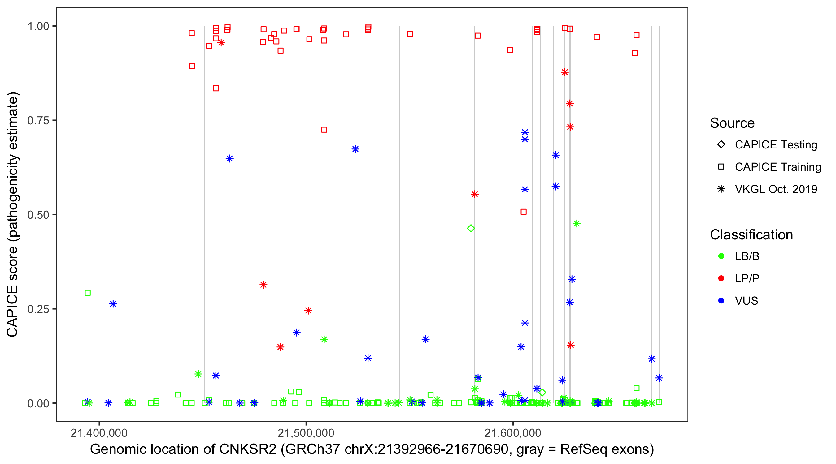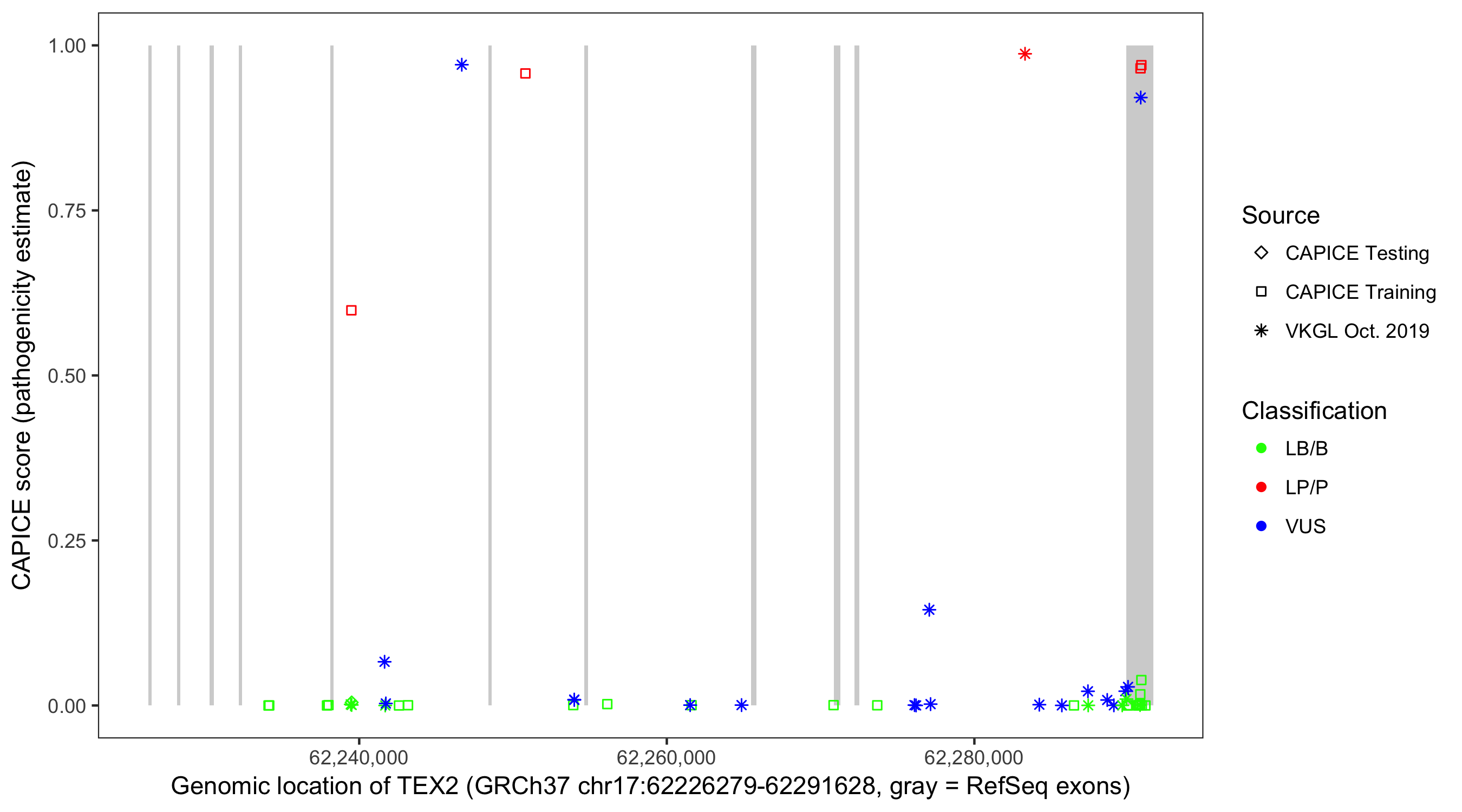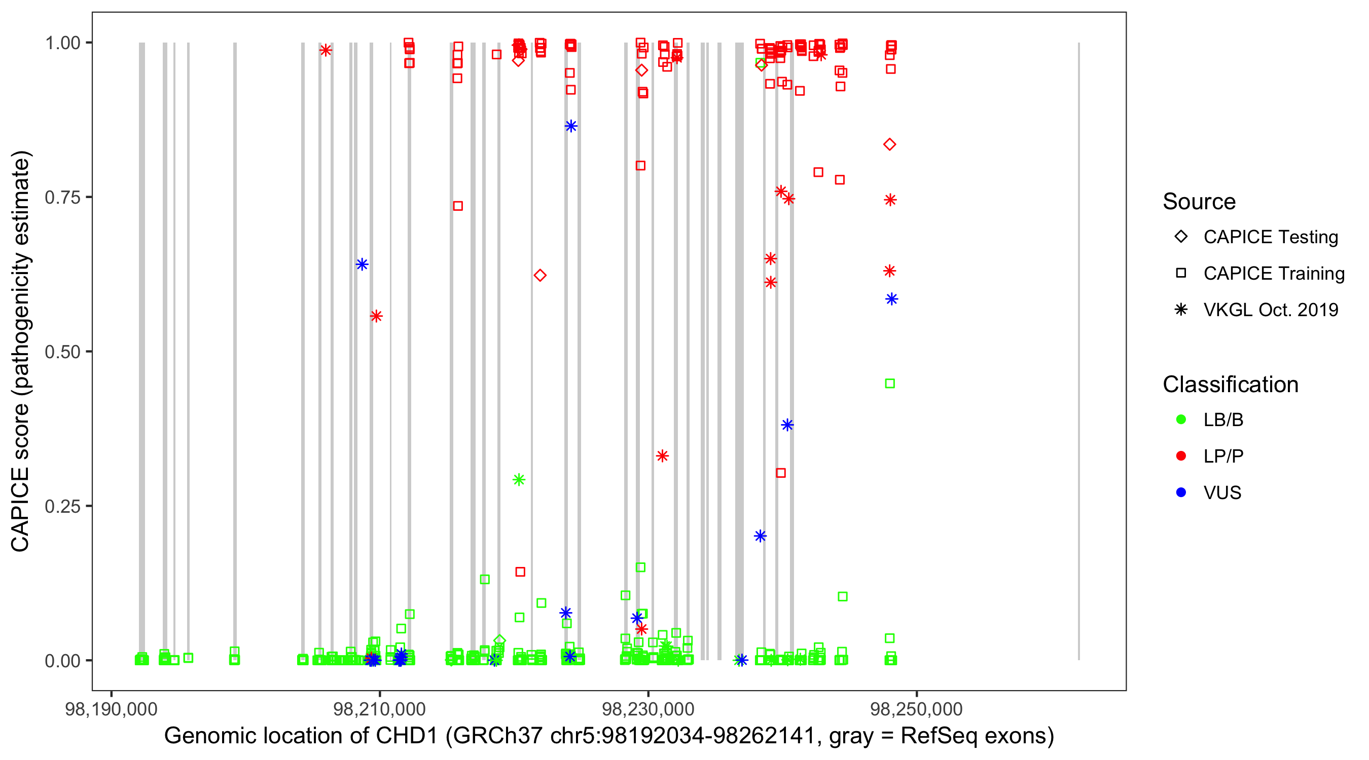 Shown are CAPICE train/test variants plus VKGL Oct 2019.