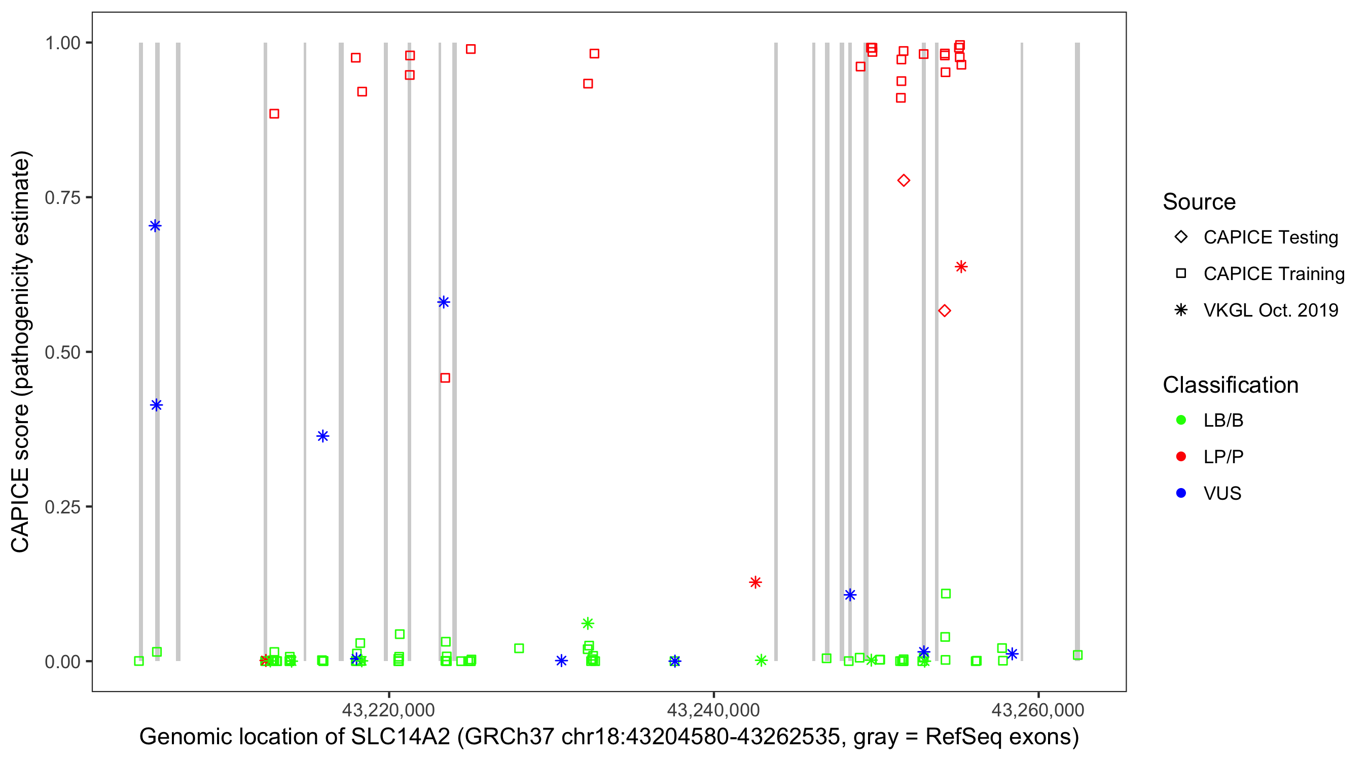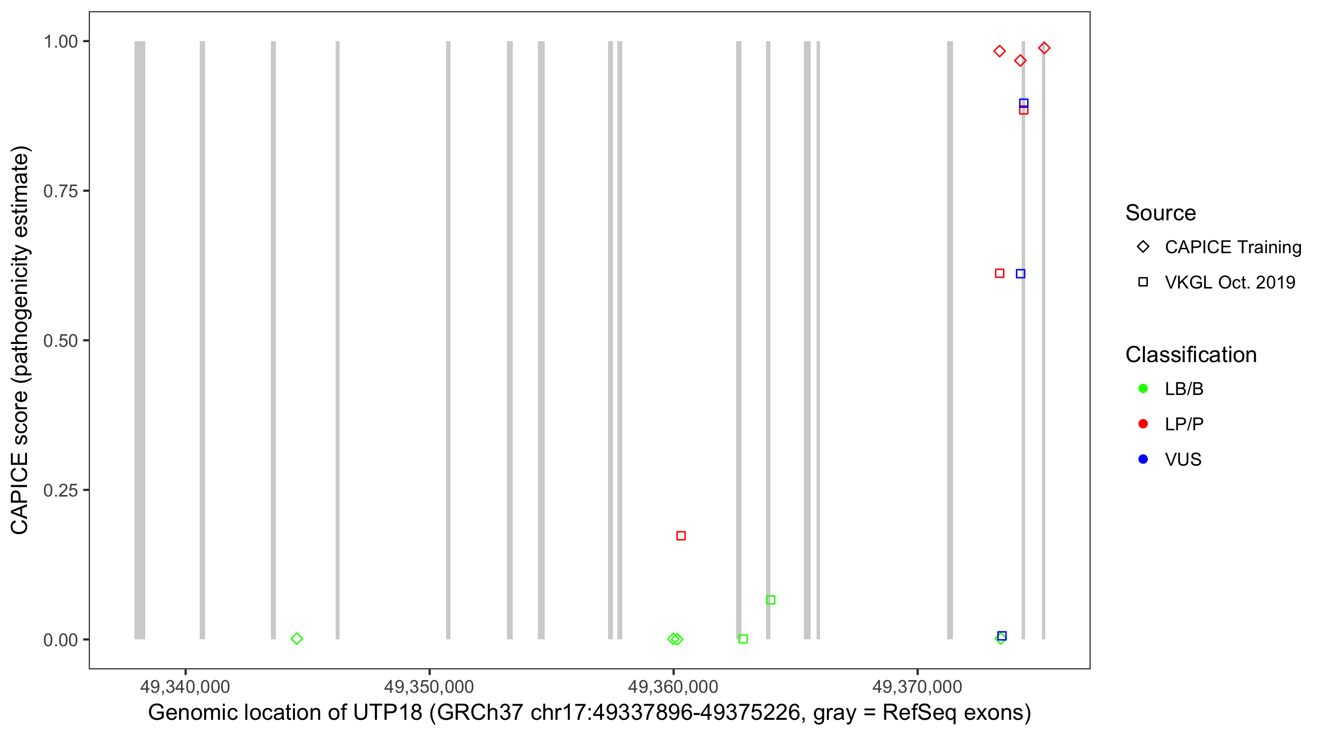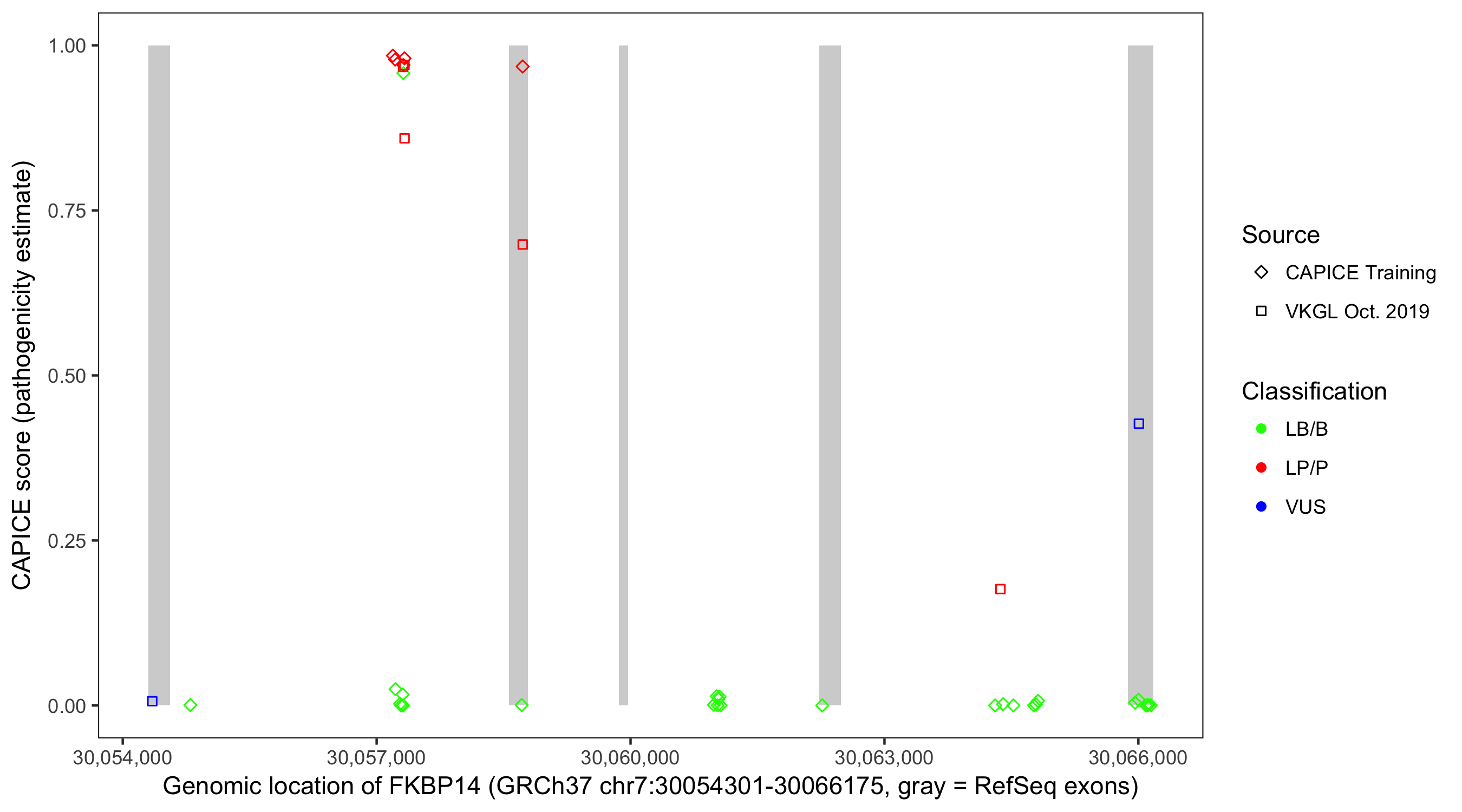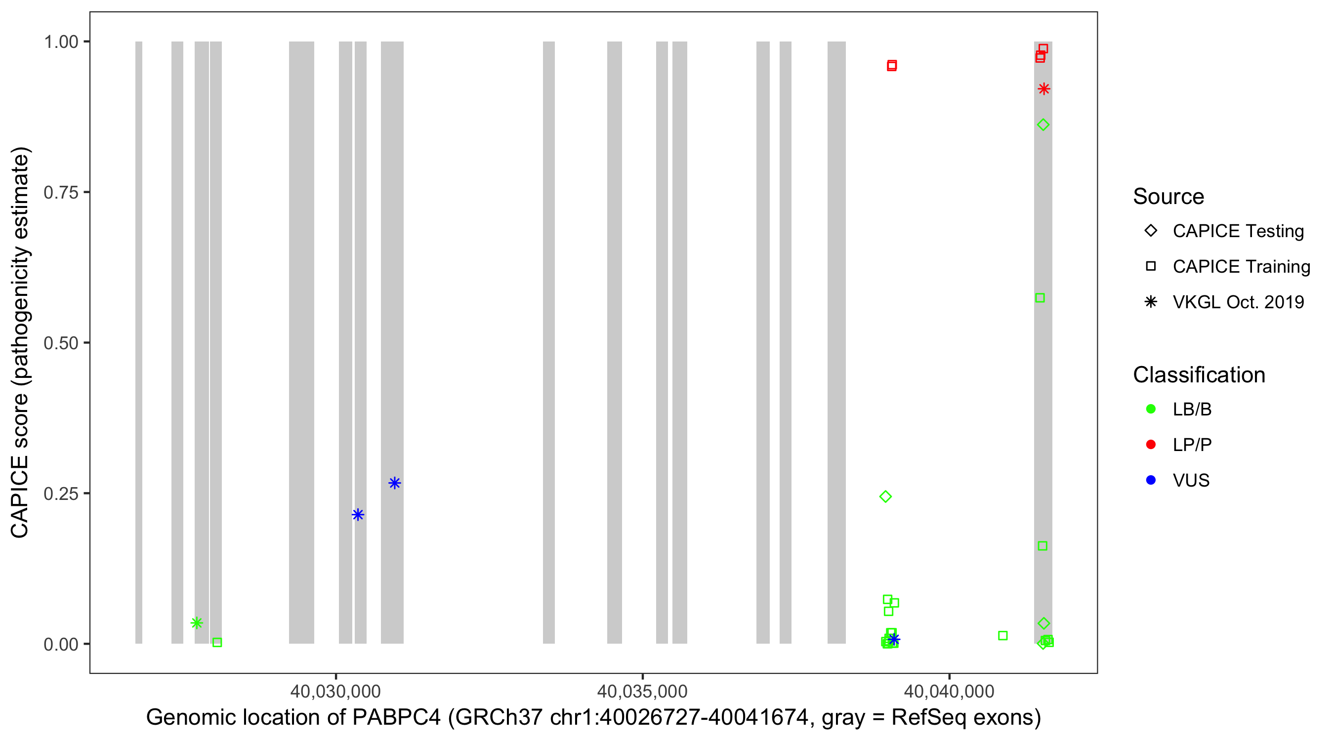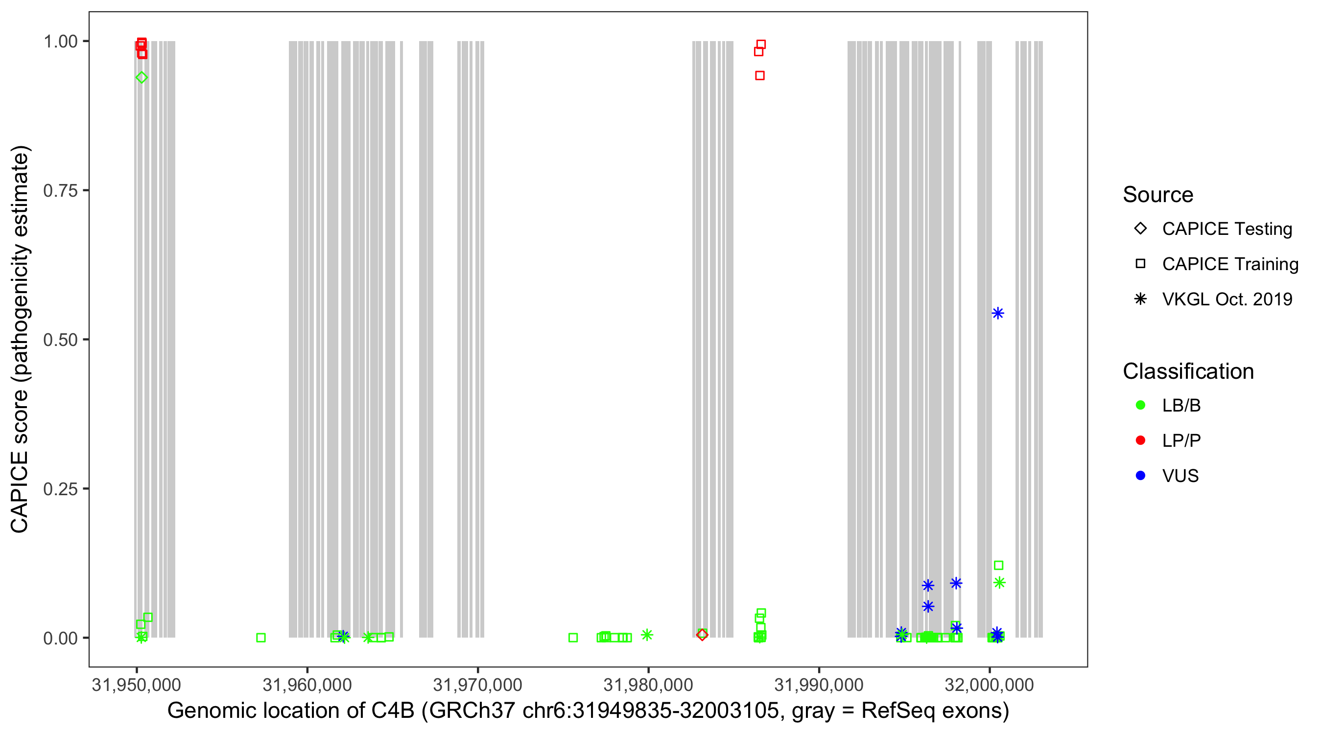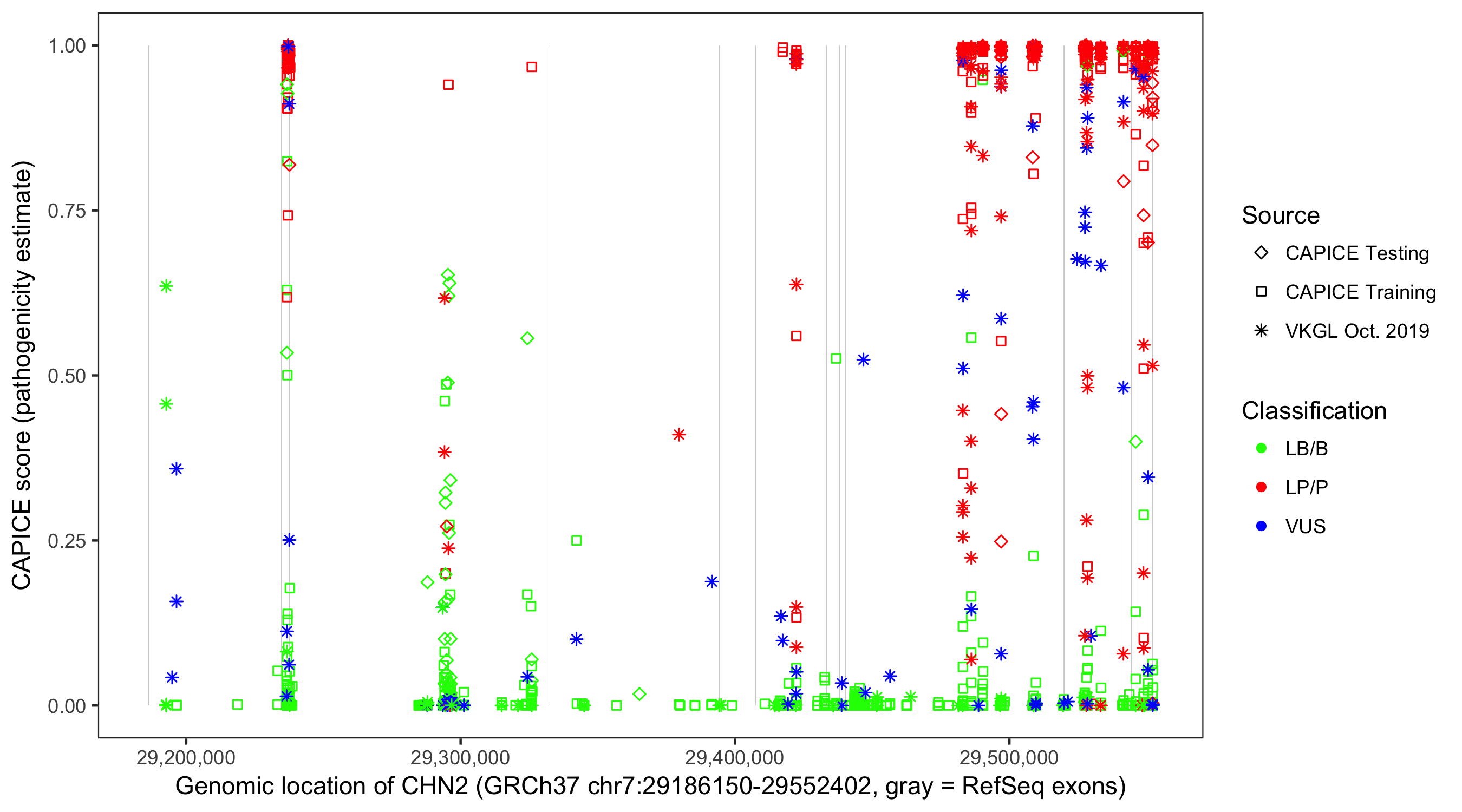 Shown are CAPICE train/test variants plus VKGL Oct 2019.