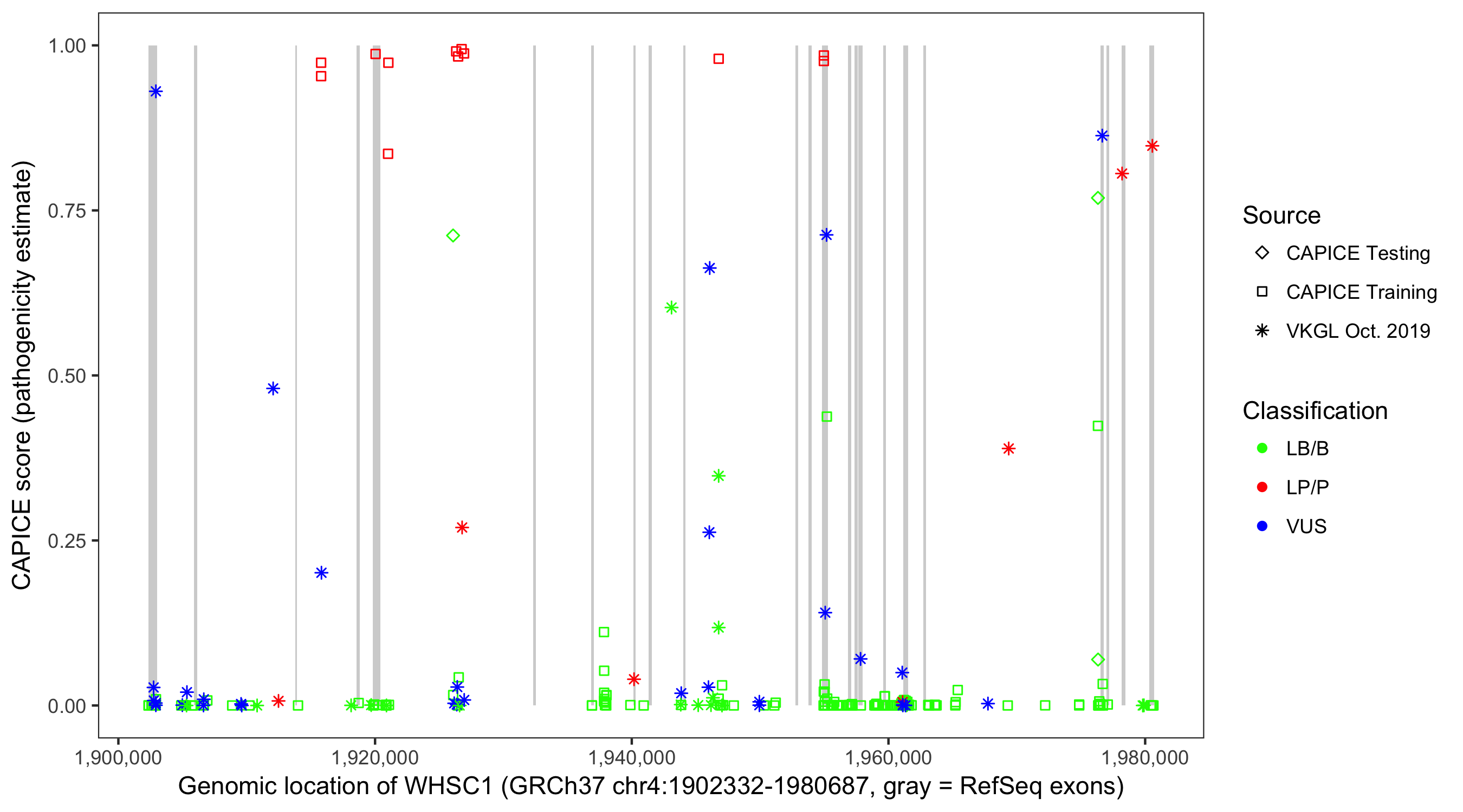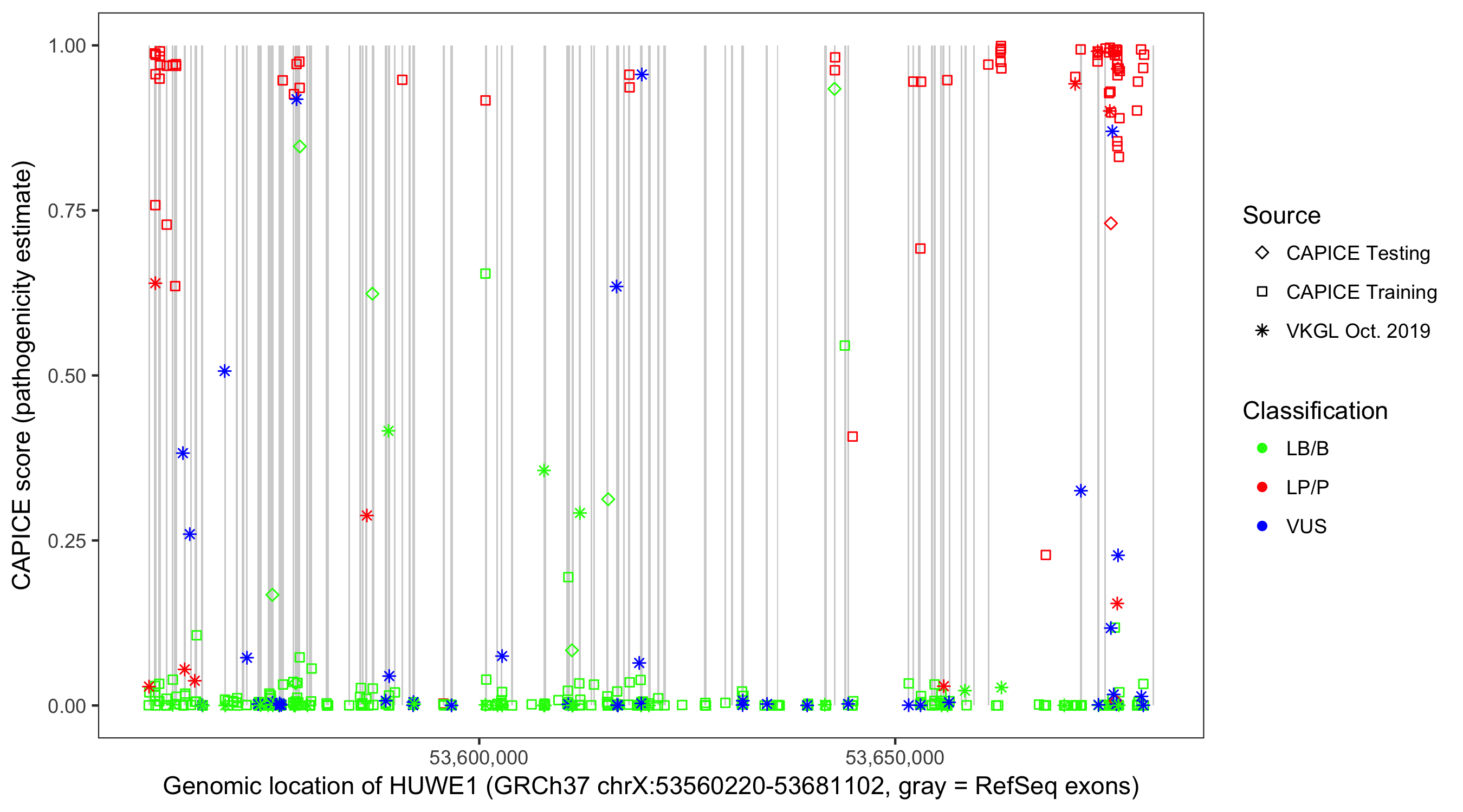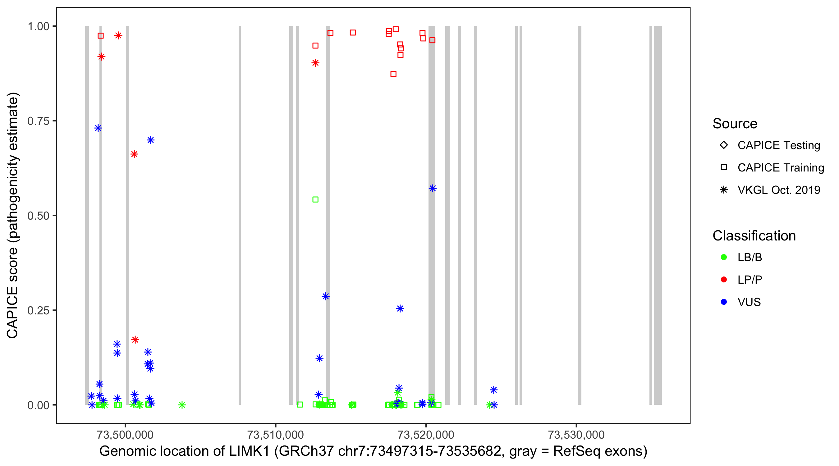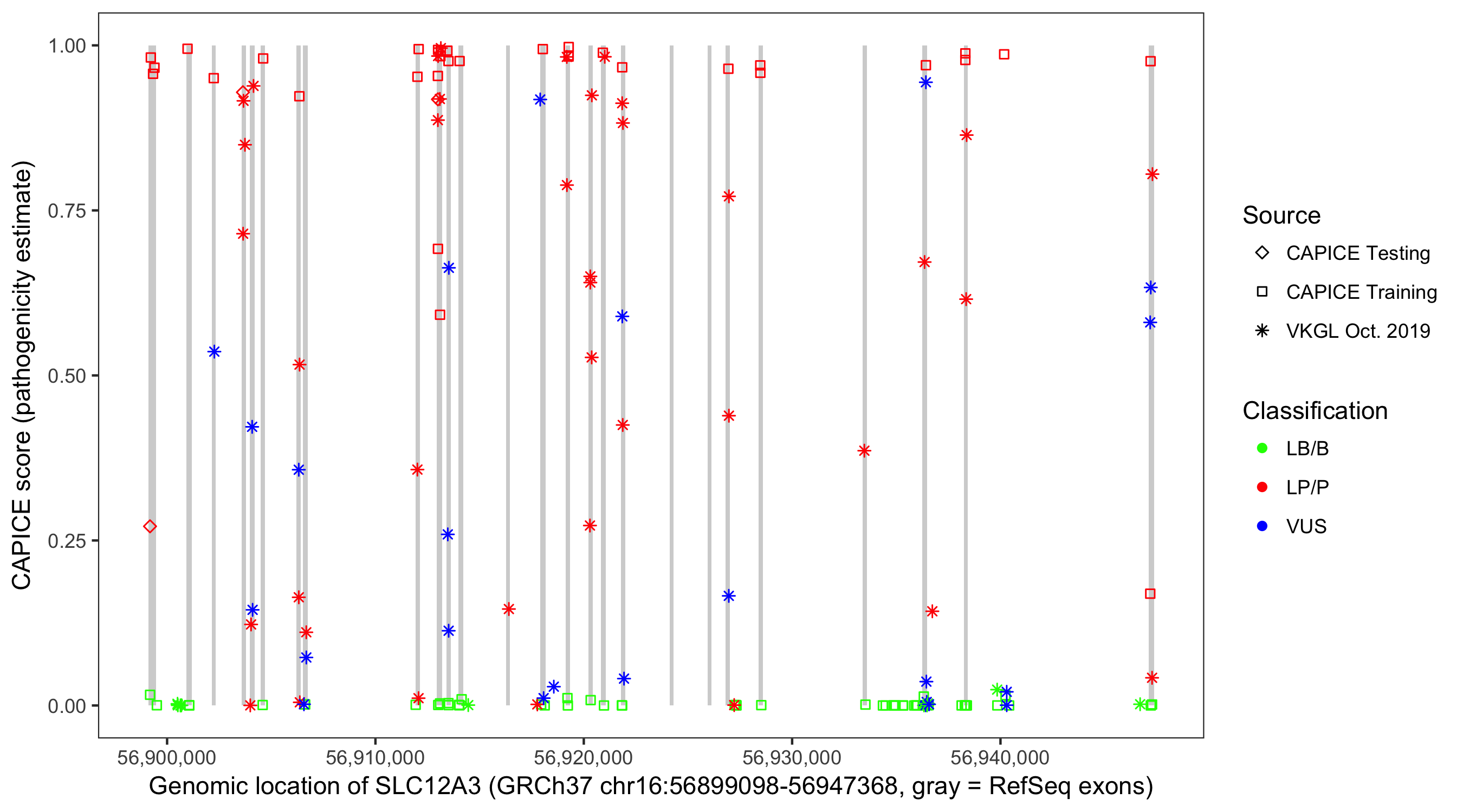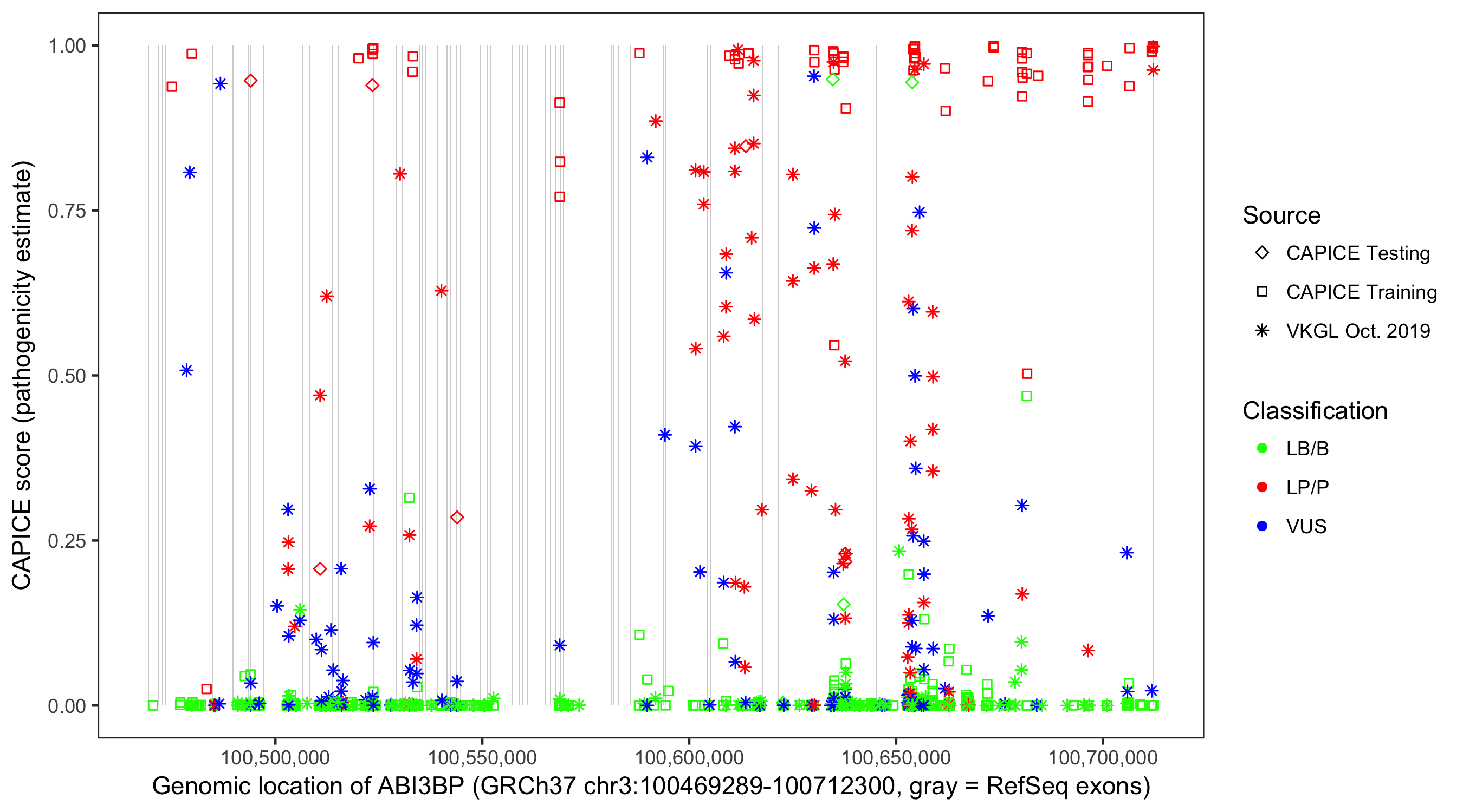 Shown are CAPICE train/test variants plus VKGL Oct 2019.