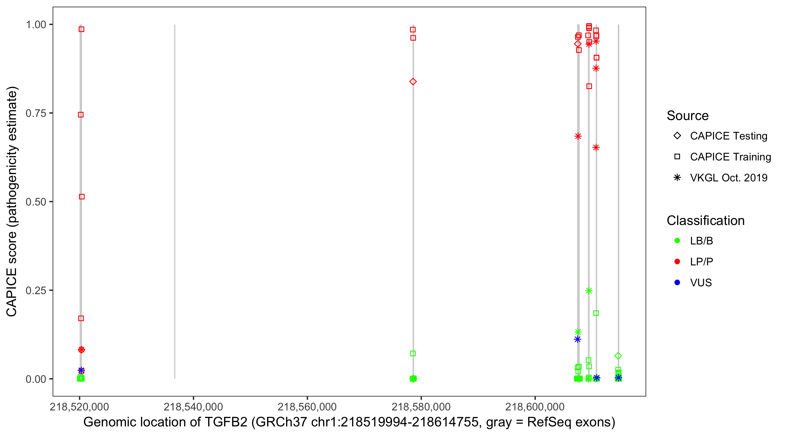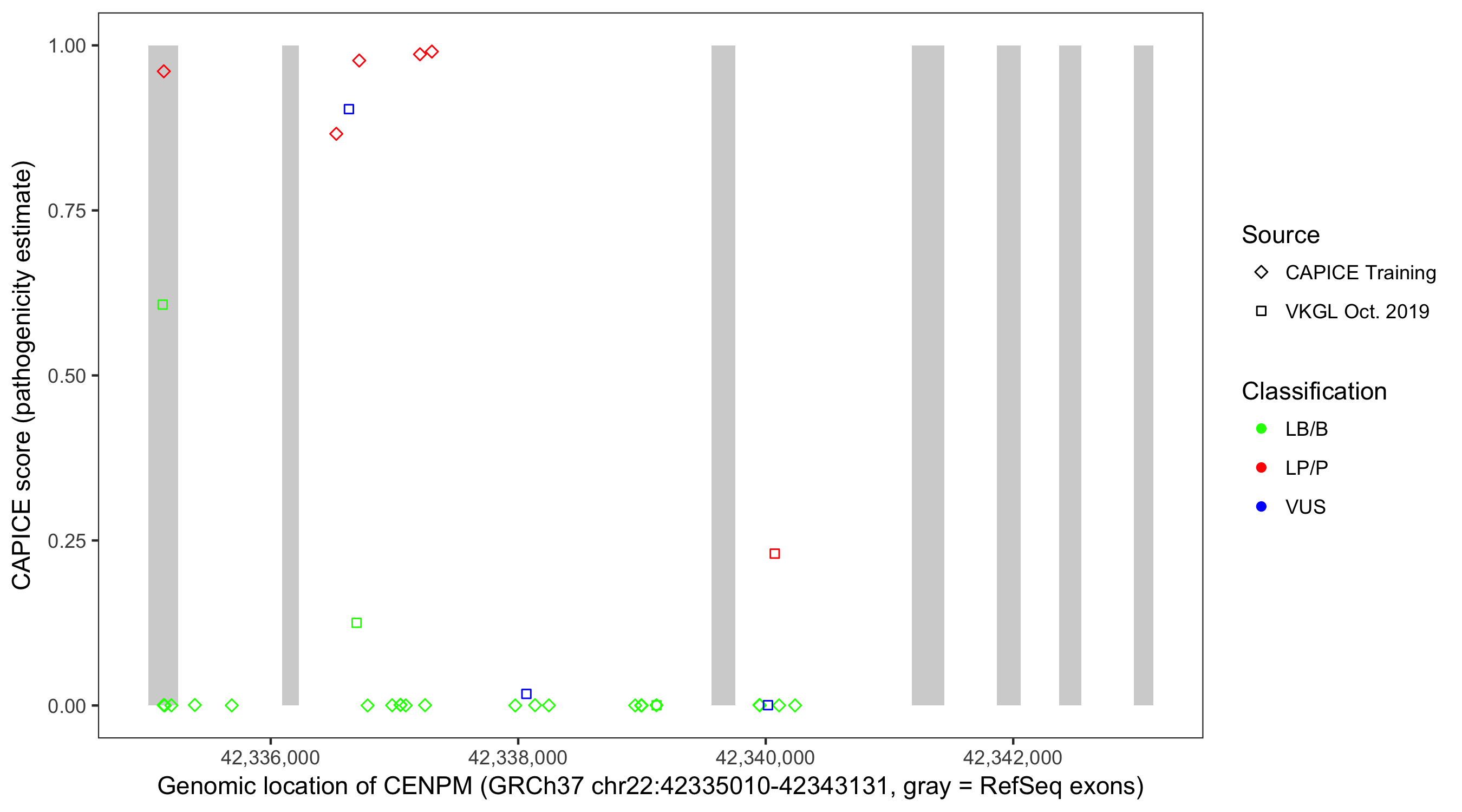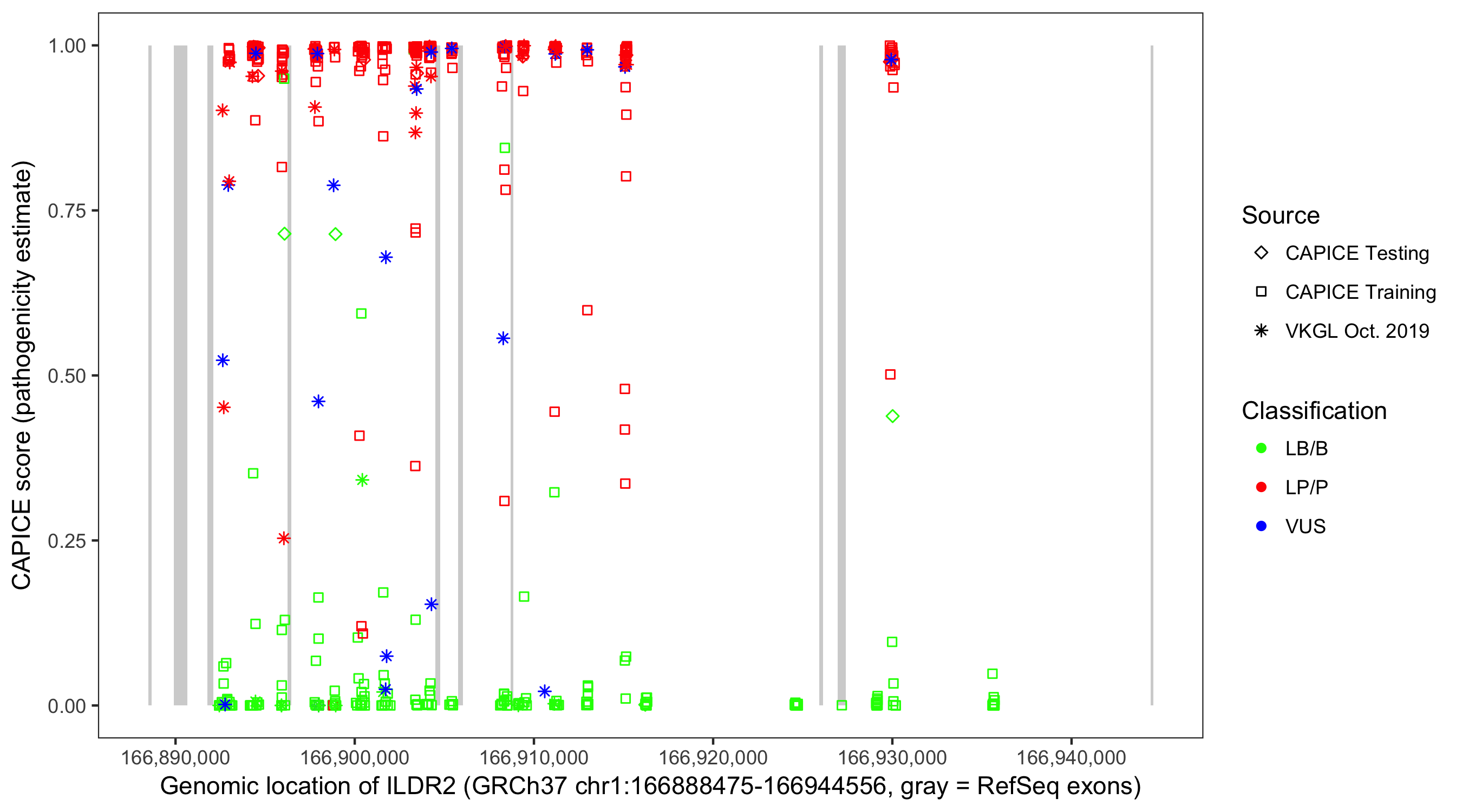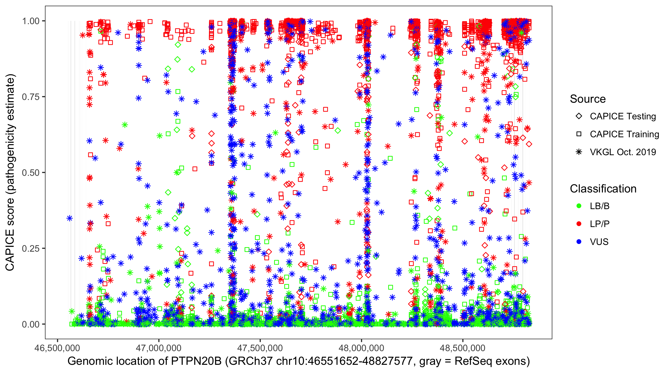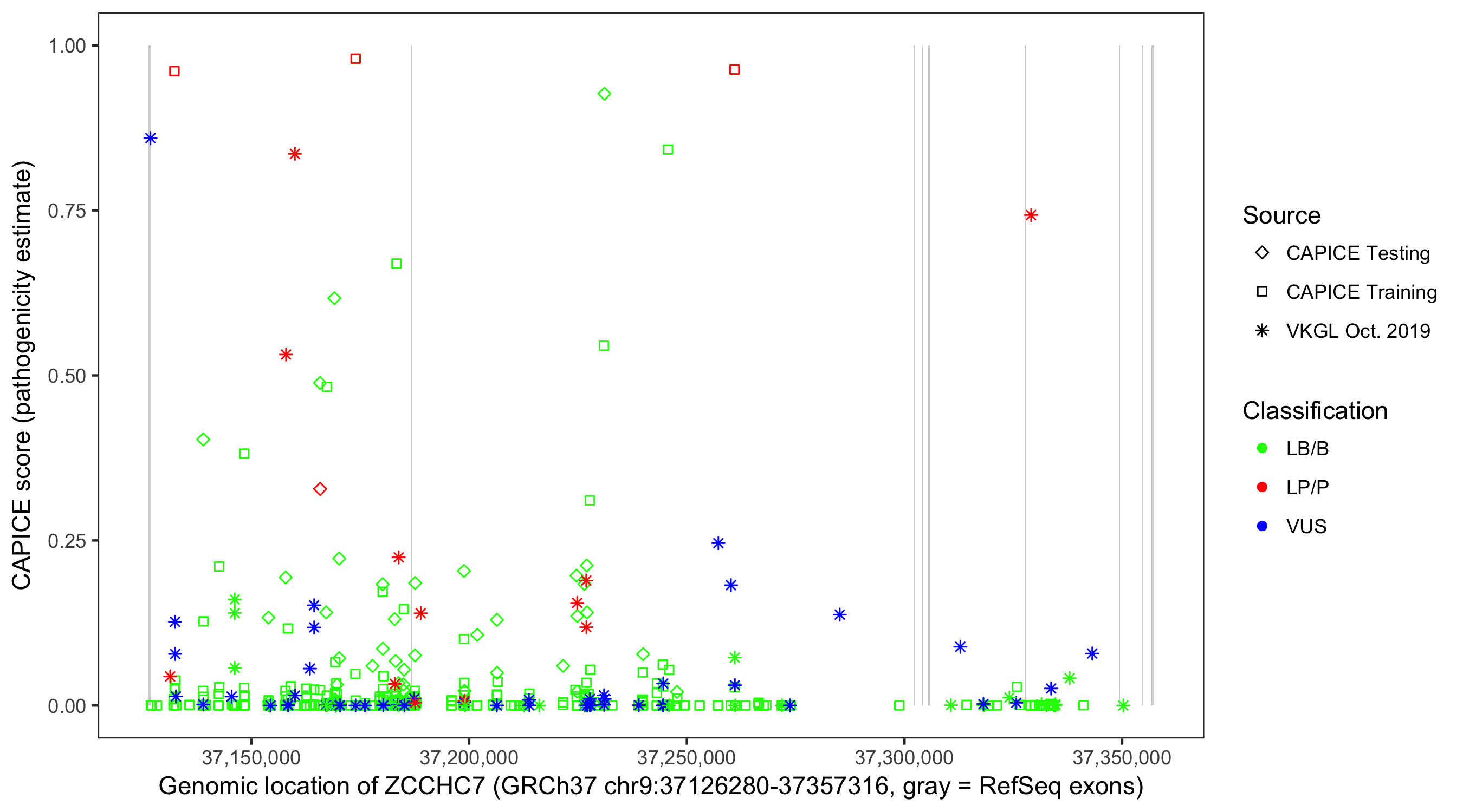 Shown are CAPICE train/test variants plus VKGL Oct 2019.