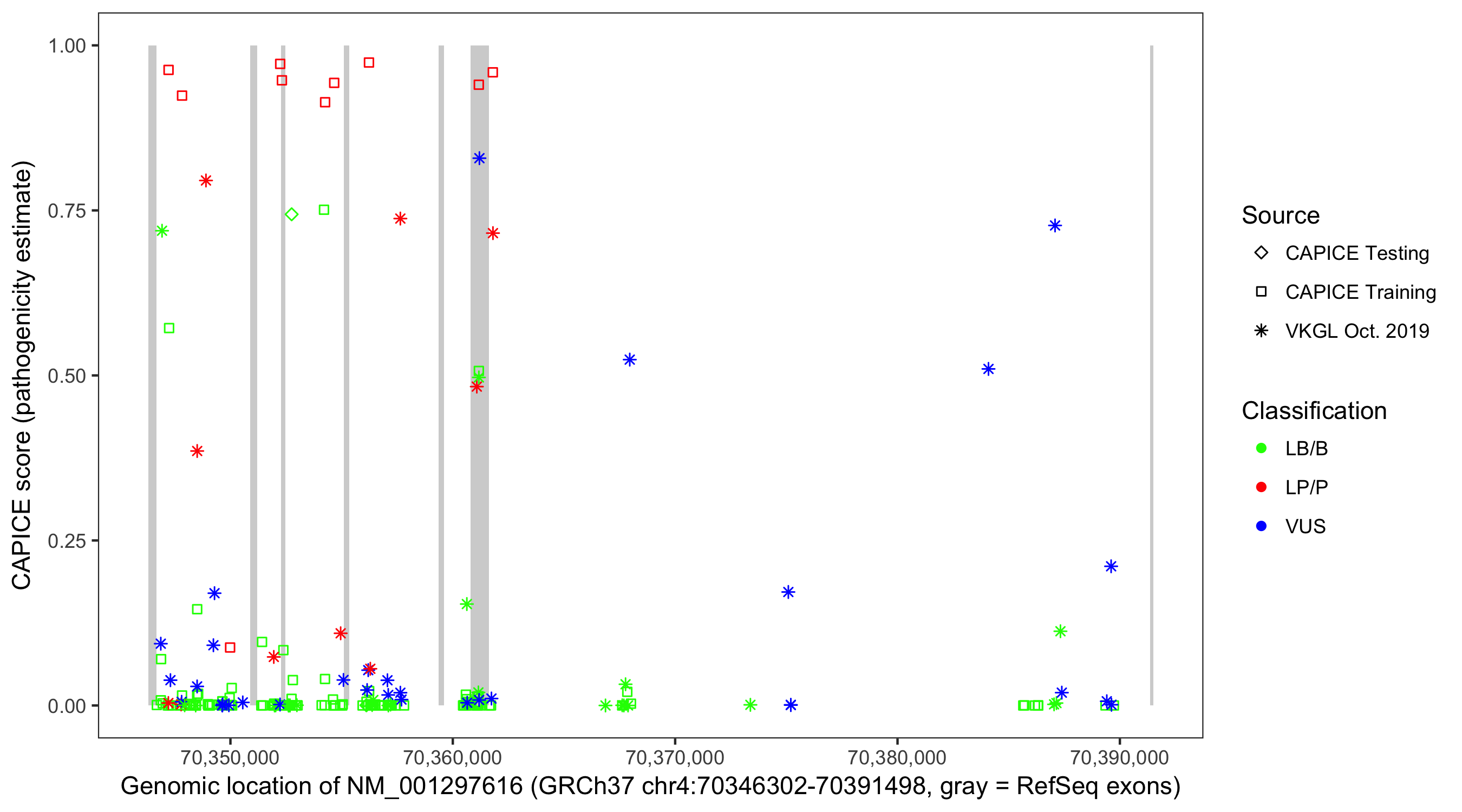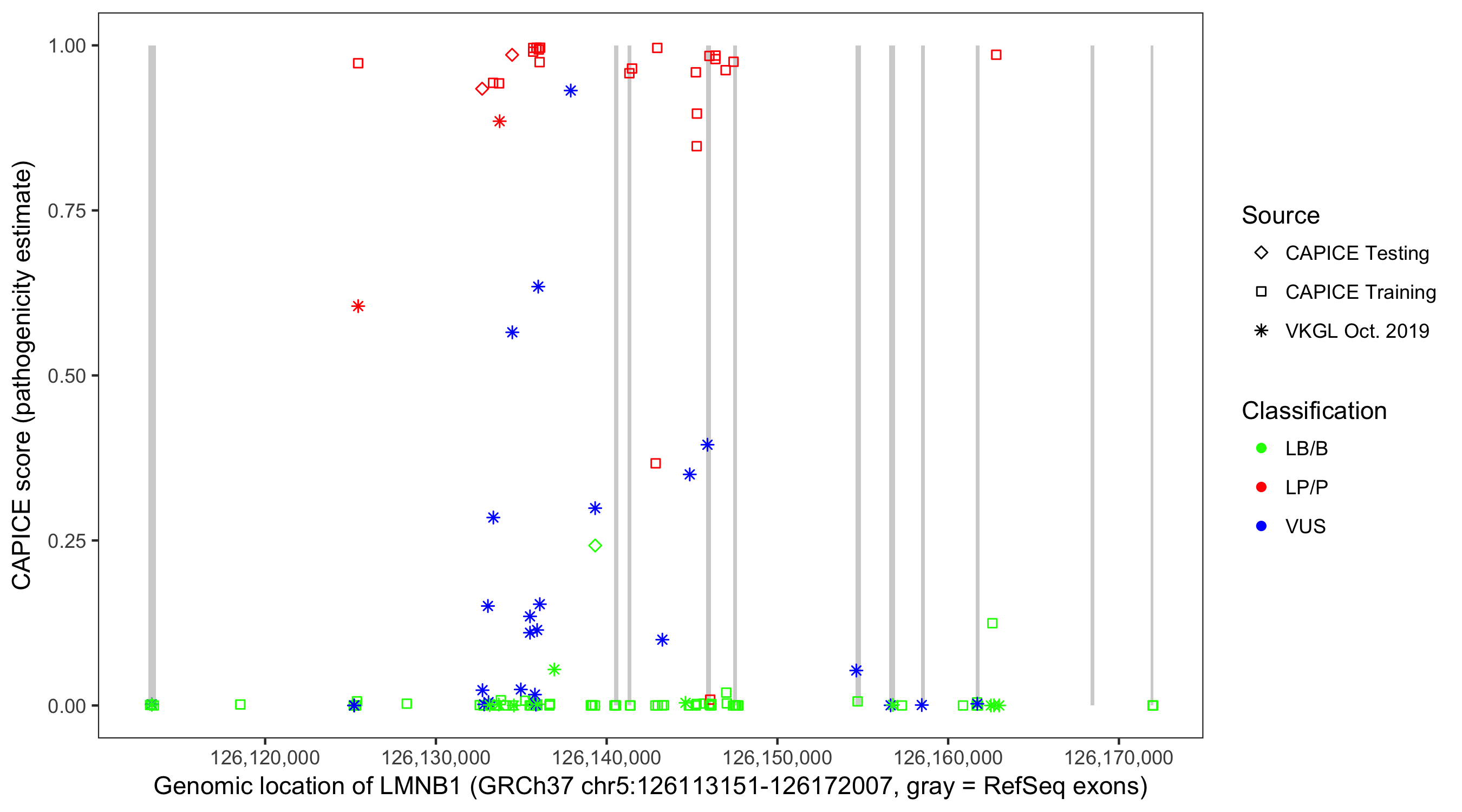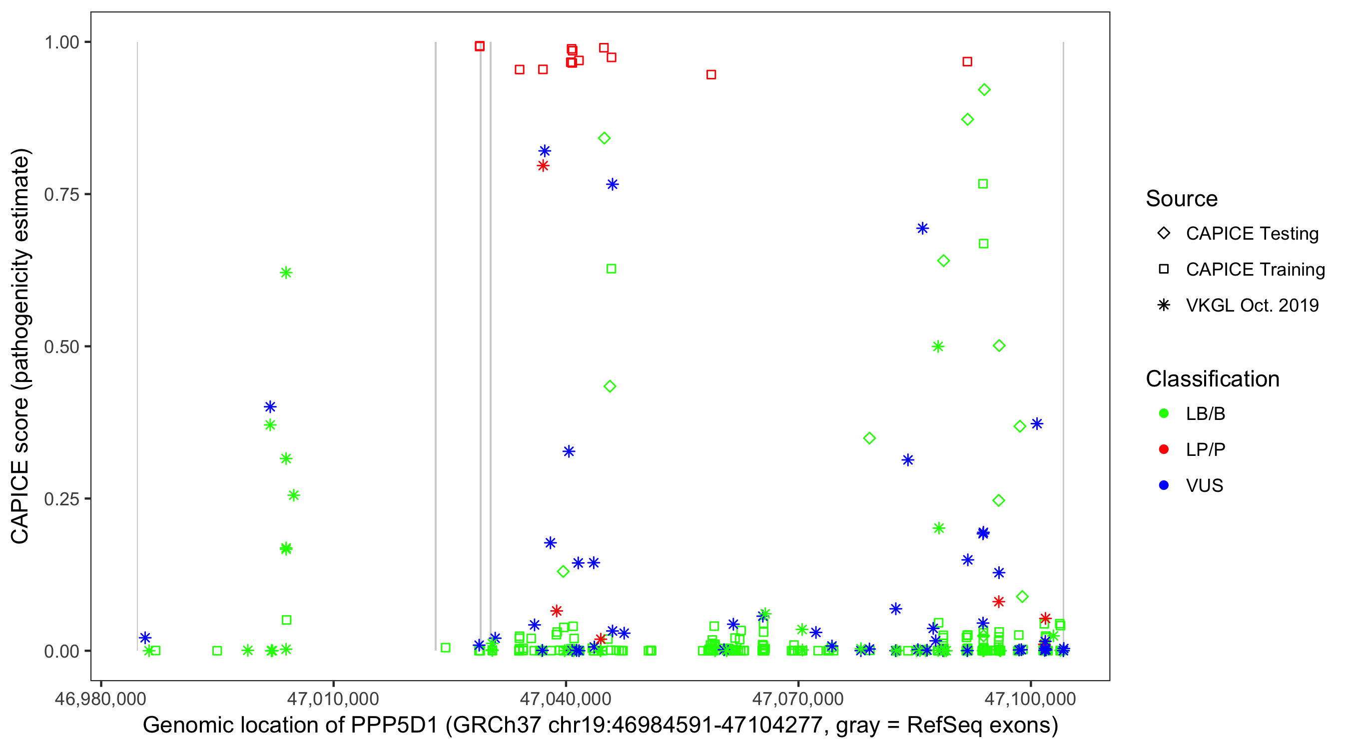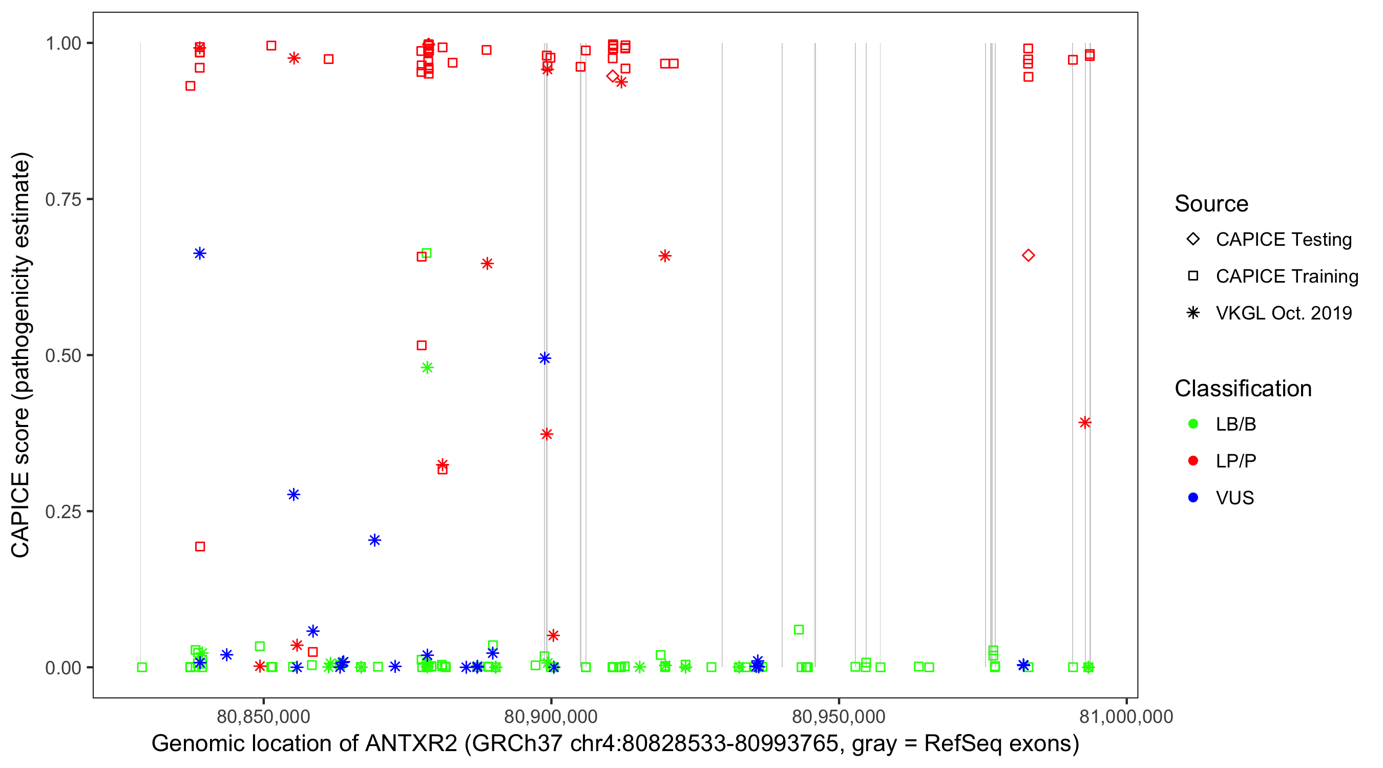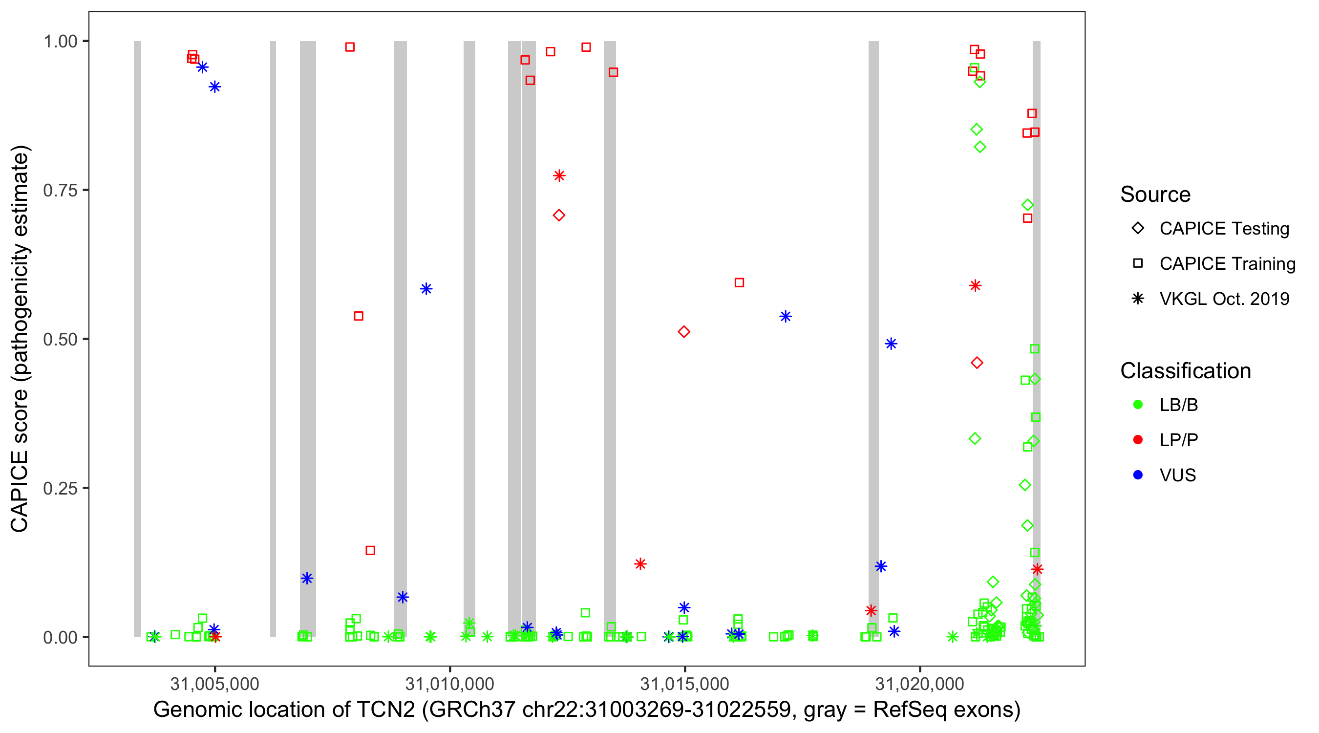 Shown are CAPICE train/test variants plus VKGL Oct 2019.
