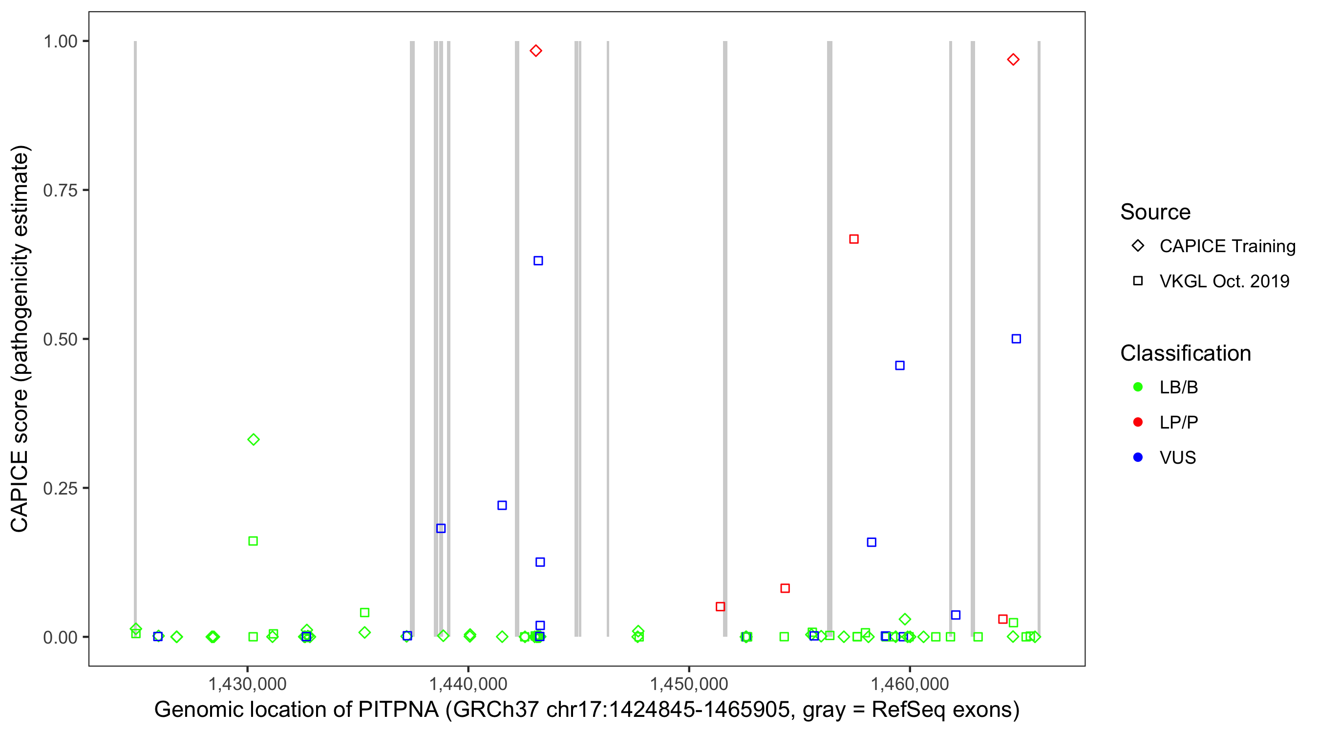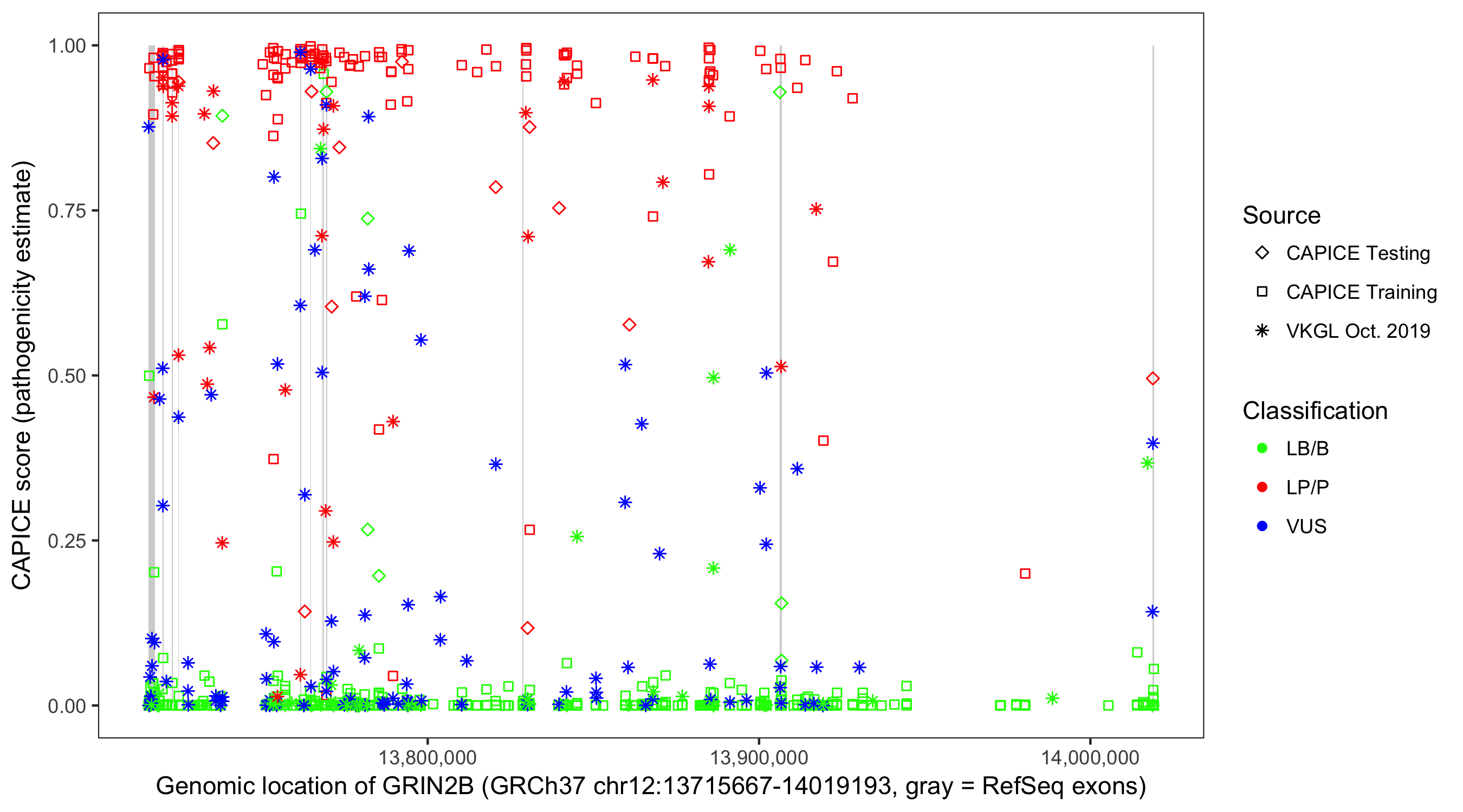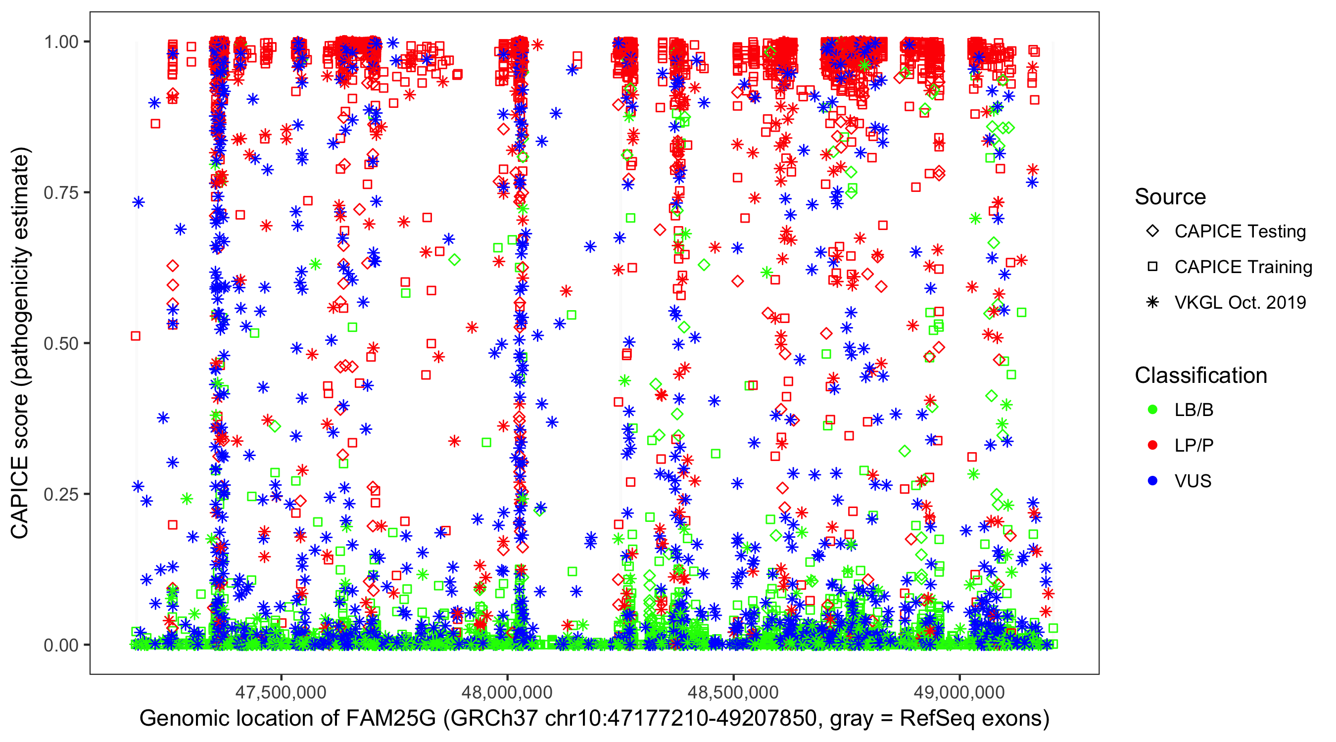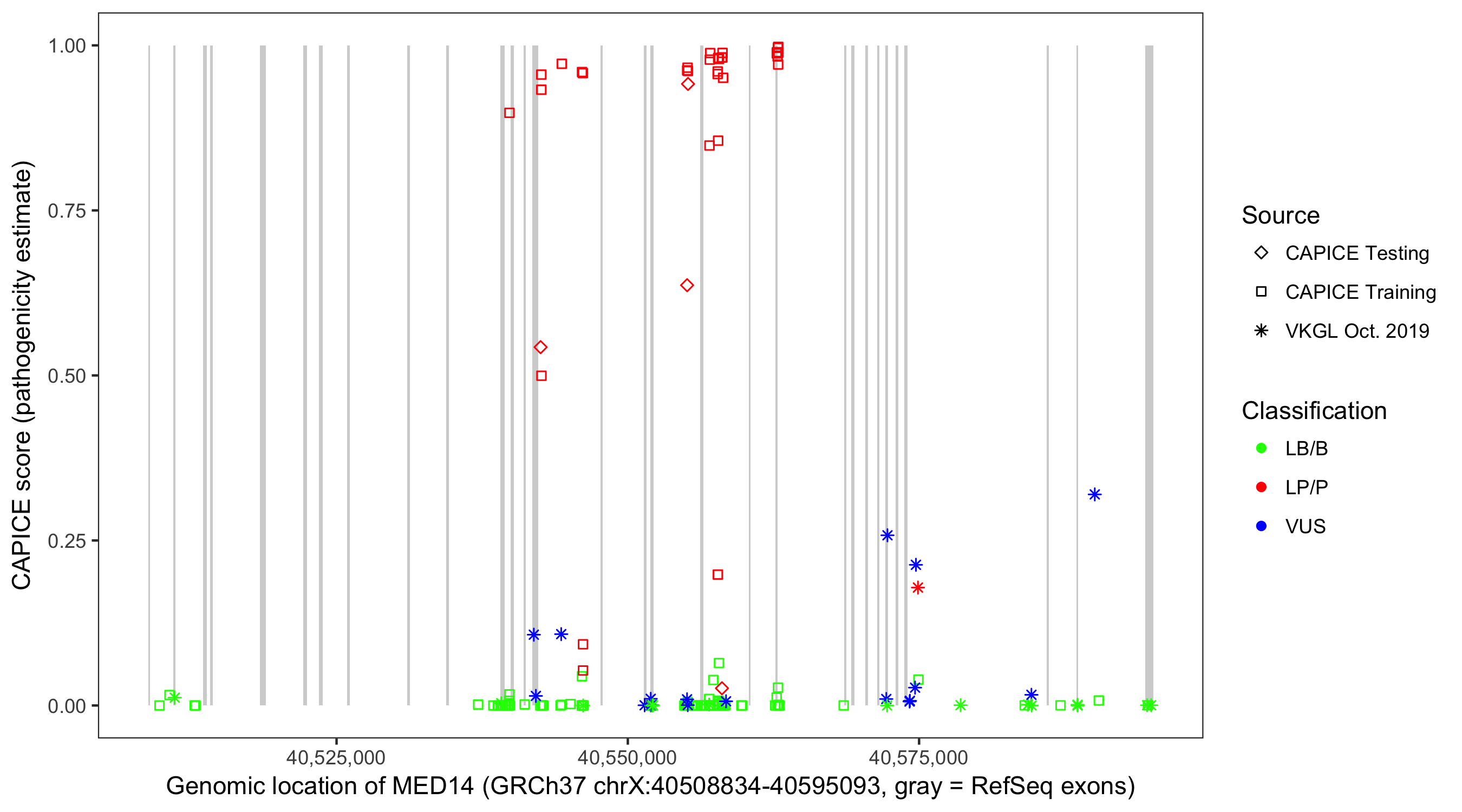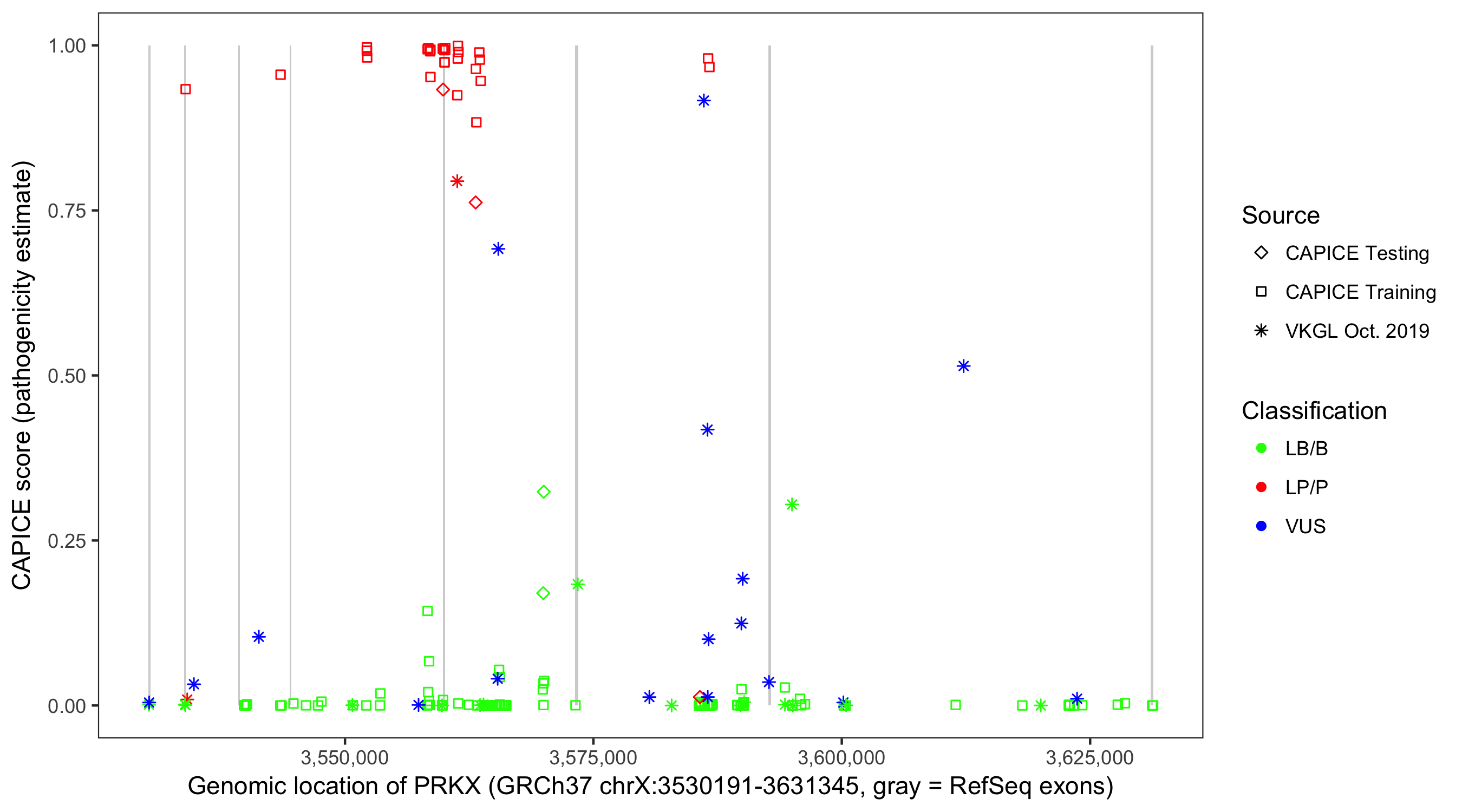 Shown are CAPICE train/test variants plus VKGL Oct 2019.