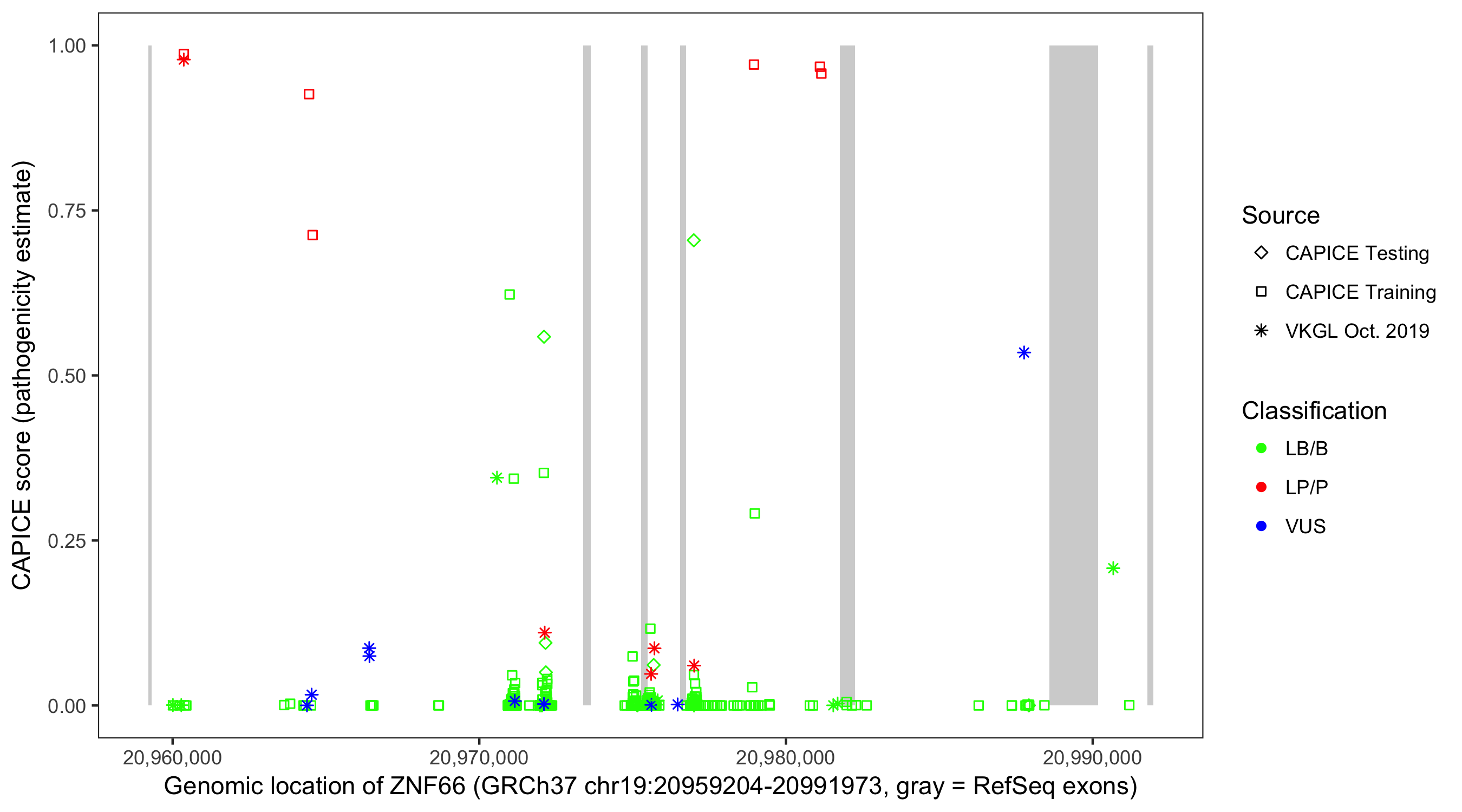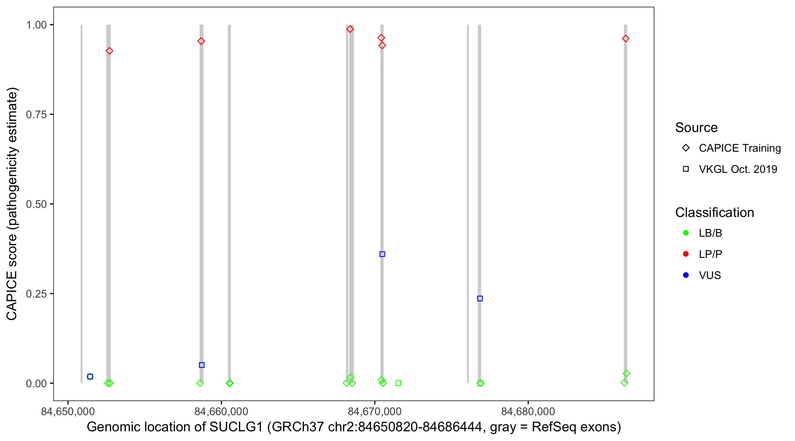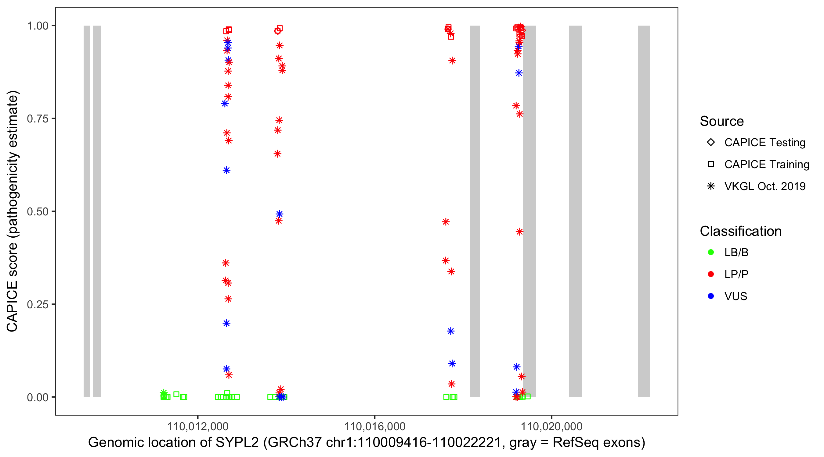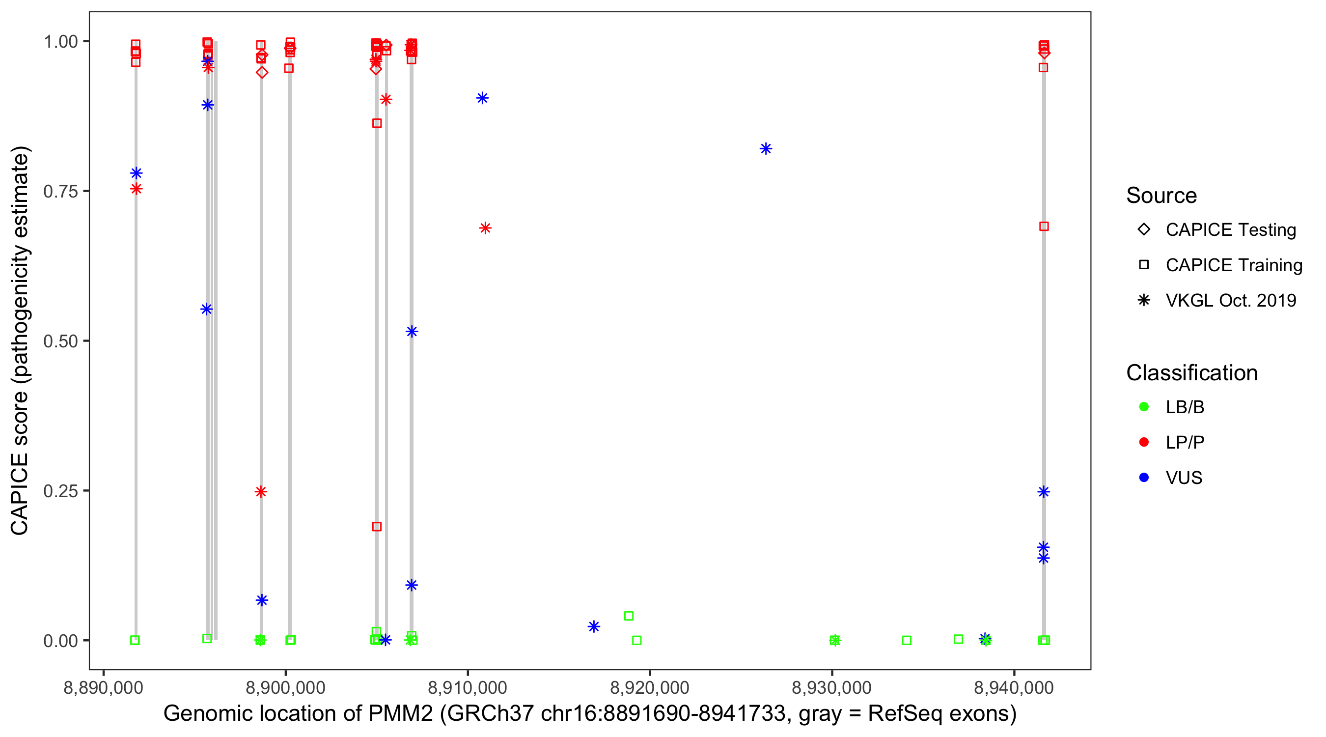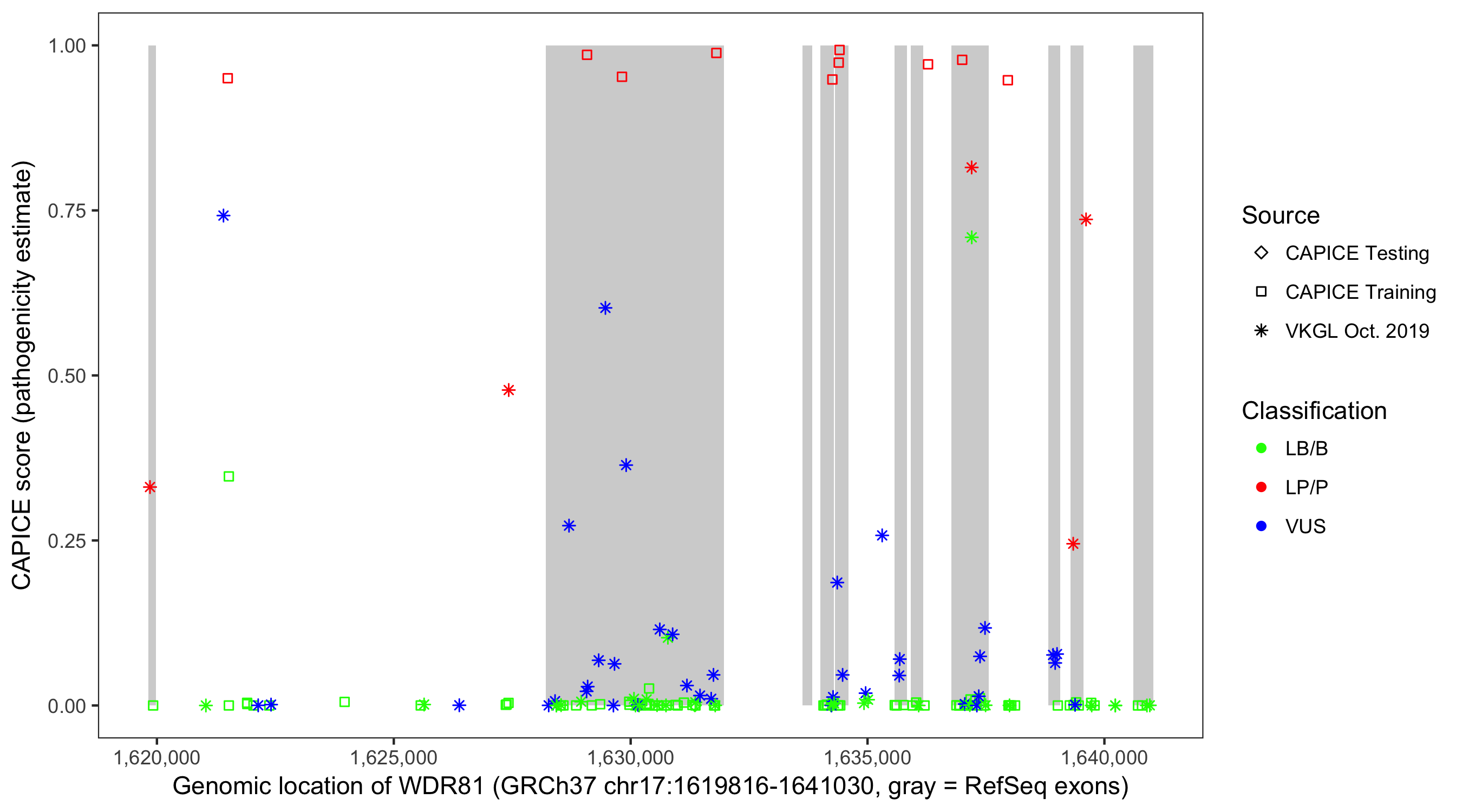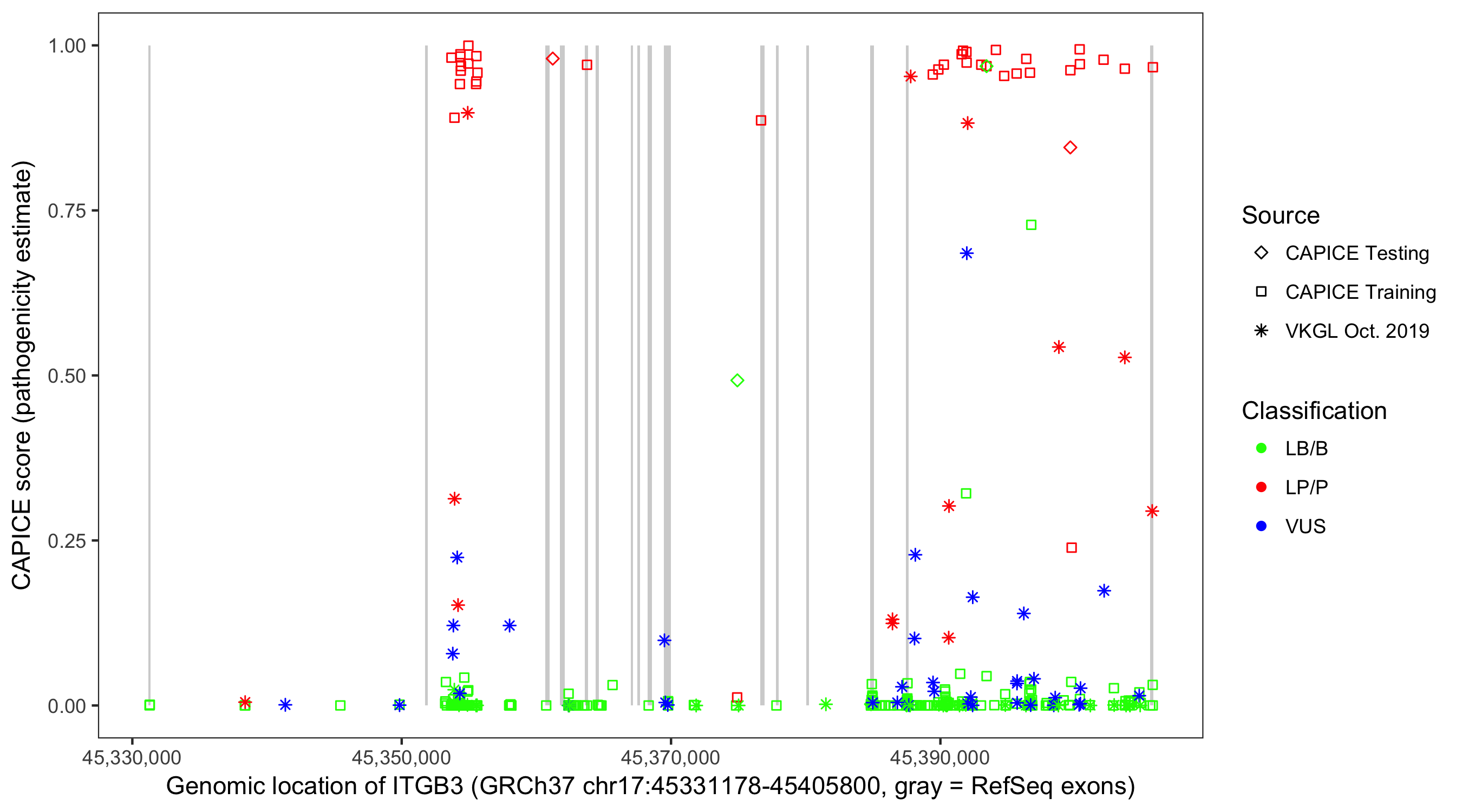 Shown are CAPICE train/test variants plus VKGL Oct 2019.