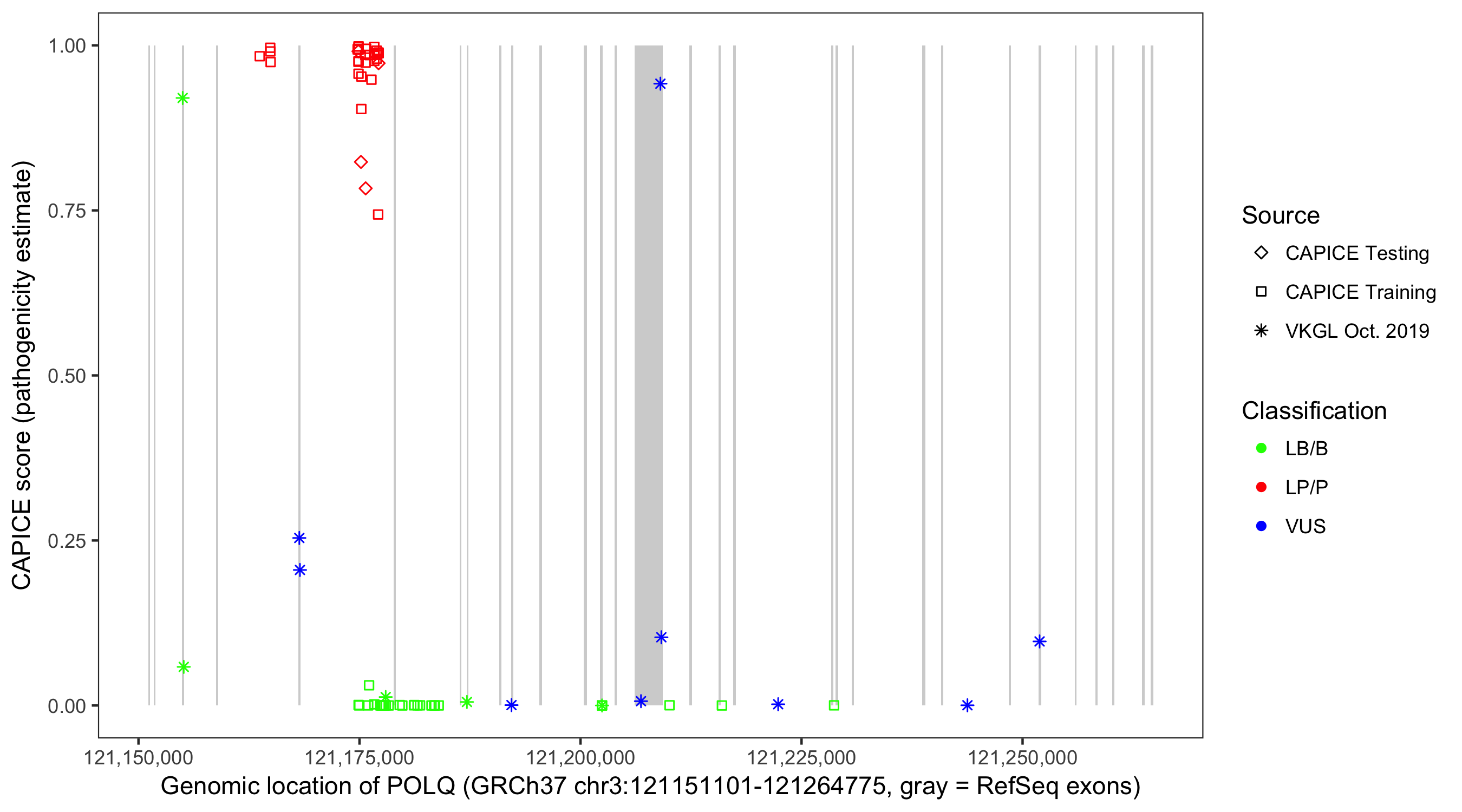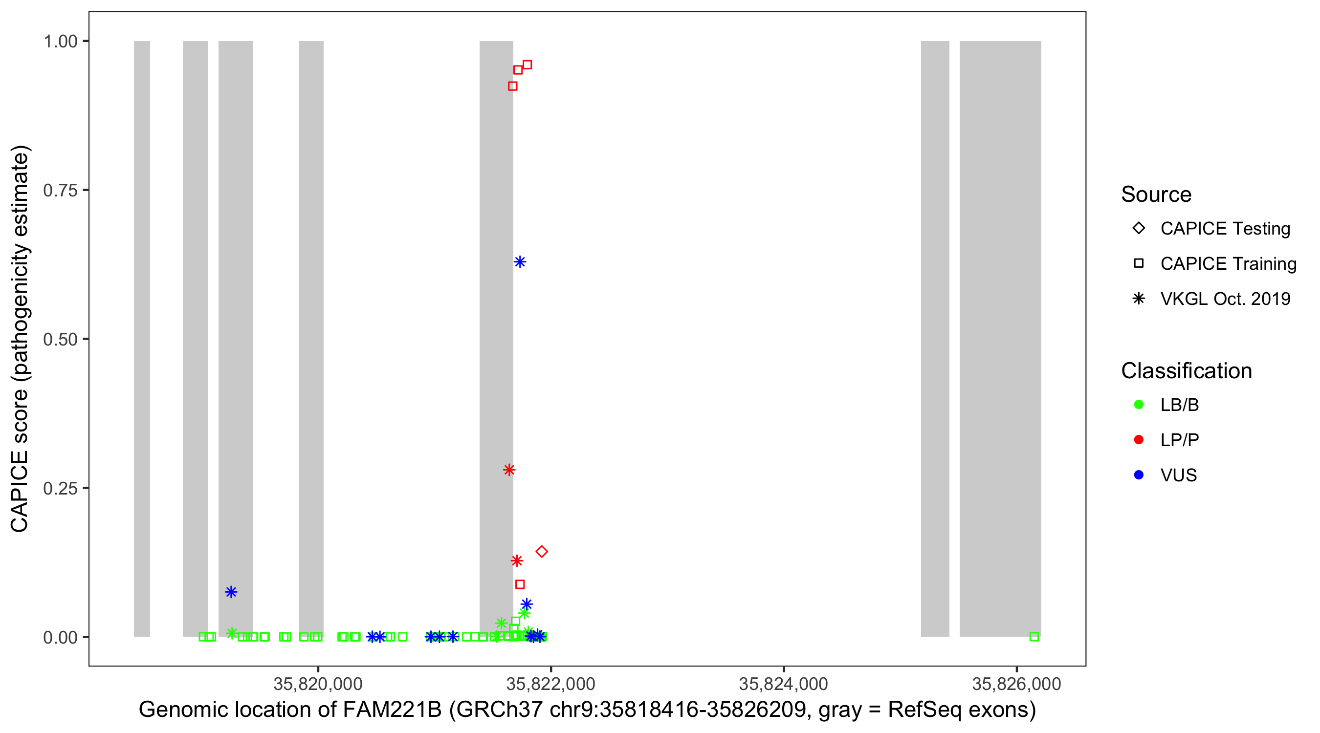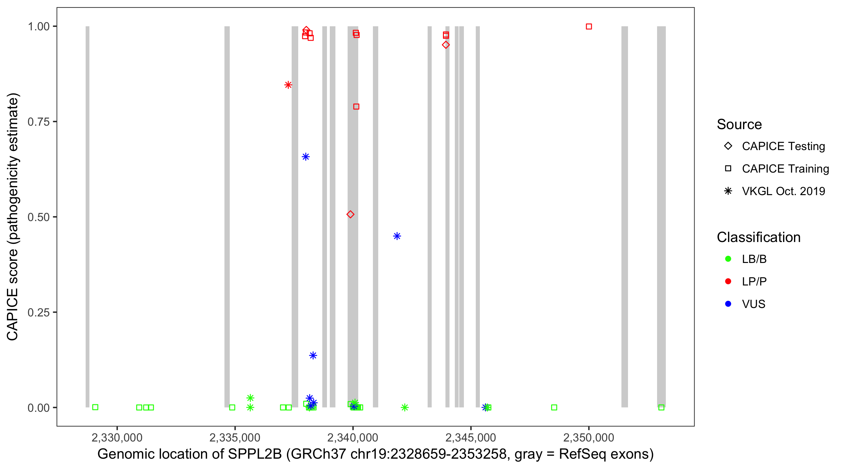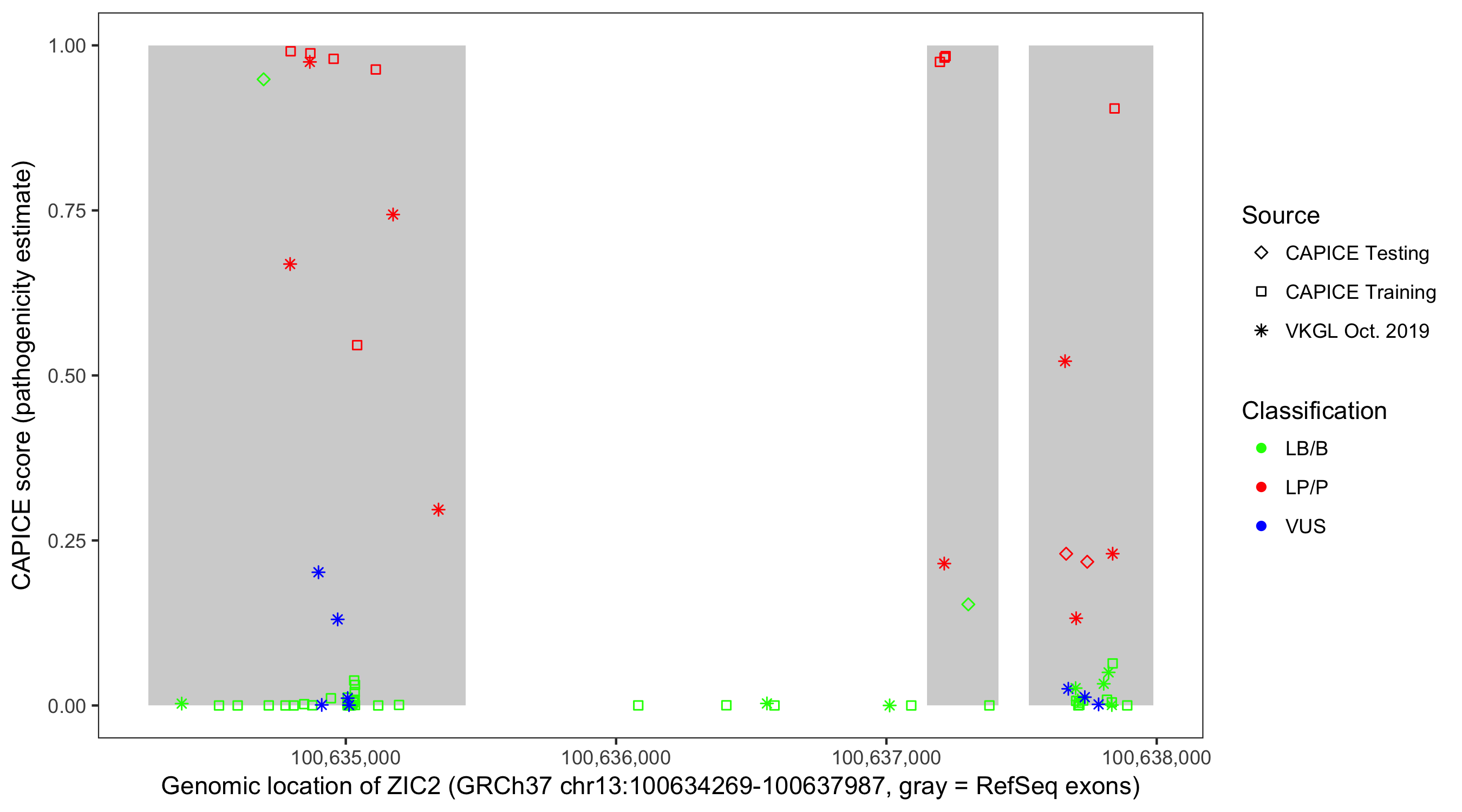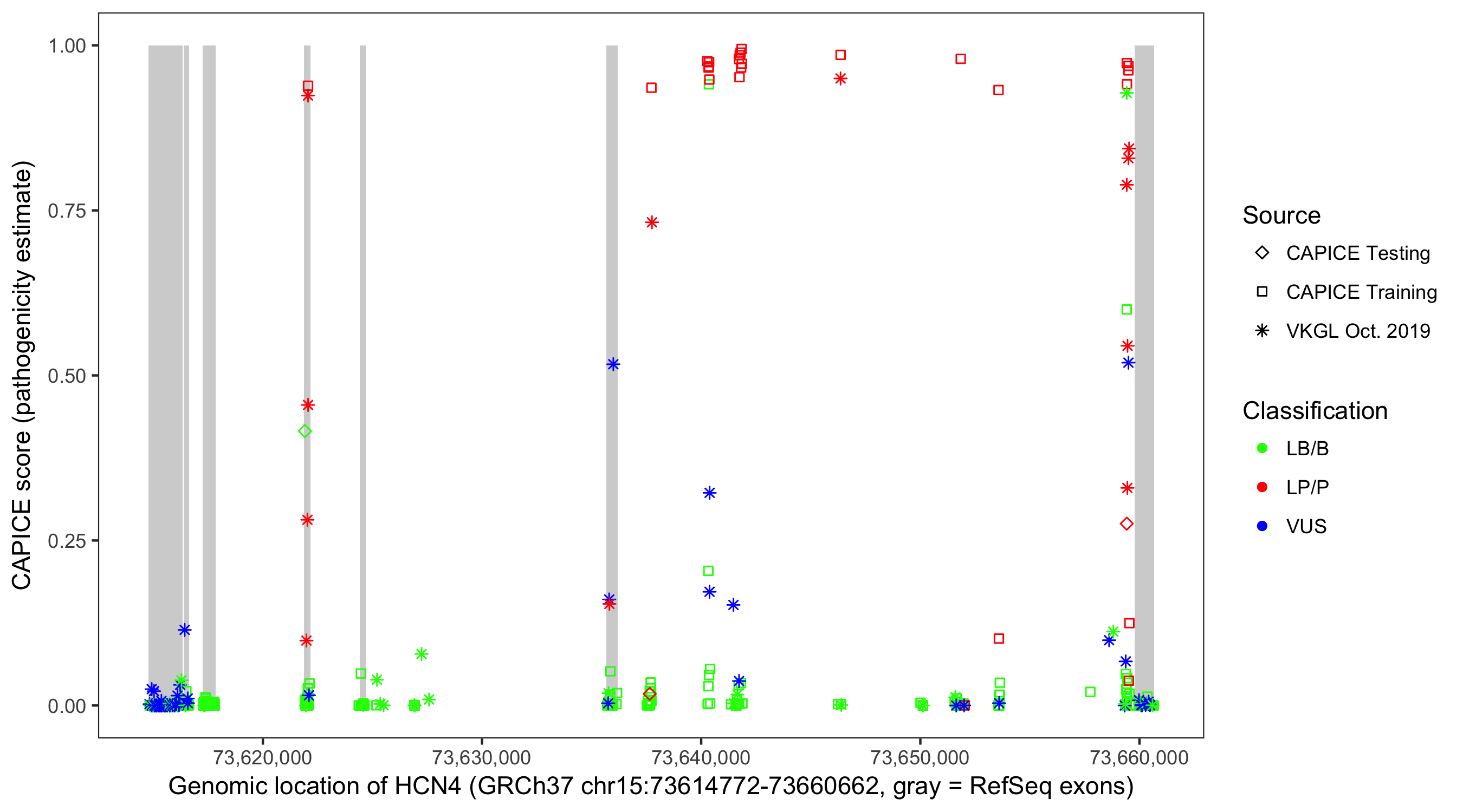 Shown are CAPICE train/test variants plus VKGL Oct 2019.