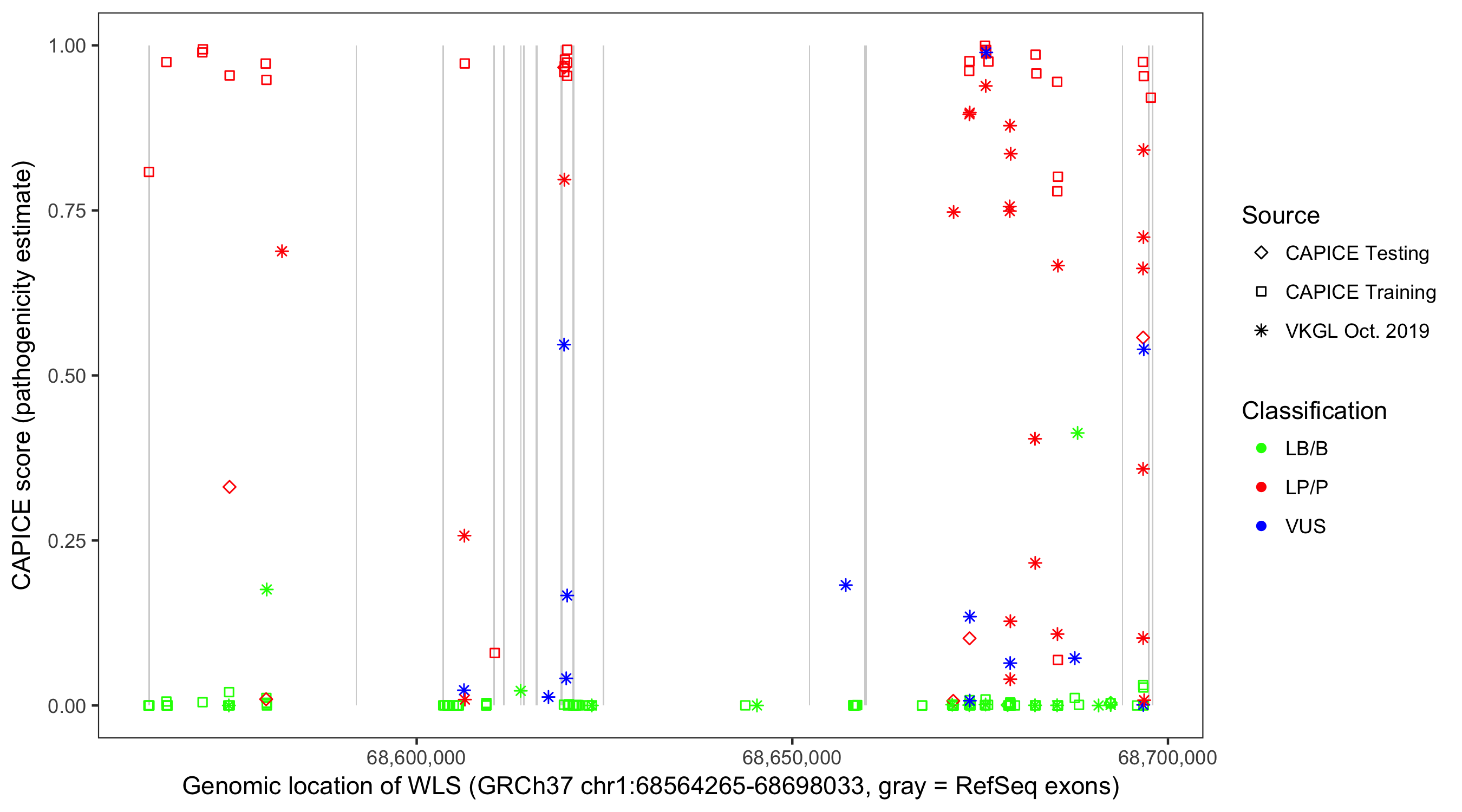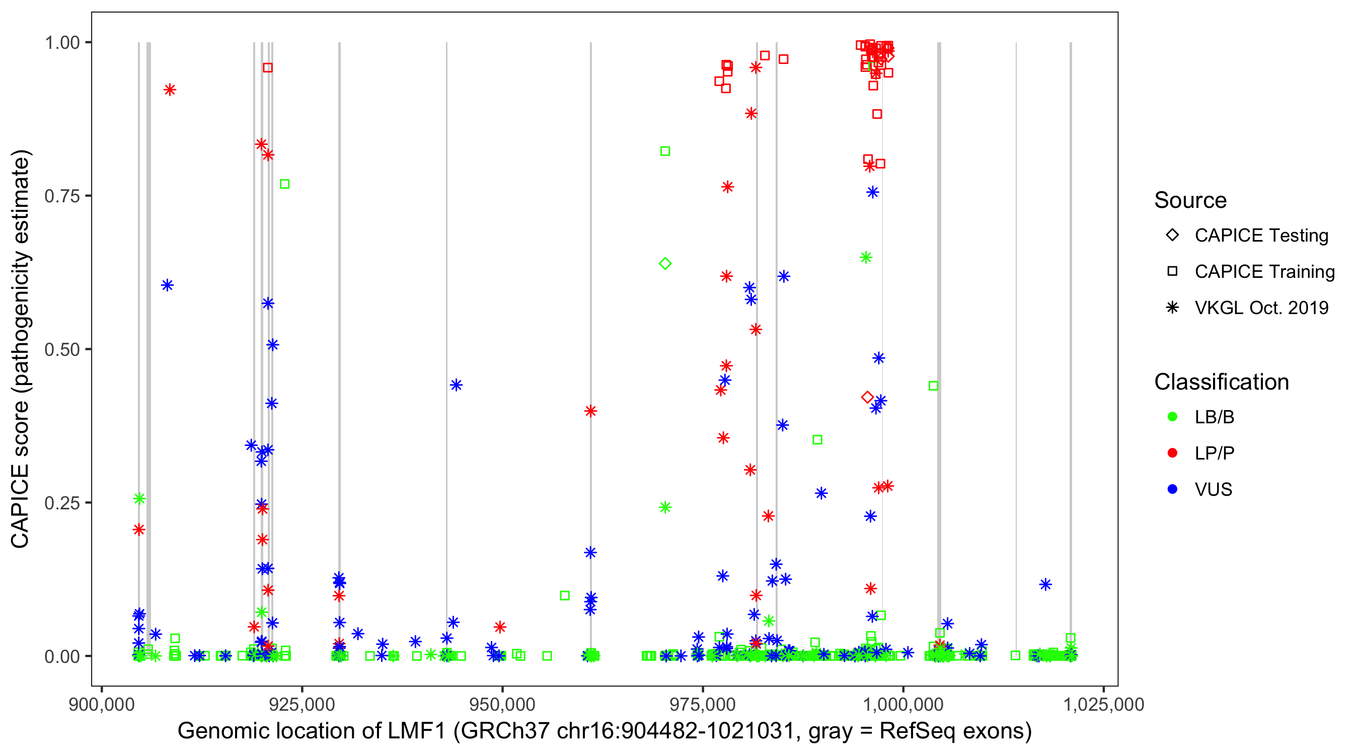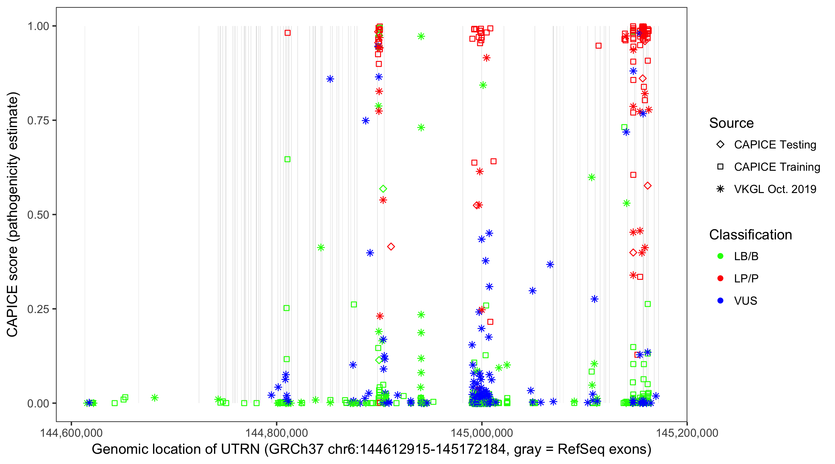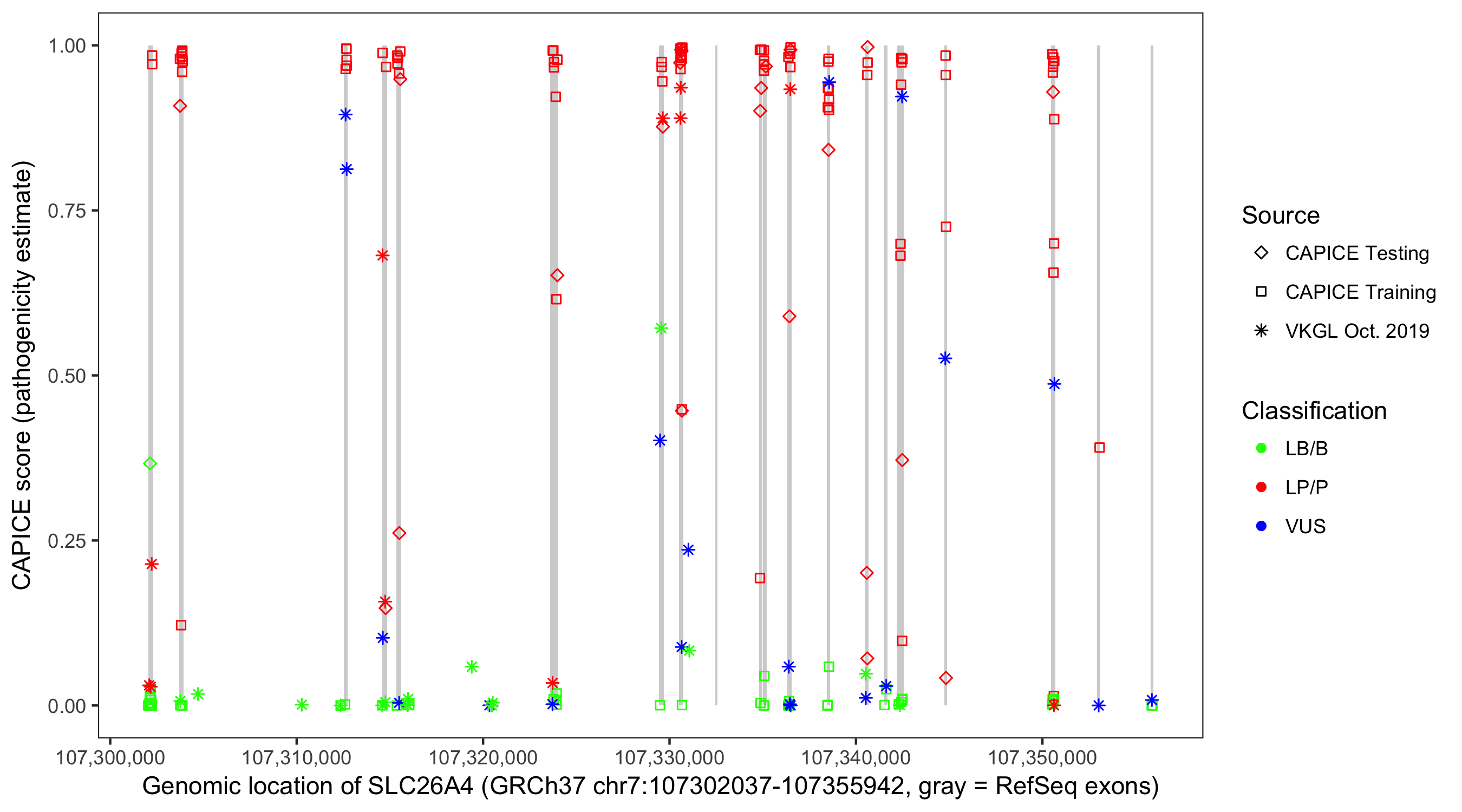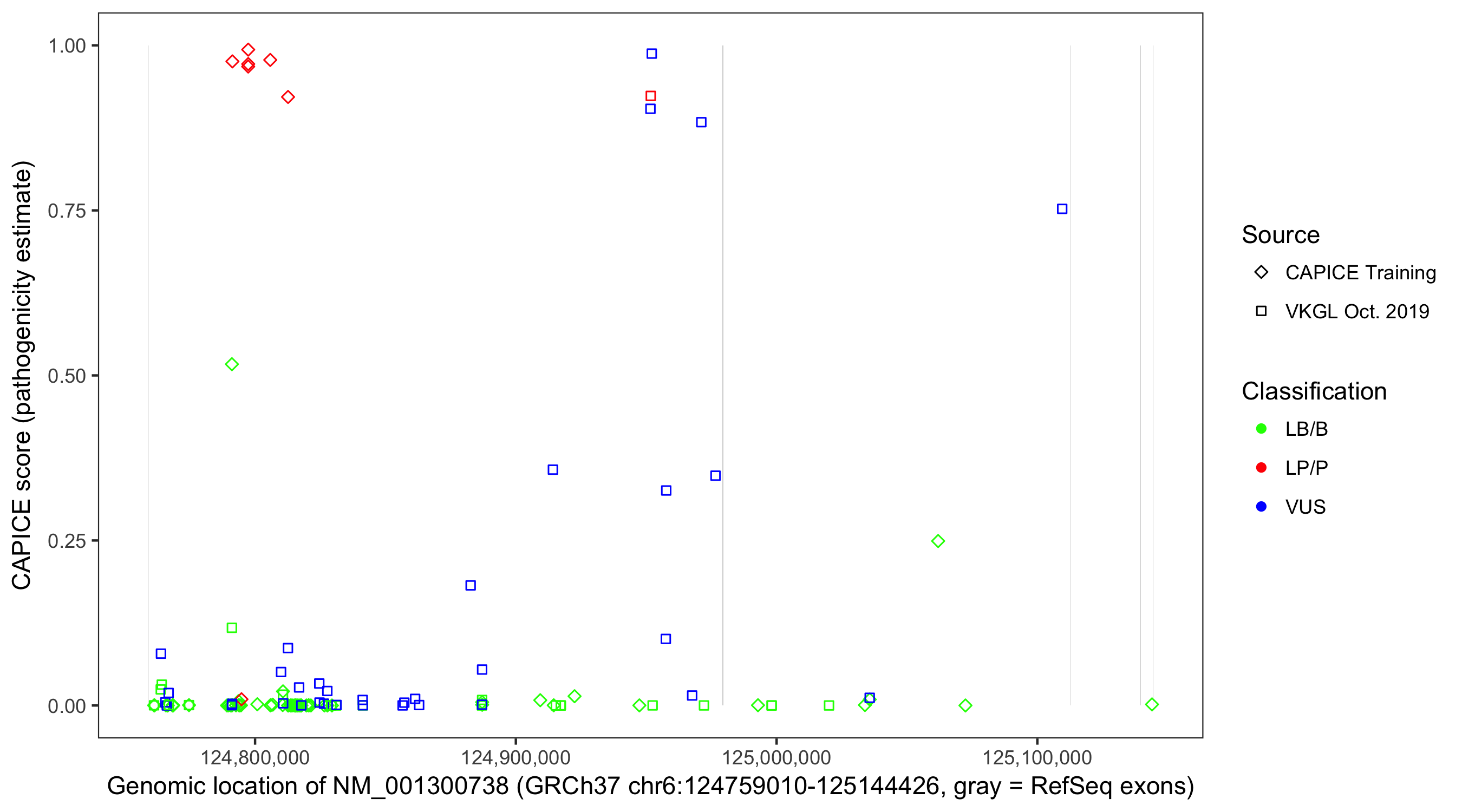 Shown are CAPICE train/test variants plus VKGL Oct 2019.