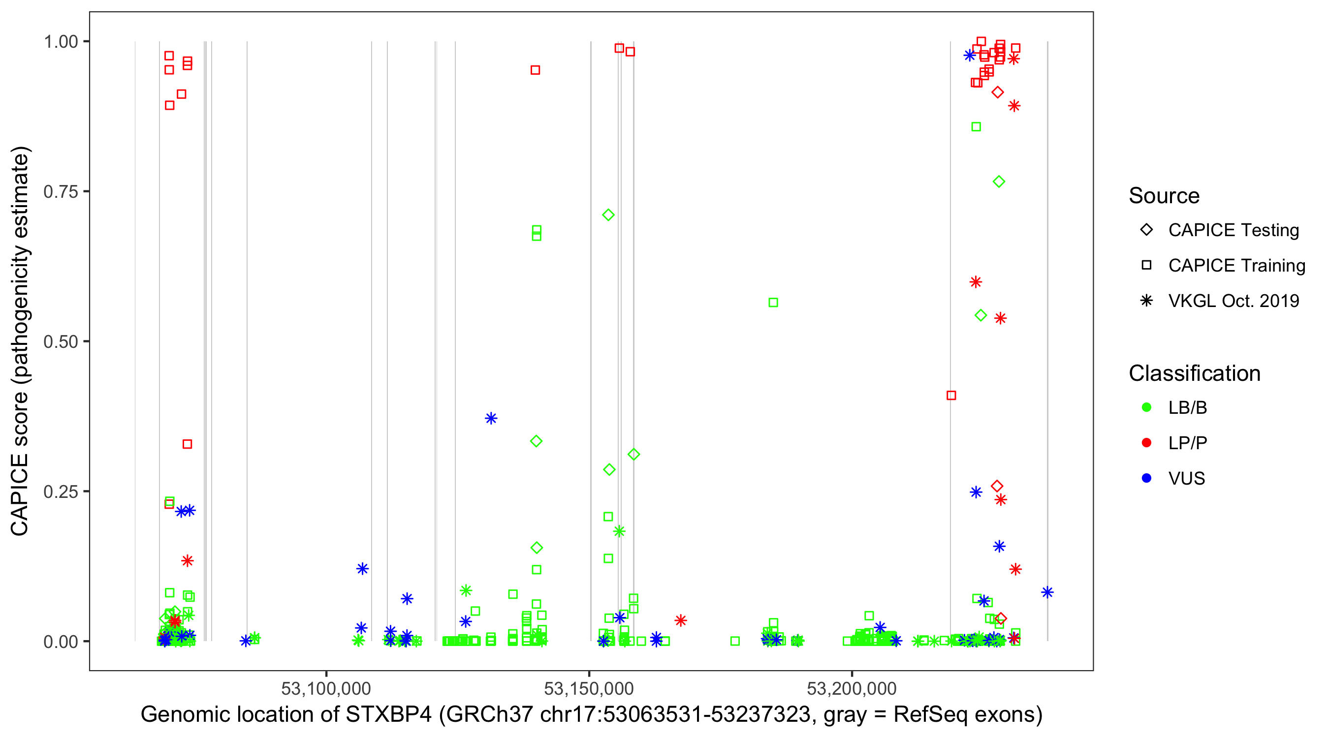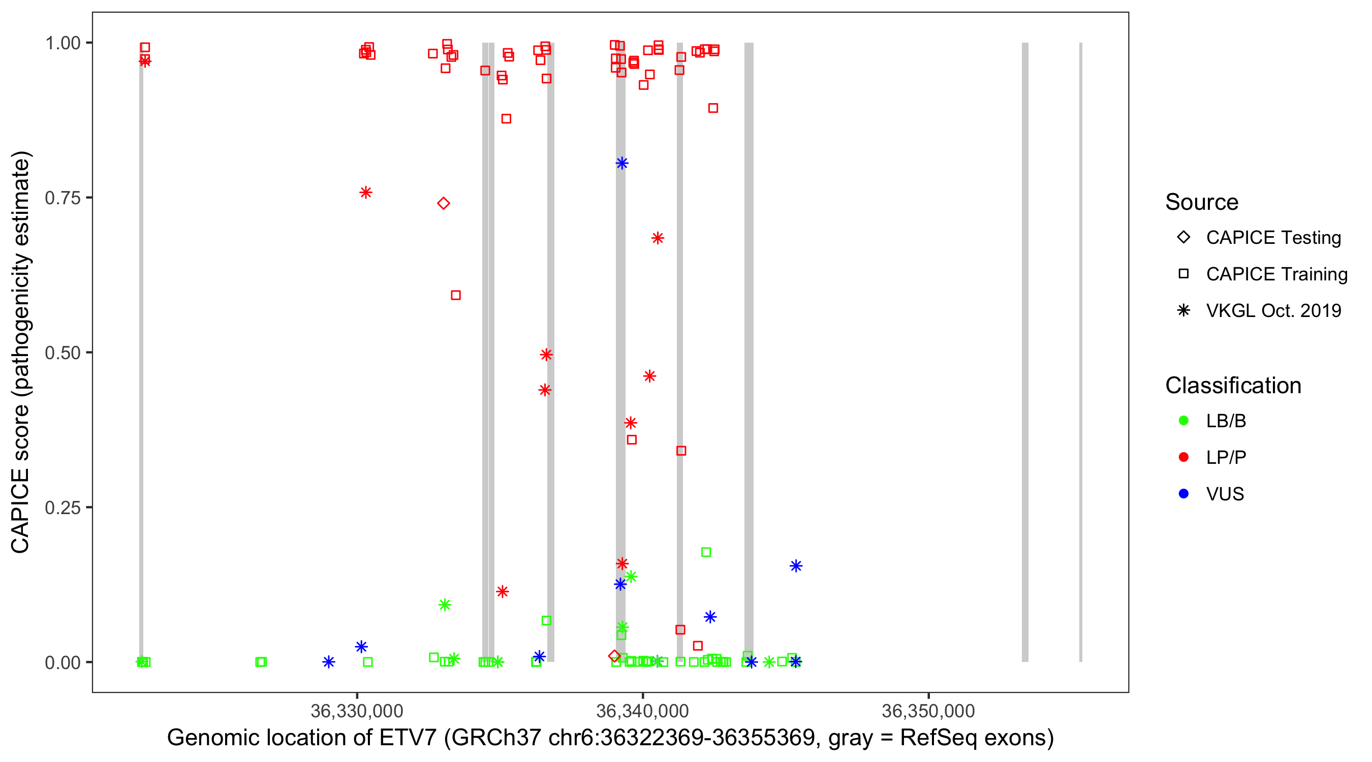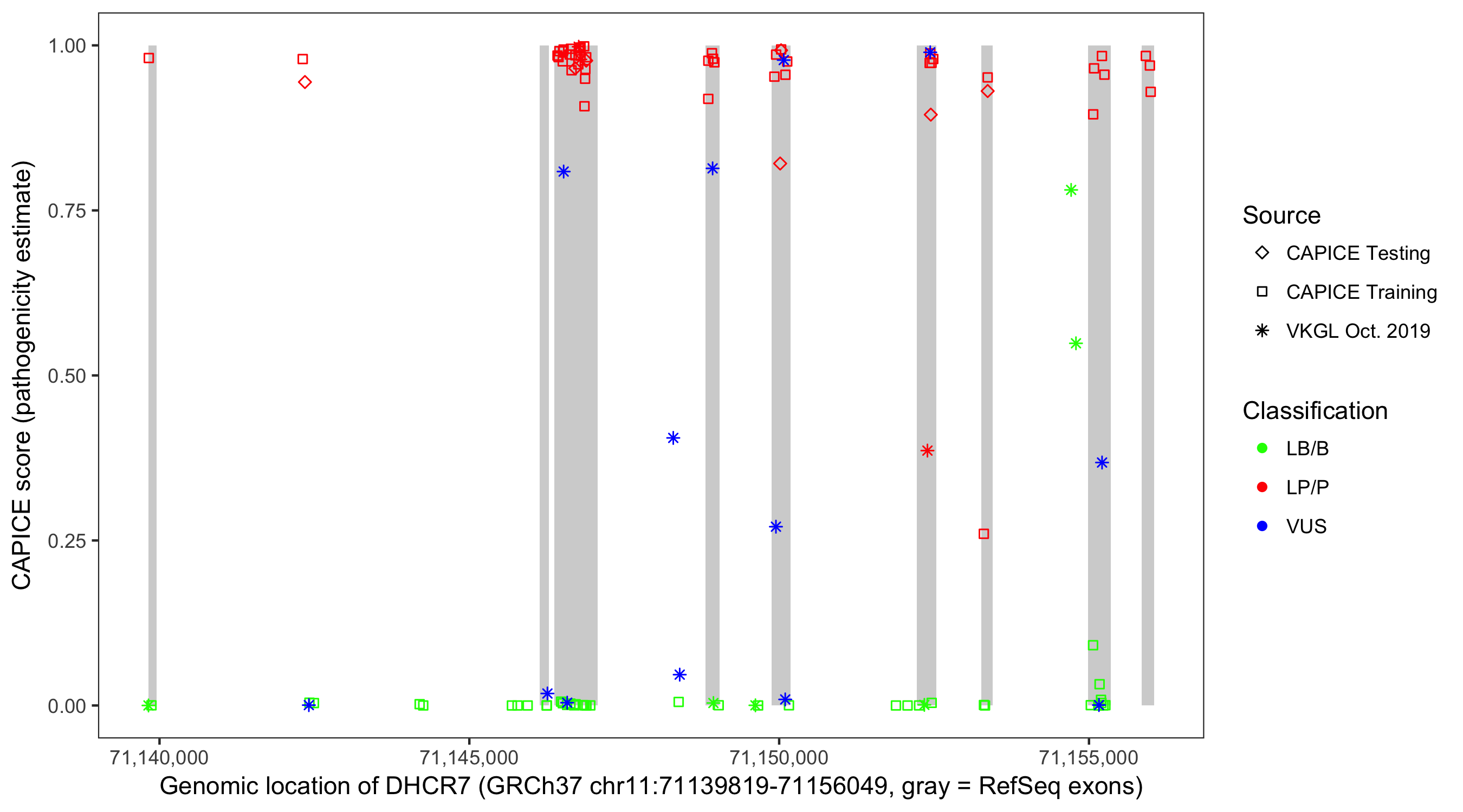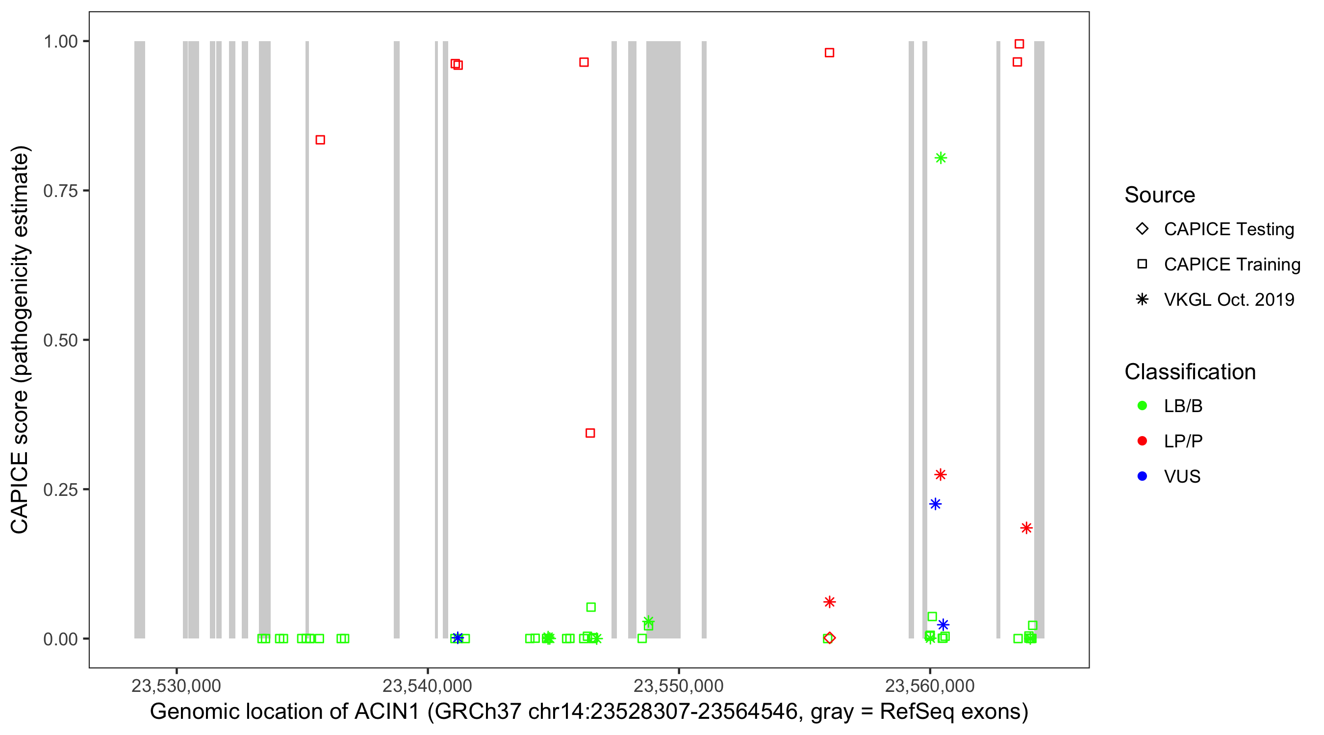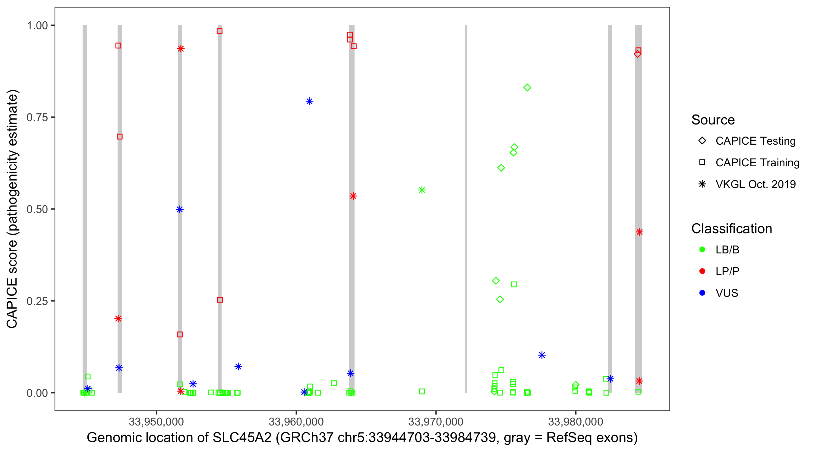 Shown are CAPICE train/test variants plus VKGL Oct 2019.
